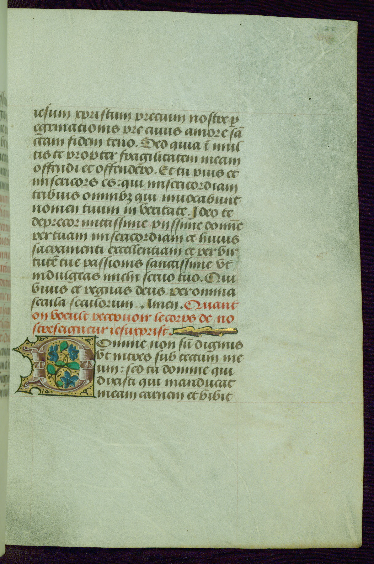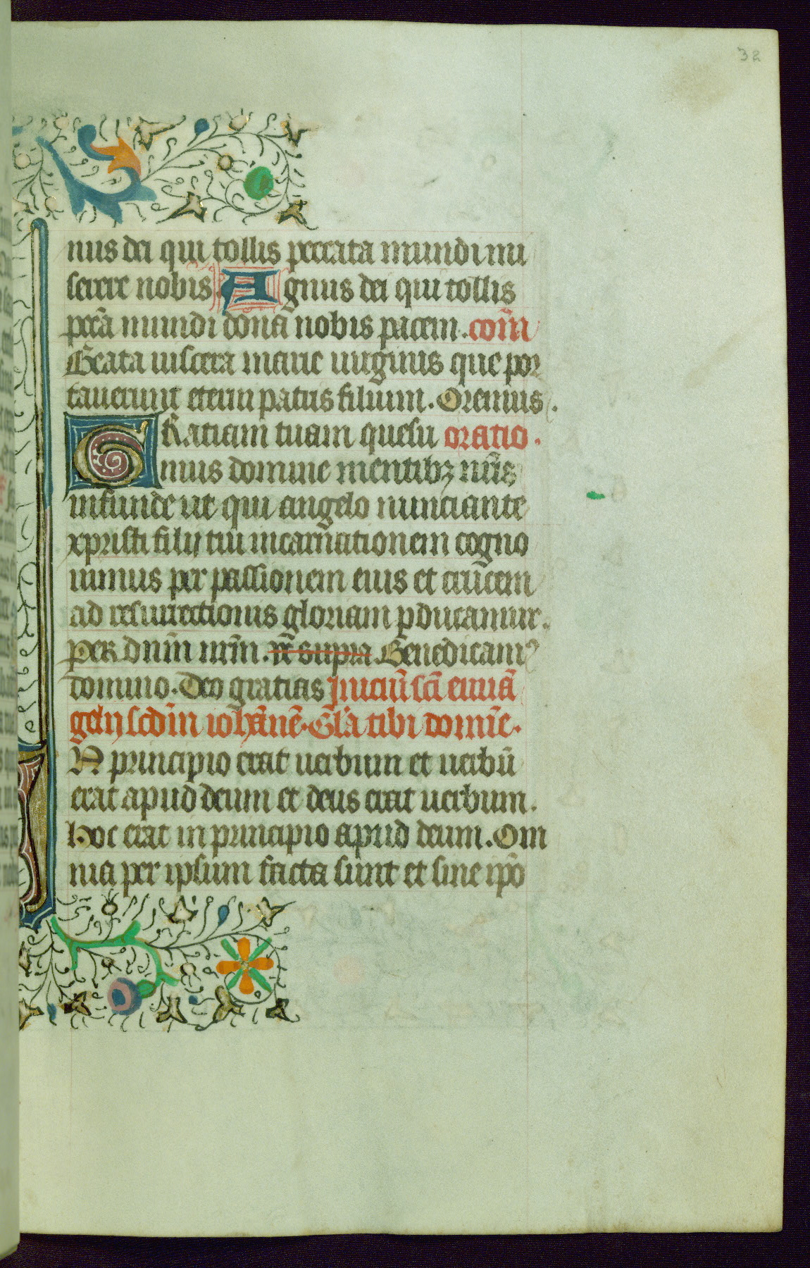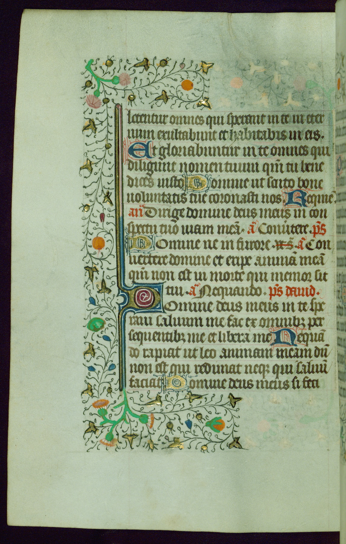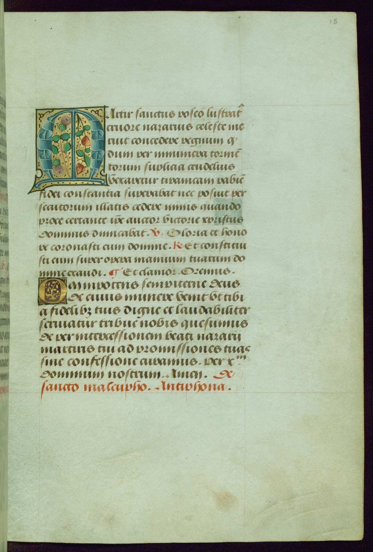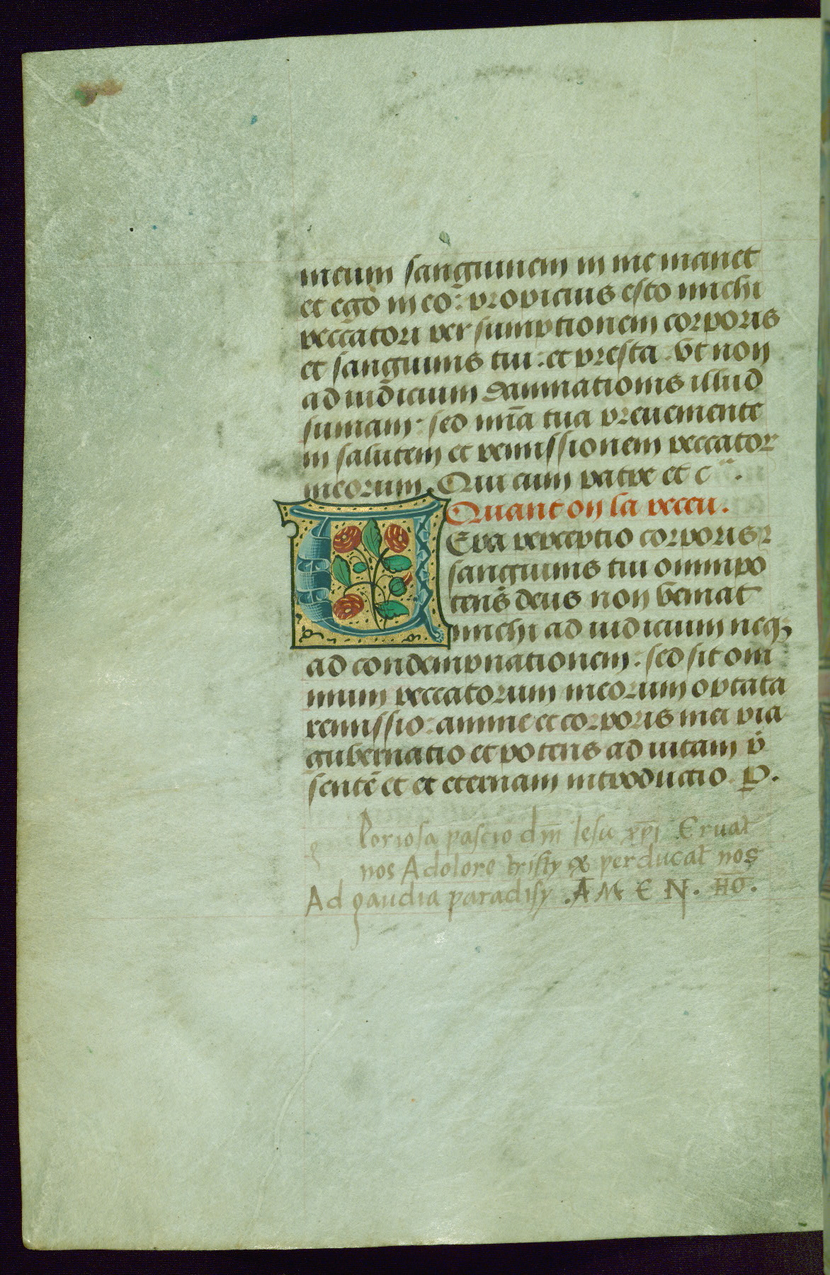 Completed ca. 1440-50 and illuminated in the style of the Masters of the Gold Scrolls, this Book of Hours preserves much information about its provenance. The first owner was possibly Barbe de Feuru, whose signature is found on the front pastedown. The book contains the ex libris of Jean of Ricaumez and his wife, Catherine of Barbenchon; their French inscription on the back pastedown promises good wine to the finder of the book if lost. The book was inherited by their son, Christophe of Ricaumez, who likely added several texts illustrated by an Rouennais artist, ca. 1500. Record of the ownership is not evinced in the book again until 1669 when the ex libris of the Count of Hallennes (Allennes family of Tournai?) was added. Alexandre-Constantin-Joseph of Nassau's (1738-1814) armorial shield appears twice, engraved (front pastedown) and painted (front flyleaf i, v).