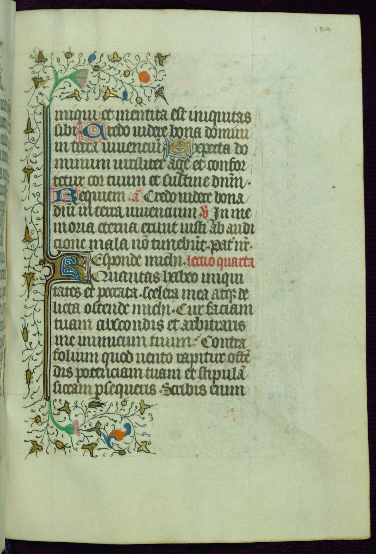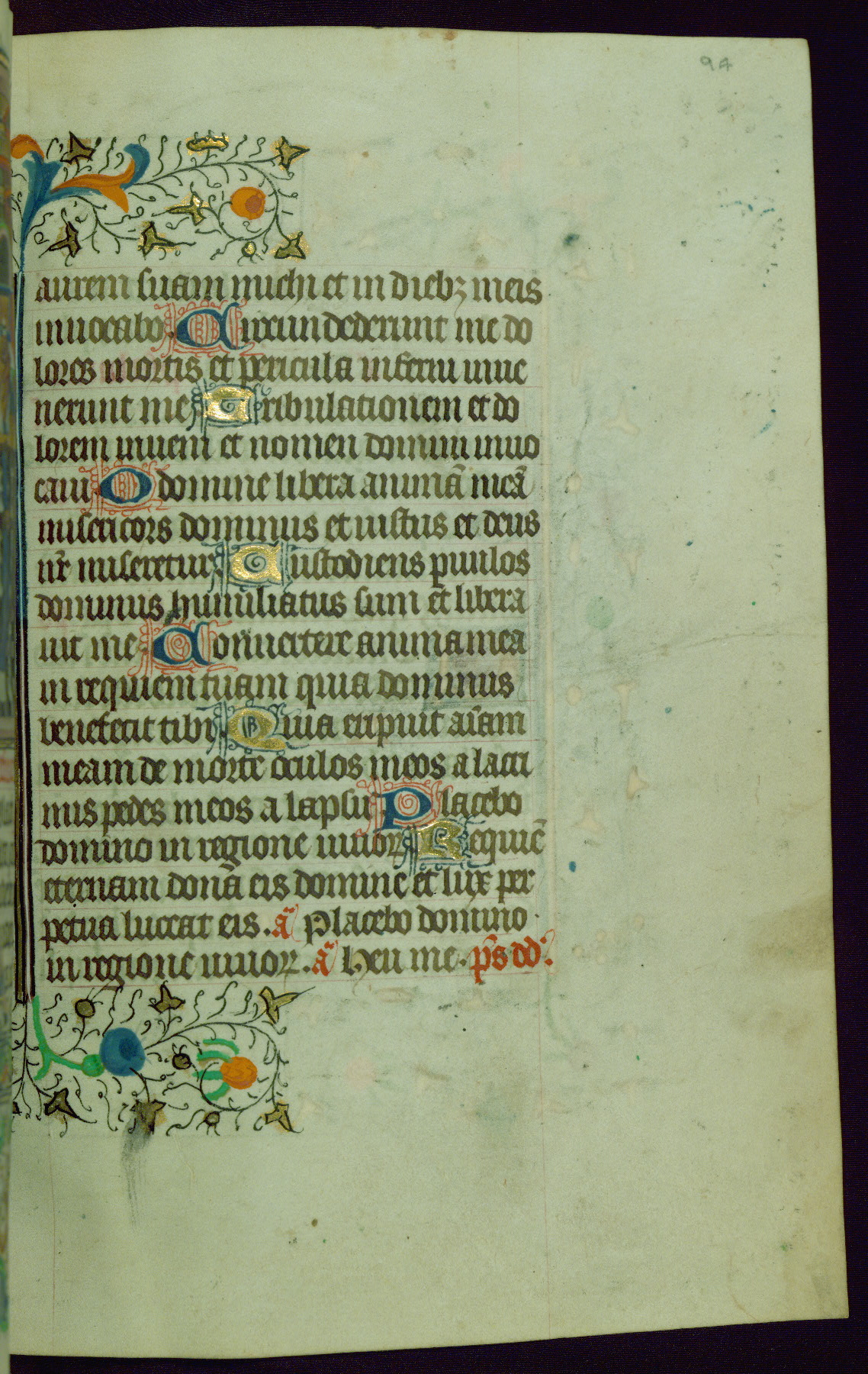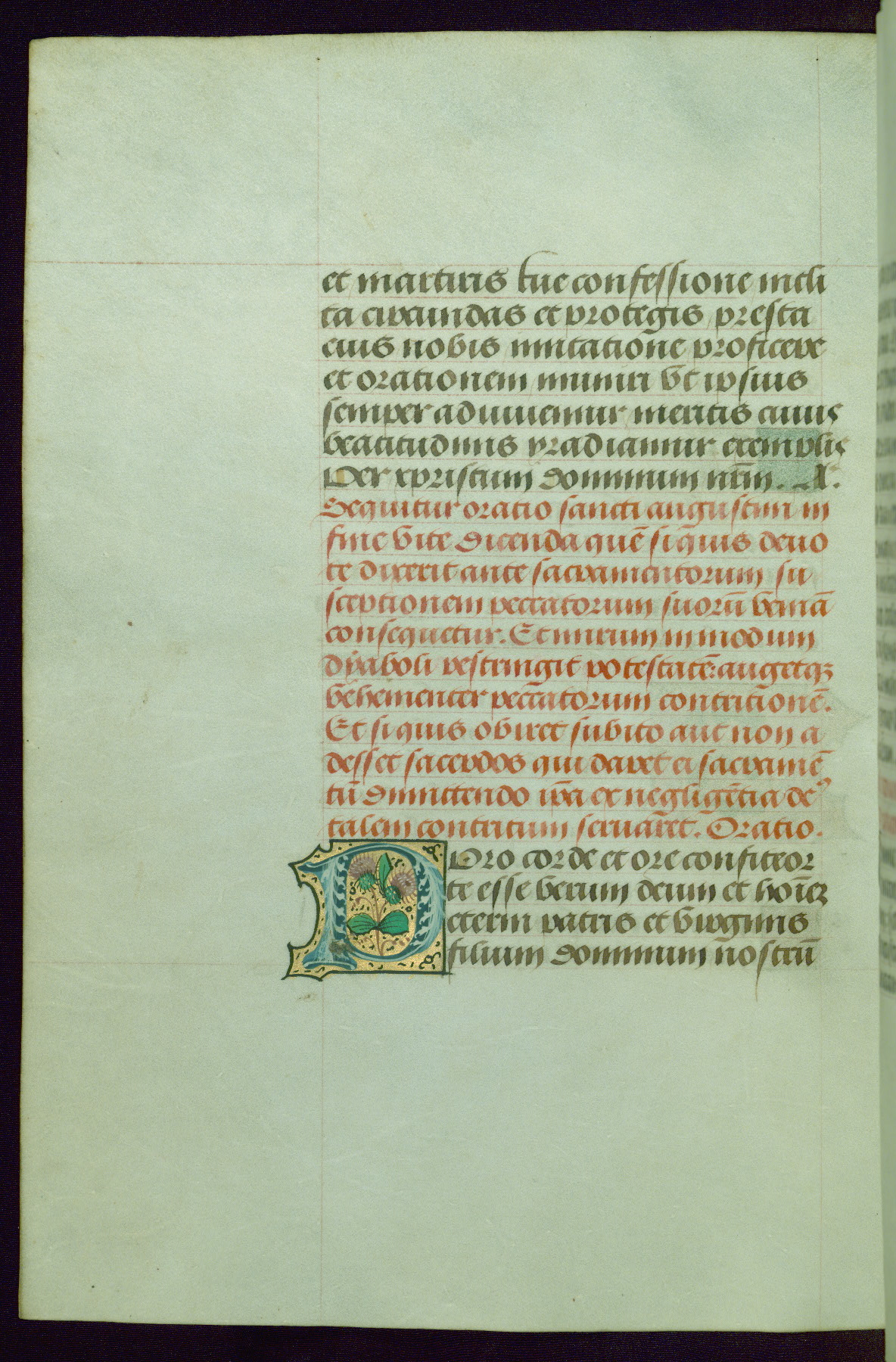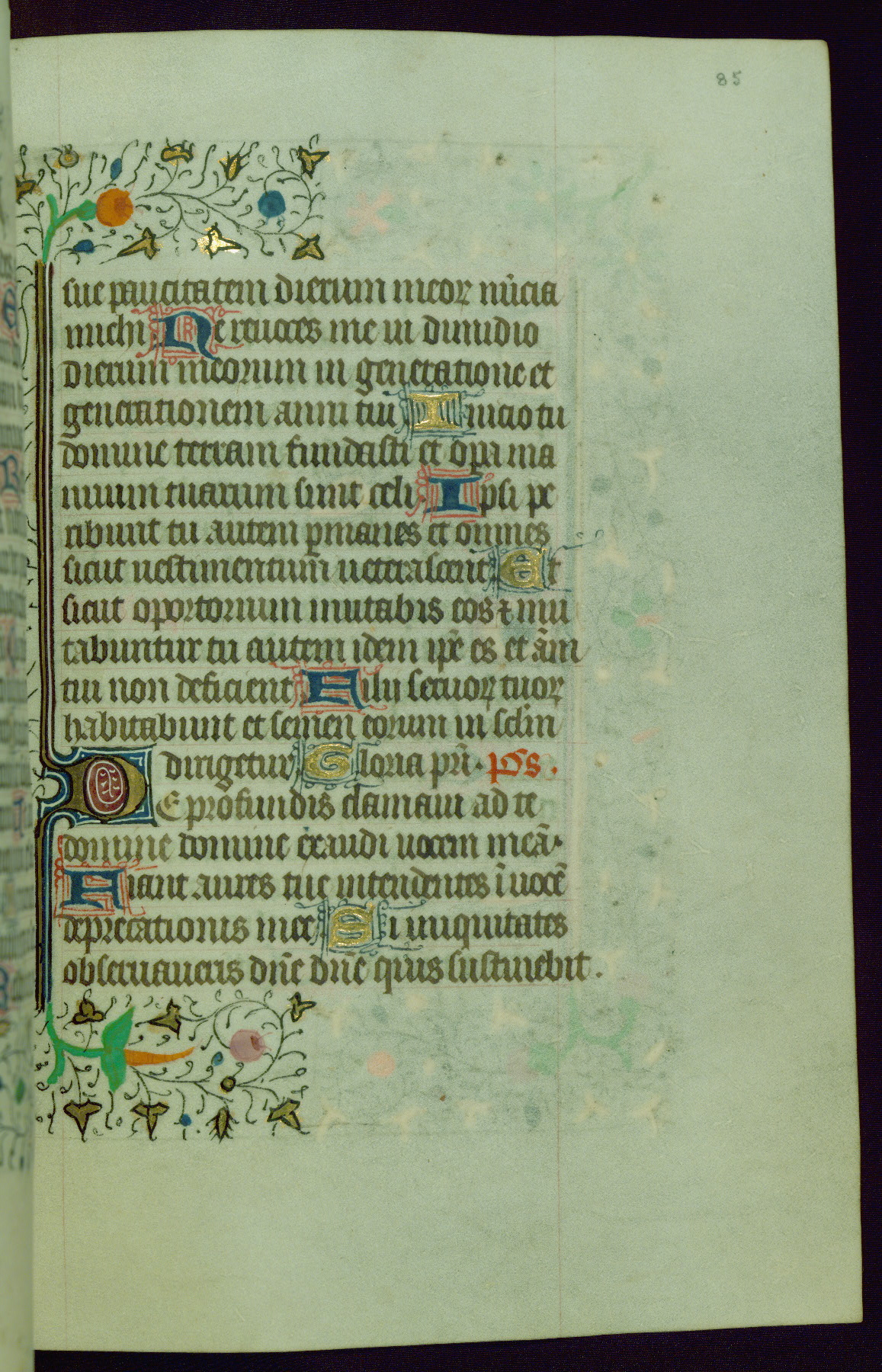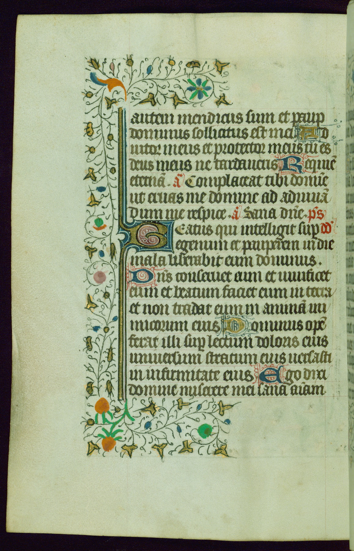 Completed ca. 1440-50 and illuminated in the style of the Masters of the Gold Scrolls, this Book of Hours preserves much information about its provenance. The first owner was possibly Barbe de Feuru, whose signature is found on the front pastedown. The book contains the ex libris of Jean of Ricaumez and his wife, Catherine of Barbenchon; their French inscription on the back pastedown promises good wine to the finder of the book if lost. The book was inherited by their son, Christophe of Ricaumez, who likely added several texts illustrated by an Rouennais artist, ca. 1500. Record of the ownership is not evinced in the book again until 1669 when the ex libris of the Count of Hallennes (Allennes family of Tournai?) was added. Alexandre-Constantin-Joseph of Nassau's (1738-1814) armorial shield appears twice, engraved (front pastedown) and painted (front flyleaf i, v).