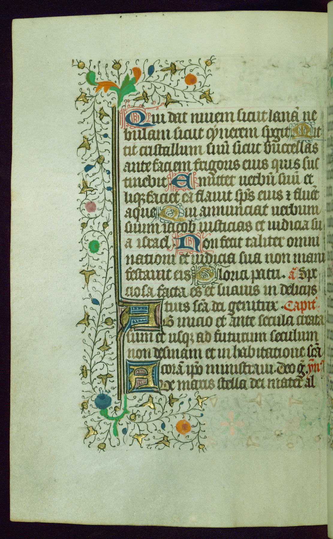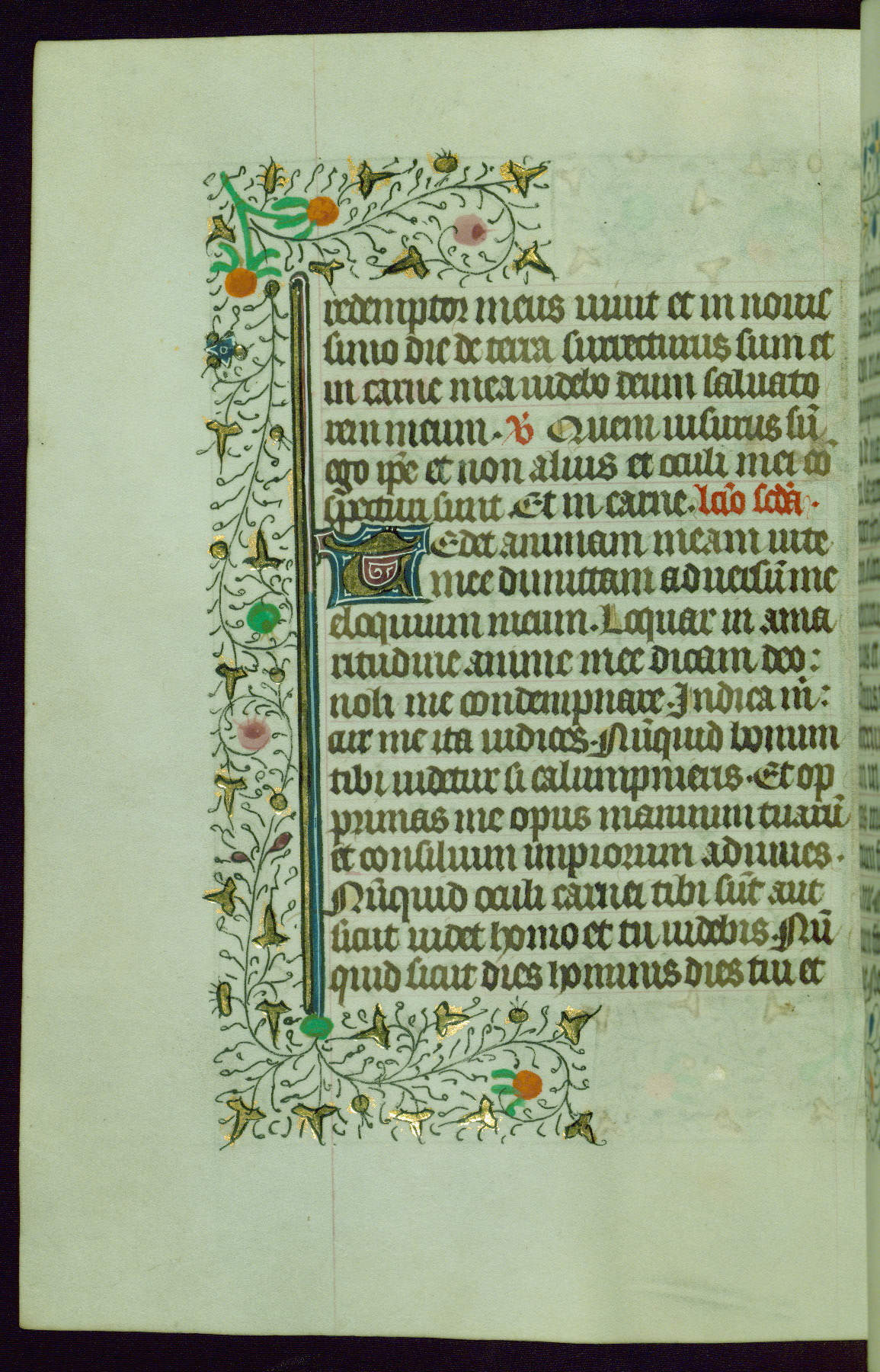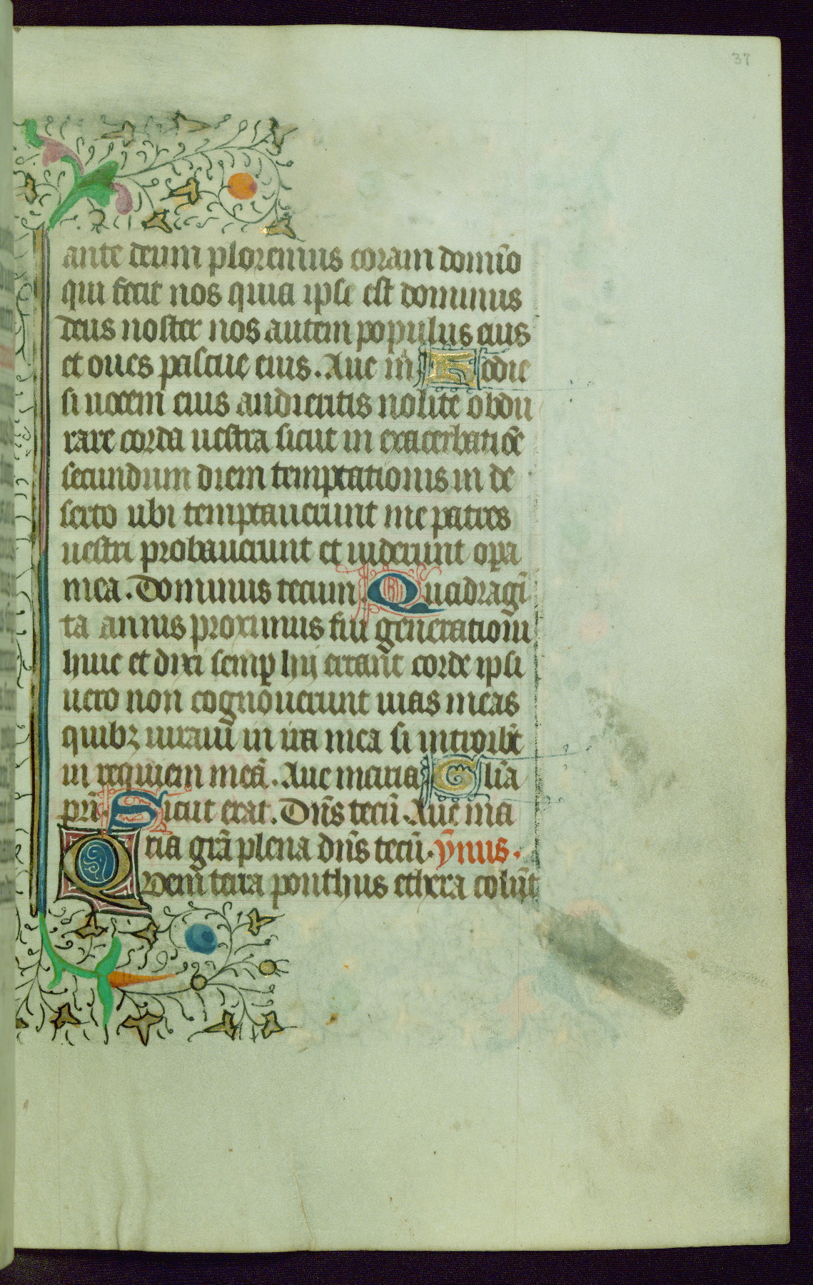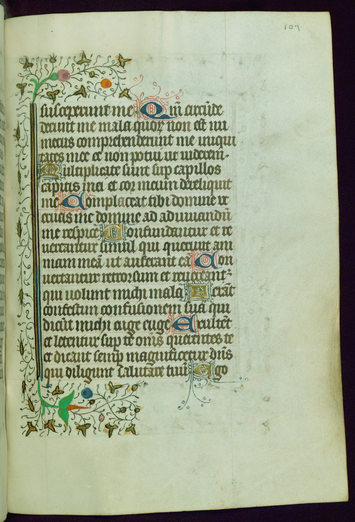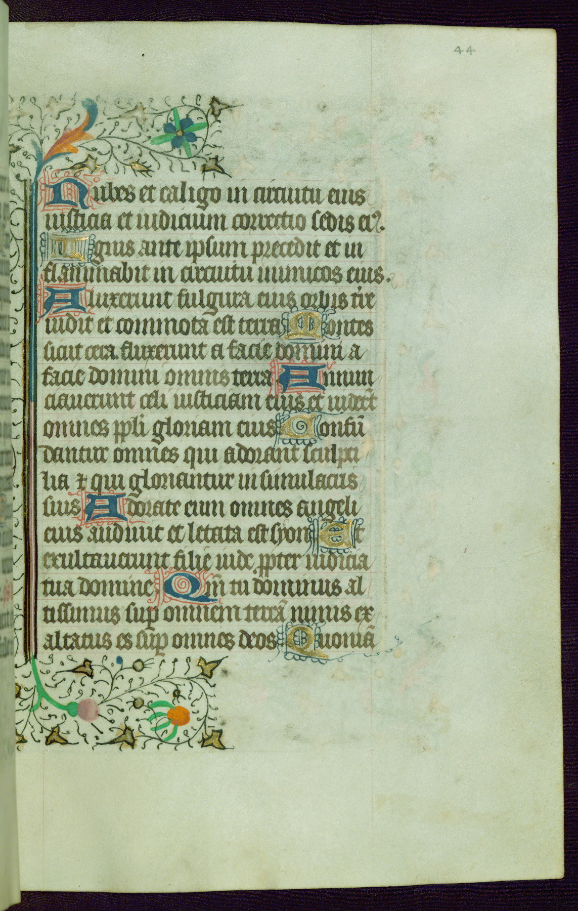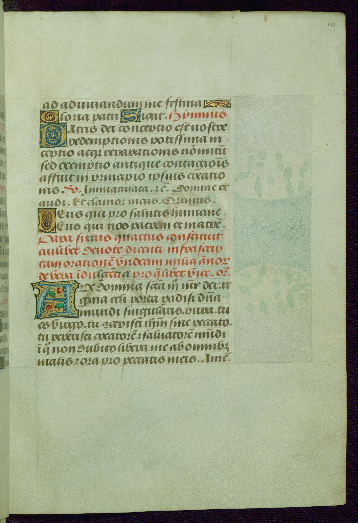 Completed ca. 1440-50 and illuminated in the style of the Masters of the Gold Scrolls, this Book of Hours preserves much information about its provenance. The first owner was possibly Barbe de Feuru, whose signature is found on the front pastedown. The book contains the ex libris of Jean of Ricaumez and his wife, Catherine of Barbenchon; their French inscription on the back pastedown promises good wine to the finder of the book if lost. The book was inherited by their son, Christophe of Ricaumez, who likely added several texts illustrated by an Rouennais artist, ca. 1500. Record of the ownership is not evinced in the book again until 1669 when the ex libris of the Count of Hallennes (Allennes family of Tournai?) was added. Alexandre-Constantin-Joseph of Nassau's (1738-1814) armorial shield appears twice, engraved (front pastedown) and painted (front flyleaf i, v).