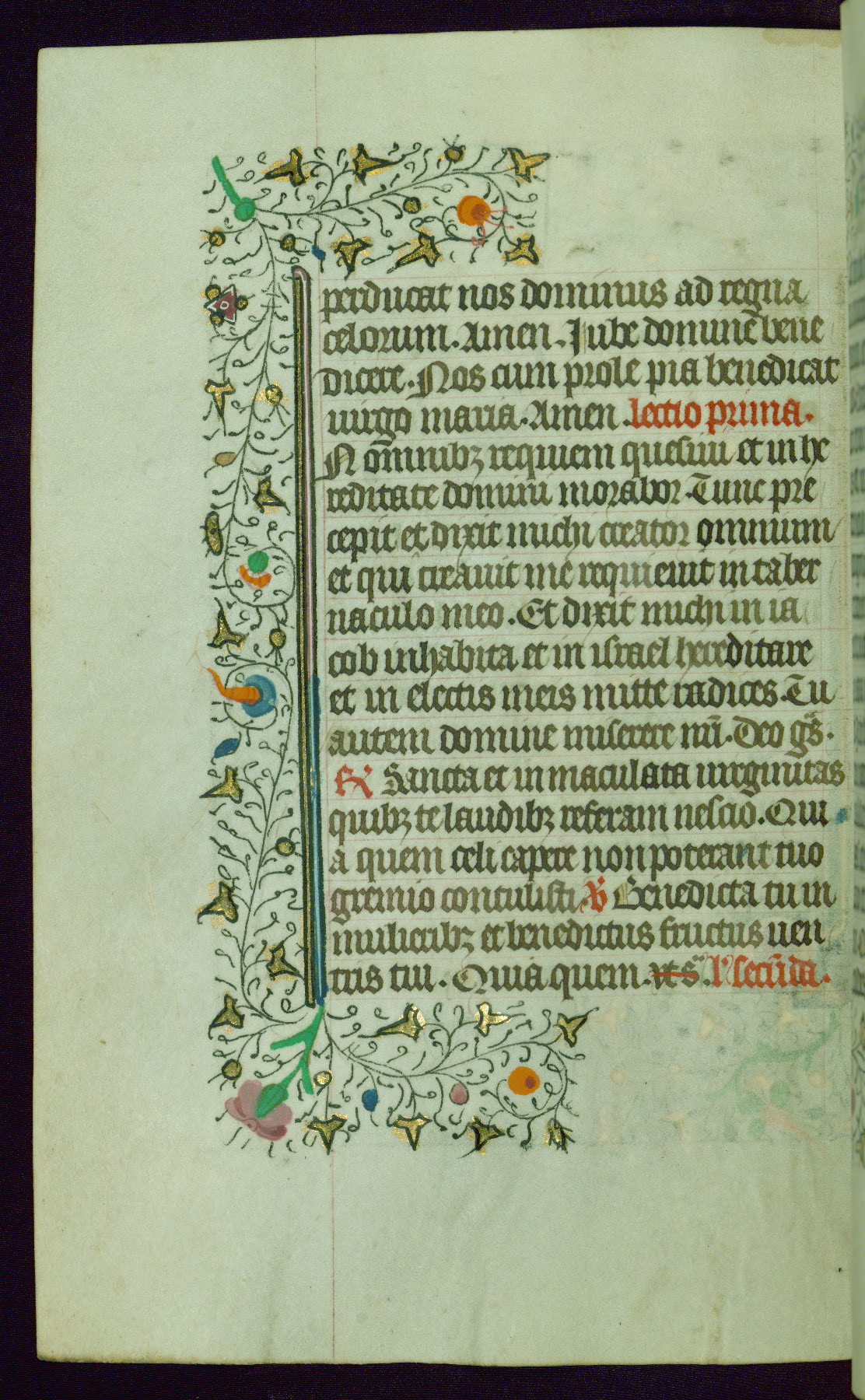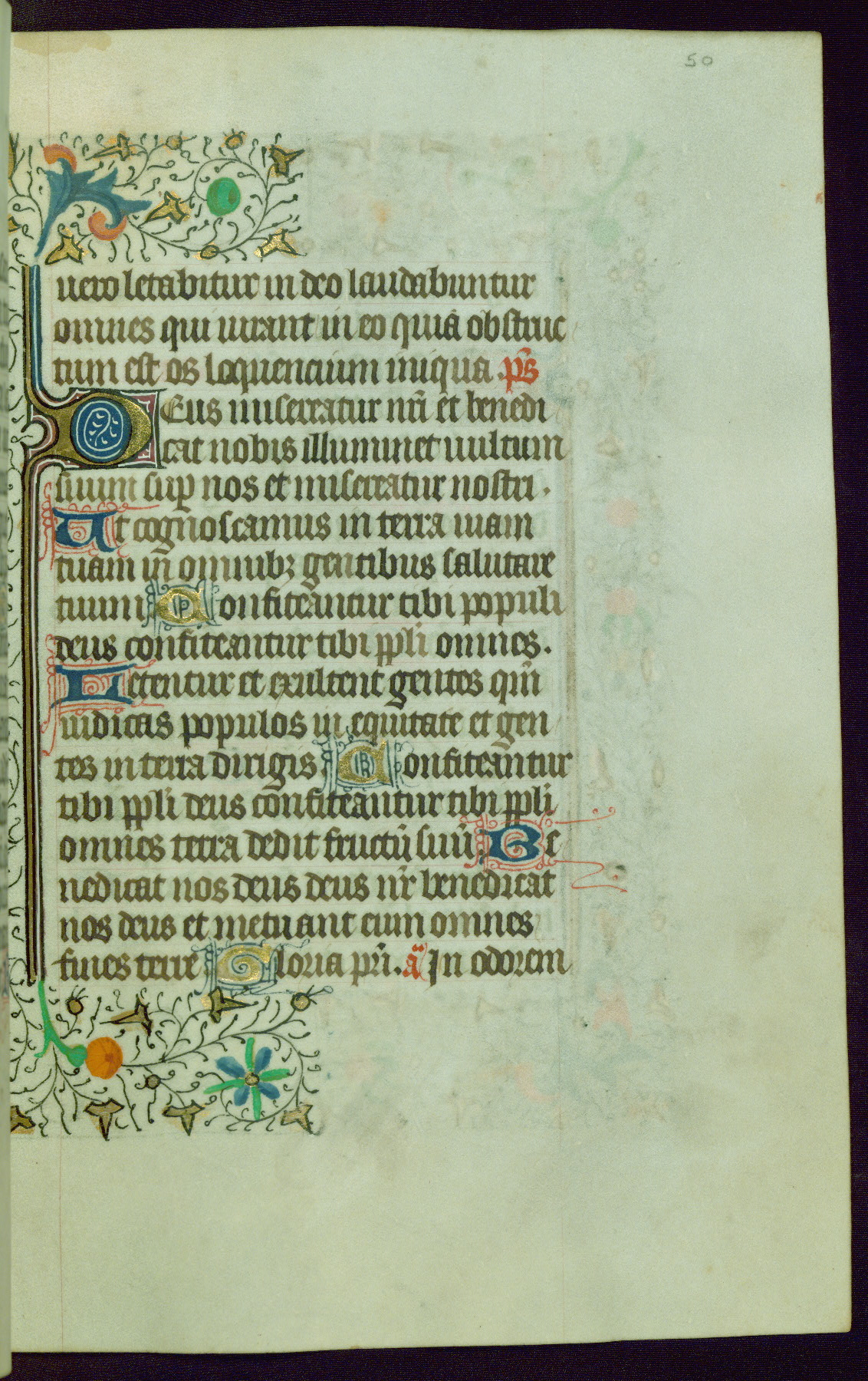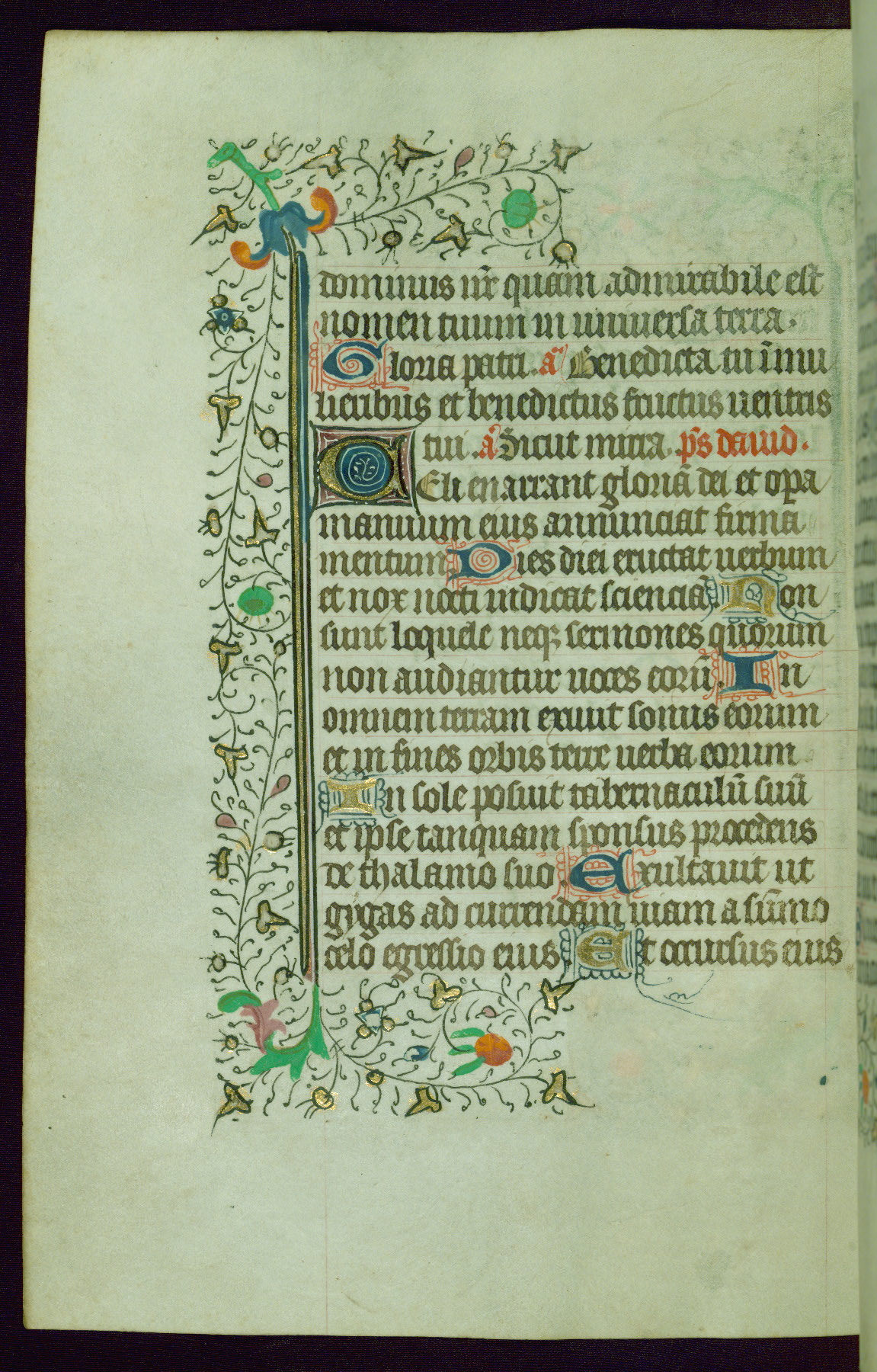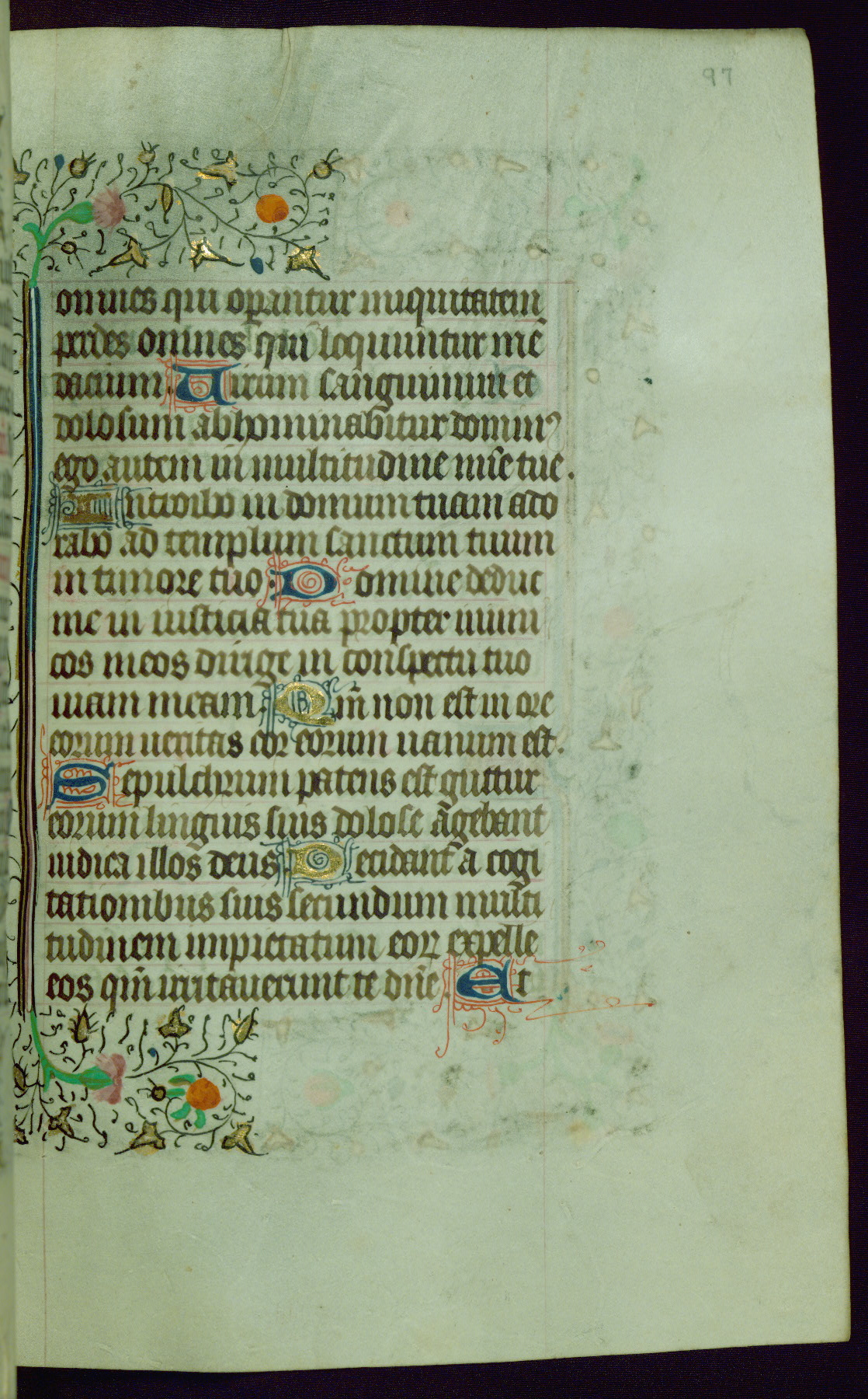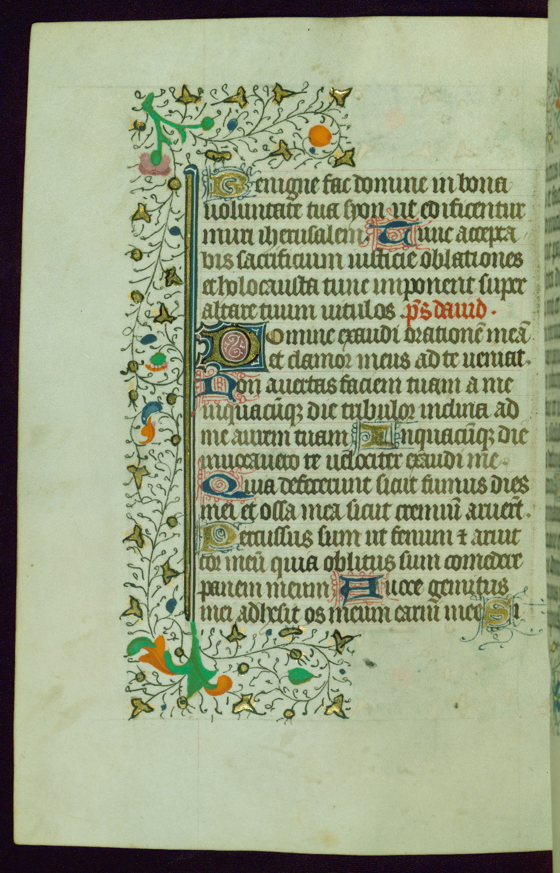 Completed ca. 1440-50 and illuminated in the style of the Masters of the Gold Scrolls, this Book of Hours preserves much information about its provenance. The first owner was possibly Barbe de Feuru, whose signature is found on the front pastedown. The book contains the ex libris of Jean of Ricaumez and his wife, Catherine of Barbenchon; their French inscription on the back pastedown promises good wine to the finder of the book if lost. The book was inherited by their son, Christophe of Ricaumez, who likely added several texts illustrated by an Rouennais artist, ca. 1500. Record of the ownership is not evinced in the book again until 1669 when the ex libris of the Count of Hallennes (Allennes family of Tournai?) was added. Alexandre-Constantin-Joseph of Nassau's (1738-1814) armorial shield appears twice, engraved (front pastedown) and painted (front flyleaf i, v).