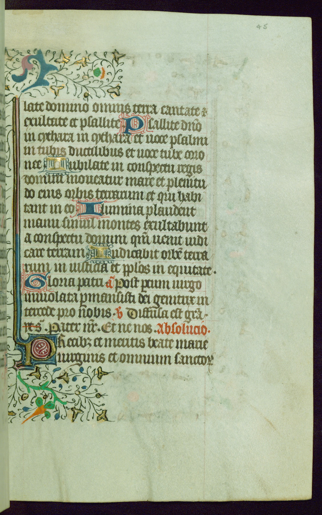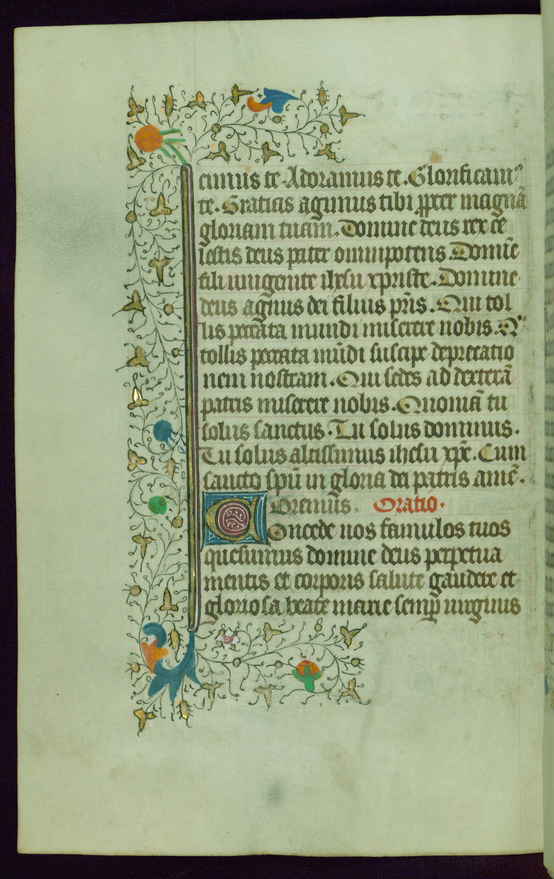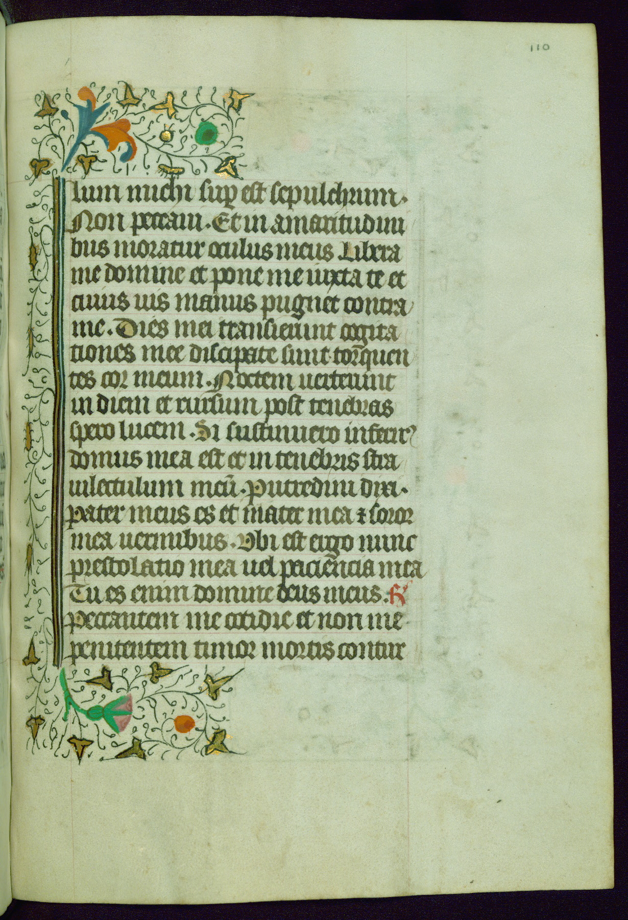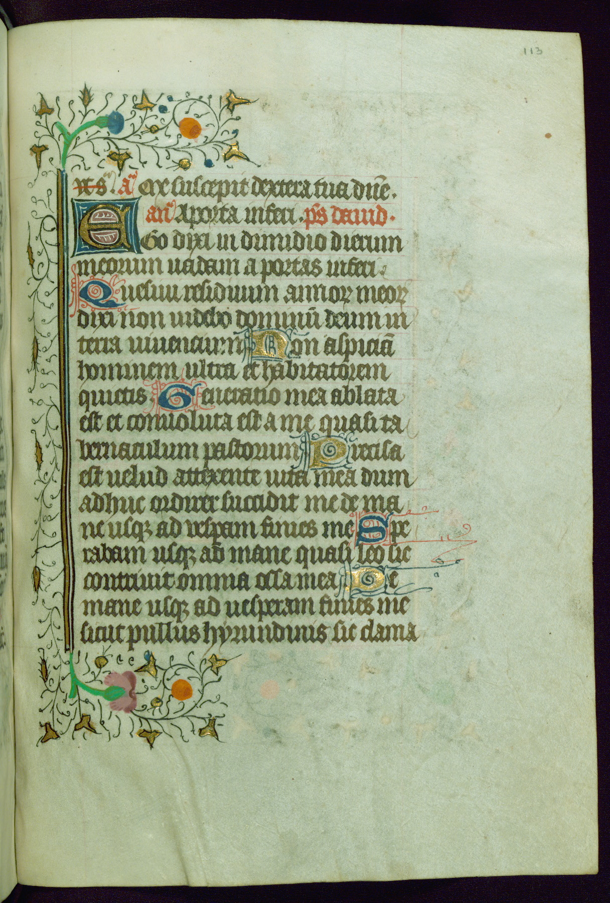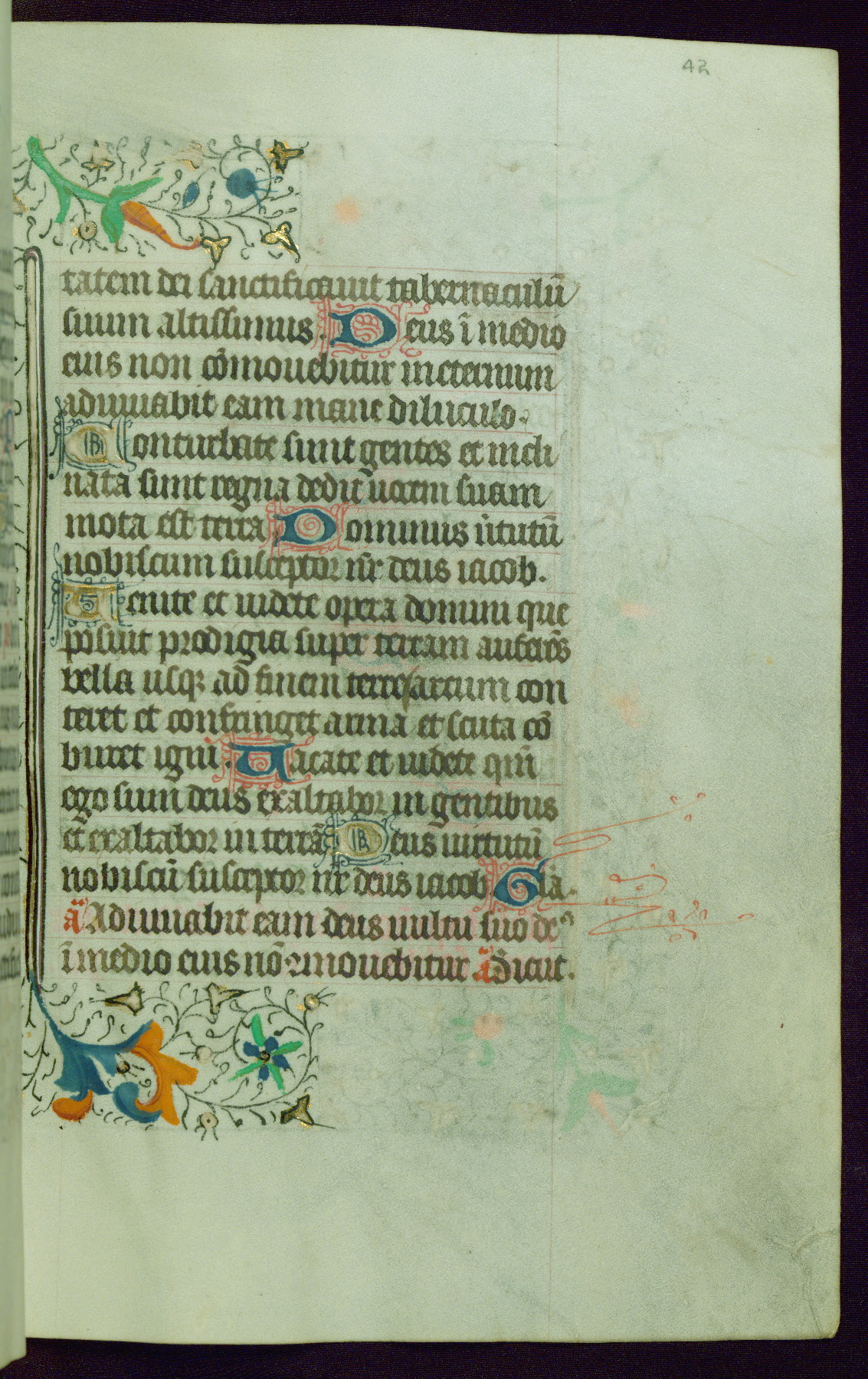 Completed ca. 1440-50 and illuminated in the style of the Masters of the Gold Scrolls, this Book of Hours preserves much information about its provenance. The first owner was possibly Barbe de Feuru, whose signature is found on the front pastedown. The book contains the ex libris of Jean of Ricaumez and his wife, Catherine of Barbenchon; their French inscription on the back pastedown promises good wine to the finder of the book if lost. The book was inherited by their son, Christophe of Ricaumez, who likely added several texts illustrated by an Rouennais artist, ca. 1500. Record of the ownership is not evinced in the book again until 1669 when the ex libris of the Count of Hallennes (Allennes family of Tournai?) was added. Alexandre-Constantin-Joseph of Nassau's (1738-1814) armorial shield appears twice, engraved (front pastedown) and painted (front flyleaf i, v).