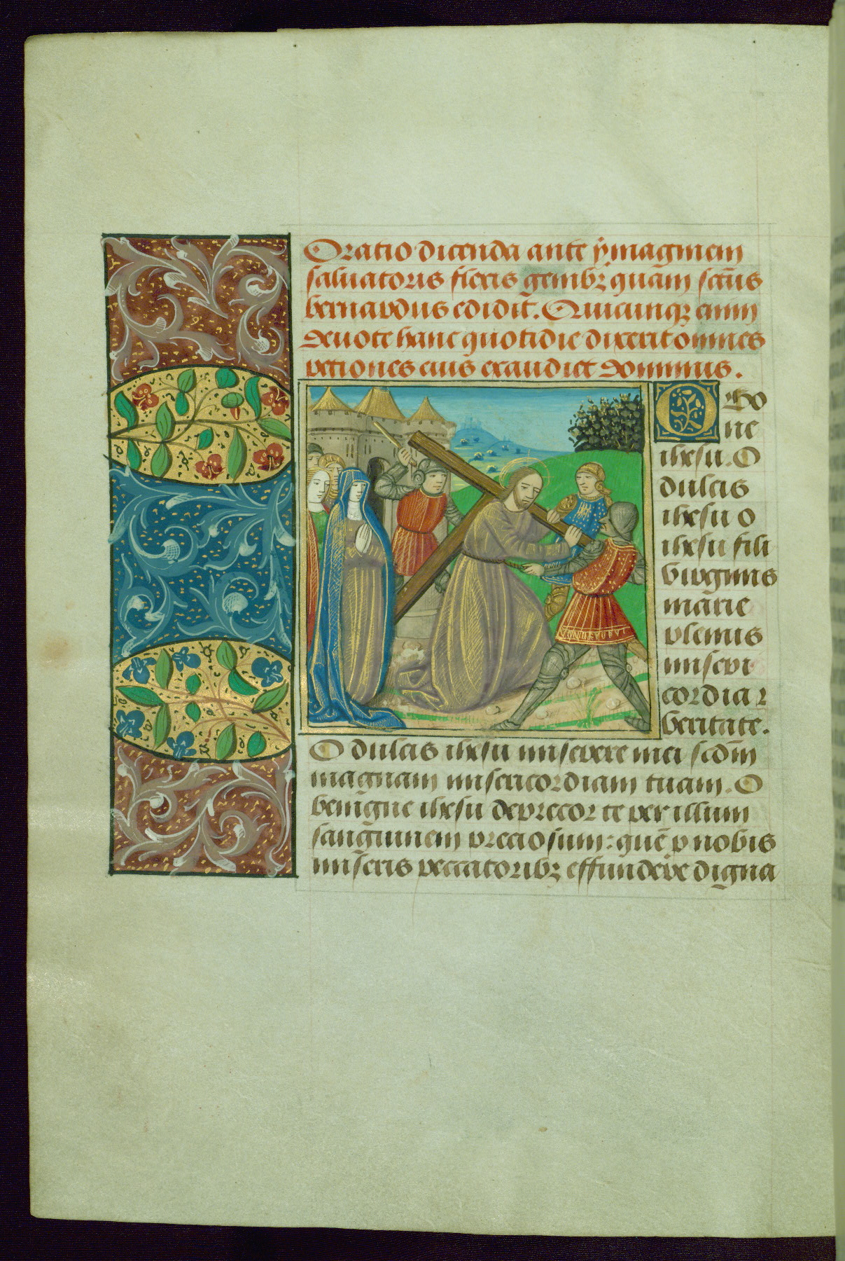 - Text note: Prayer to Christ added in fifteenth century, different script earlier devotional sequence; Fol. 127r: marginal text; fols. 127v-128r marginal heraldry and marginal text