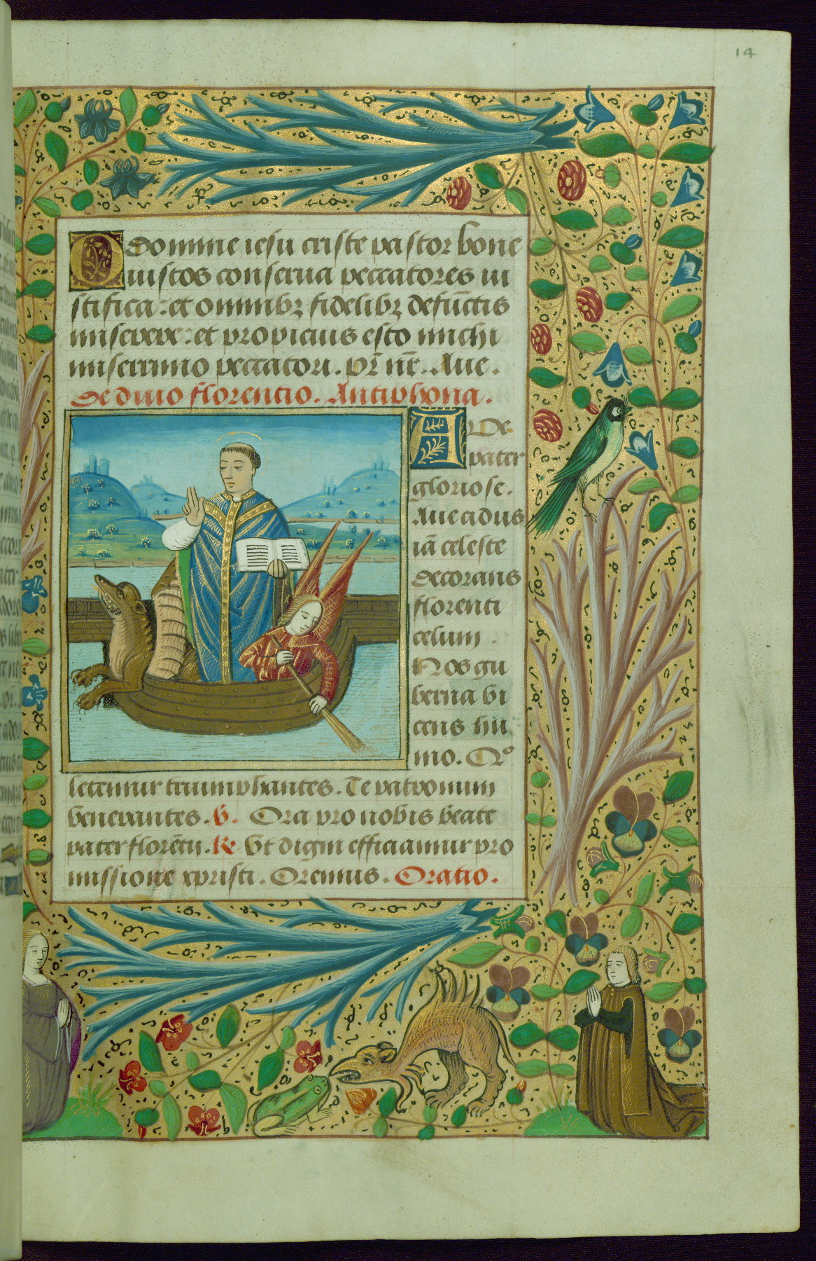 - Contents: Hours of the Immaculate Conception; prayer of indulgence of 11,000 years (attributed to pope Sixtus IV: "Ave domina sancta maria mater dei regina celi porta . . ."; prayer attributed to St. Bernard: "O bone ihesu. O dulcis ihesu . . ."; two prayers; seven verses of St. Gregory, grant of Indulgence of 14,000 years for recitation: "O domine iesu xriste adoro te in cruce pendentem . . ."; nineteen suffrages composite of all apostles, several martyrs, one confessor: eleven to male saints and five to female saints, fol. 14r: Florentius, fol. 14v: Eligius, fol. 14v: Nazarius, fol. 15r: Marculf, fol. 15v: Fiacre, fol. 16r: Michael, fol. 16v: John Baptist, fol. 16v: Peter and Paul, fol. 17r: All Apostles, fol. 17v: Several Martyrs, fol. 17v: One Confessor, fol. 18r: Rochus, fol. 18v: Christopher, fol. 19r: Anne, fol. 19r: Barbara, fol. 19v: Catherine, fol. 20r: Apollonia, fol. 20v: Restituta, fol. 21r: Regina, fols. 21v-22r: Communion prayers, first attributed to St. Augustine, opening with rather long heading: "Sequitur oratio sancti augustini in fine vite dicenda . . . Puro corde et ore confiteor te esse uerum deum . . . . Quant on voeult recepuvir le corps de nostre seigneur iesuxrist. Domine non sum dignus ut intres sub tectum meum . . . . Quant on la recev. Uera receptio corporis sanguinis tui . . . ."