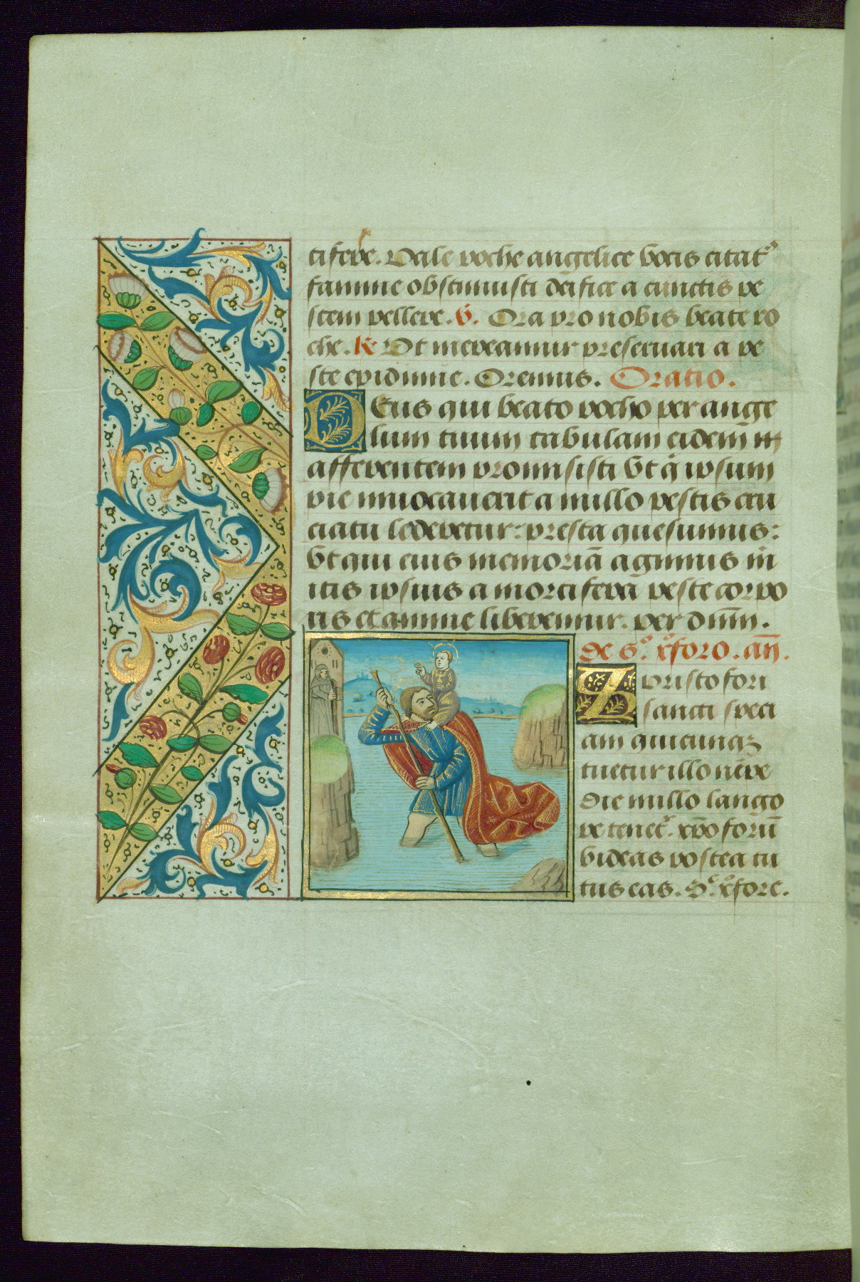 - Decoration note: Miniature on fols. 7r, 10v, 13r, 14r, 18v; fol. 7r: heraldry, owner Jean of Ricaumez in right border; fol. 14r: heraldry, owners Jean of Ricaumez and his wife Catherine of Barbenchon depicted kneels in lower border; fol. 18v: heraldry, St. Christopher is the namesake of the son of couple depicted on fol. 14r, also heir