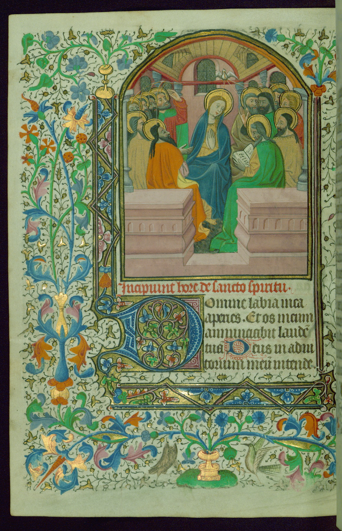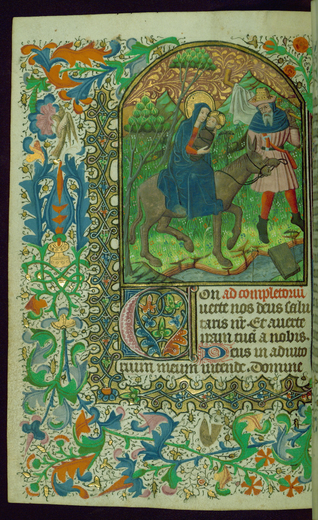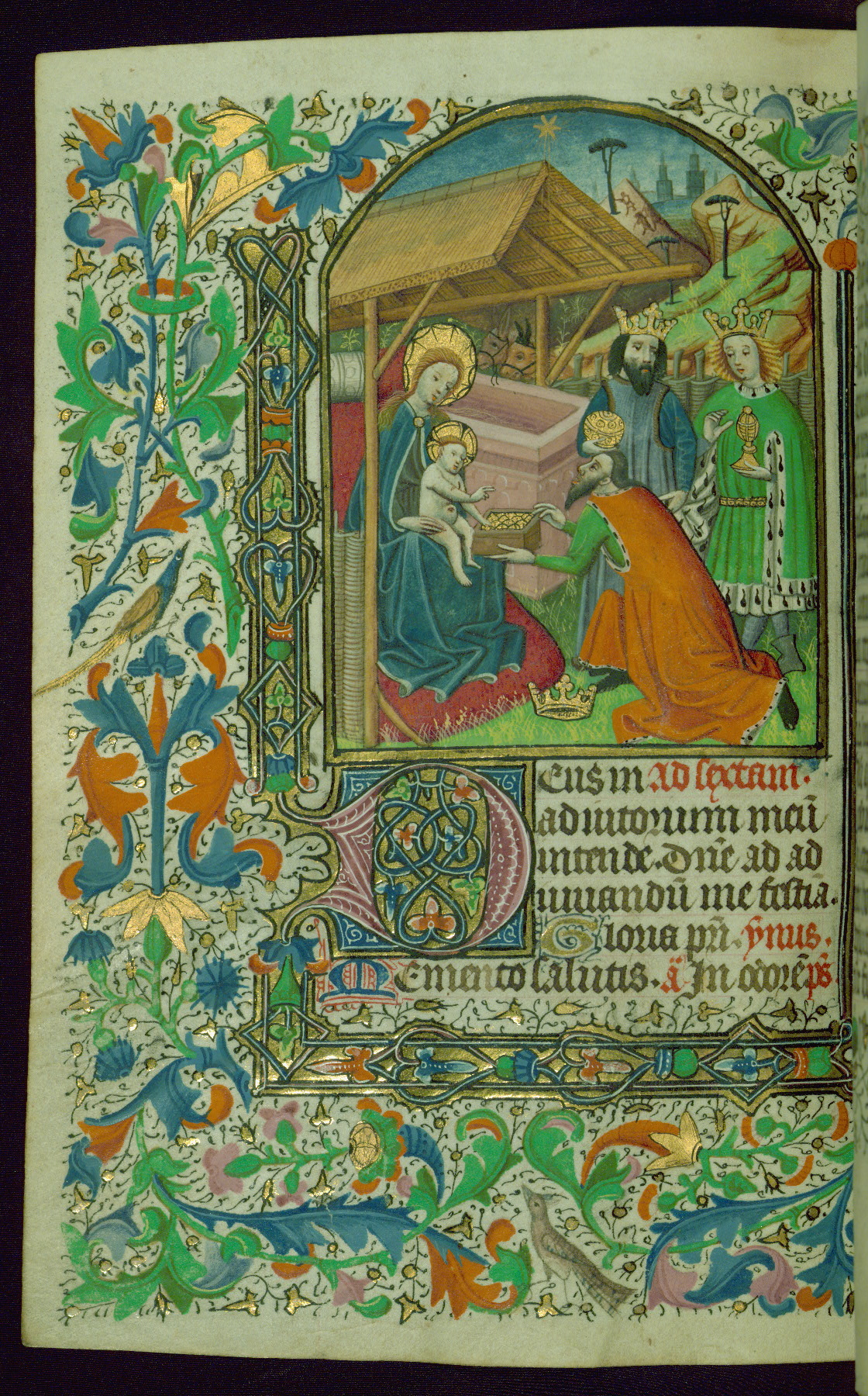 - Decoration note: Nineteen miniatures (fourteen original) varying in size from (9-17) lines by the Masters of the Gold Scrolls, Bruges, ca. 1440-50; additions attributed to Rouen, ca. 1500; decorated illuminated initials (2 and 5 lines) opposite miniatures found at text openings, at secondary text divisions, in calendar letters "K L" (2 lines); marginalia typically found at fore-edge: peacock, peahen, songbird; four notable marginalia fol. 25v: owl opposite songbird, fol. 36r: hybrid man wearing cape, fol. 59r: falcon pouncing on hare, fol. 93v: ape with book; heraldry found throughout, especially in added portions of text, heraldry in decorated illuminated initials: two each on fols. 8v and 9v; one each on fols. 8r and 9r; fols. 127v and 128r: heraldry; full-page heraldry: front flyleaf i; borders at text openings paired with miniatures: acanthus often orange/blue and green/grey-blue detailed in gold, sometimes candelabra designs found at fore-edge, symmetrical designs centralized at base; often floral sprigs, gold disks and leaves, marginalia; marginalia in calendar and text left on every page: acanthus in orange and blue or lilac-rose and green, some floral designs, fore-edge on versos filled with airy gold foliate tendril-rinceau with blossoms and berries, spine-edge rectos not typically embellished; rubrics in red, text in dark brown ink