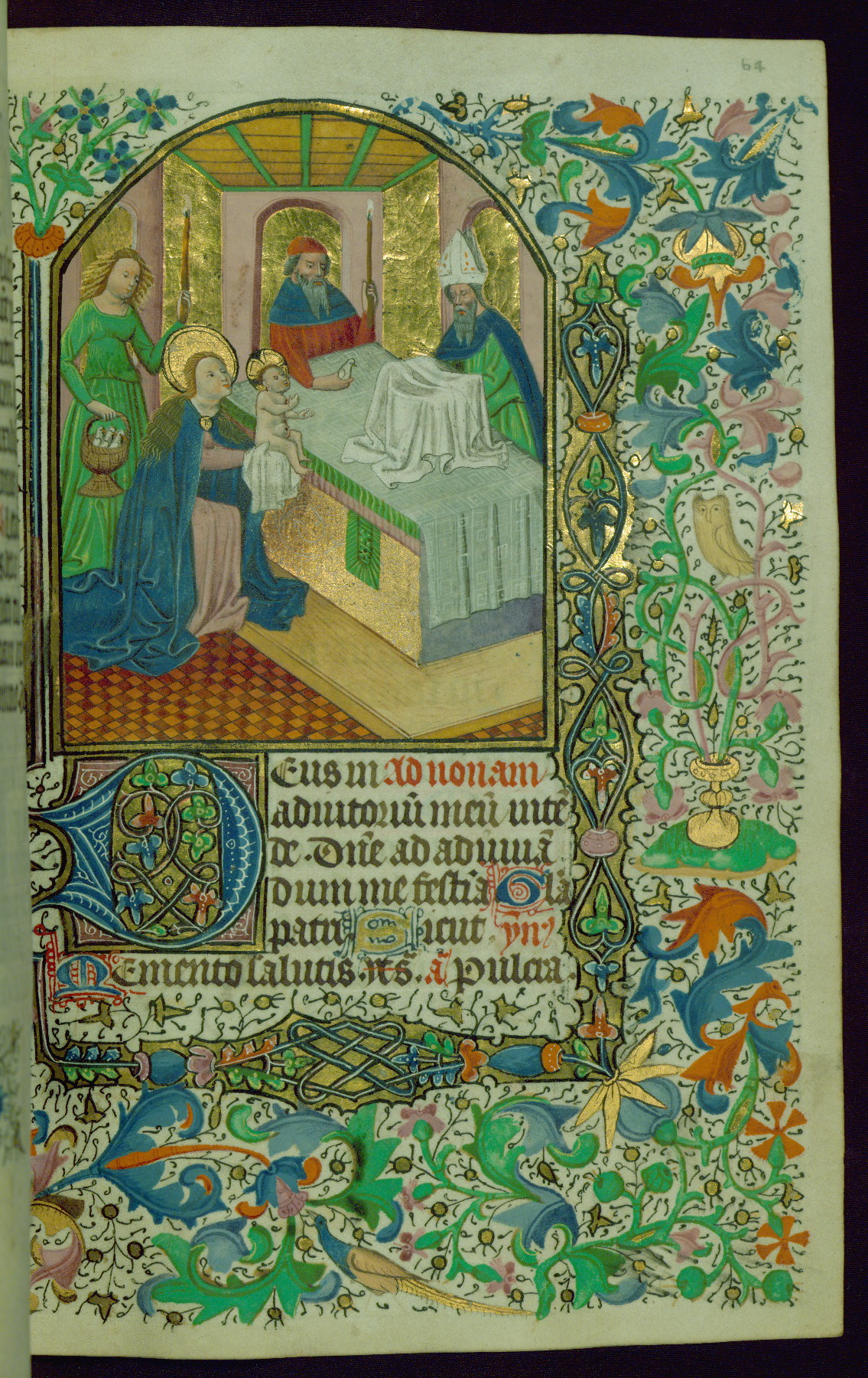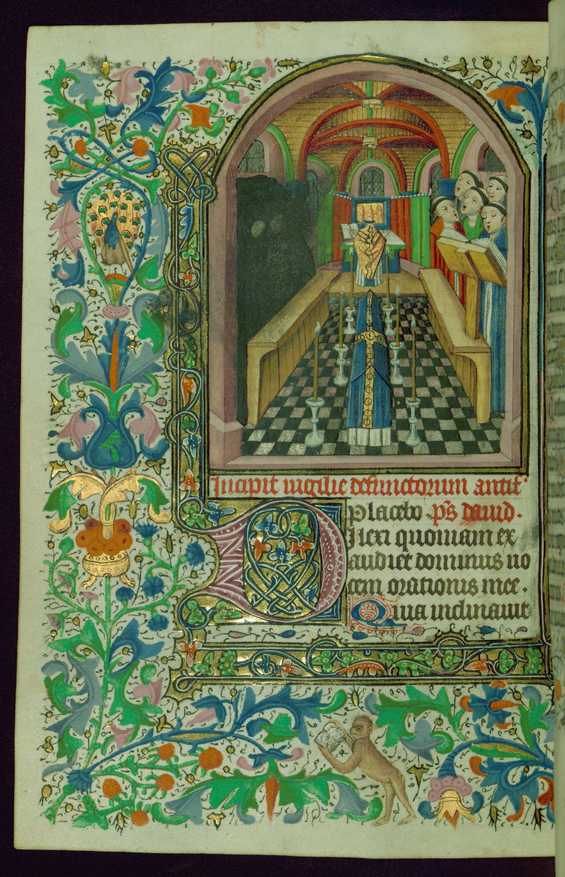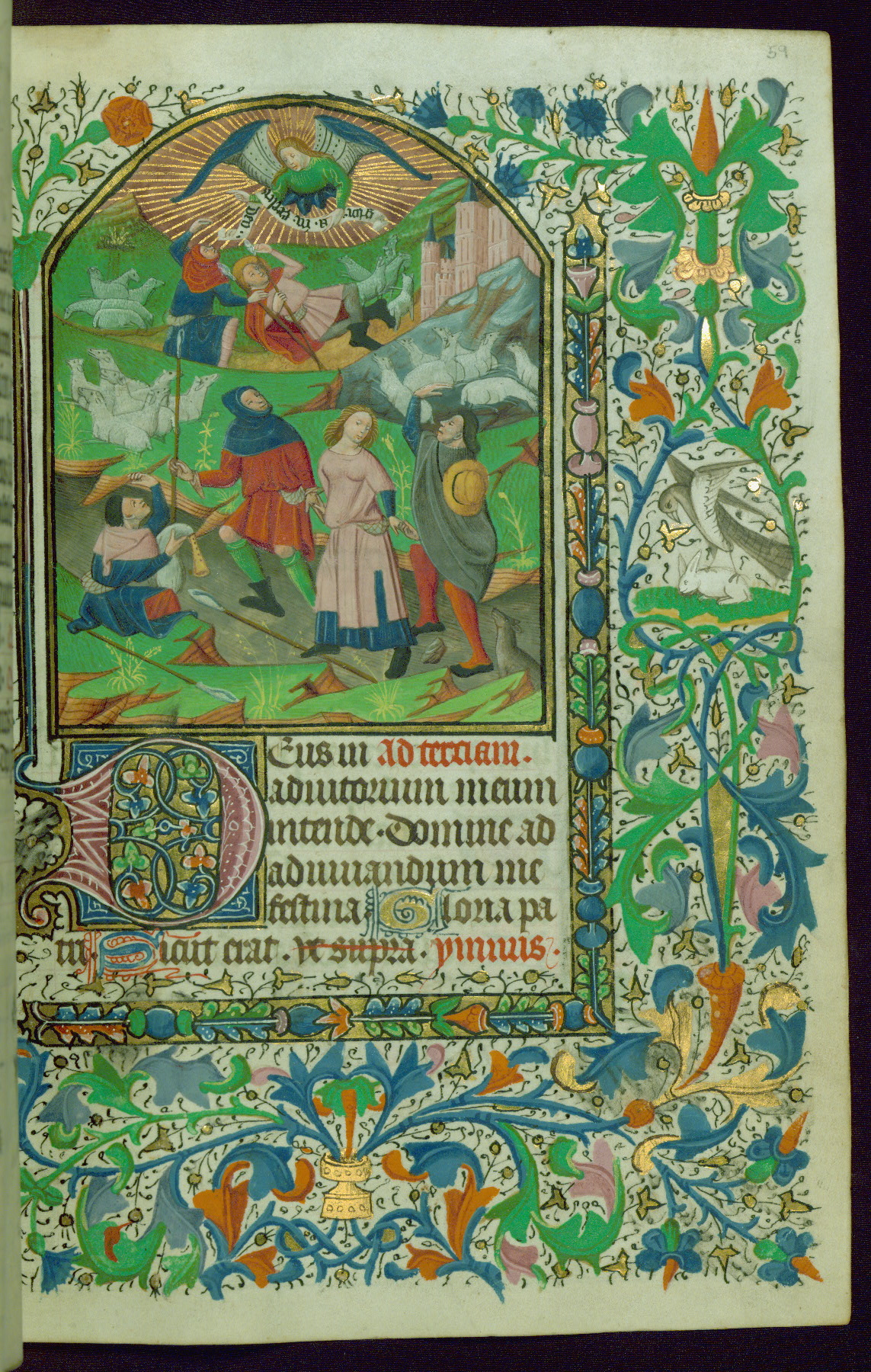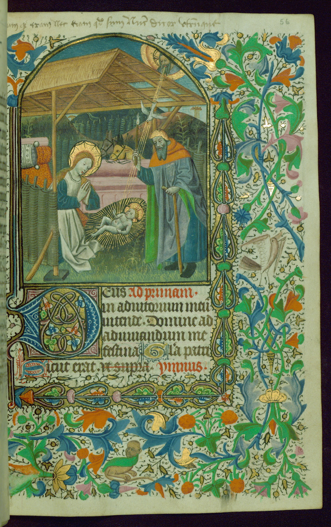 - Decoration note: Nineteen miniatures (fourteen original) varying in size from (9-17) lines by the Masters of the Gold Scrolls, Bruges, ca. 1440-50; additions attributed to Rouen, ca. 1500; decorated illuminated initials (2 and 5 lines) opposite miniatures found at text openings, at secondary text divisions, in calendar letters "K L" (2 lines); marginalia typically found at fore-edge: peacock, peahen, songbird; four notable marginalia fol. 25v: owl opposite songbird, fol. 36r: hybrid man wearing cape, fol. 59r: falcon pouncing on hare, fol. 93v: ape with book; heraldry found throughout, especially in added portions of text, heraldry in decorated illuminated initials: two each on fols. 8v and 9v; one each on fols. 8r and 9r; fols. 127v and 128r: heraldry; full-page heraldry: front flyleaf i; borders at text openings paired with miniatures: acanthus often orange/blue and green/grey-blue detailed in gold, sometimes candelabra designs found at fore-edge, symmetrical designs centralized at base; often floral sprigs, gold disks and leaves, marginalia; marginalia in calendar and text left on every page: acanthus in orange and blue or lilac-rose and green, some floral designs, fore-edge on versos filled with airy gold foliate tendril-rinceau with blossoms and berries, spine-edge rectos not typically embellished; rubrics in red, text in dark brown ink