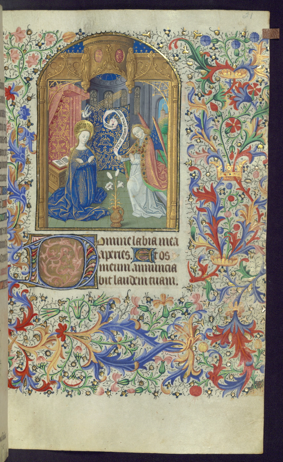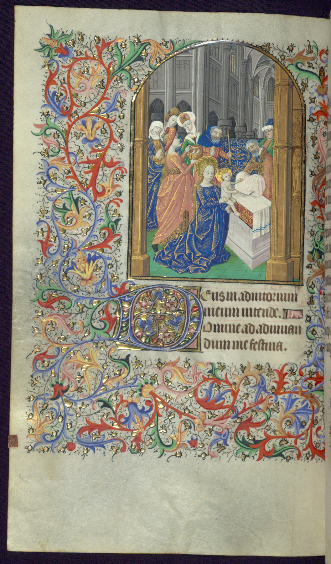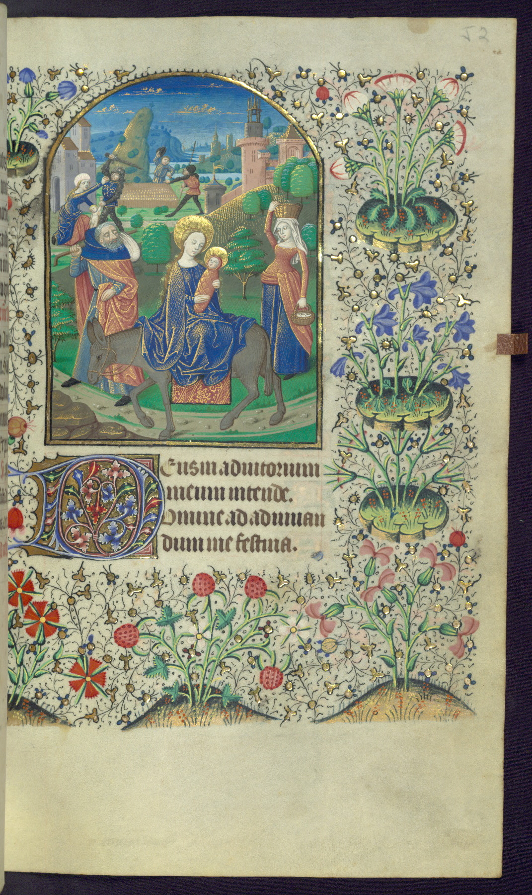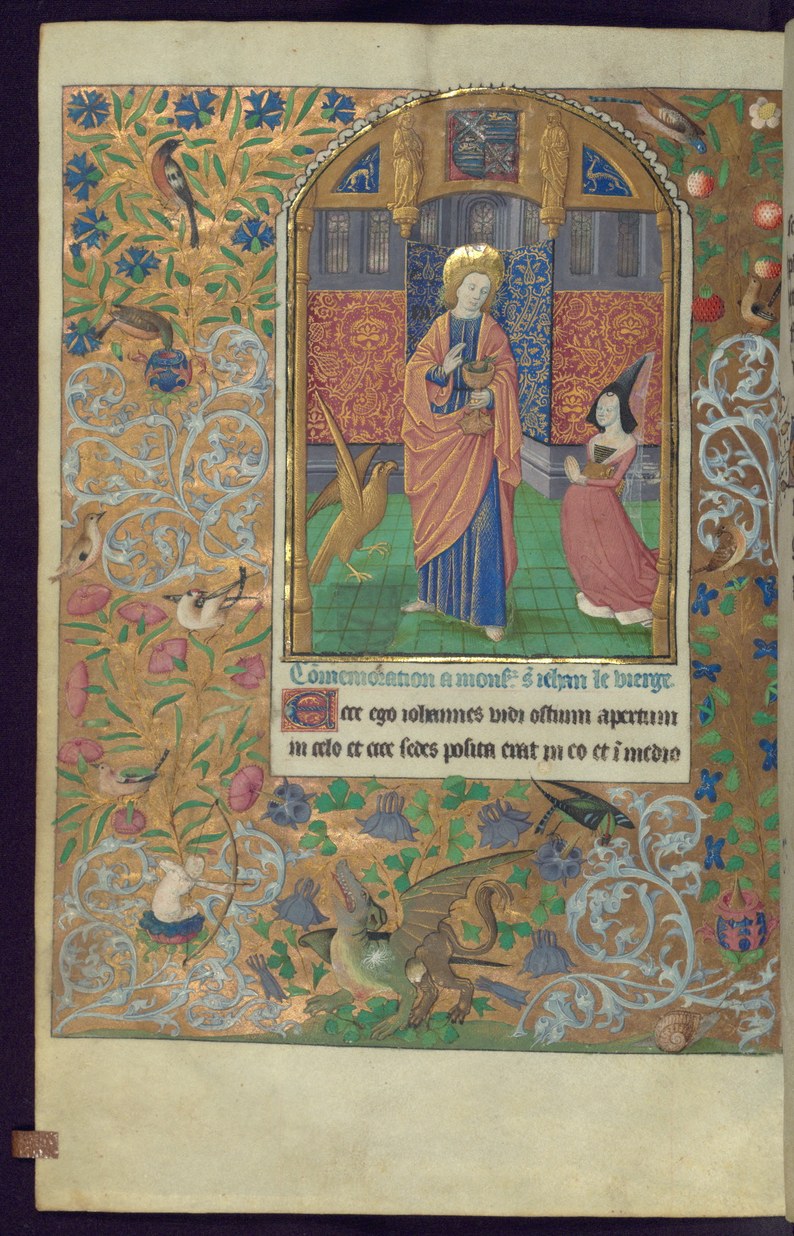 This French Book of Hours was produced in two phases: the text and most of the secondary decoration were completed in the 1420s, while thirteen large miniatures were added around 1480 by artists trained in Rouen in the style of the Master of the Geneva Latini. The initial female owner is depicted on fol. 139v kneeling in front of St. John the Evangelist. Two coats of arms probably associated with the owner appear twice, on fol. 139r-v. The celebration of specific calendar feasts indicates the volume’s original ownership in the diocese of Coutances, a part of the archbishopric of Rouen. The introduction of Nathan into the scene of the penitent David at the beginning of the Penitential Psalms was a popular theme in illumination in Rouen around this time. A special devotion to St. John the Evangelist is shown by an unusual citation of his name in the heading of a prayer to the Virgin on fol. 128v, and his unusually elaborate depiction on fol. 139v.