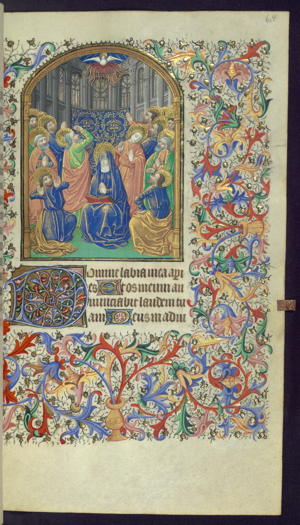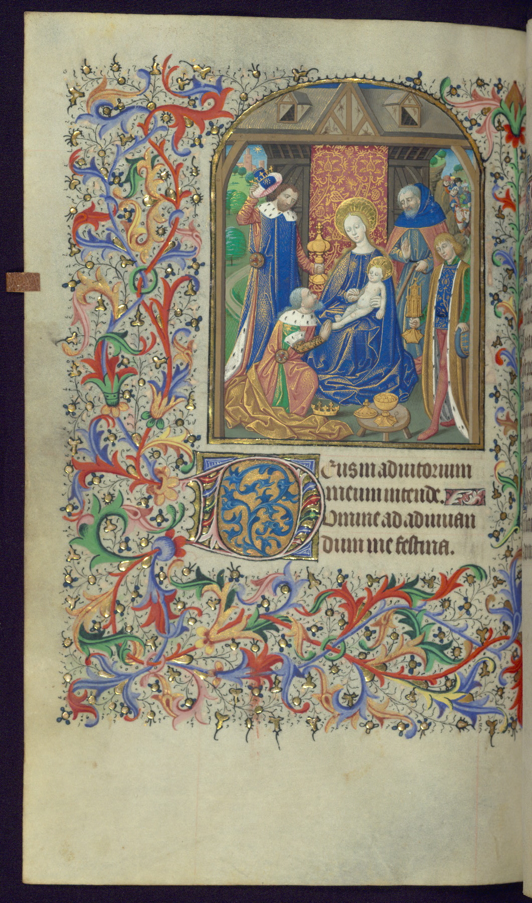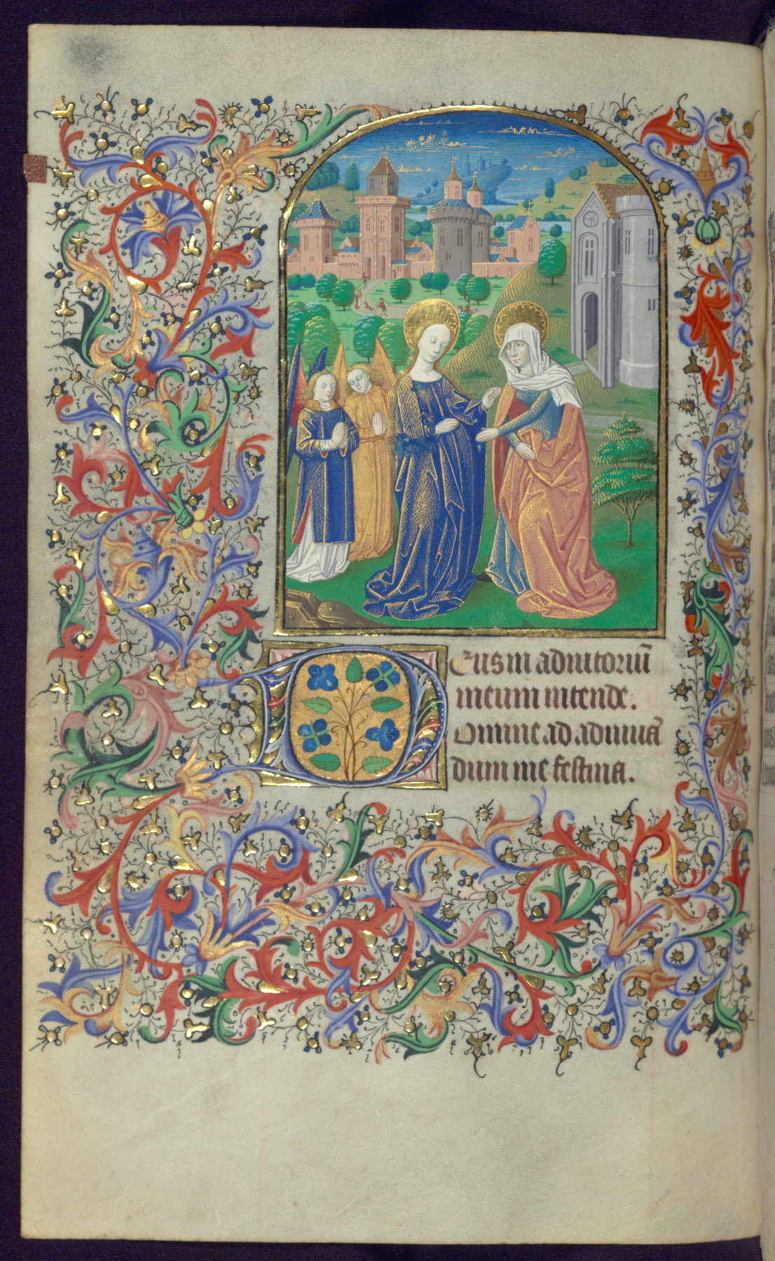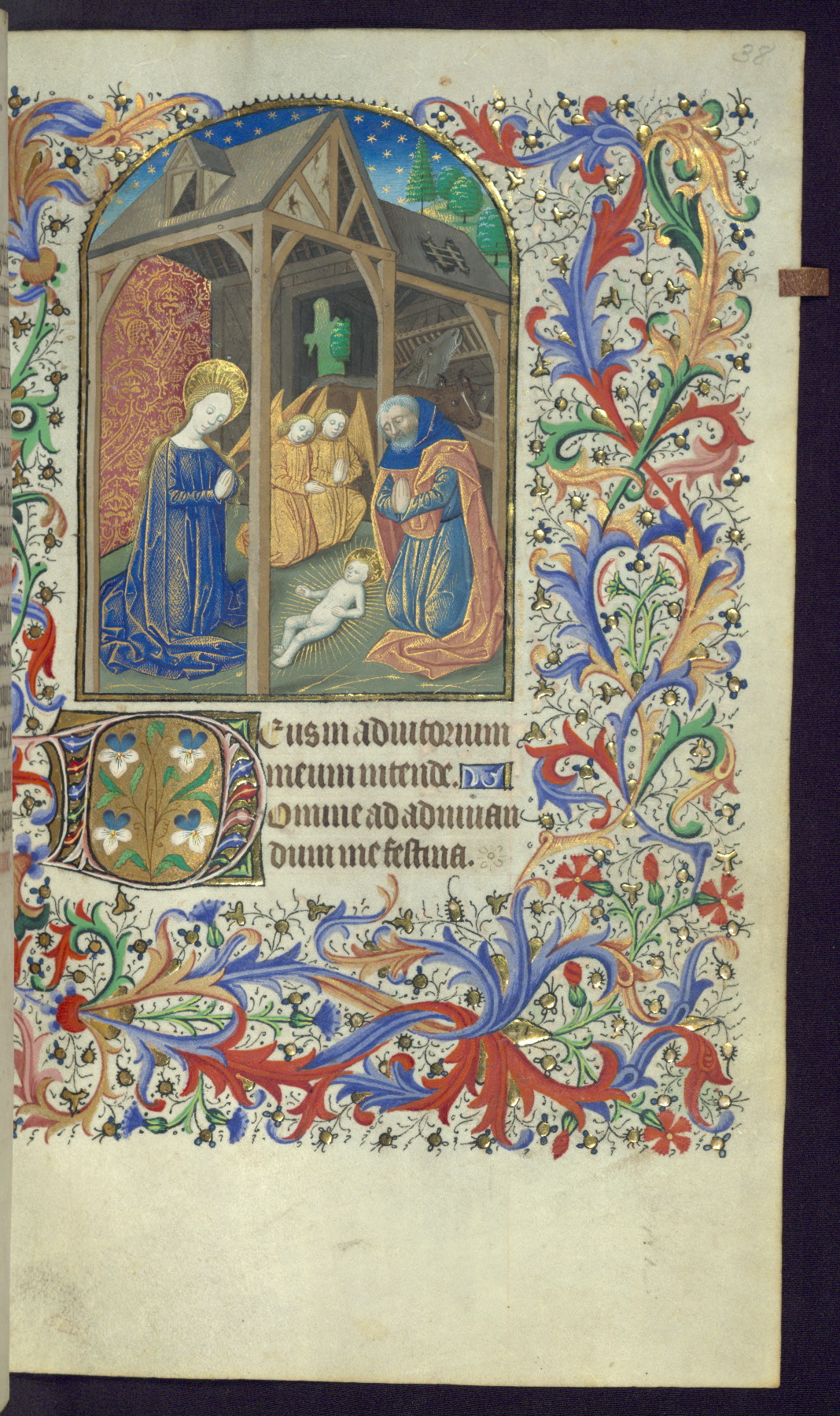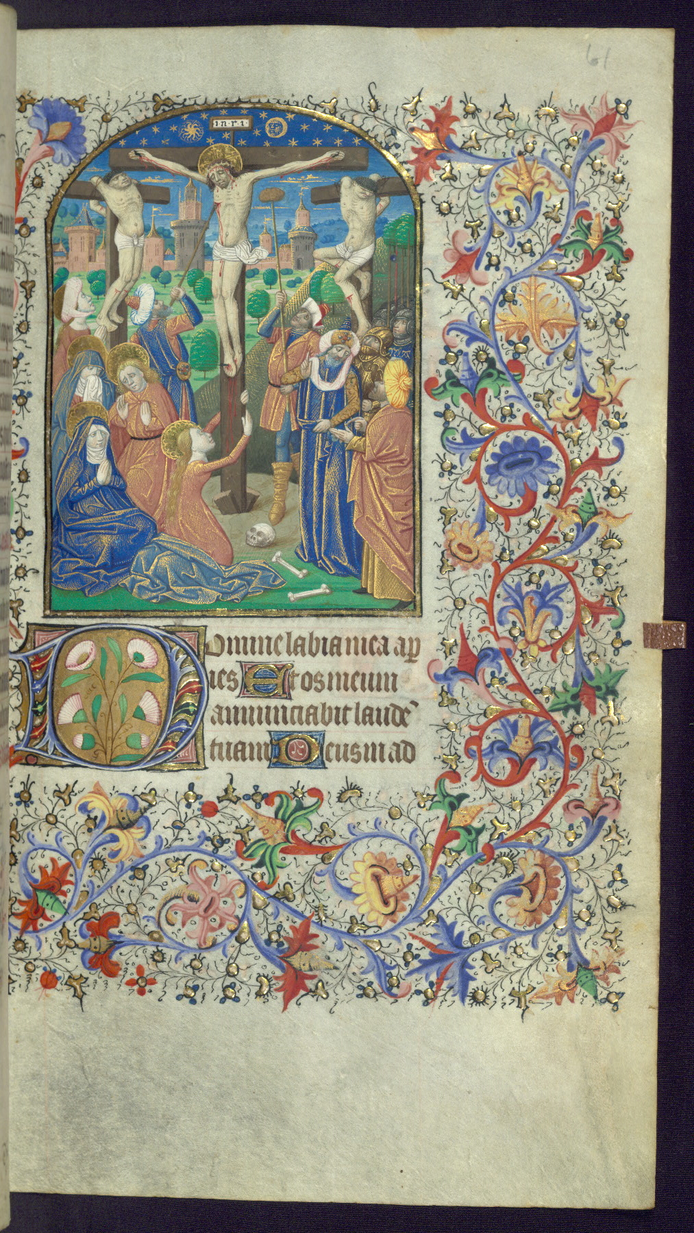 This French Book of Hours was produced in two phases: the text and most of the secondary decoration were completed in the 1420s, while thirteen large miniatures were added around 1480 by artists trained in Rouen in the style of the Master of the Geneva Latini. The initial female owner is depicted on fol. 139v kneeling in front of St. John the Evangelist. Two coats of arms probably associated with the owner appear twice, on fol. 139r-v. The celebration of specific calendar feasts indicates the volume’s original ownership in the diocese of Coutances, a part of the archbishopric of Rouen. The introduction of Nathan into the scene of the penitent David at the beginning of the Penitential Psalms was a popular theme in illumination in Rouen around this time. A special devotion to St. John the Evangelist is shown by an unusual citation of his name in the heading of a prayer to the Virgin on fol. 128v, and his unusually elaborate depiction on fol. 139v.