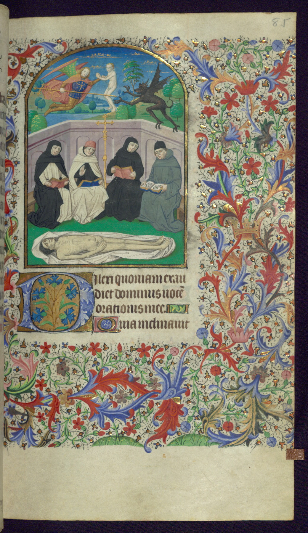 - Contents: Fols. 85r-118v: Office of the Dead for use of Coutances; Fols. 118v-125v: Suffrages with French headings: to Sts. Michael, John Baptist, Peter and Paul, John Evangelist, James the Greater, All Apostles, Lawrence, Christopher, Sebastian, Martin, Nicolas, Maurus, Aegydius, Mary Magdalene, Catherine, Susanna, Margaret, All Saints