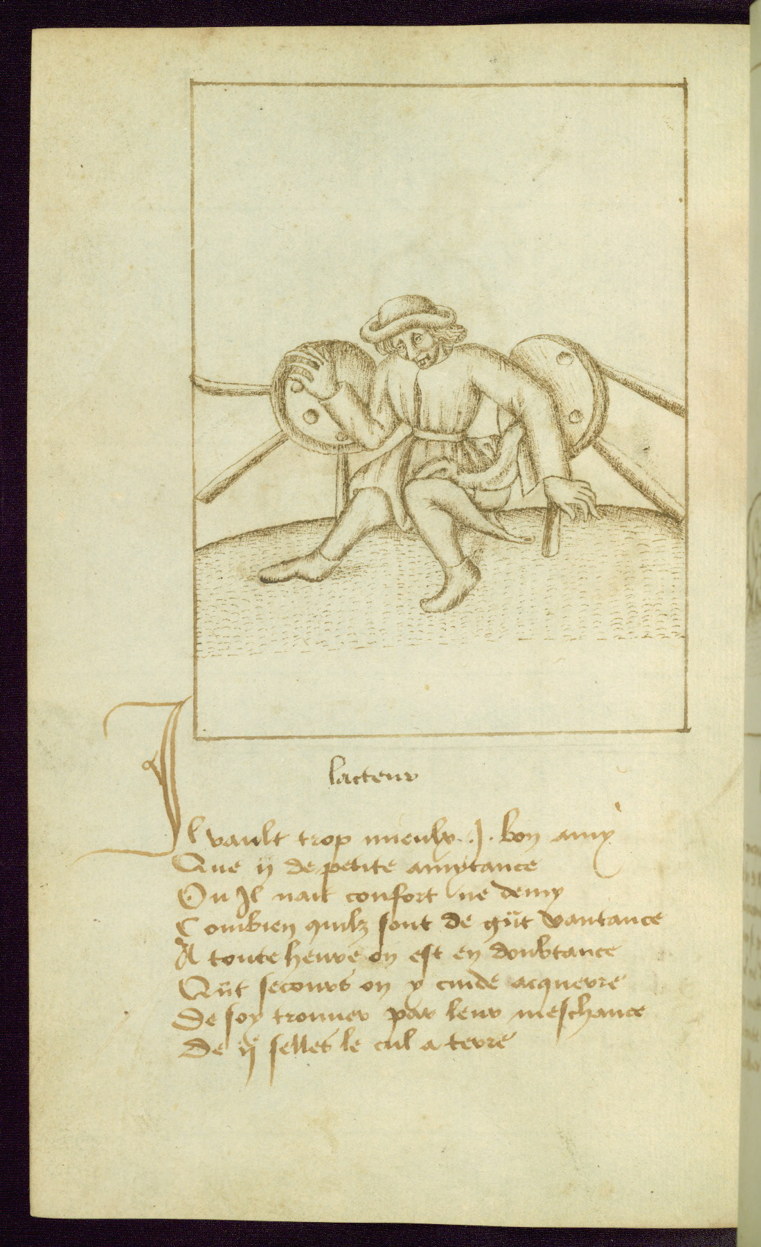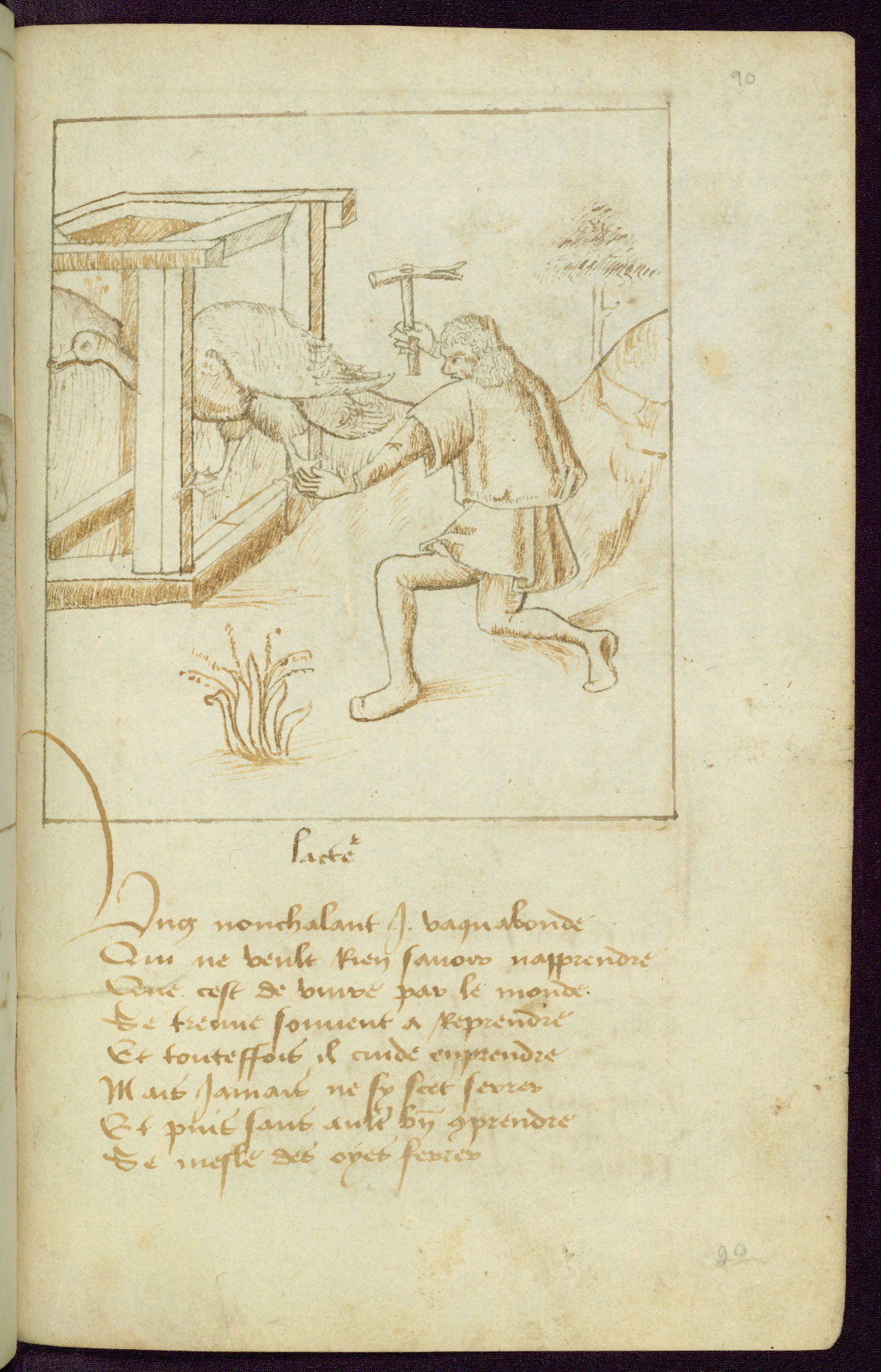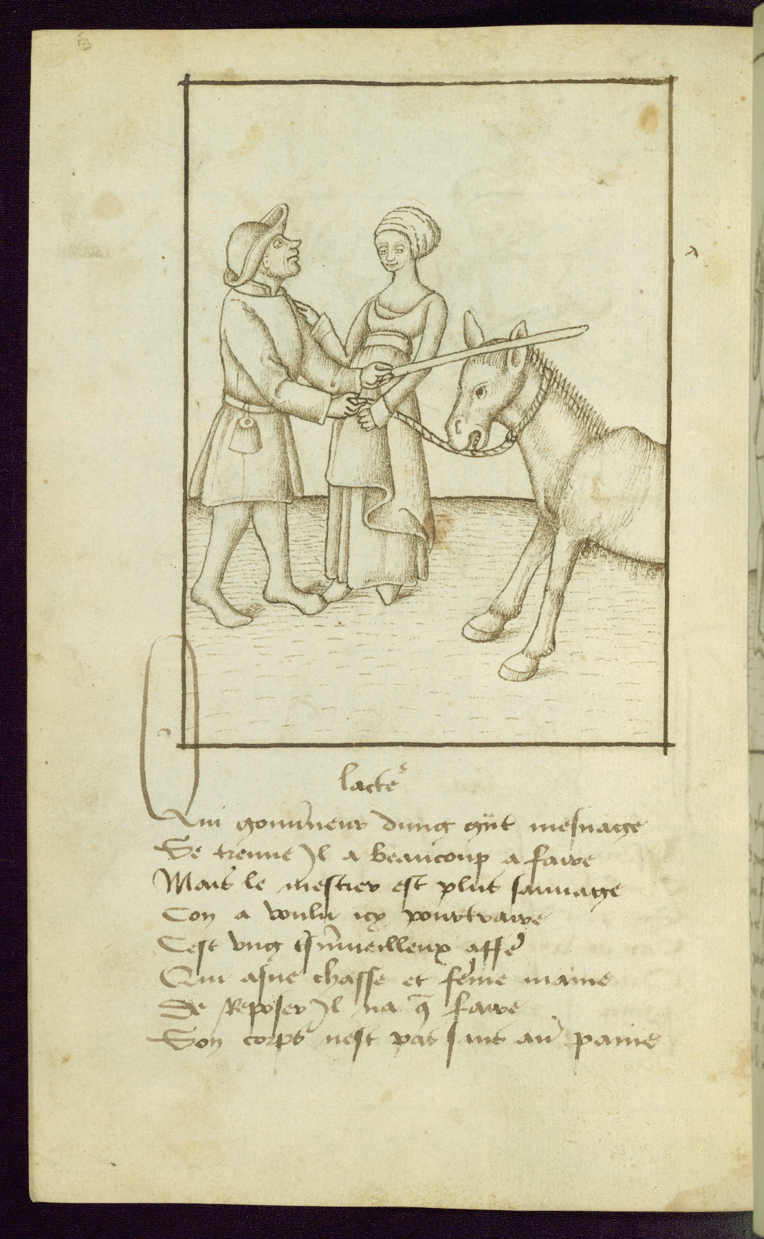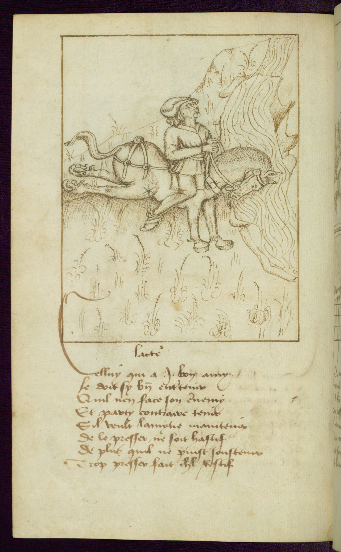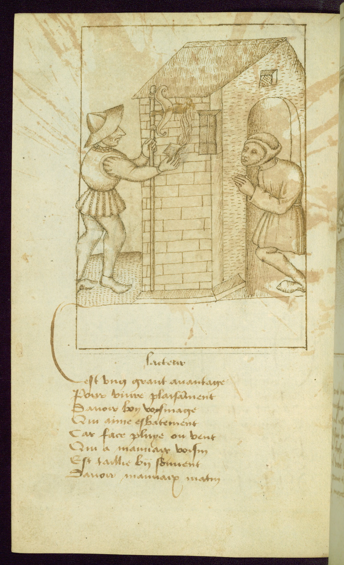 This late fifteenth-century manuscript is one of the earliest surviving examples from a small group of illustrated compilations of proverbs. Each drawing and accompanying verse refer to a commonly known proverb or turn of phrase. The verse does not typically include the phrase, so the combination of image and text is like a riddle that would bring the saying to mind (the proverbs are used in this catalog record as the titles of the images). The proverbs can be both entertaining and moralizing, and they frequently refer to religious life, farming and trades, and acceptable (or unacceptable) behavior. This manuscript originally contained more entries, but several leaves were detached at some point or not included when the book was rebound. Two leaves separated from this manuscript are now in the Wildenstein Collection at the Musée Marmottan in Paris. A third individual leaf (fol.add.1), which has significant damage on one side, was purchased by the Walters Art Museum in the 1990s.