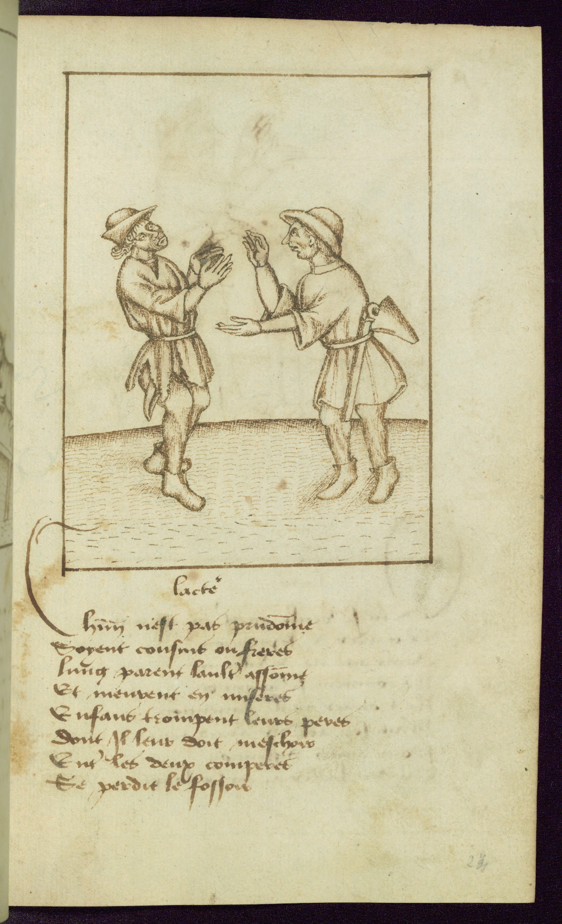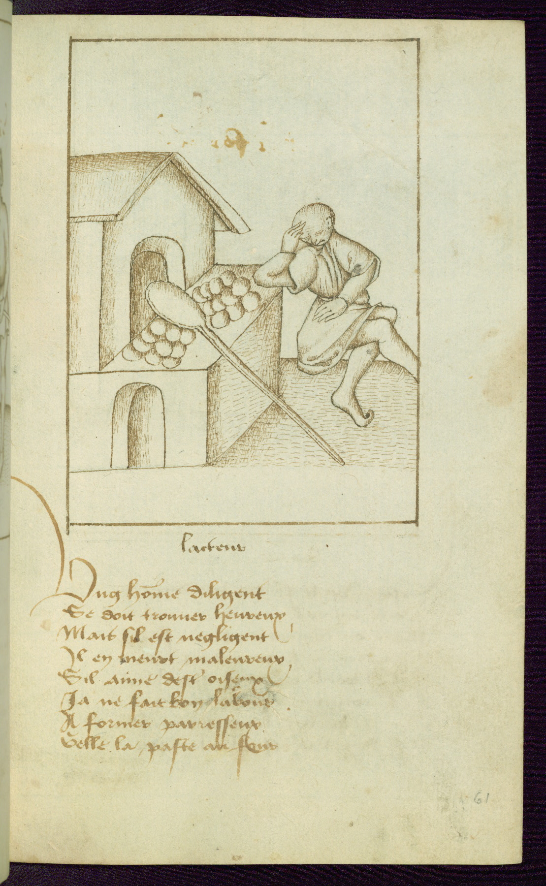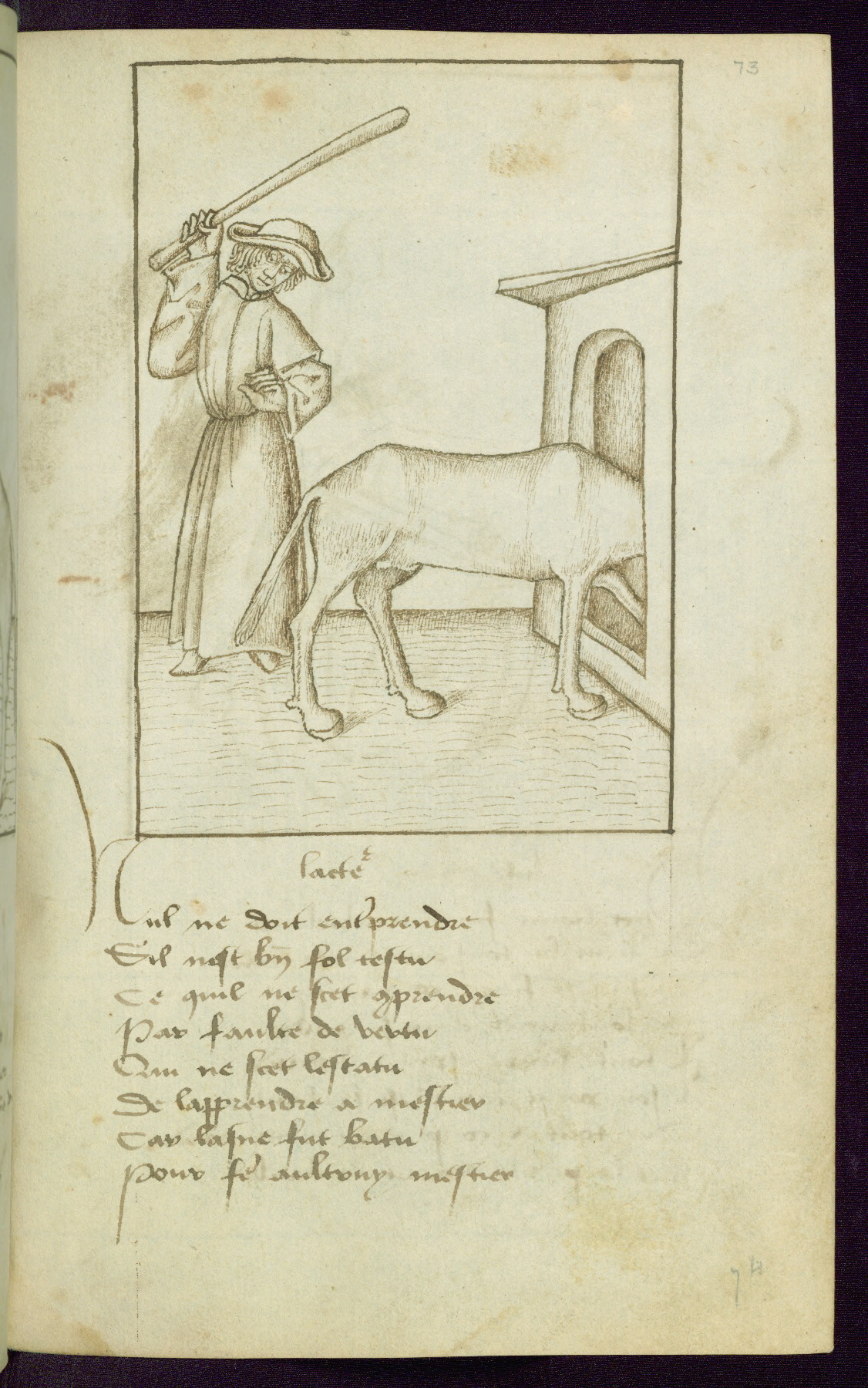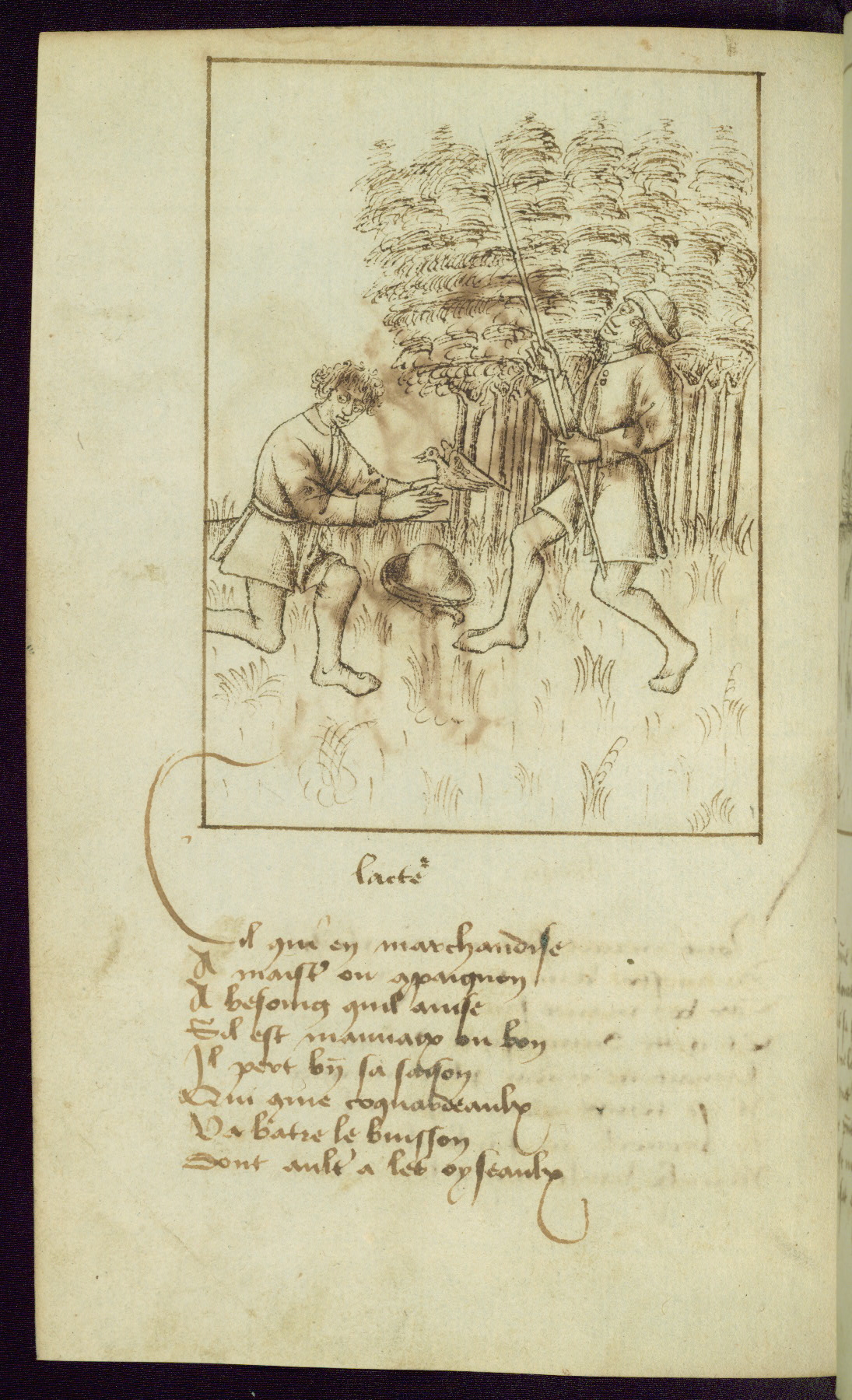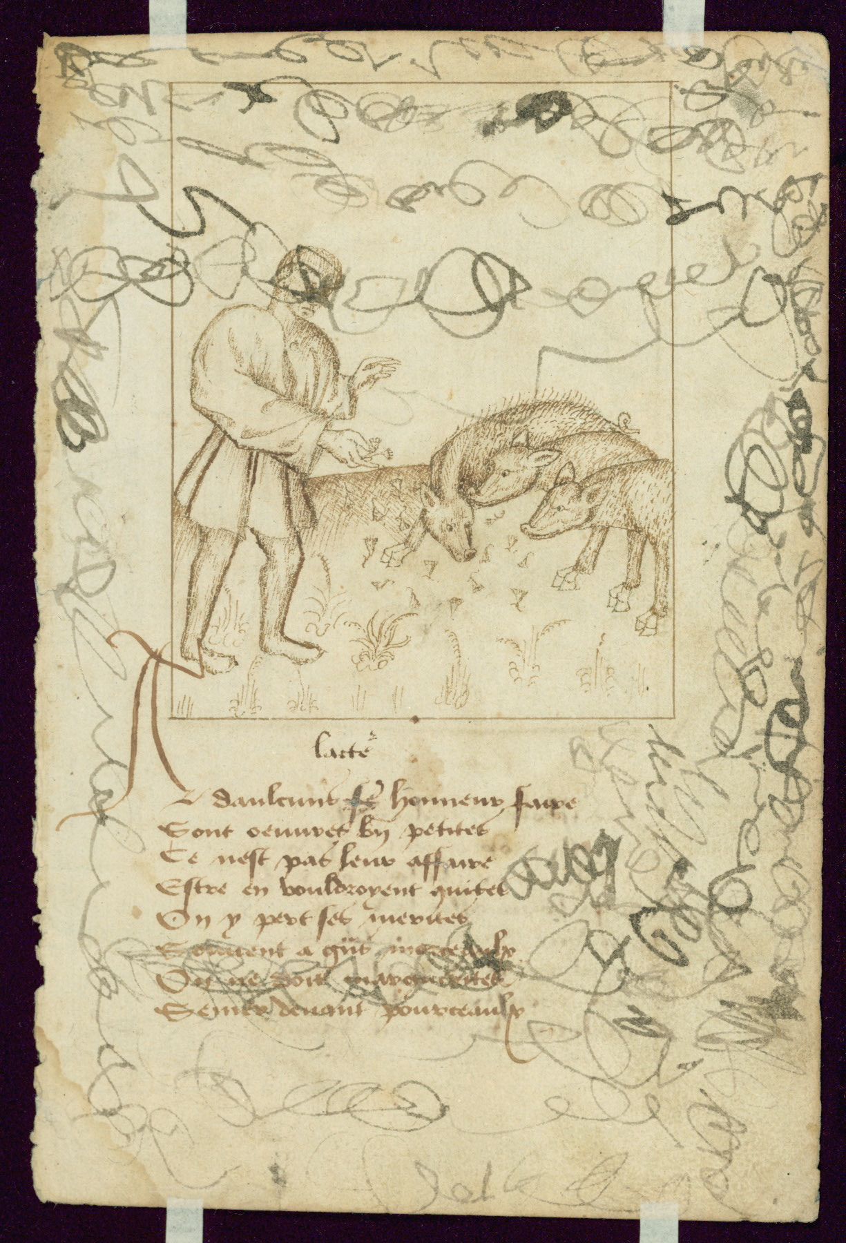 This late fifteenth-century manuscript is one of the earliest surviving examples from a small group of illustrated compilations of proverbs. Each drawing and accompanying verse refer to a commonly known proverb or turn of phrase. The verse does not typically include the phrase, so the combination of image and text is like a riddle that would bring the saying to mind (the proverbs are used in this catalog record as the titles of the images). The proverbs can be both entertaining and moralizing, and they frequently refer to religious life, farming and trades, and acceptable (or unacceptable) behavior. This manuscript originally contained more entries, but several leaves were detached at some point or not included when the book was rebound. Two leaves separated from this manuscript are now in the Wildenstein Collection at the Musée Marmottan in Paris. A third individual leaf (fol.add.1), which has significant damage on one side, was purchased by the Walters Art Museum in the 1990s.