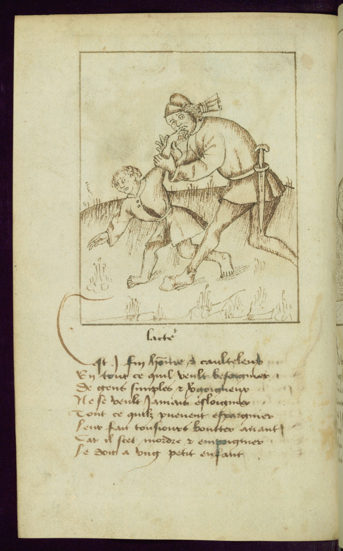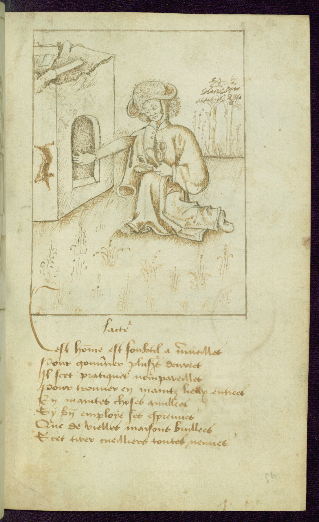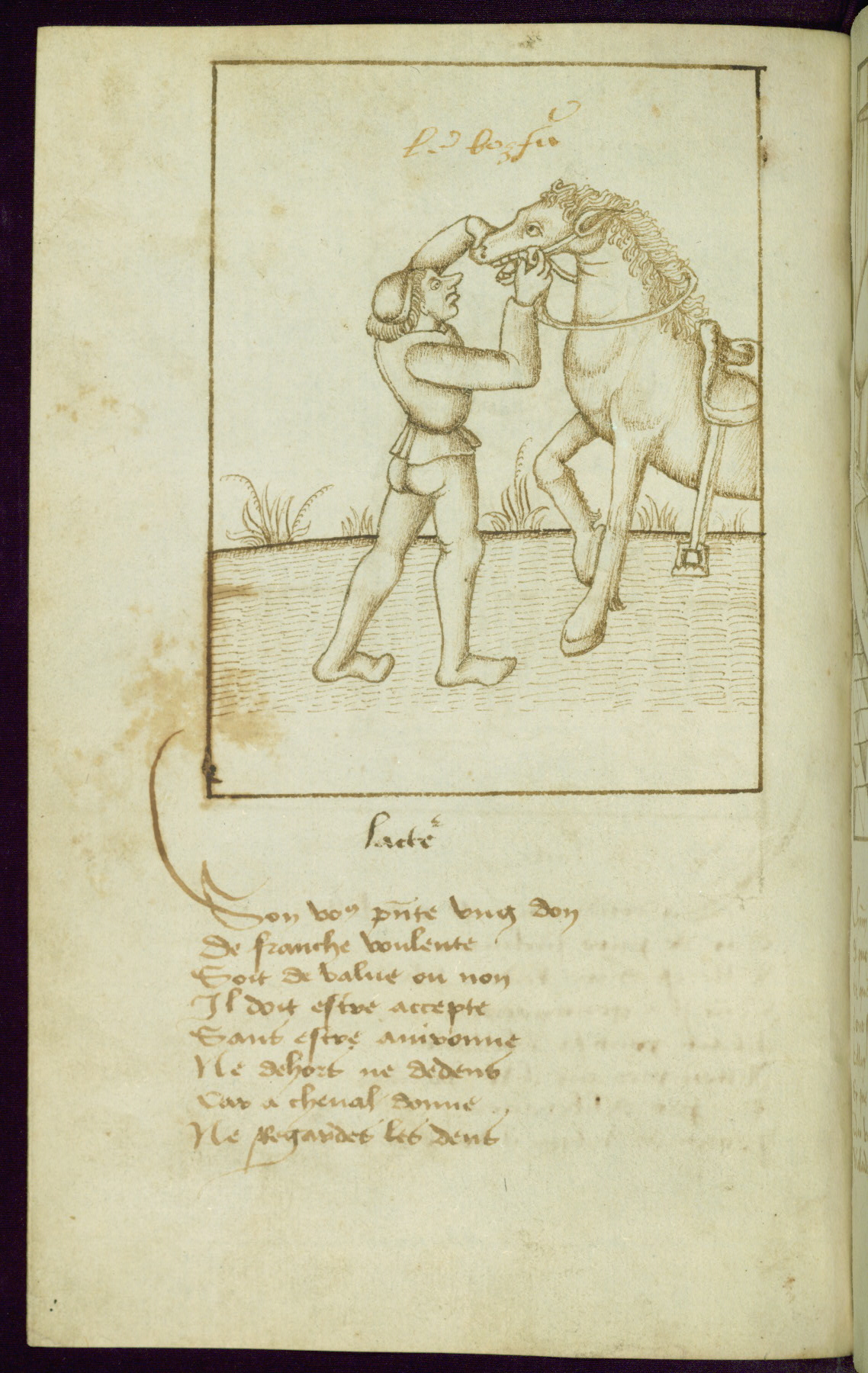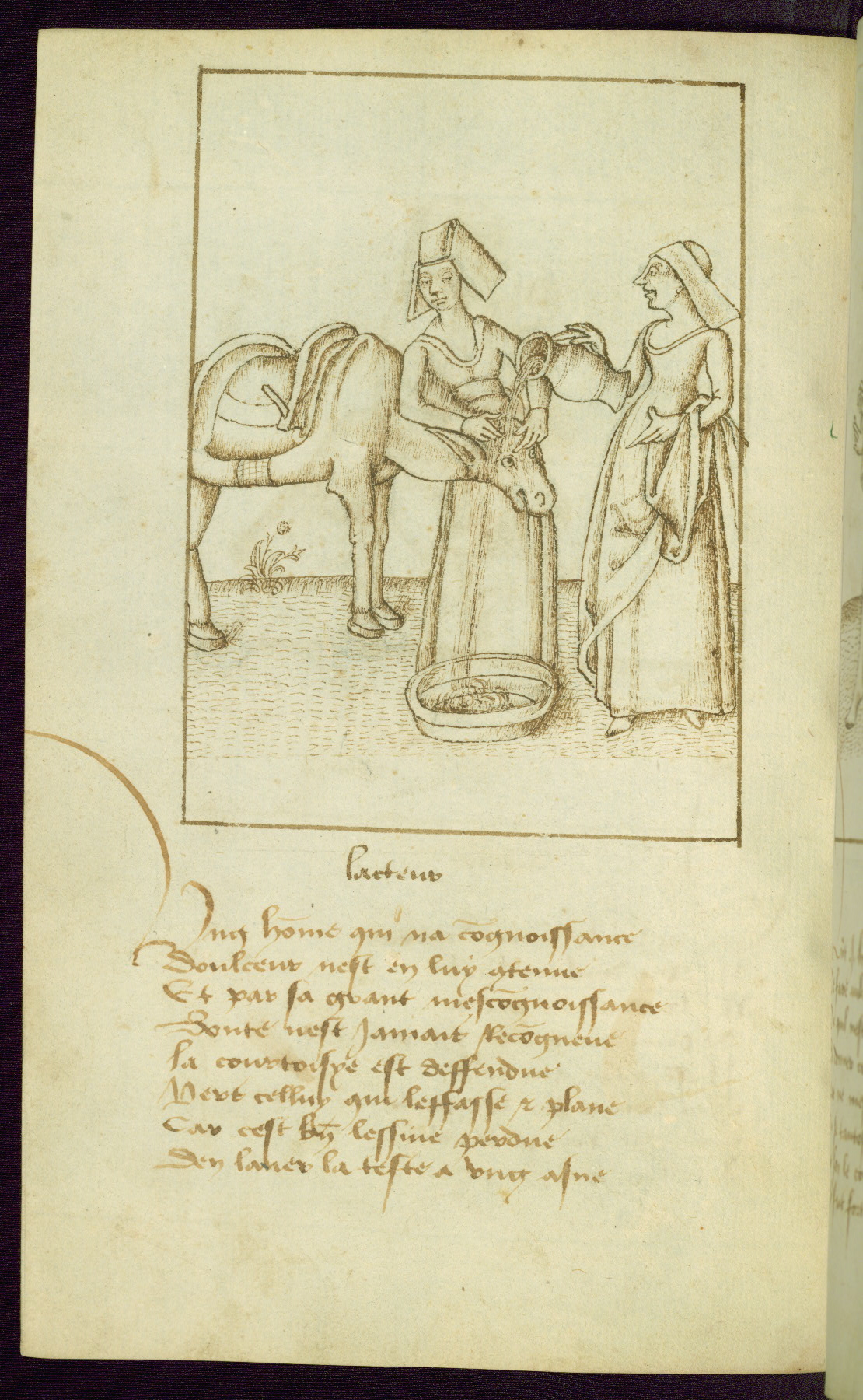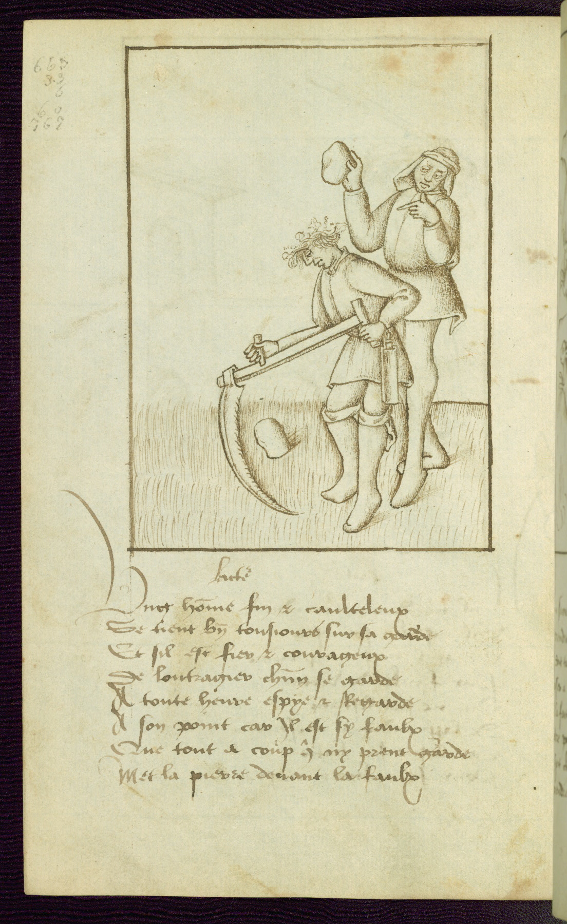 This late fifteenth-century manuscript is one of the earliest surviving examples from a small group of illustrated compilations of proverbs. Each drawing and accompanying verse refer to a commonly known proverb or turn of phrase. The verse does not typically include the phrase, so the combination of image and text is like a riddle that would bring the saying to mind (the proverbs are used in this catalog record as the titles of the images). The proverbs can be both entertaining and moralizing, and they frequently refer to religious life, farming and trades, and acceptable (or unacceptable) behavior. This manuscript originally contained more entries, but several leaves were detached at some point or not included when the book was rebound. Two leaves separated from this manuscript are now in the Wildenstein Collection at the Musée Marmottan in Paris. A third individual leaf (fol.add.1), which has significant damage on one side, was purchased by the Walters Art Museum in the 1990s.