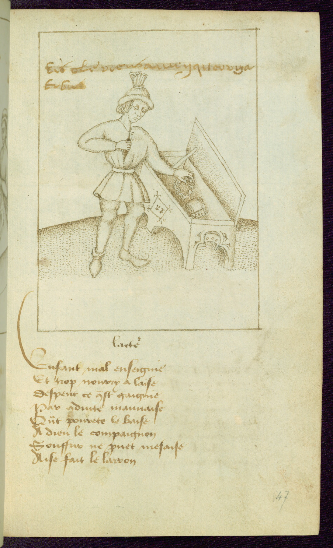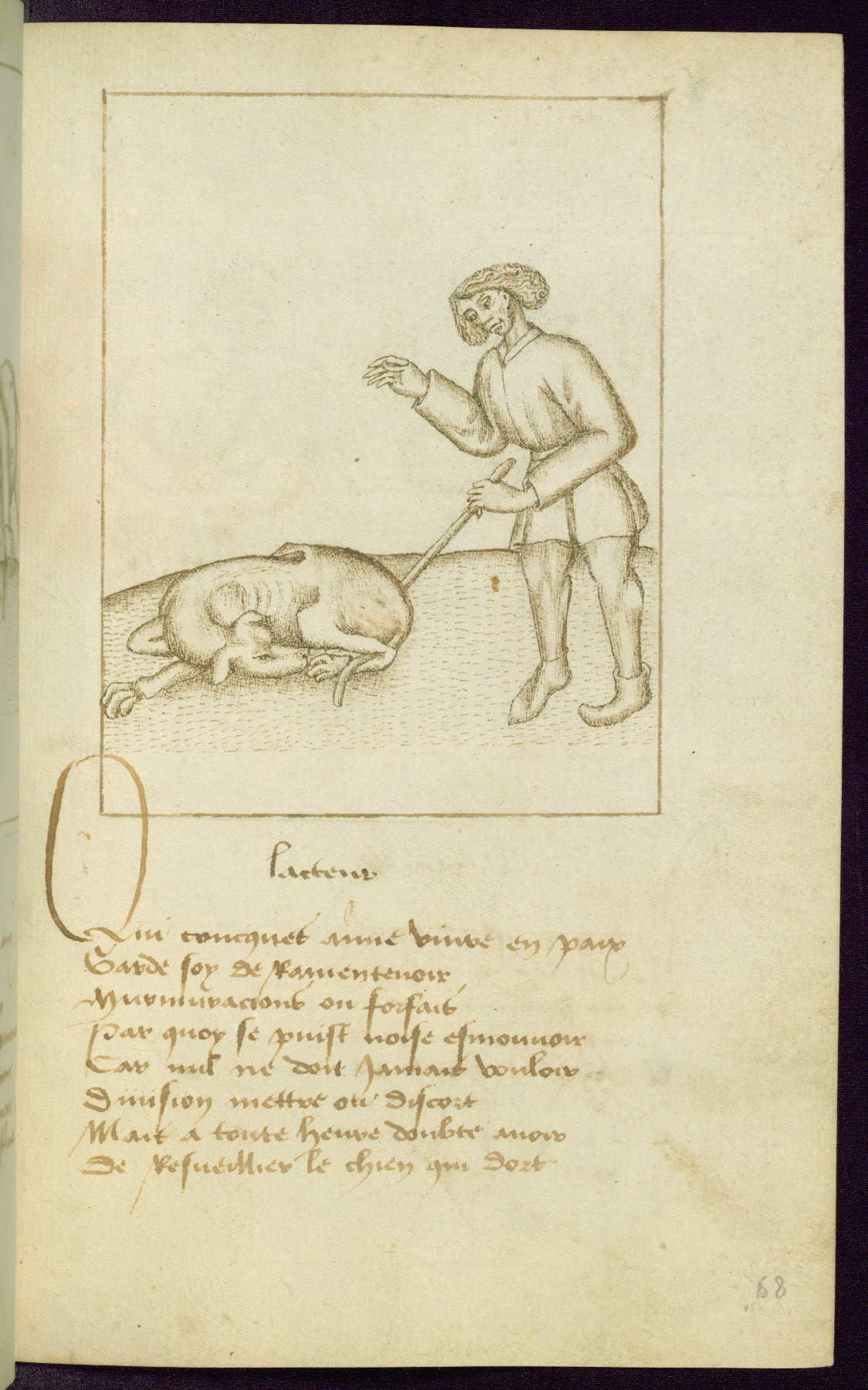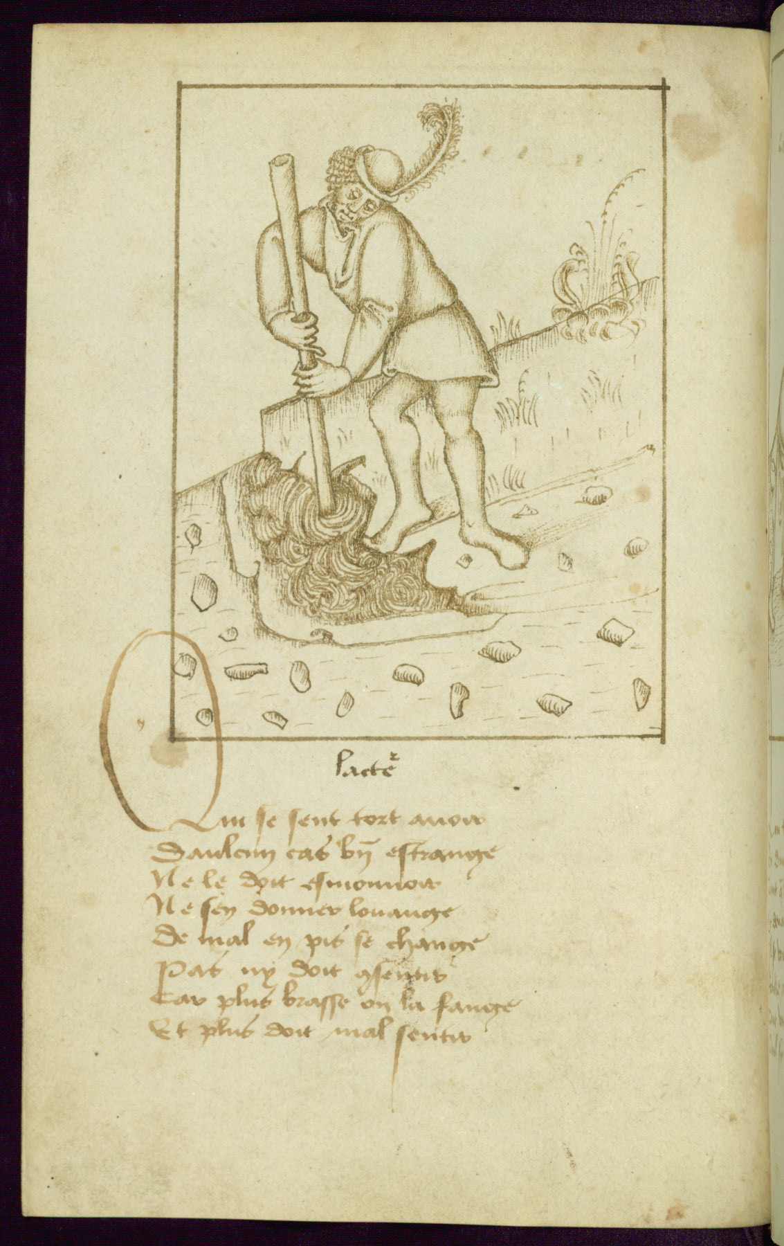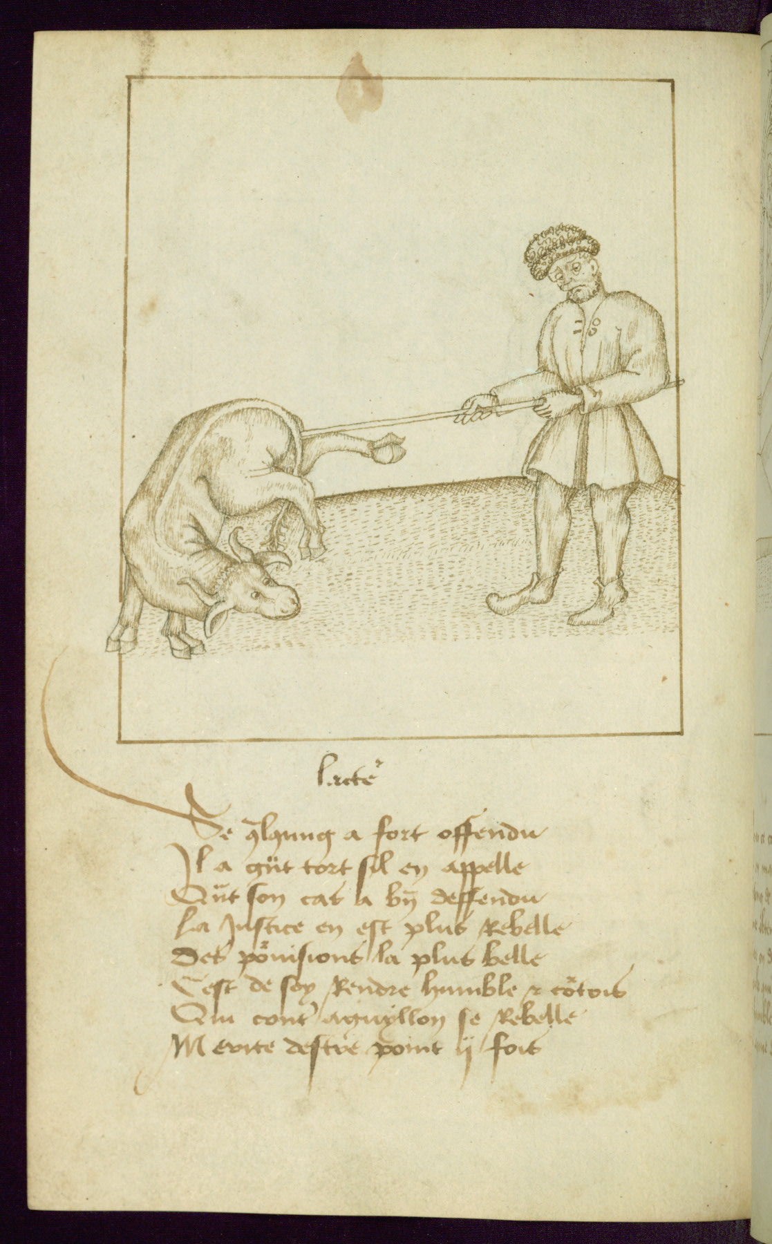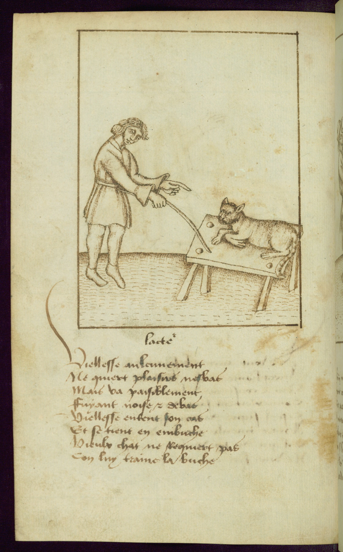 This late fifteenth-century manuscript is one of the earliest surviving examples from a small group of illustrated compilations of proverbs. Each drawing and accompanying verse refer to a commonly known proverb or turn of phrase. The verse does not typically include the phrase, so the combination of image and text is like a riddle that would bring the saying to mind (the proverbs are used in this catalog record as the titles of the images). The proverbs can be both entertaining and moralizing, and they frequently refer to religious life, farming and trades, and acceptable (or unacceptable) behavior. This manuscript originally contained more entries, but several leaves were detached at some point or not included when the book was rebound. Two leaves separated from this manuscript are now in the Wildenstein Collection at the Musée Marmottan in Paris. A third individual leaf (fol.add.1), which has significant damage on one side, was purchased by the Walters Art Museum in the 1990s.