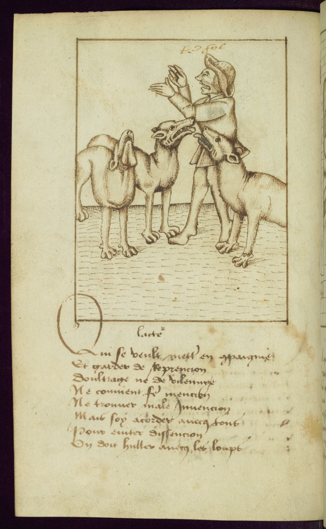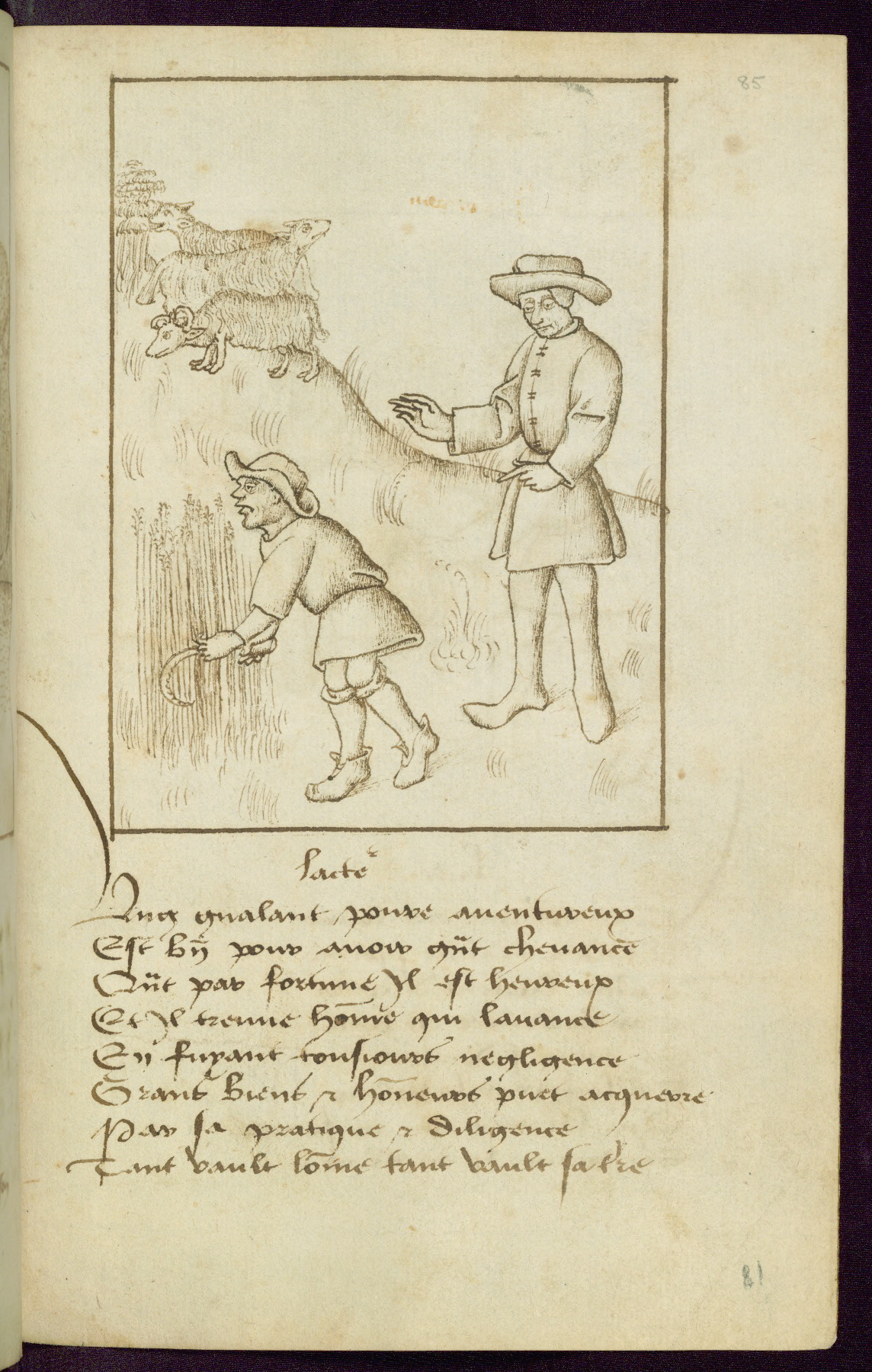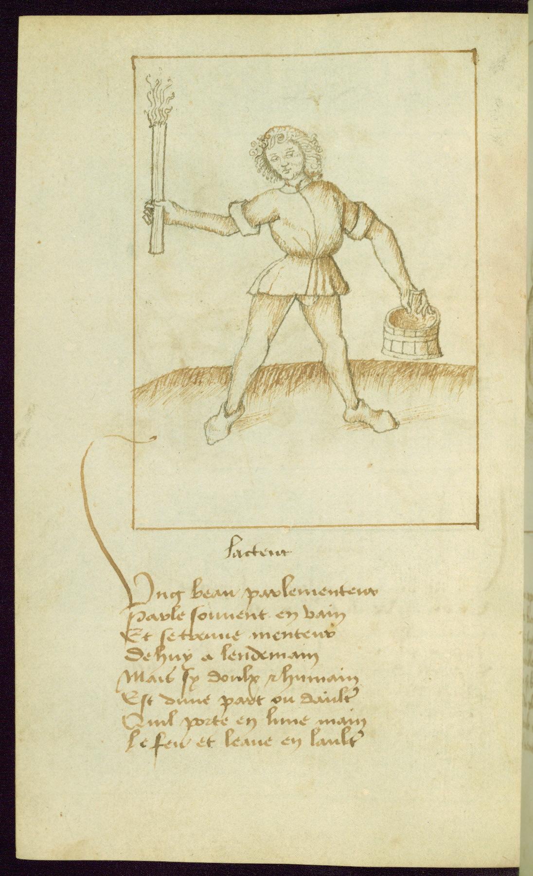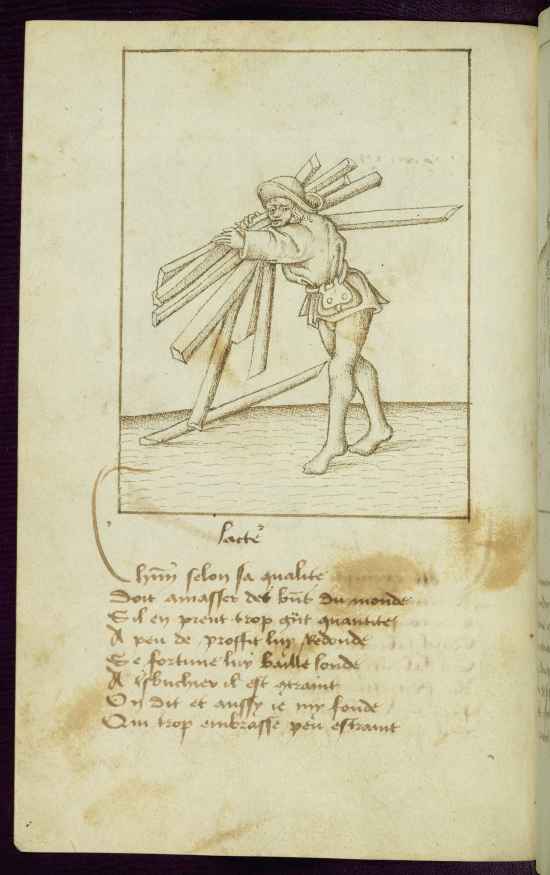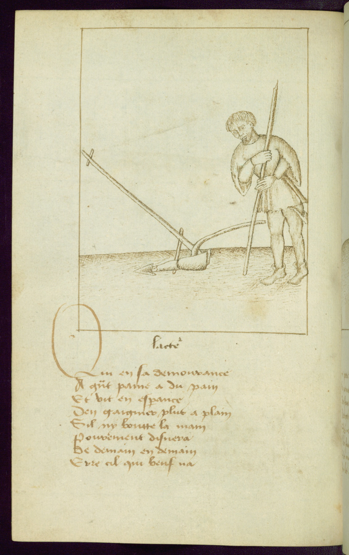 This late fifteenth-century manuscript is one of the earliest surviving examples from a small group of illustrated compilations of proverbs. Each drawing and accompanying verse refer to a commonly known proverb or turn of phrase. The verse does not typically include the phrase, so the combination of image and text is like a riddle that would bring the saying to mind (the proverbs are used in this catalog record as the titles of the images). The proverbs can be both entertaining and moralizing, and they frequently refer to religious life, farming and trades, and acceptable (or unacceptable) behavior. This manuscript originally contained more entries, but several leaves were detached at some point or not included when the book was rebound. Two leaves separated from this manuscript are now in the Wildenstein Collection at the Musée Marmottan in Paris. A third individual leaf (fol.add.1), which has significant damage on one side, was purchased by the Walters Art Museum in the 1990s.