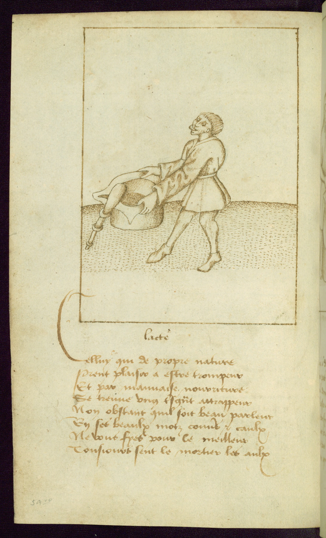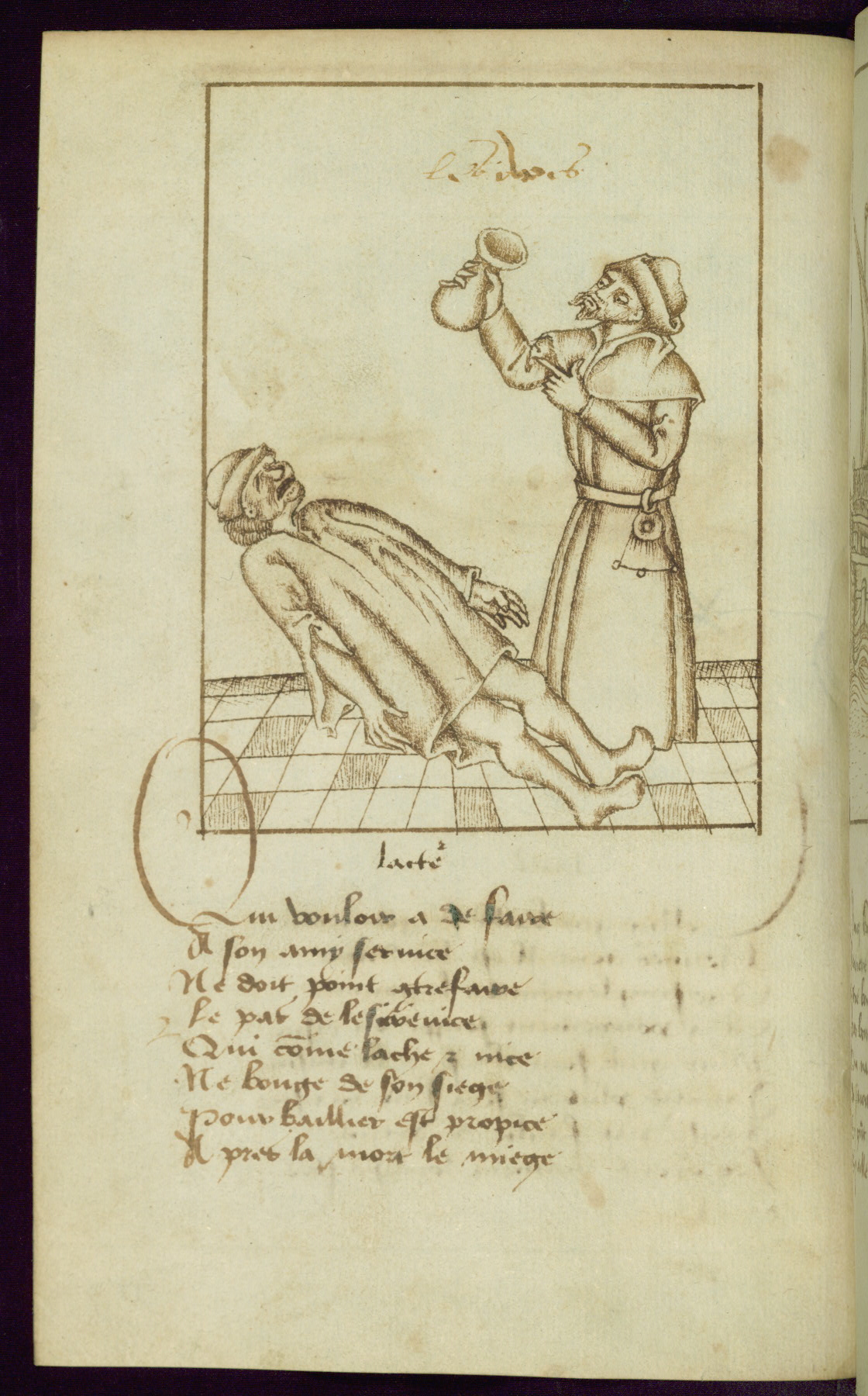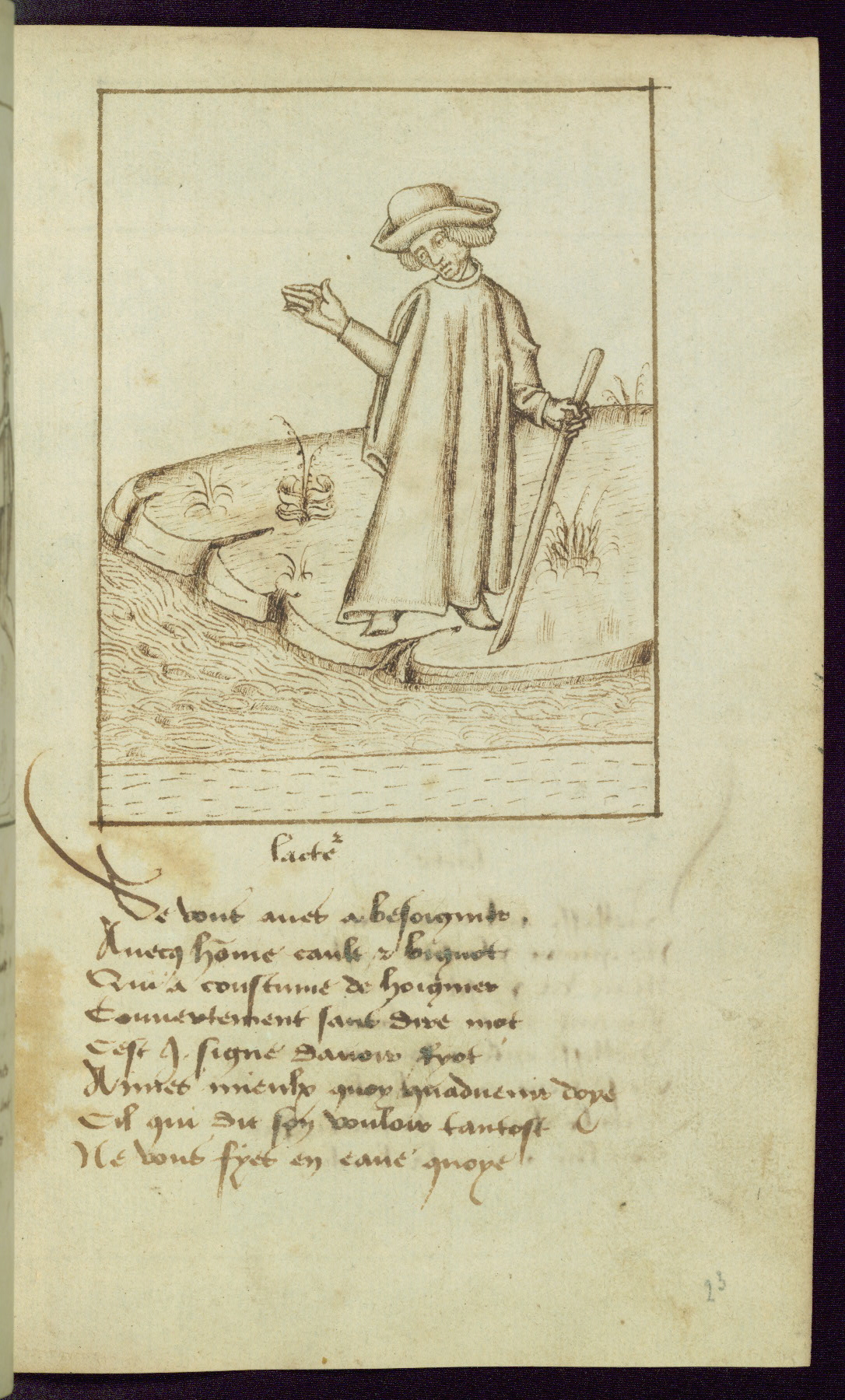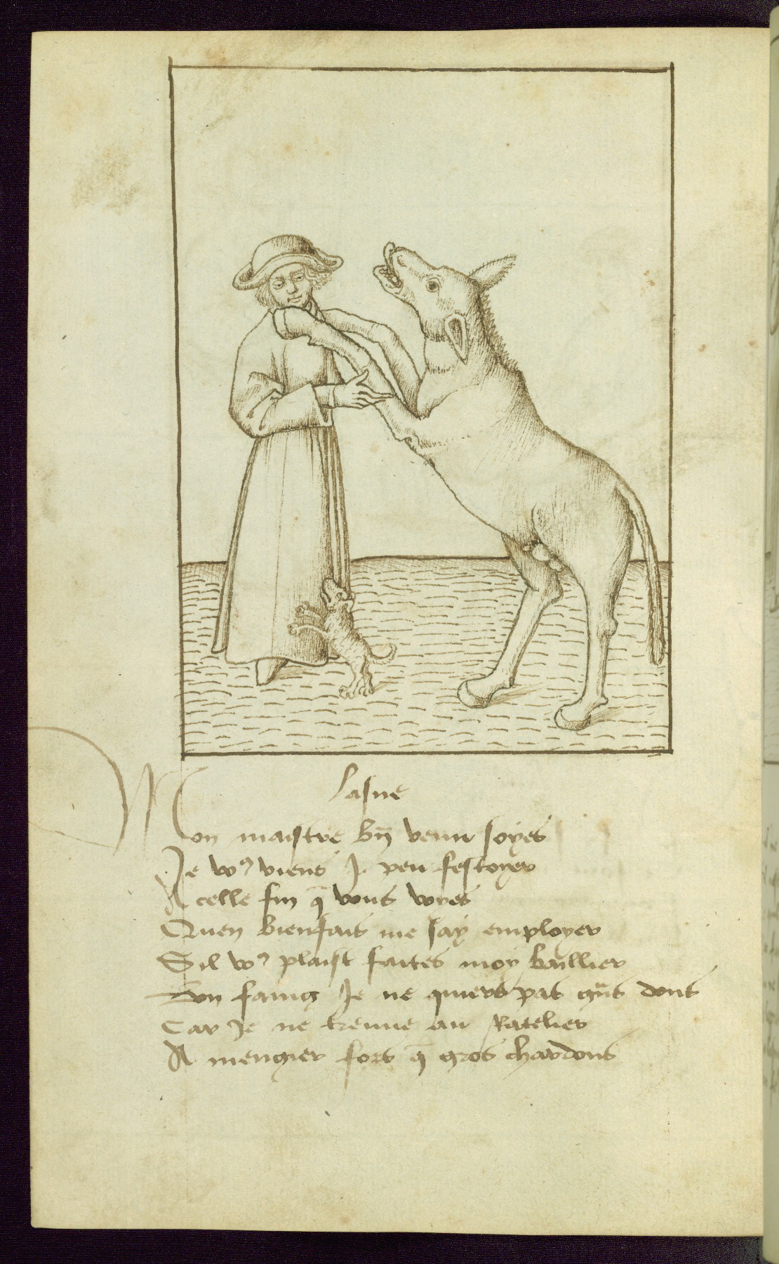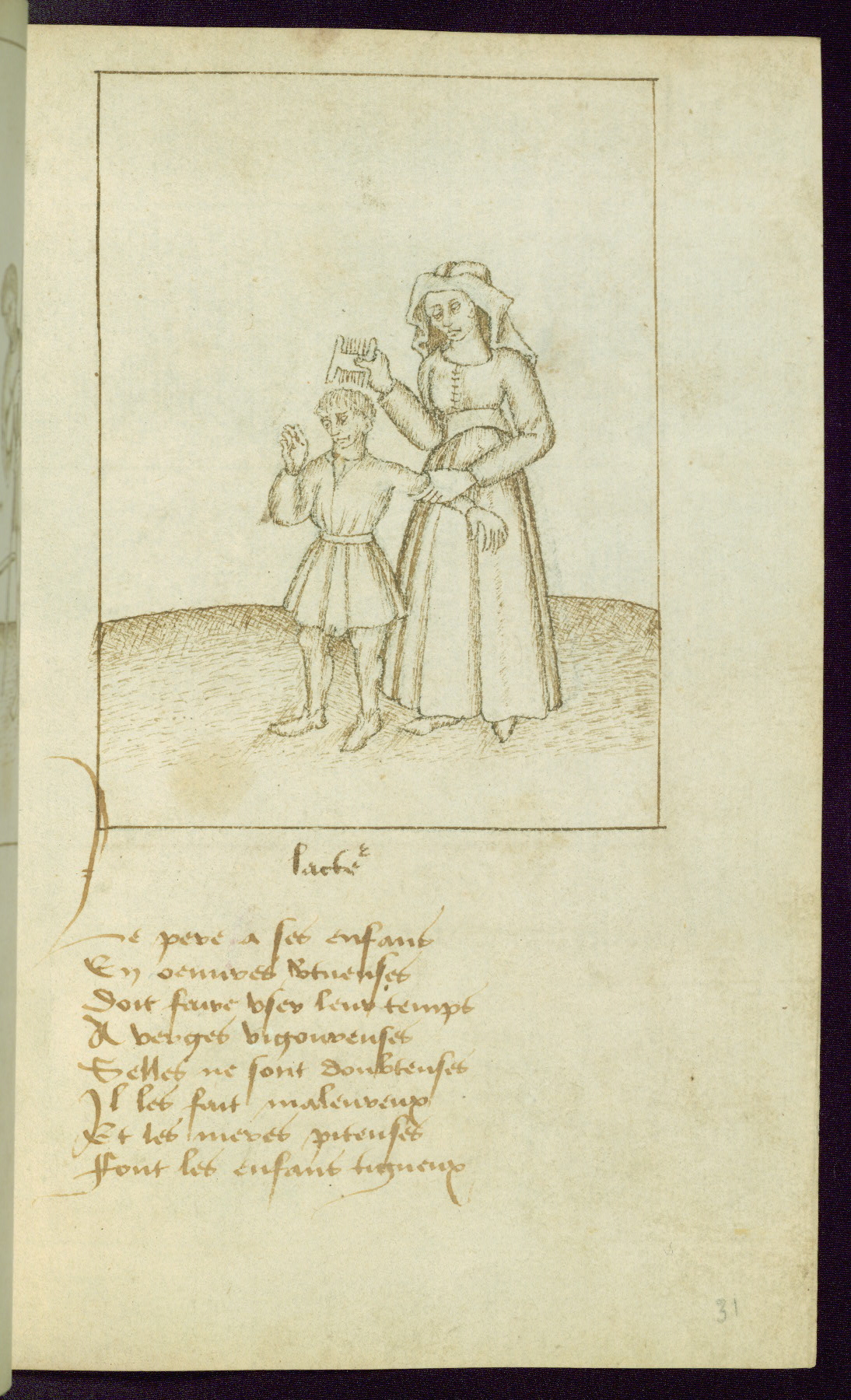 This late fifteenth-century manuscript is one of the earliest surviving examples from a small group of illustrated compilations of proverbs. Each drawing and accompanying verse refer to a commonly known proverb or turn of phrase. The verse does not typically include the phrase, so the combination of image and text is like a riddle that would bring the saying to mind (the proverbs are used in this catalog record as the titles of the images). The proverbs can be both entertaining and moralizing, and they frequently refer to religious life, farming and trades, and acceptable (or unacceptable) behavior. This manuscript originally contained more entries, but several leaves were detached at some point or not included when the book was rebound. Two leaves separated from this manuscript are now in the Wildenstein Collection at the Musée Marmottan in Paris. A third individual leaf (fol.add.1), which has significant damage on one side, was purchased by the Walters Art Museum in the 1990s.