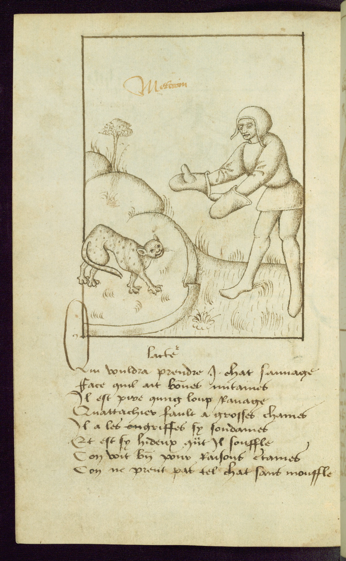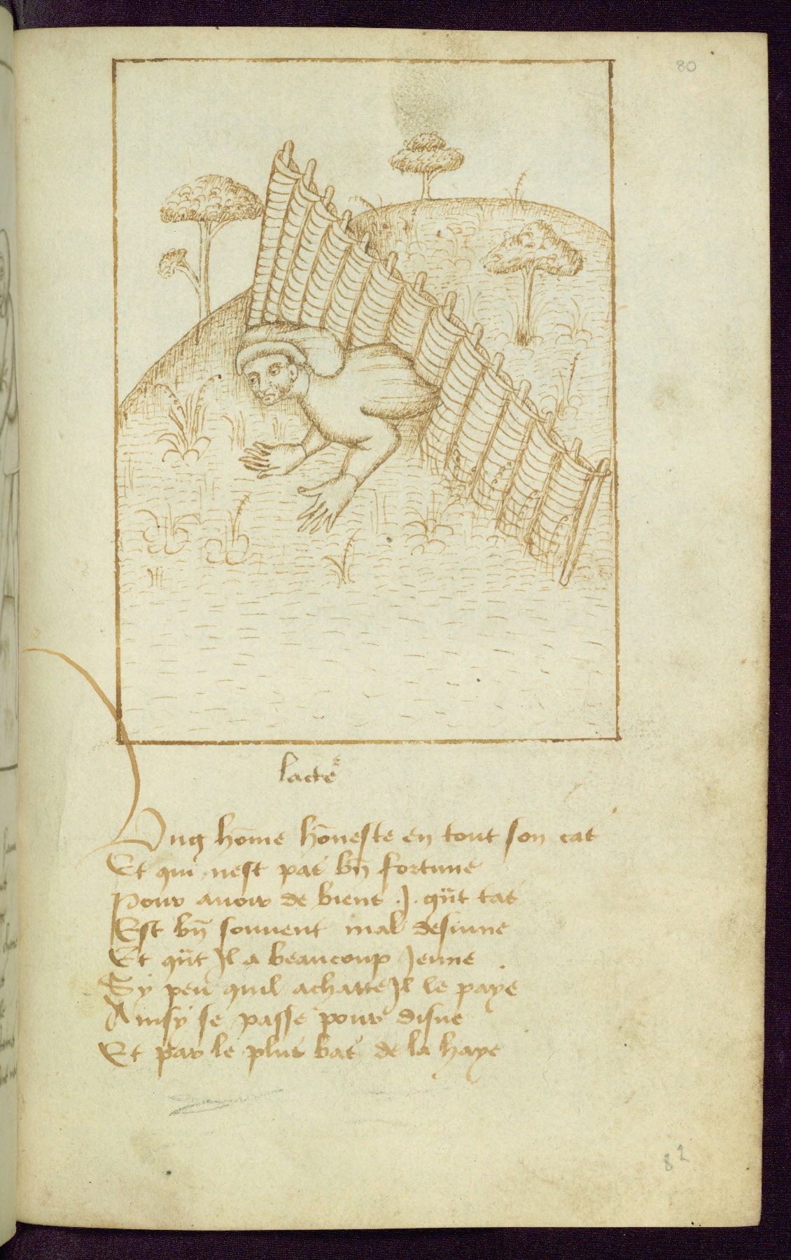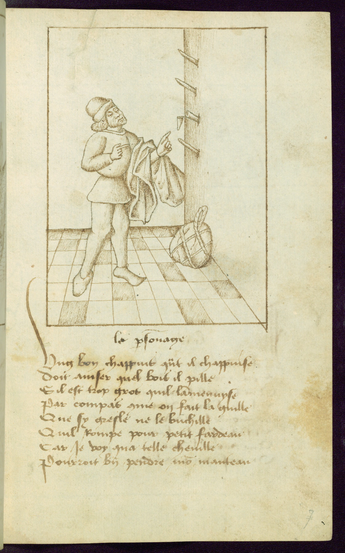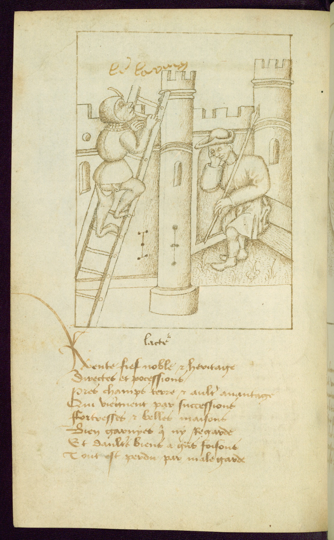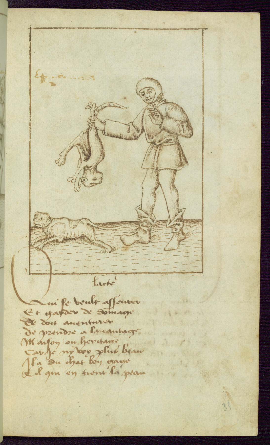 This late fifteenth-century manuscript is one of the earliest surviving examples from a small group of illustrated compilations of proverbs. Each drawing and accompanying verse refer to a commonly known proverb or turn of phrase. The verse does not typically include the phrase, so the combination of image and text is like a riddle that would bring the saying to mind (the proverbs are used in this catalog record as the titles of the images). The proverbs can be both entertaining and moralizing, and they frequently refer to religious life, farming and trades, and acceptable (or unacceptable) behavior. This manuscript originally contained more entries, but several leaves were detached at some point or not included when the book was rebound. Two leaves separated from this manuscript are now in the Wildenstein Collection at the Musée Marmottan in Paris. A third individual leaf (fol.add.1), which has significant damage on one side, was purchased by the Walters Art Museum in the 1990s.