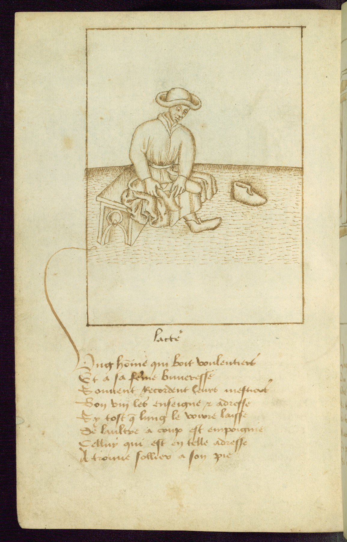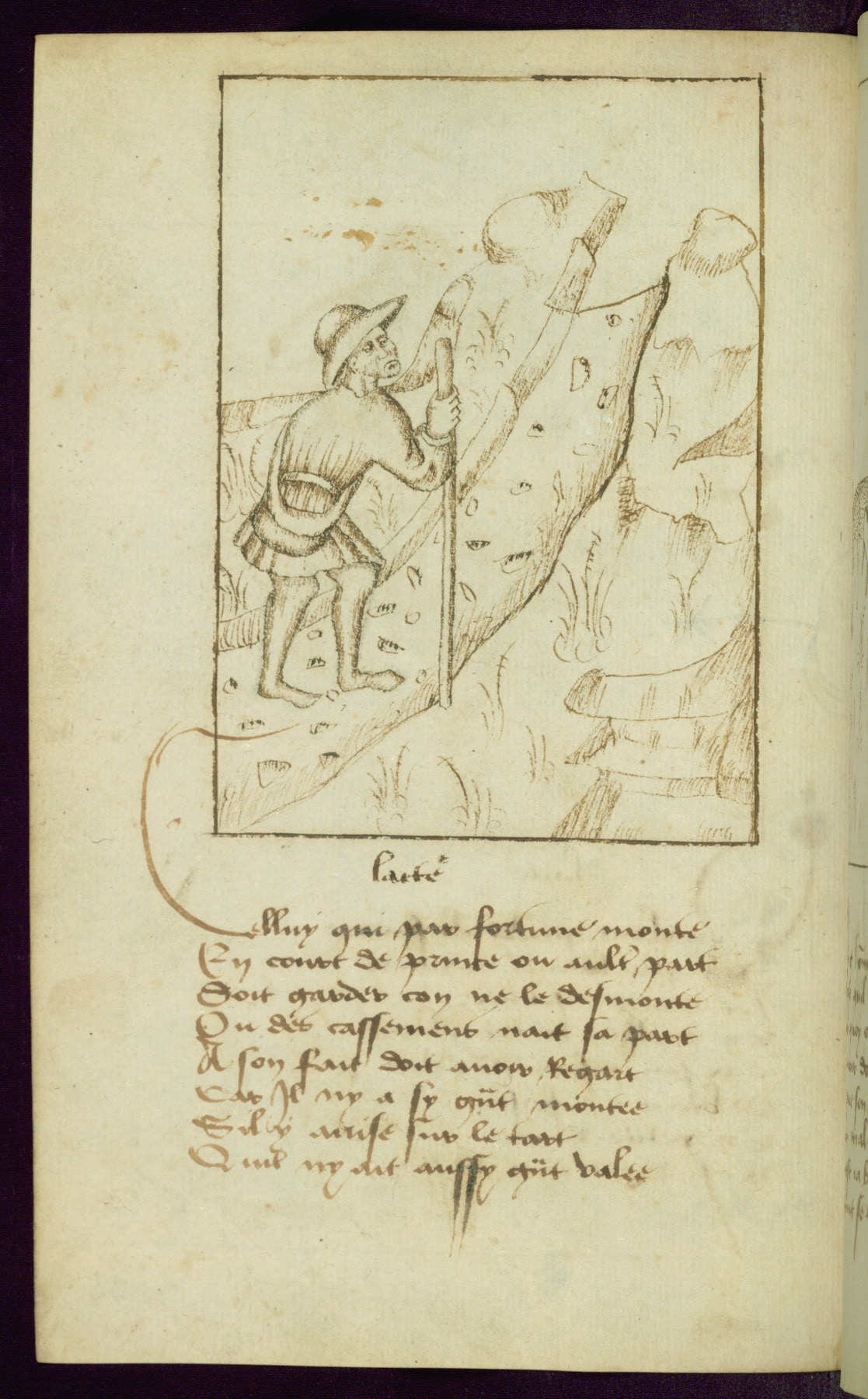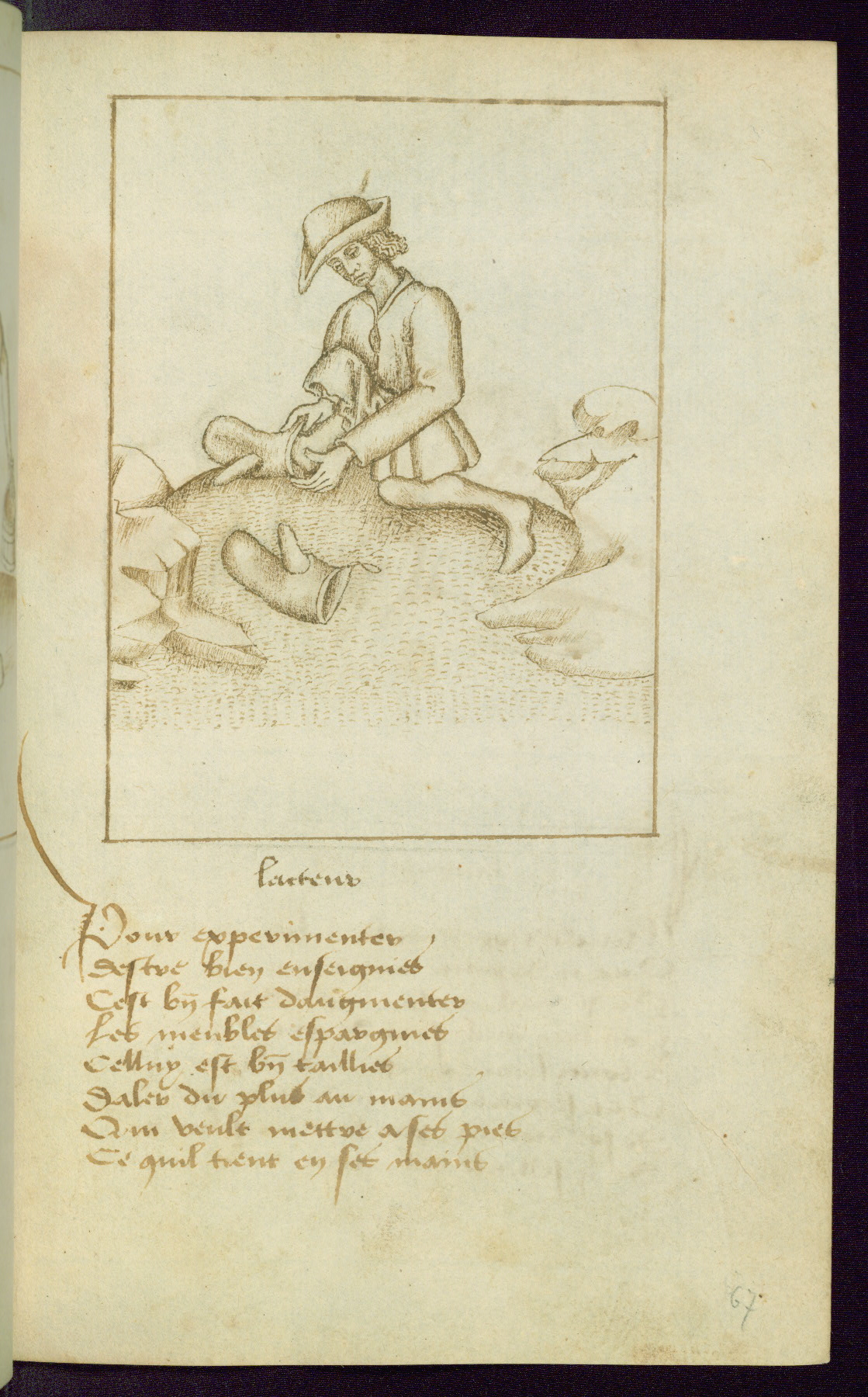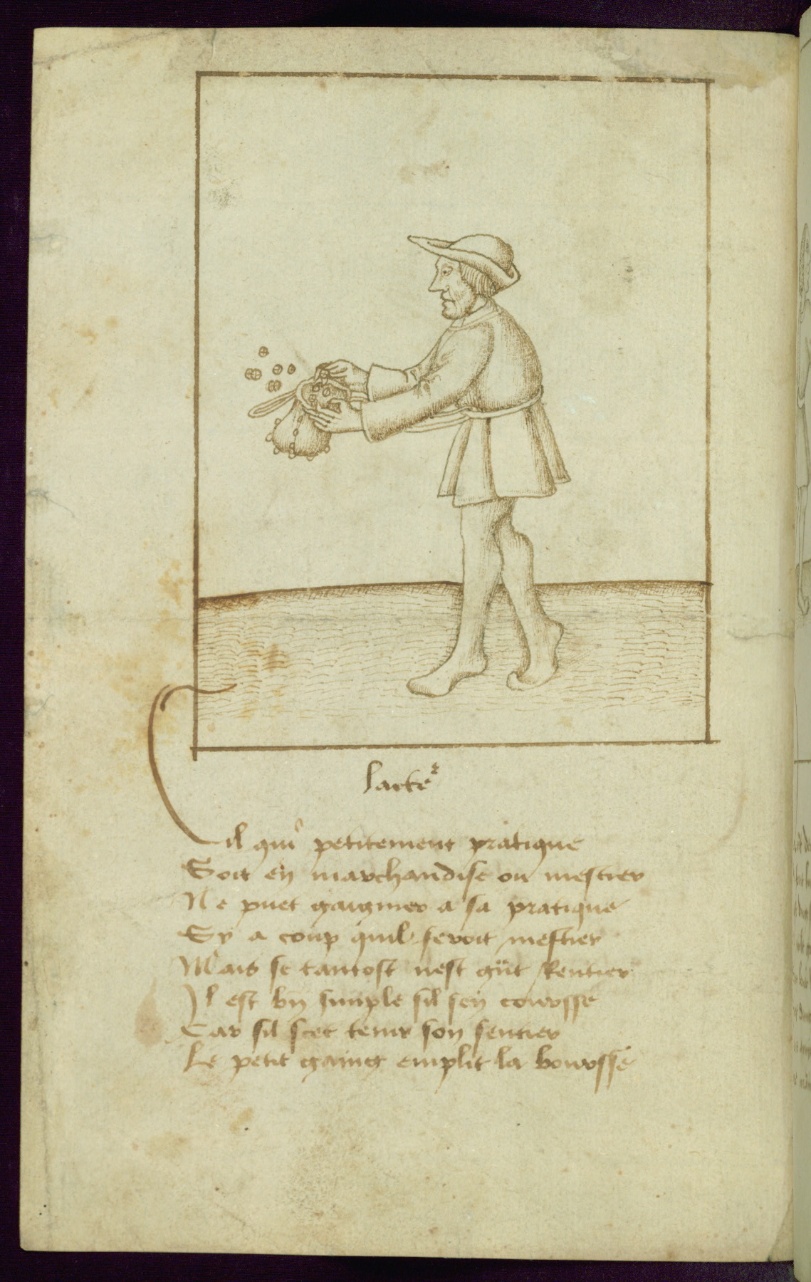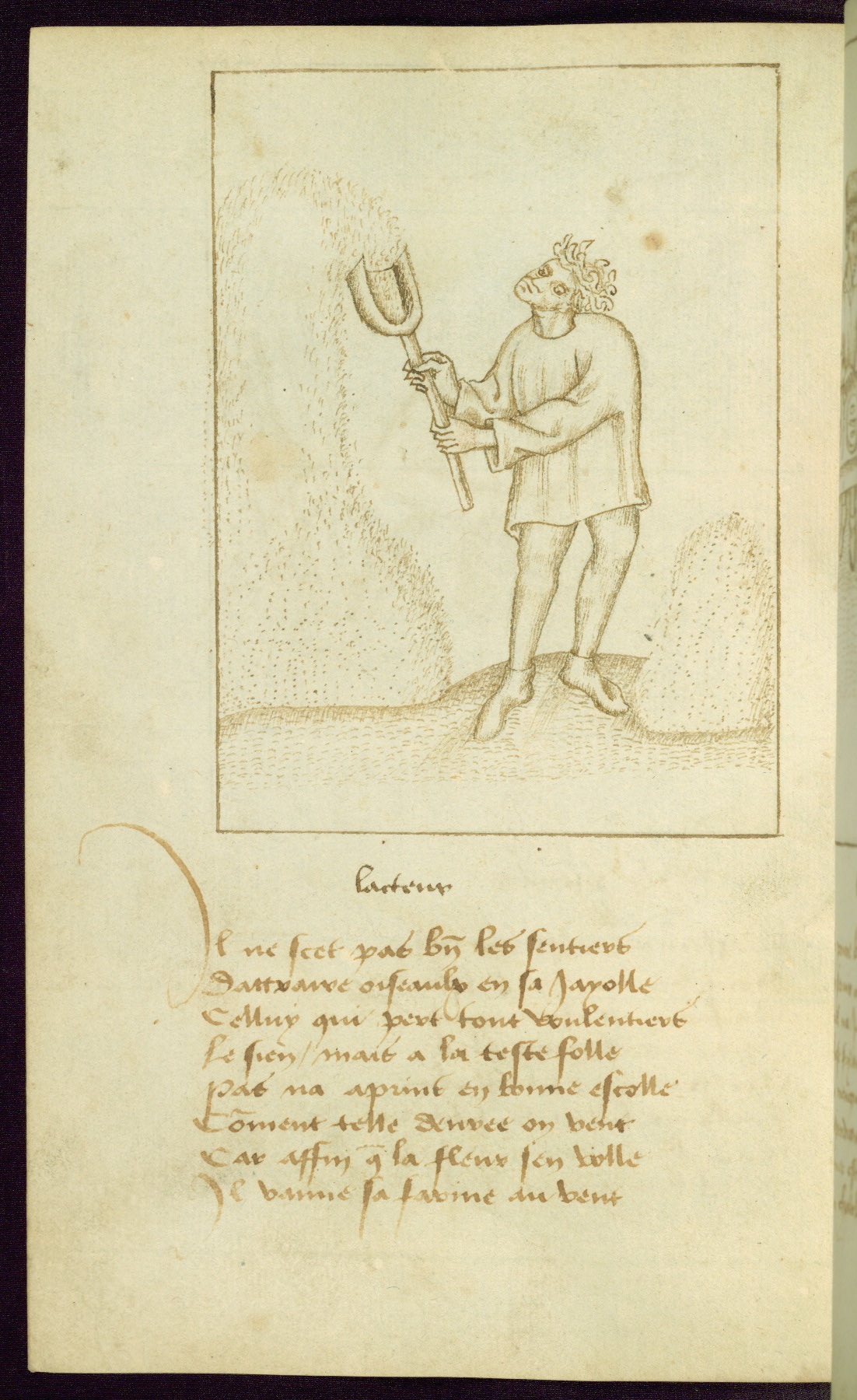This late fifteenth-century manuscript is one of the earliest surviving examples from a small group of illustrated compilations of proverbs. Each drawing and accompanying verse refer to a commonly known proverb or turn of phrase. The verse does not typically include the phrase, so the combination of image and text is like a riddle that would bring the saying to mind (the proverbs are used in this catalog record as the titles of the images). The proverbs can be both entertaining and moralizing, and they frequently refer to religious life, farming and trades, and acceptable (or unacceptable) behavior. This manuscript originally contained more entries, but several leaves were detached at some point or not included when the book was rebound. Two leaves separated from this manuscript are now in the Wildenstein Collection at the Musée Marmottan in Paris. A third individual leaf (fol.add.1), which has significant damage on one side, was purchased by the Walters Art Museum in the 1990s.