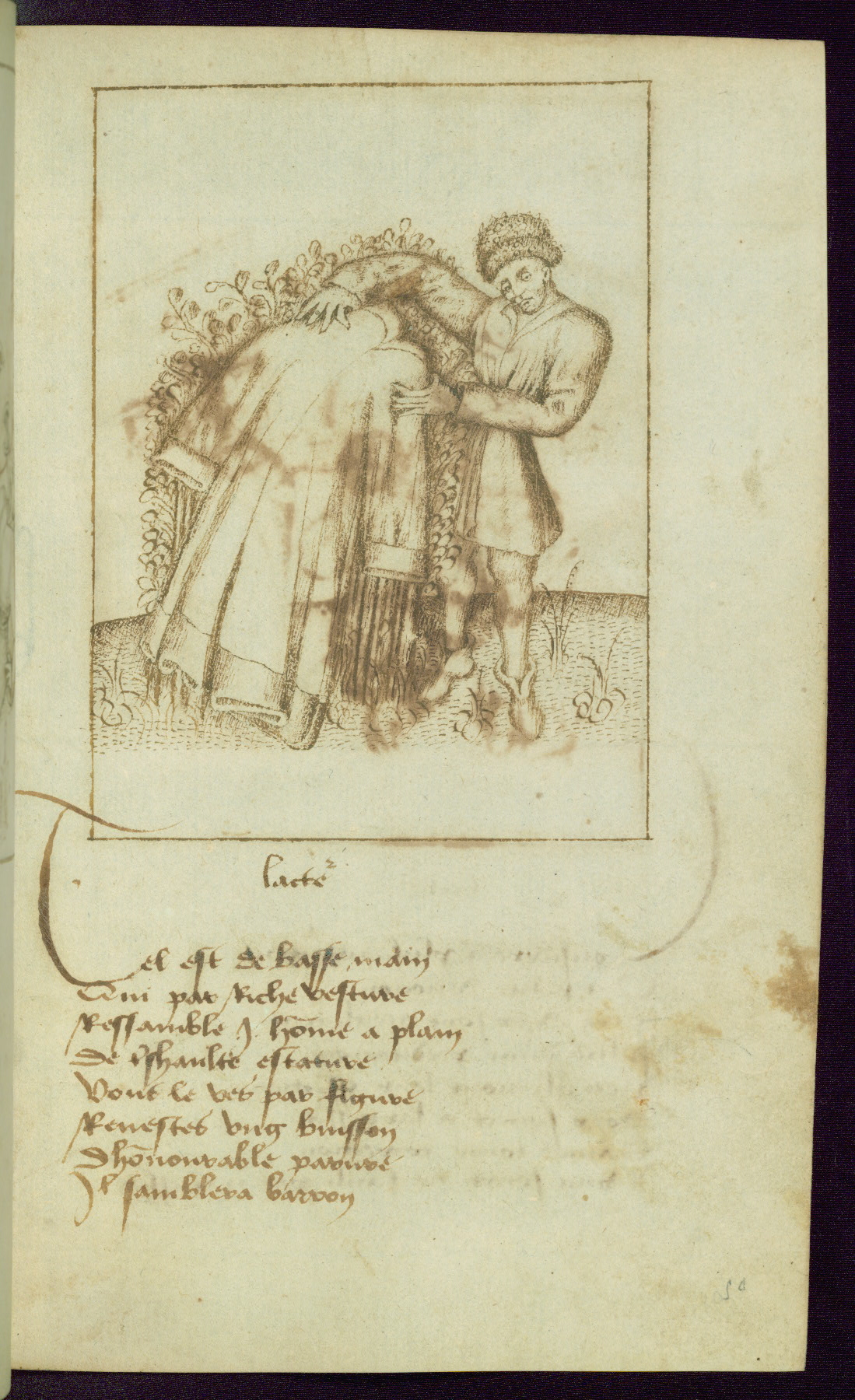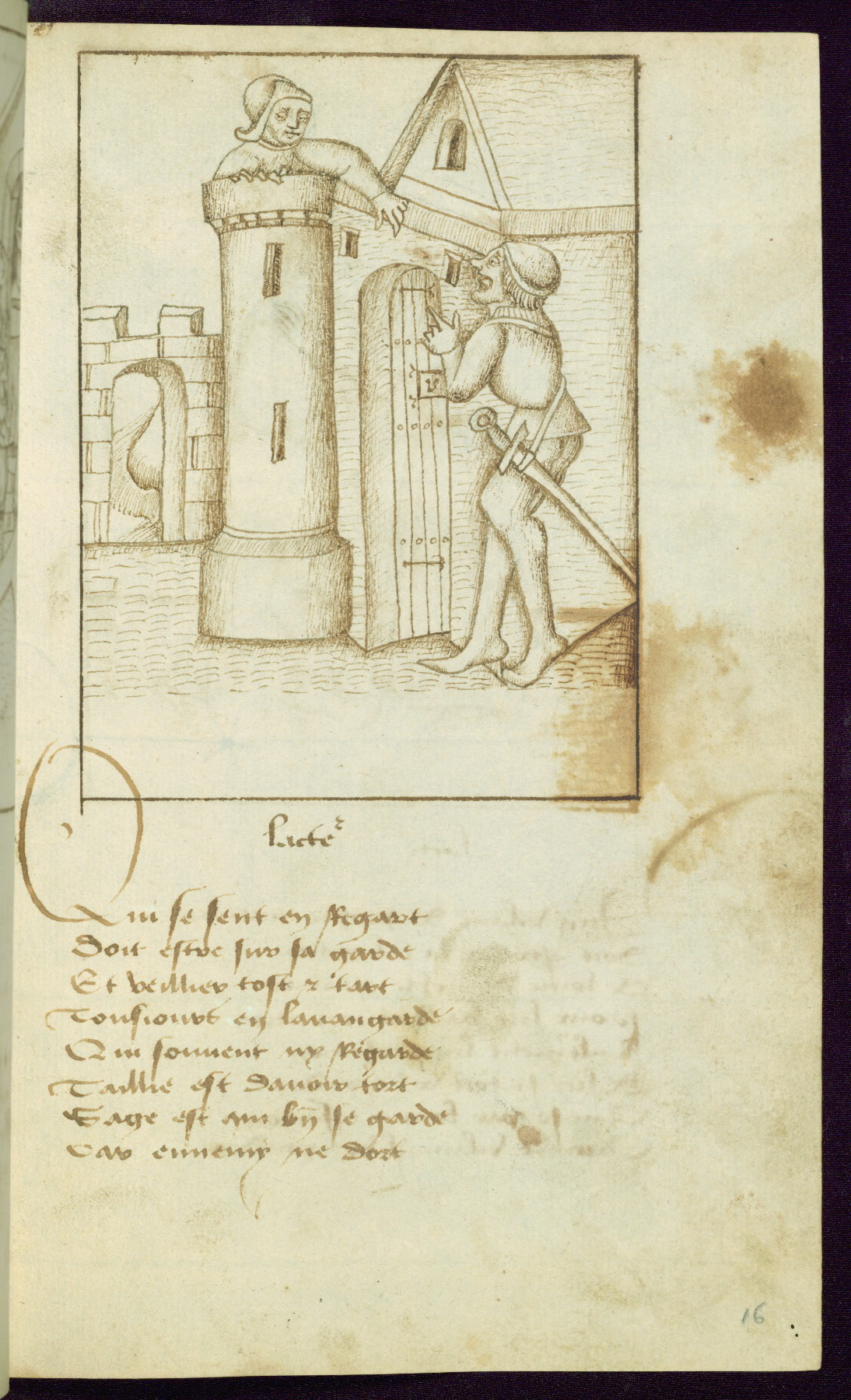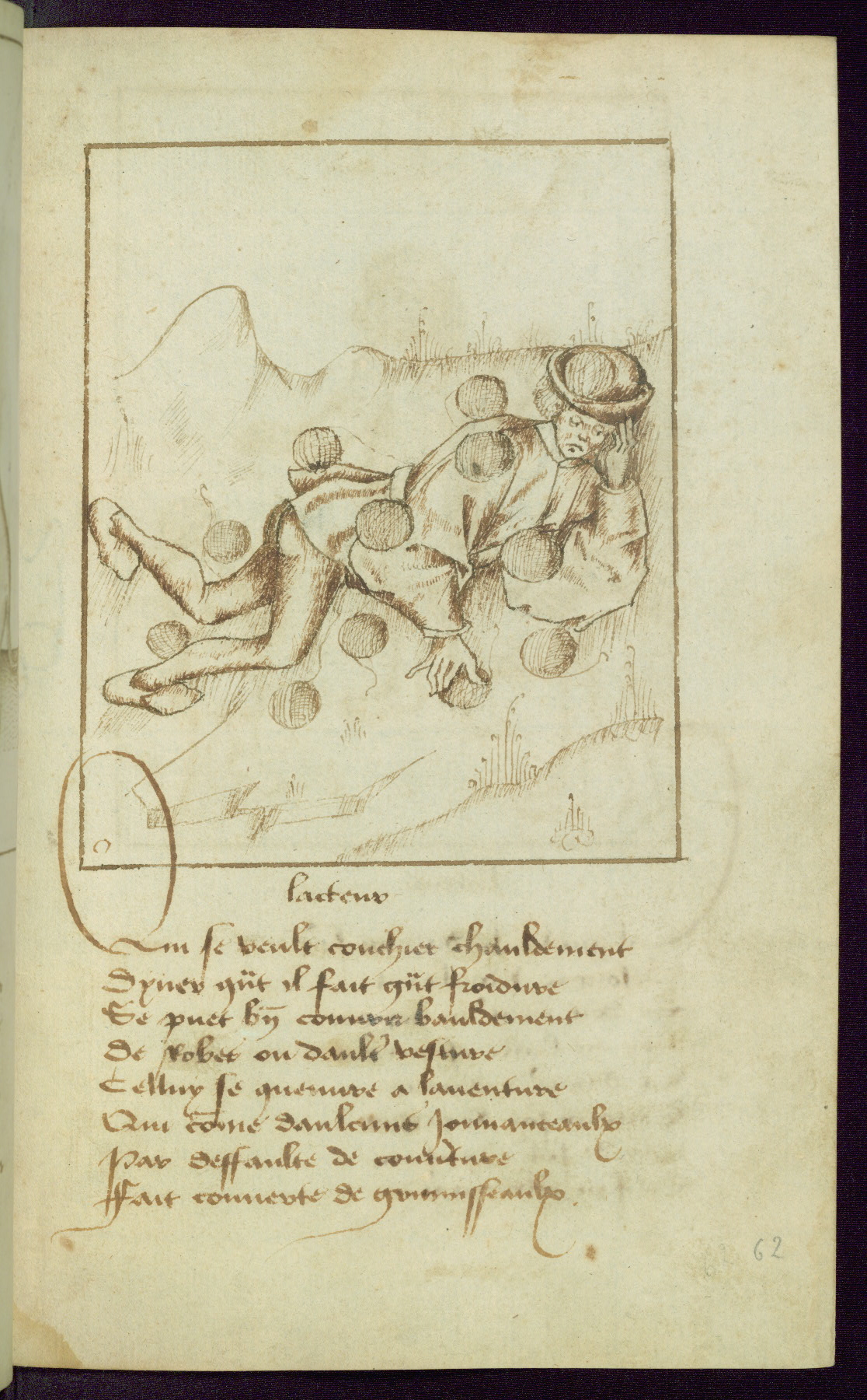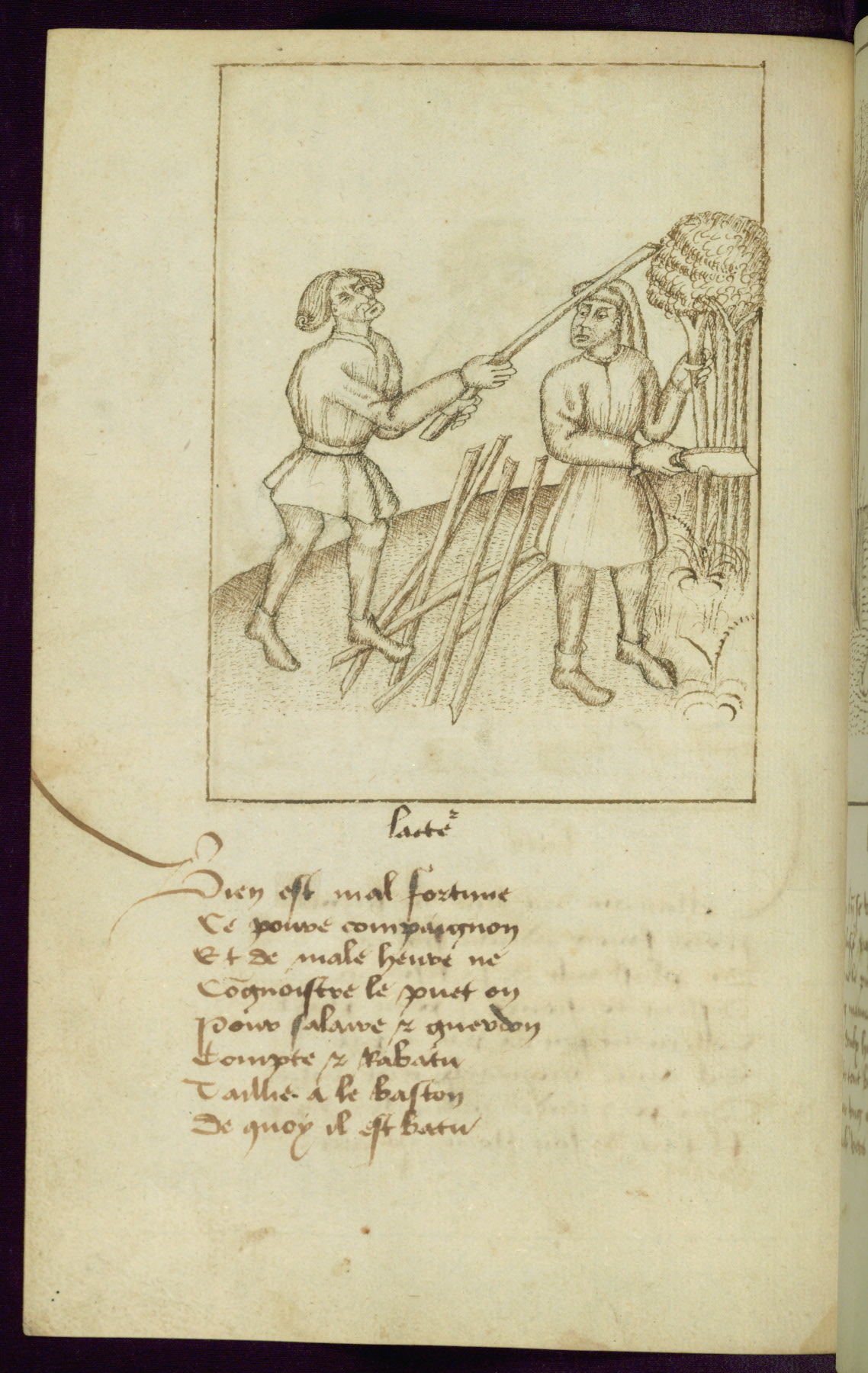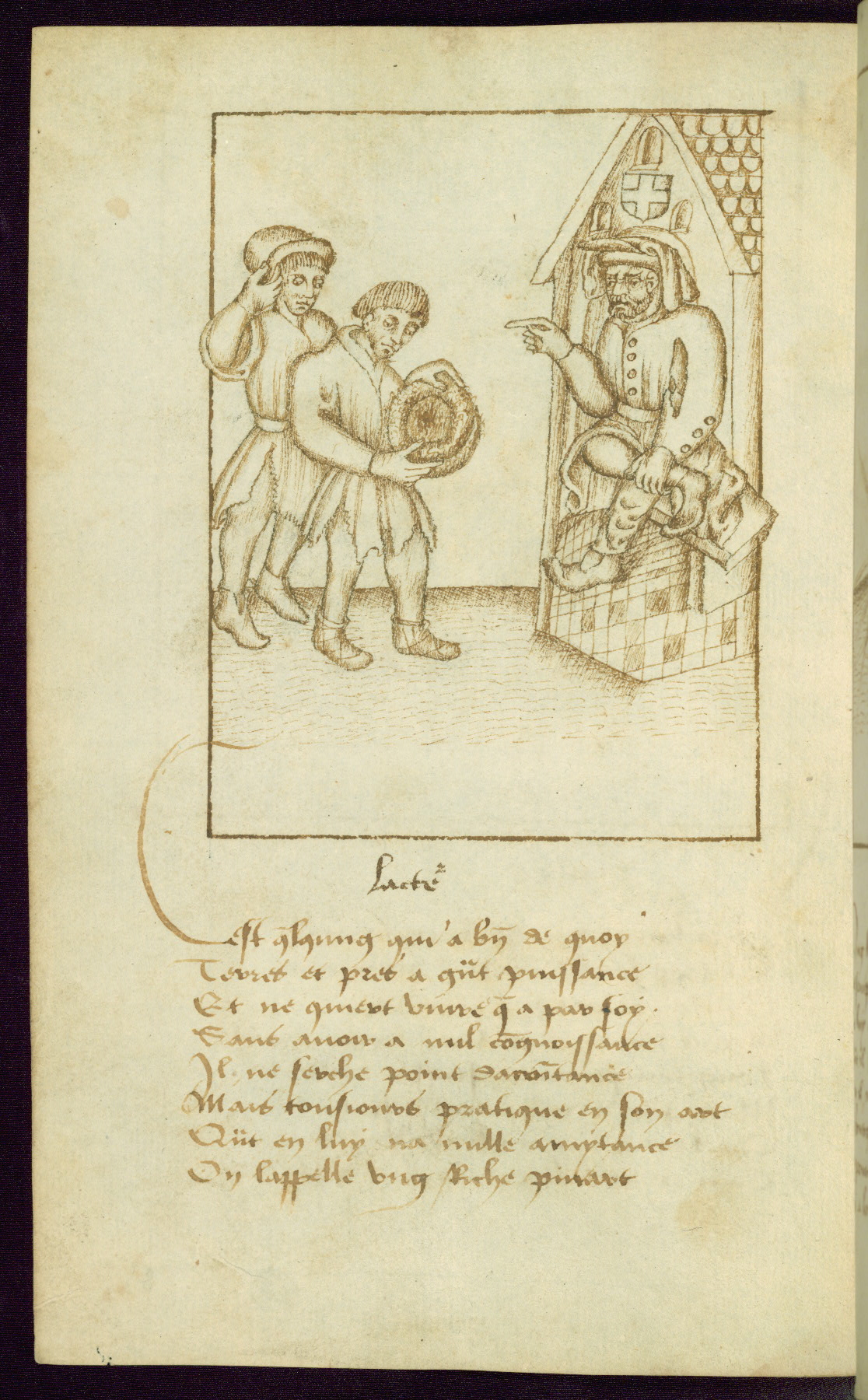 This late fifteenth-century manuscript is one of the earliest surviving examples from a small group of illustrated compilations of proverbs. Each drawing and accompanying verse refer to a commonly known proverb or turn of phrase. The verse does not typically include the phrase, so the combination of image and text is like a riddle that would bring the saying to mind (the proverbs are used in this catalog record as the titles of the images). The proverbs can be both entertaining and moralizing, and they frequently refer to religious life, farming and trades, and acceptable (or unacceptable) behavior. This manuscript originally contained more entries, but several leaves were detached at some point or not included when the book was rebound. Two leaves separated from this manuscript are now in the Wildenstein Collection at the Musée Marmottan in Paris. A third individual leaf (fol.add.1), which has significant damage on one side, was purchased by the Walters Art Museum in the 1990s.