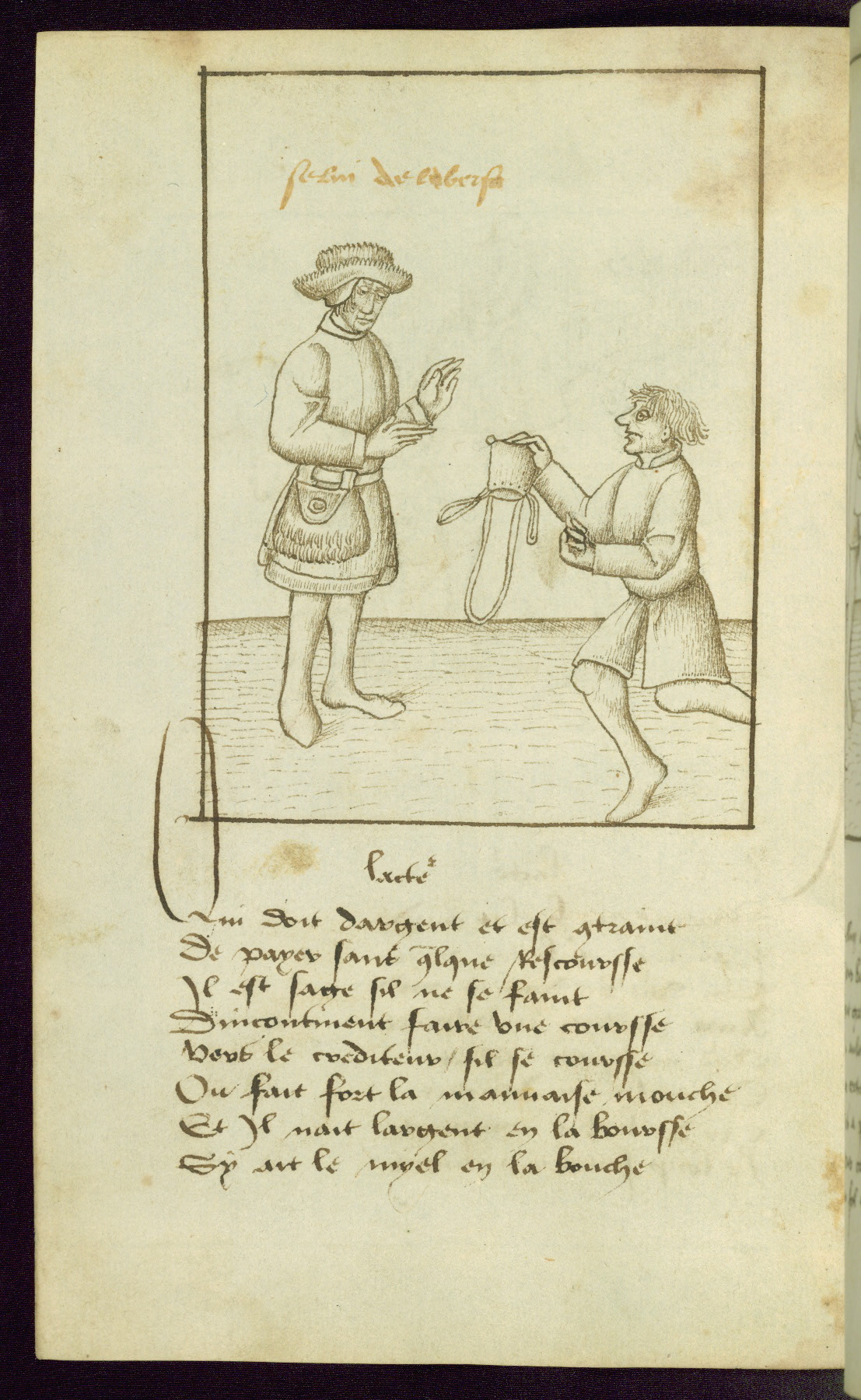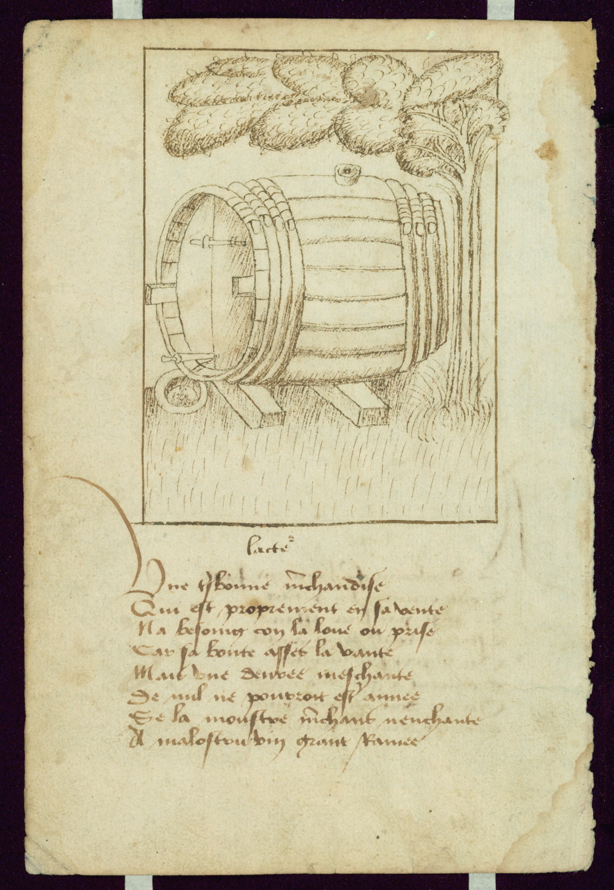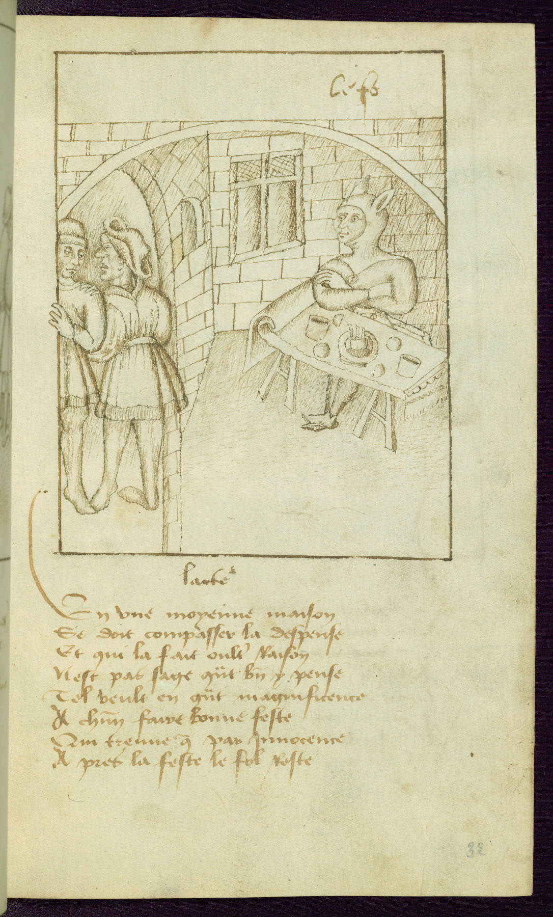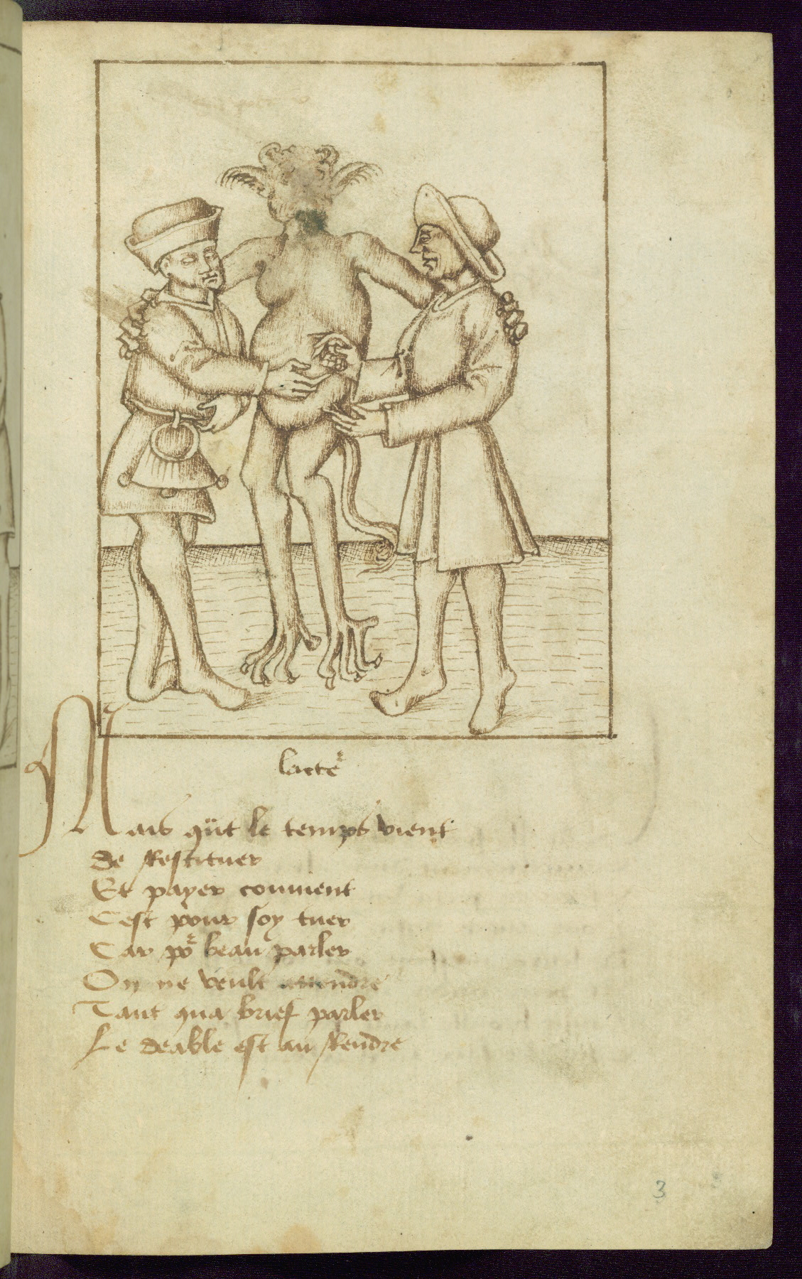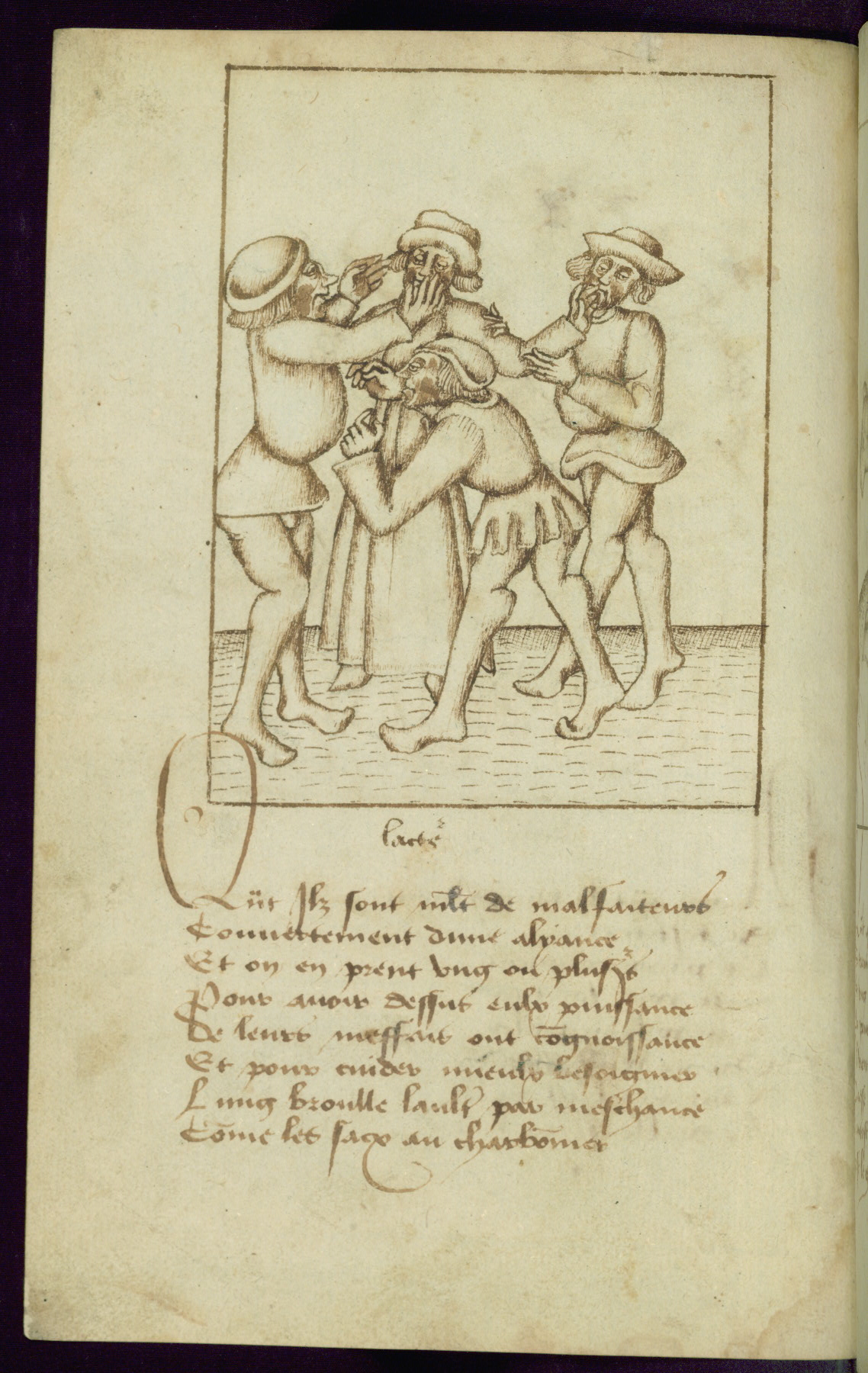 This late fifteenth-century manuscript is one of the earliest surviving examples from a small group of illustrated compilations of proverbs. Each drawing and accompanying verse refer to a commonly known proverb or turn of phrase. The verse does not typically include the phrase, so the combination of image and text is like a riddle that would bring the saying to mind (the proverbs are used in this catalog record as the titles of the images). The proverbs can be both entertaining and moralizing, and they frequently refer to religious life, farming and trades, and acceptable (or unacceptable) behavior. This manuscript originally contained more entries, but several leaves were detached at some point or not included when the book was rebound. Two leaves separated from this manuscript are now in the Wildenstein Collection at the Musée Marmottan in Paris. A third individual leaf (fol.add.1), which has significant damage on one side, was purchased by the Walters Art Museum in the 1990s.