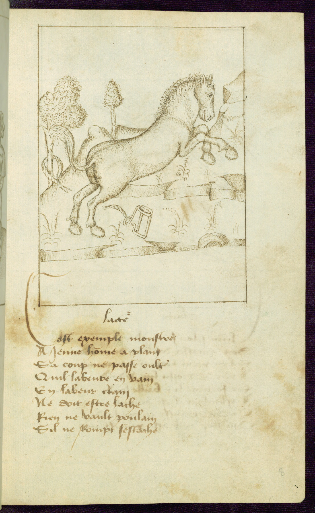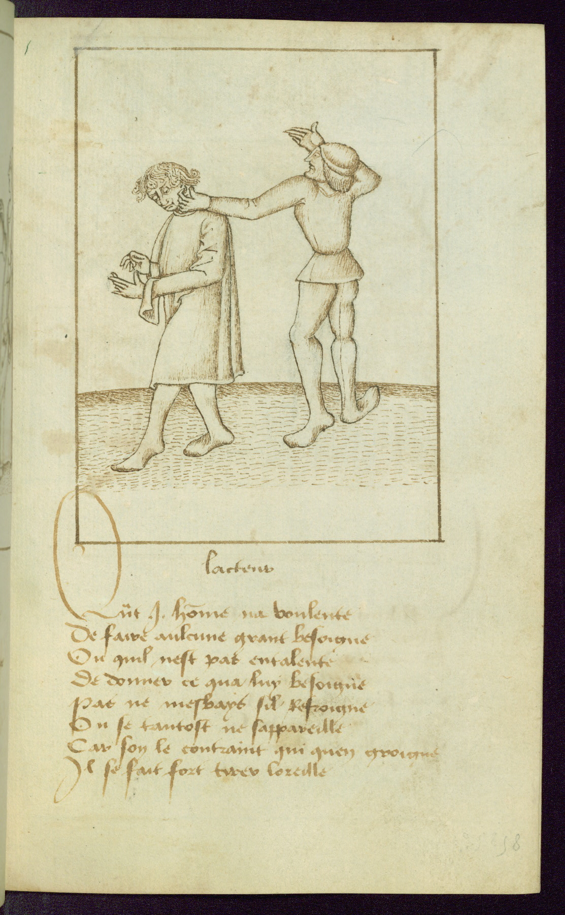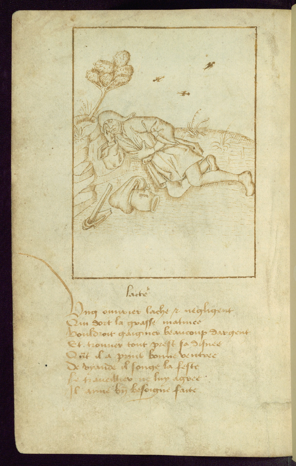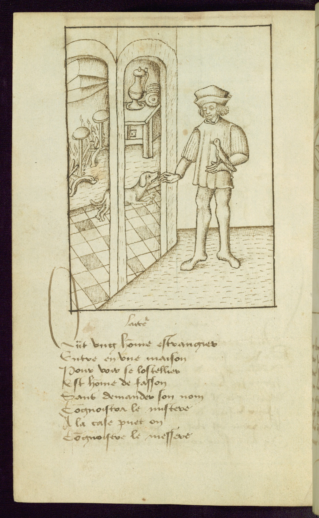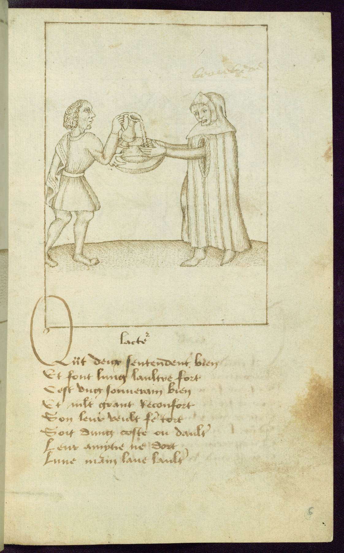 This late fifteenth-century manuscript is one of the earliest surviving examples from a small group of illustrated compilations of proverbs. Each drawing and accompanying verse refer to a commonly known proverb or turn of phrase. The verse does not typically include the phrase, so the combination of image and text is like a riddle that would bring the saying to mind (the proverbs are used in this catalog record as the titles of the images). The proverbs can be both entertaining and moralizing, and they frequently refer to religious life, farming and trades, and acceptable (or unacceptable) behavior. This manuscript originally contained more entries, but several leaves were detached at some point or not included when the book was rebound. Two leaves separated from this manuscript are now in the Wildenstein Collection at the Musée Marmottan in Paris. A third individual leaf (fol.add.1), which has significant damage on one side, was purchased by the Walters Art Museum in the 1990s.