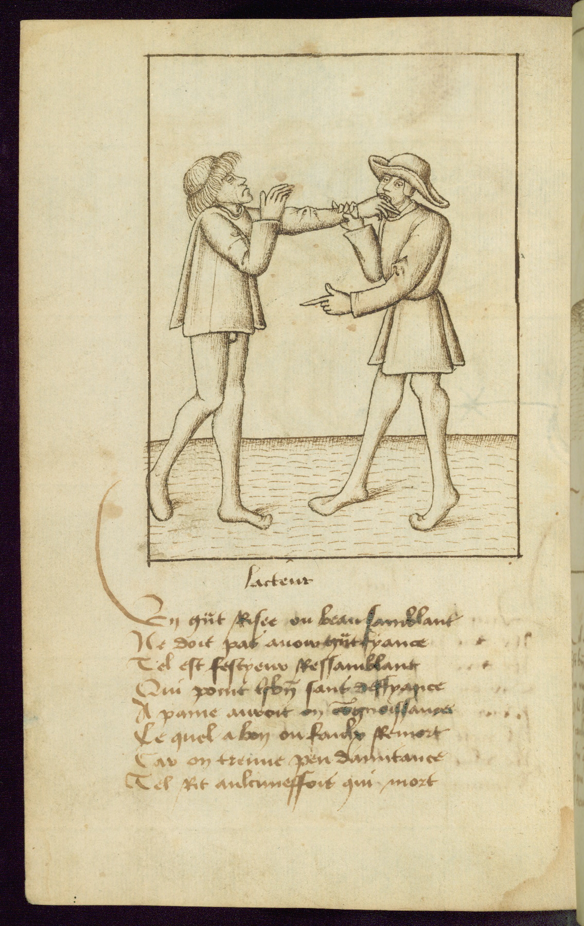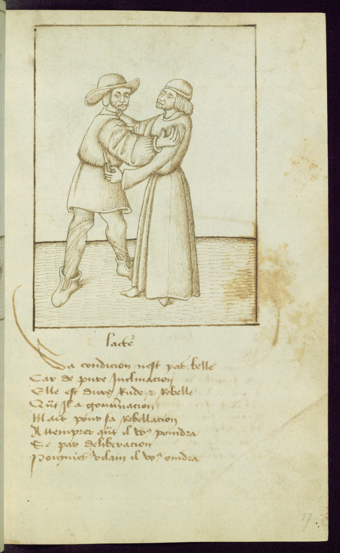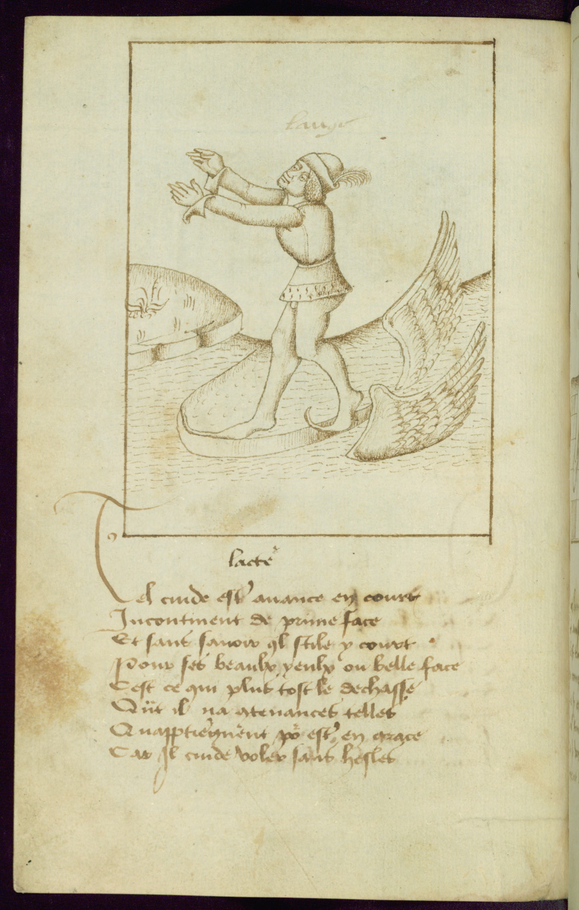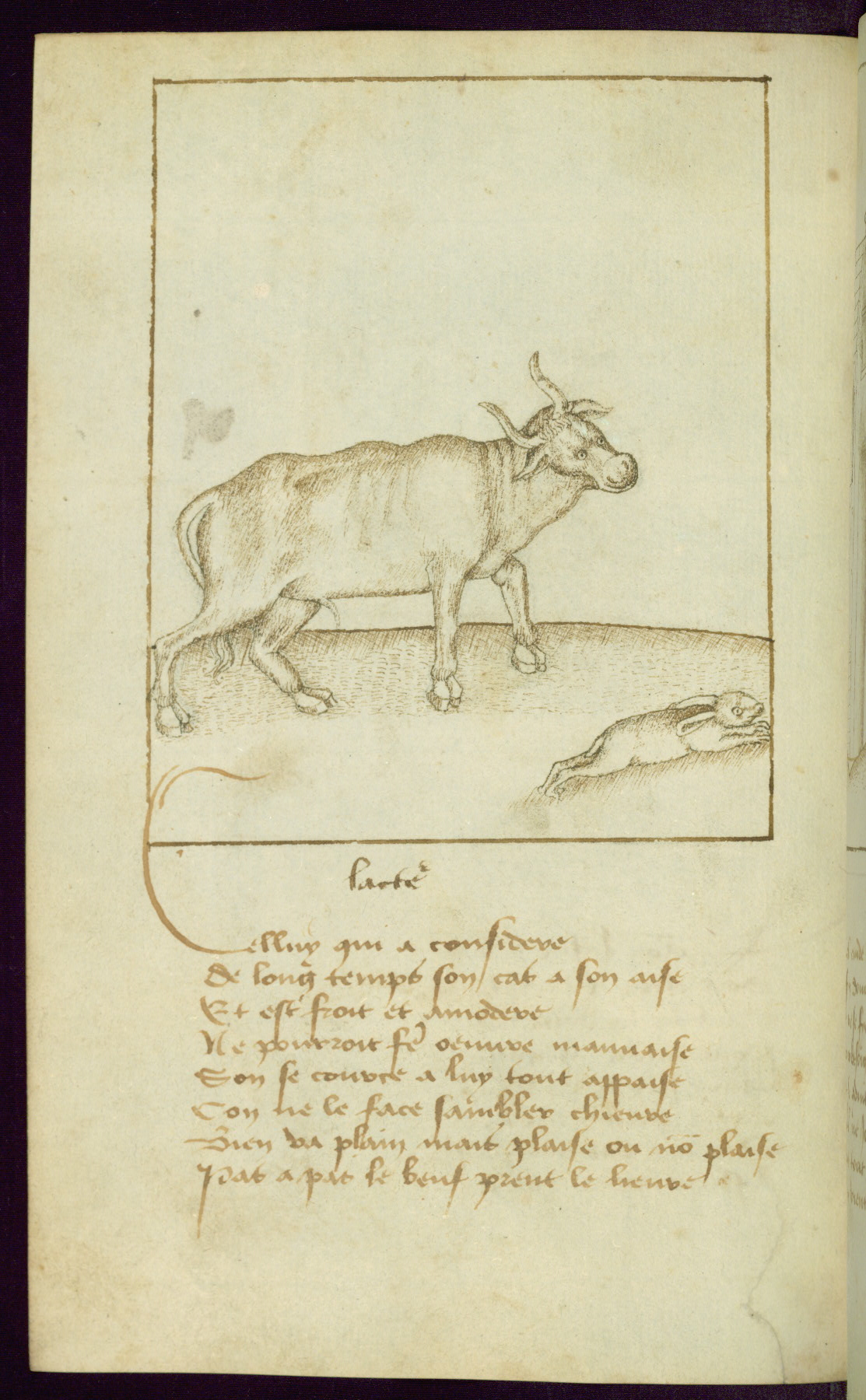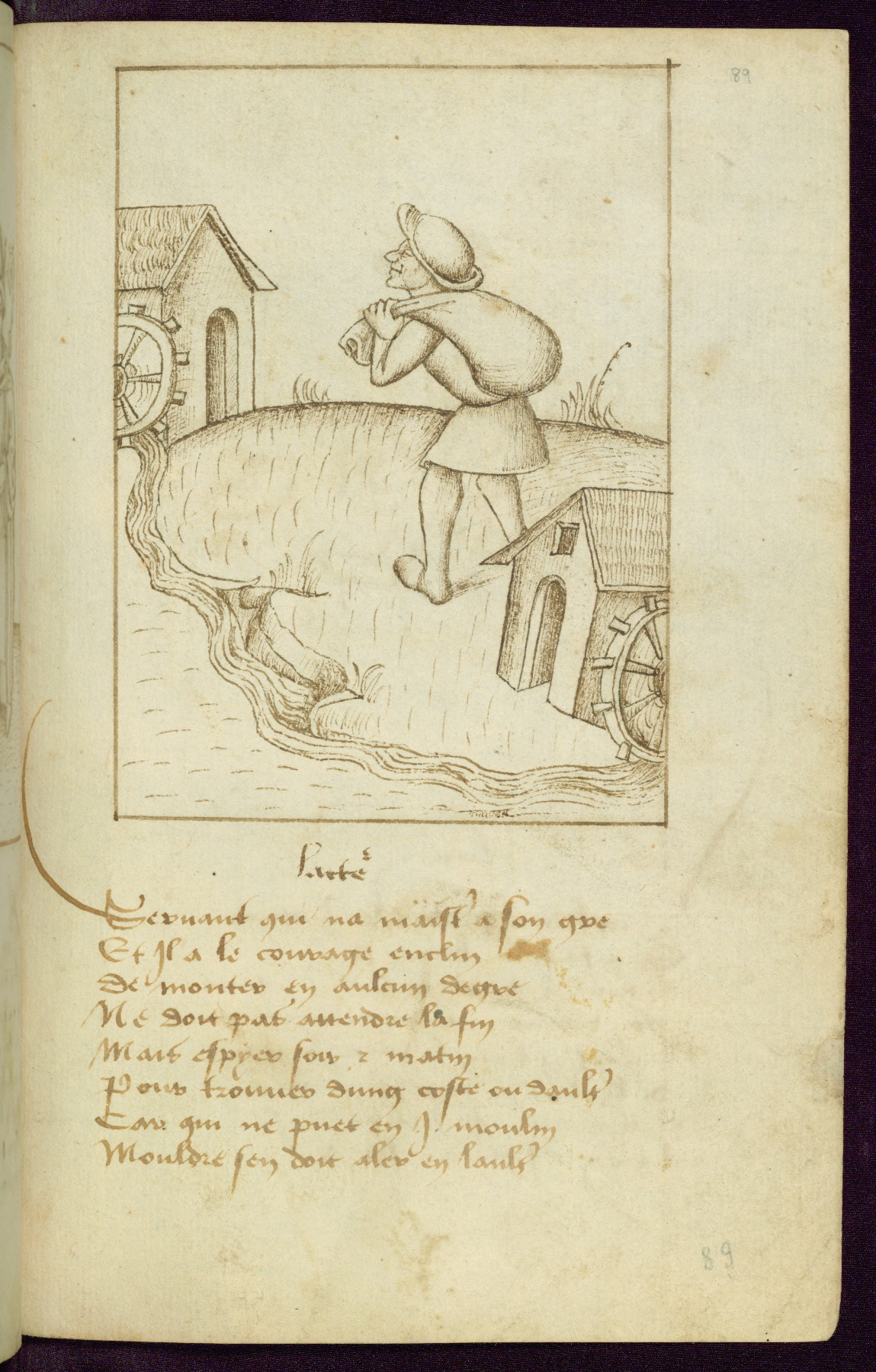 This late fifteenth-century manuscript is one of the earliest surviving examples from a small group of illustrated compilations of proverbs. Each drawing and accompanying verse refer to a commonly known proverb or turn of phrase. The verse does not typically include the phrase, so the combination of image and text is like a riddle that would bring the saying to mind (the proverbs are used in this catalog record as the titles of the images). The proverbs can be both entertaining and moralizing, and they frequently refer to religious life, farming and trades, and acceptable (or unacceptable) behavior. This manuscript originally contained more entries, but several leaves were detached at some point or not included when the book was rebound. Two leaves separated from this manuscript are now in the Wildenstein Collection at the Musée Marmottan in Paris. A third individual leaf (fol.add.1), which has significant damage on one side, was purchased by the Walters Art Museum in the 1990s.