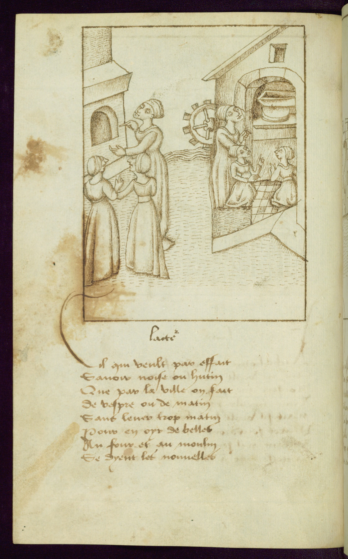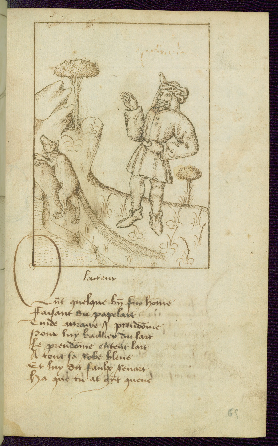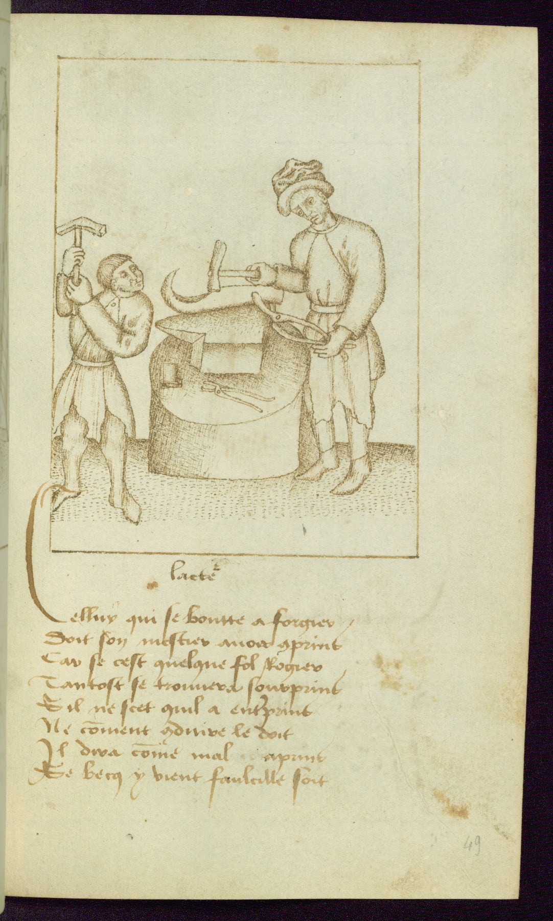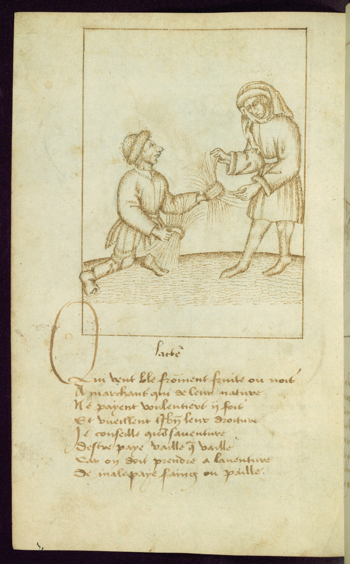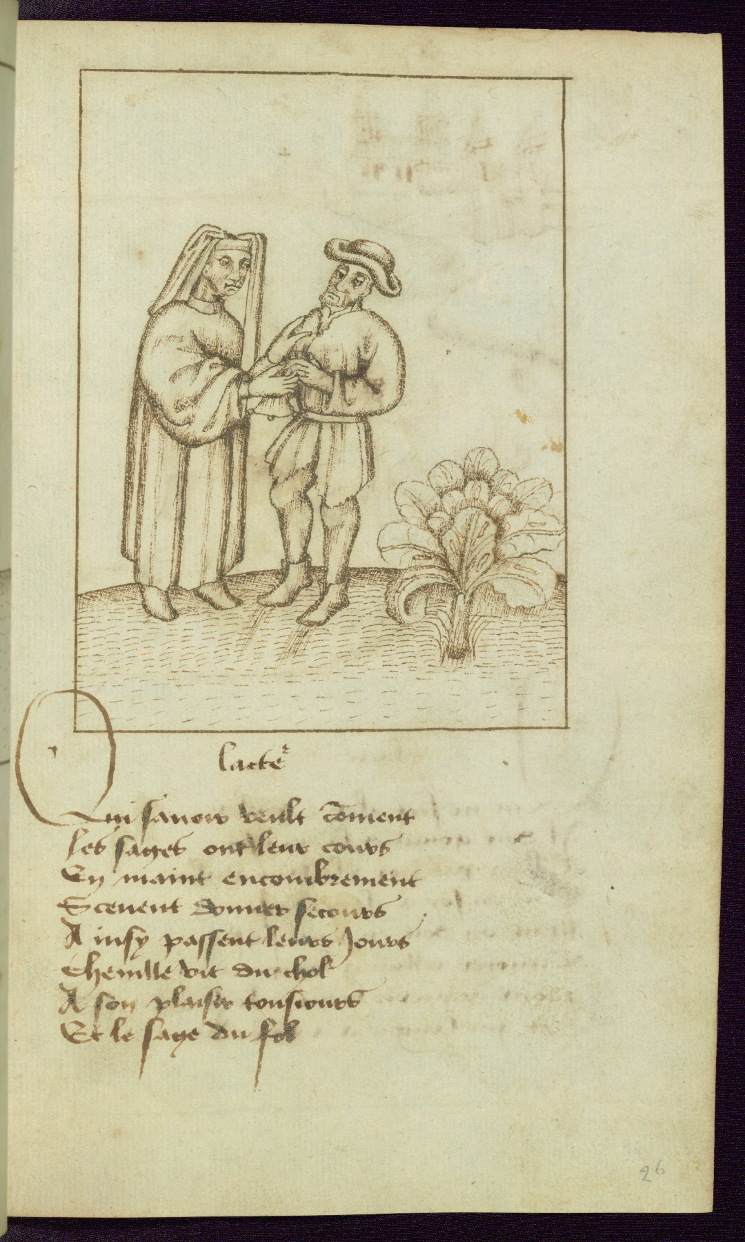 This late fifteenth-century manuscript is one of the earliest surviving examples from a small group of illustrated compilations of proverbs. Each drawing and accompanying verse refer to a commonly known proverb or turn of phrase. The verse does not typically include the phrase, so the combination of image and text is like a riddle that would bring the saying to mind (the proverbs are used in this catalog record as the titles of the images). The proverbs can be both entertaining and moralizing, and they frequently refer to religious life, farming and trades, and acceptable (or unacceptable) behavior. This manuscript originally contained more entries, but several leaves were detached at some point or not included when the book was rebound. Two leaves separated from this manuscript are now in the Wildenstein Collection at the Musée Marmottan in Paris. A third individual leaf (fol.add.1), which has significant damage on one side, was purchased by the Walters Art Museum in the 1990s.