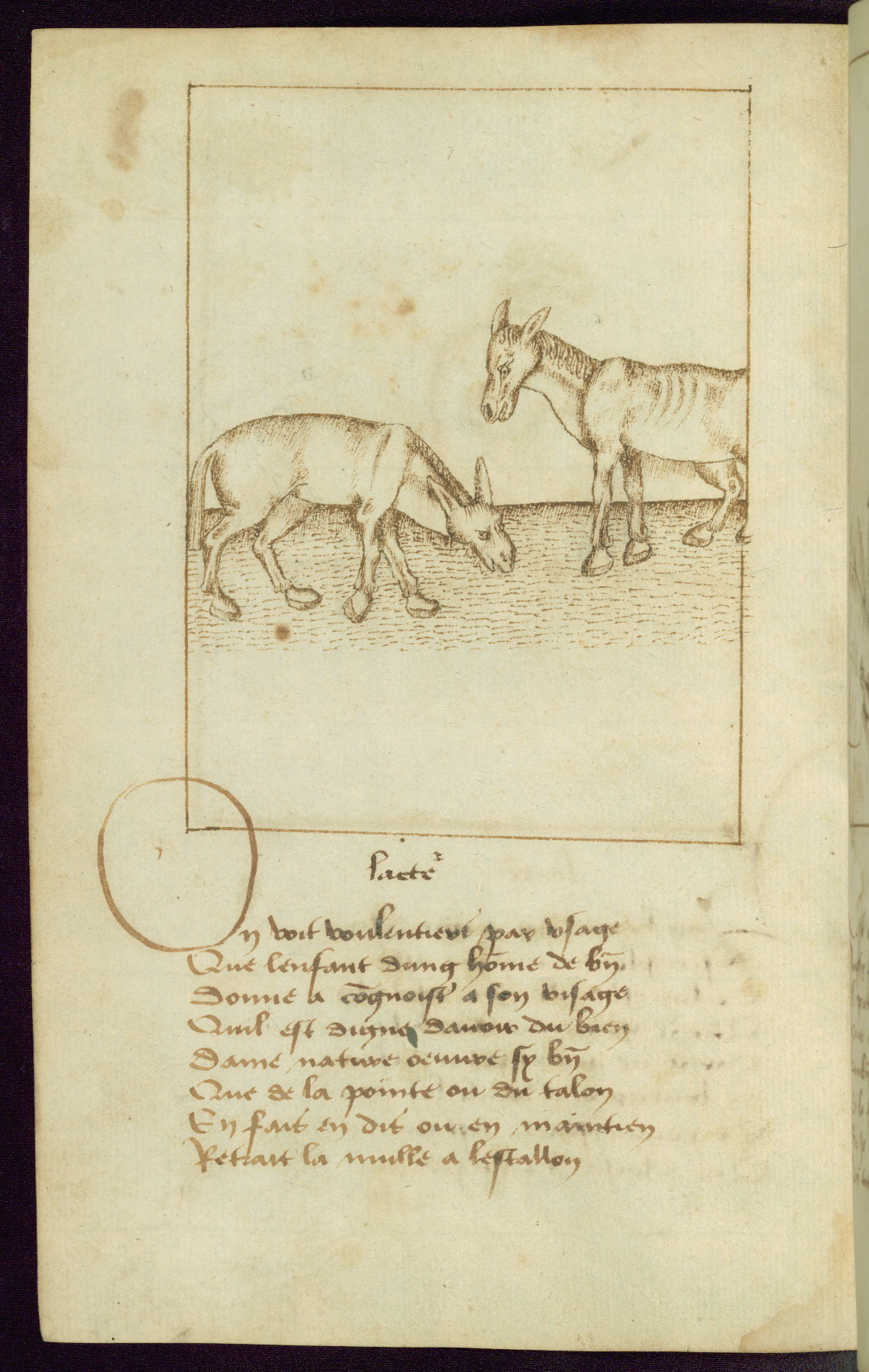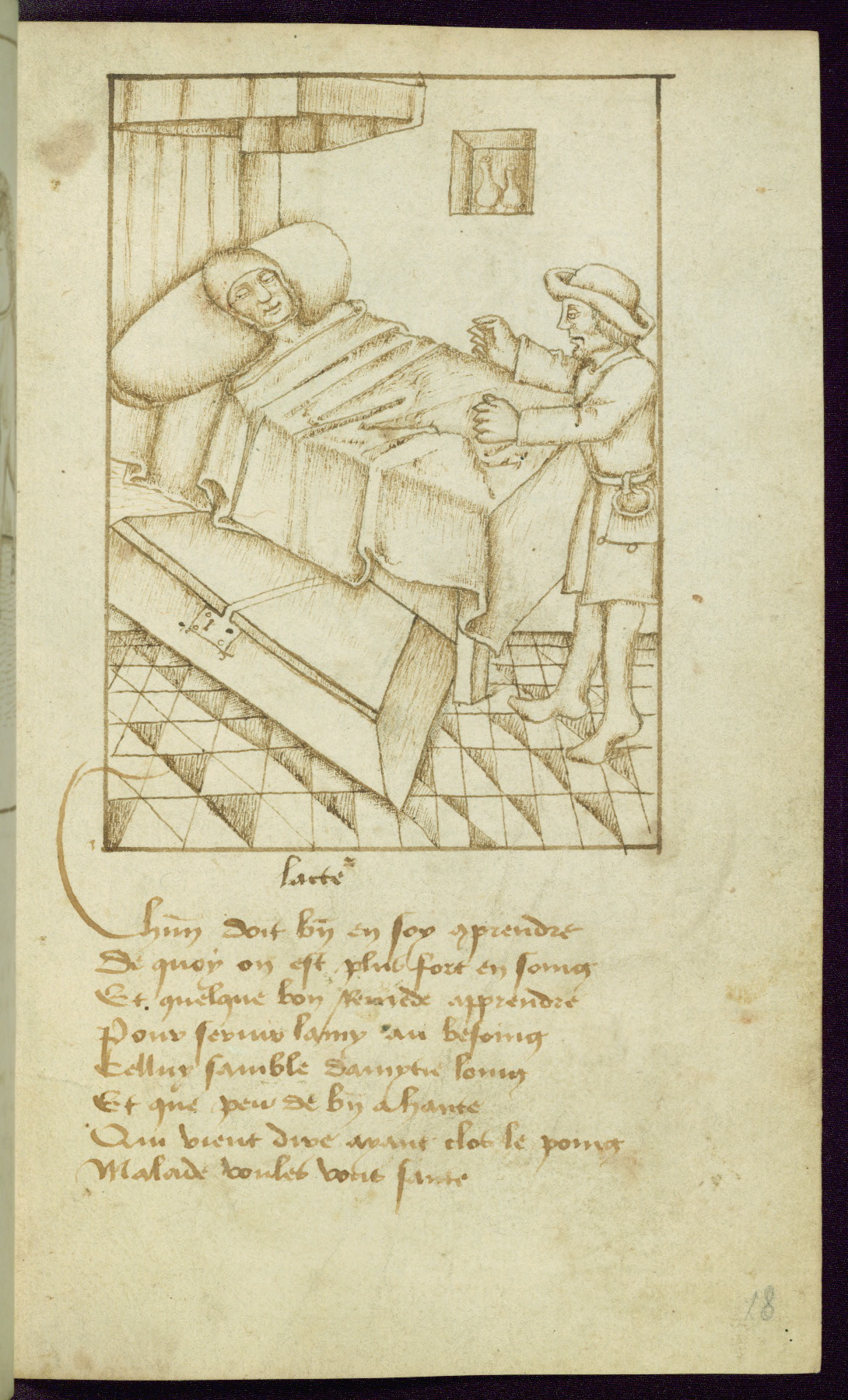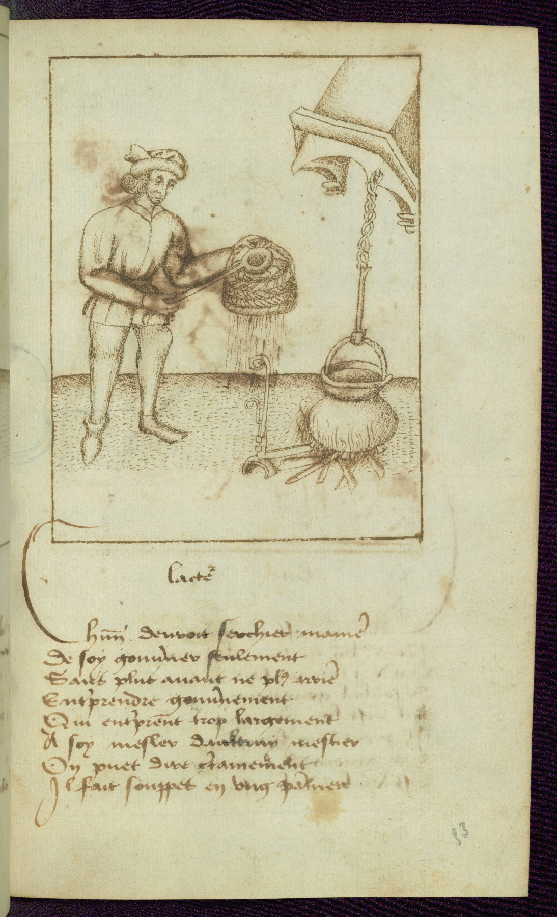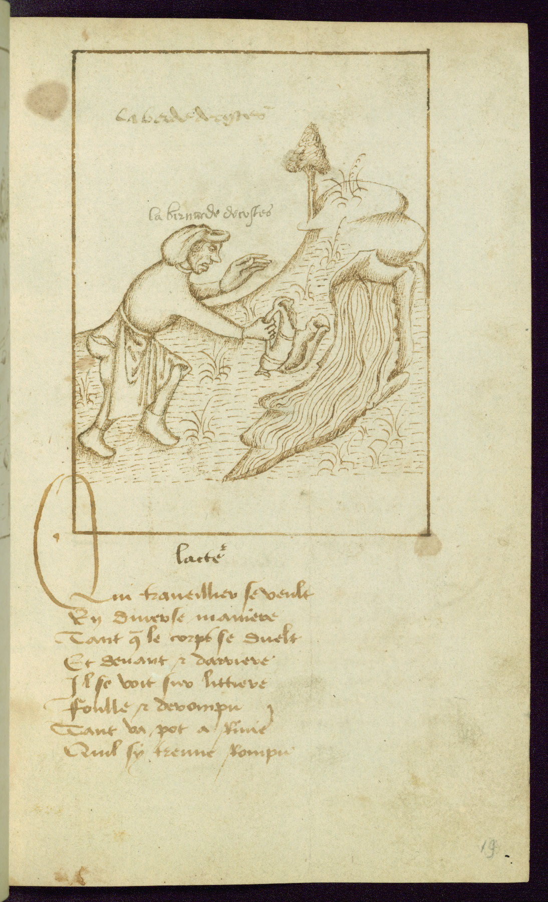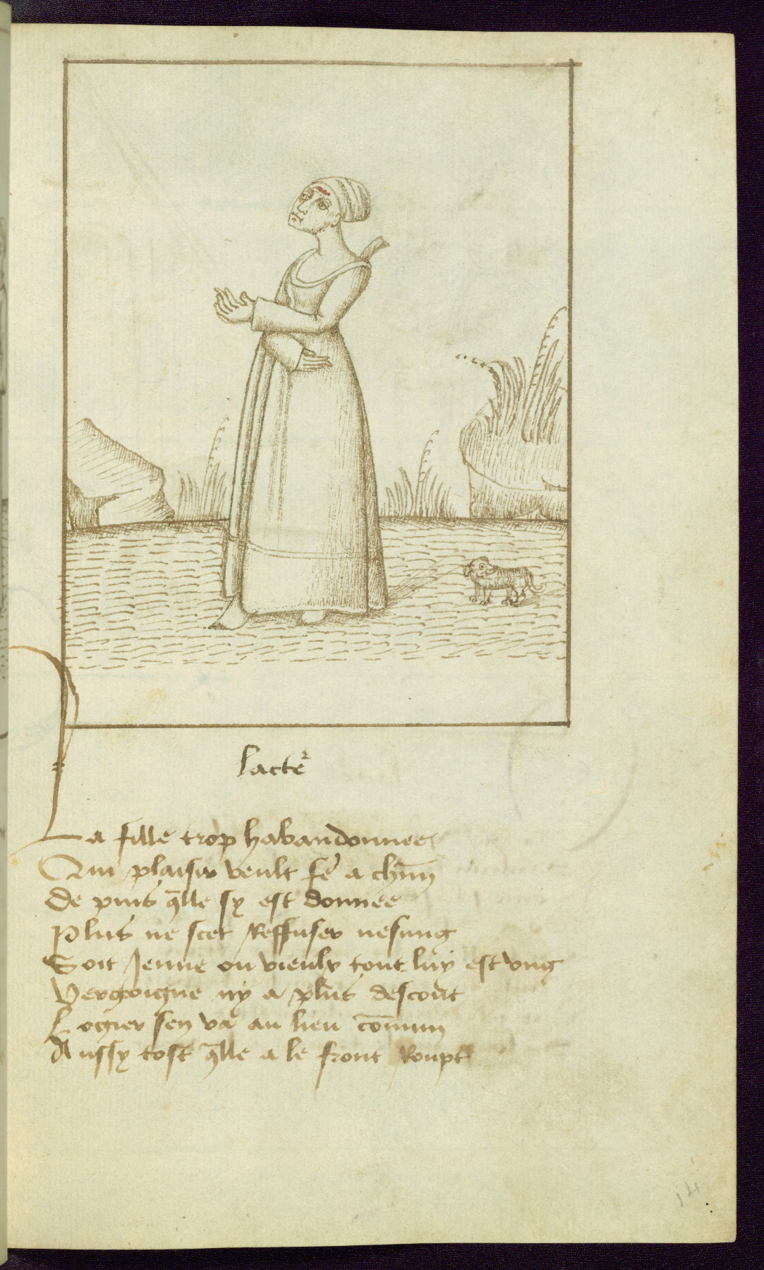 This late fifteenth-century manuscript is one of the earliest surviving examples from a small group of illustrated compilations of proverbs. Each drawing and accompanying verse refer to a commonly known proverb or turn of phrase. The verse does not typically include the phrase, so the combination of image and text is like a riddle that would bring the saying to mind (the proverbs are used in this catalog record as the titles of the images). The proverbs can be both entertaining and moralizing, and they frequently refer to religious life, farming and trades, and acceptable (or unacceptable) behavior. This manuscript originally contained more entries, but several leaves were detached at some point or not included when the book was rebound. Two leaves separated from this manuscript are now in the Wildenstein Collection at the Musée Marmottan in Paris. A third individual leaf (fol.add.1), which has significant damage on one side, was purchased by the Walters Art Museum in the 1990s.