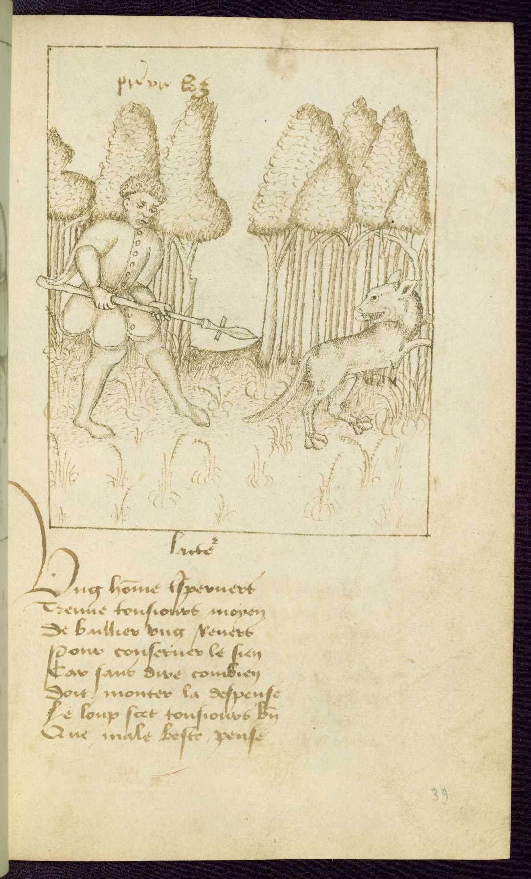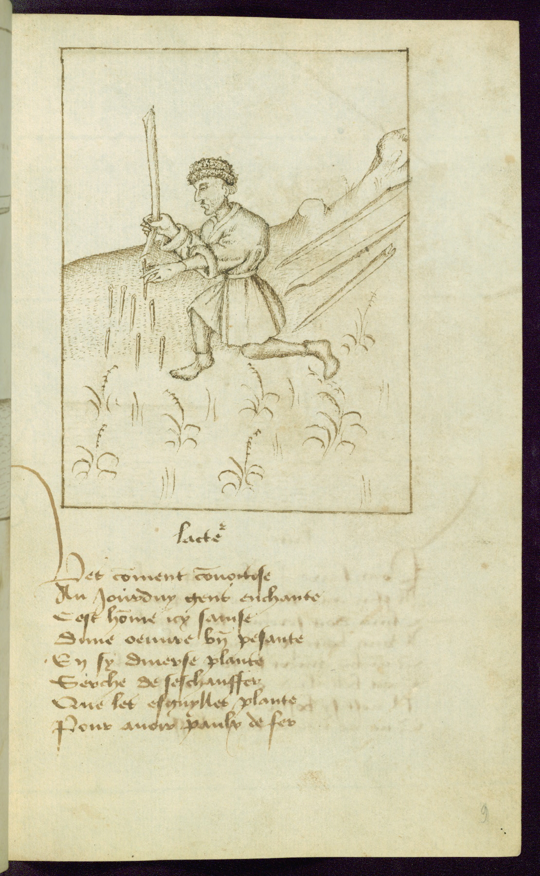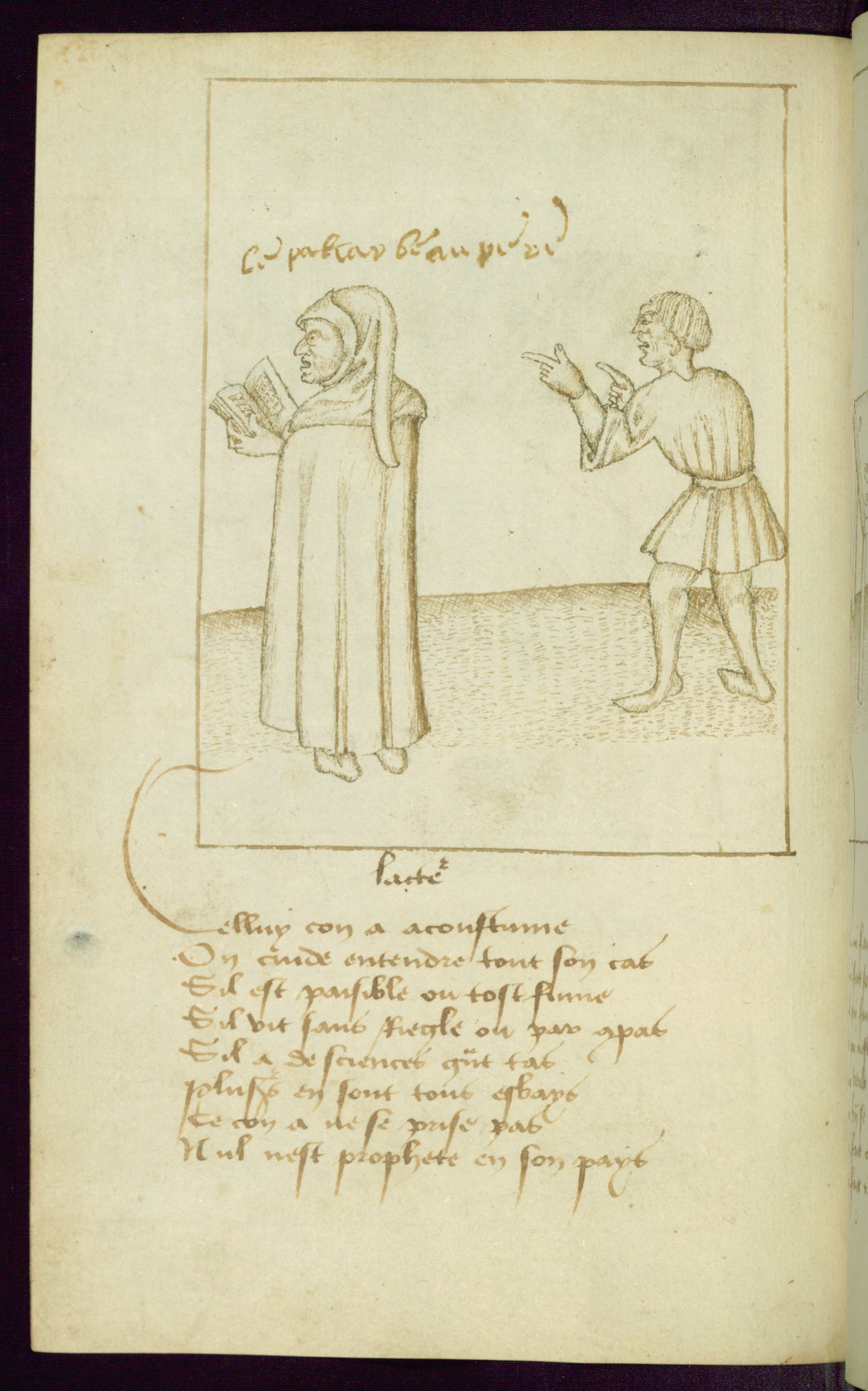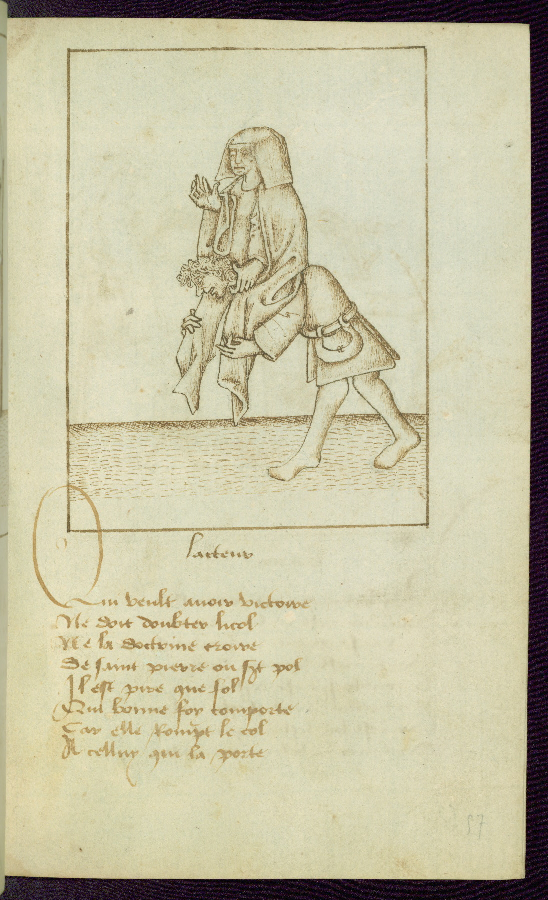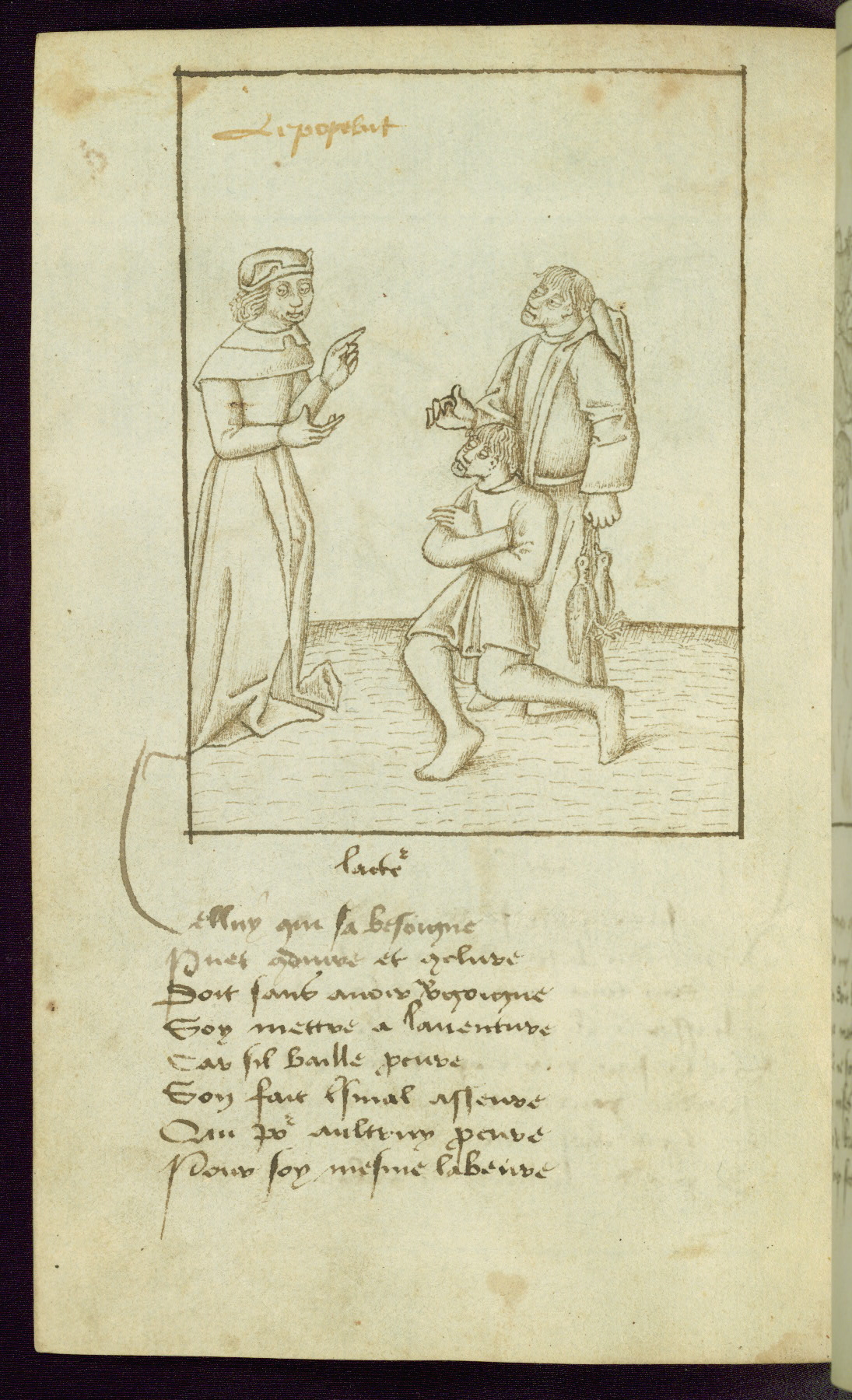 This late fifteenth-century manuscript is one of the earliest surviving examples from a small group of illustrated compilations of proverbs. Each drawing and accompanying verse refer to a commonly known proverb or turn of phrase. The verse does not typically include the phrase, so the combination of image and text is like a riddle that would bring the saying to mind (the proverbs are used in this catalog record as the titles of the images). The proverbs can be both entertaining and moralizing, and they frequently refer to religious life, farming and trades, and acceptable (or unacceptable) behavior. This manuscript originally contained more entries, but several leaves were detached at some point or not included when the book was rebound. Two leaves separated from this manuscript are now in the Wildenstein Collection at the Musée Marmottan in Paris. A third individual leaf (fol.add.1), which has significant damage on one side, was purchased by the Walters Art Museum in the 1990s.