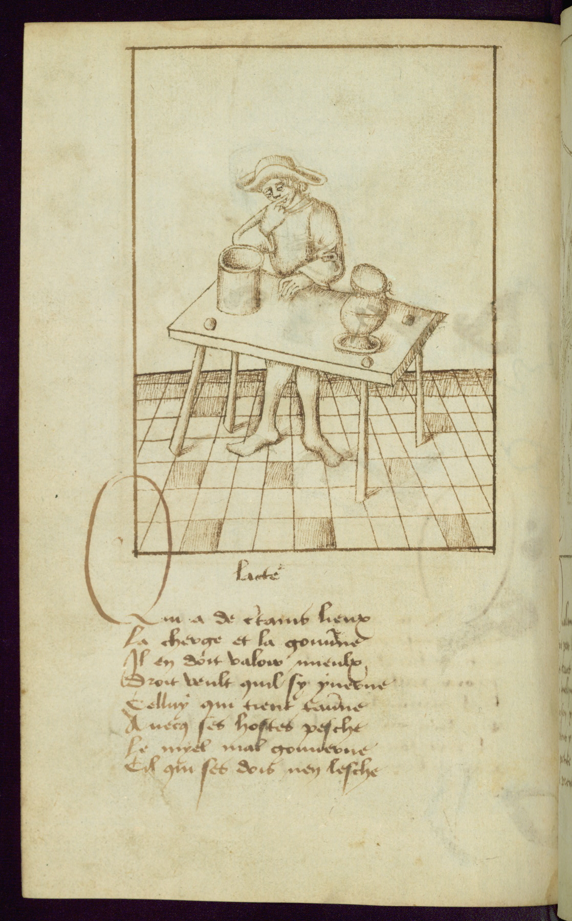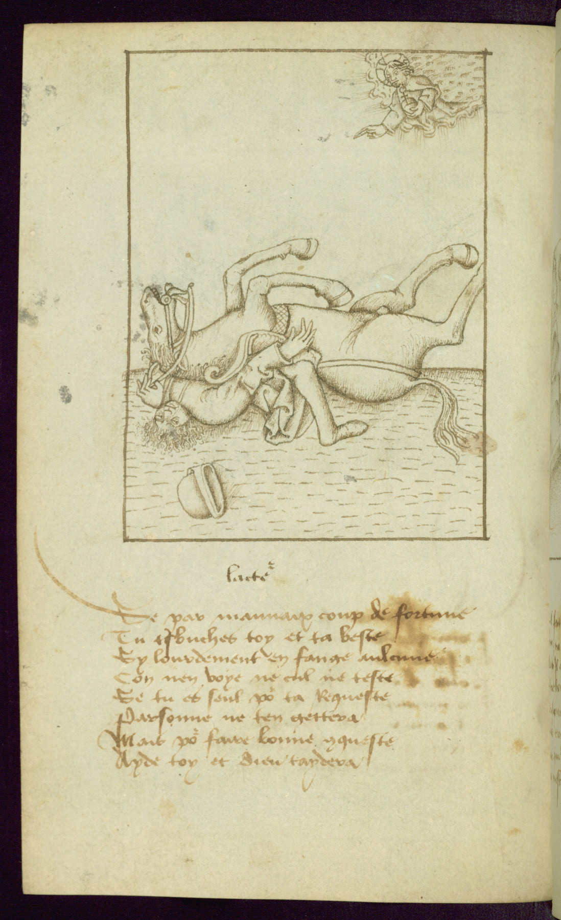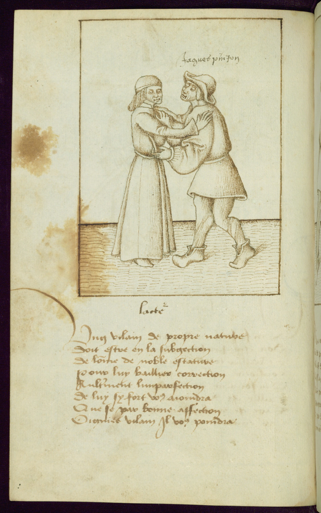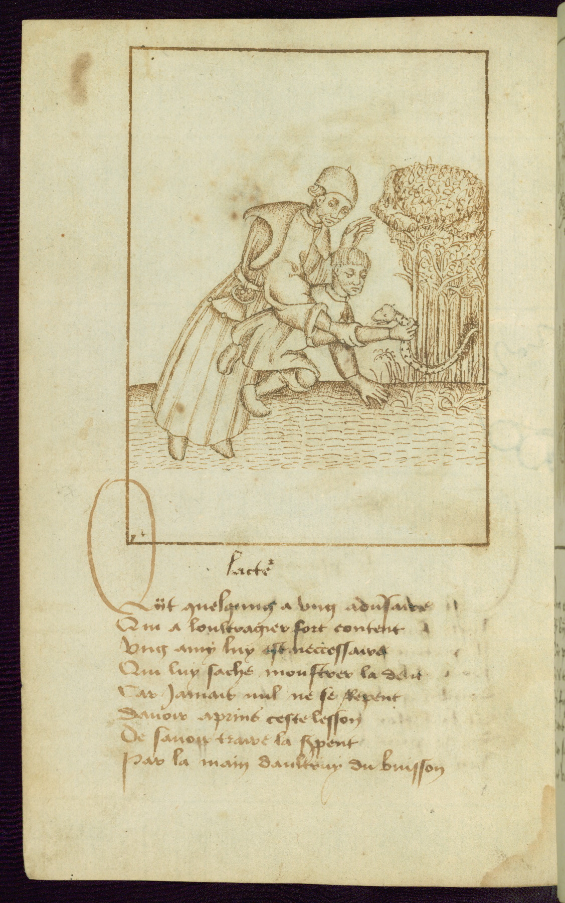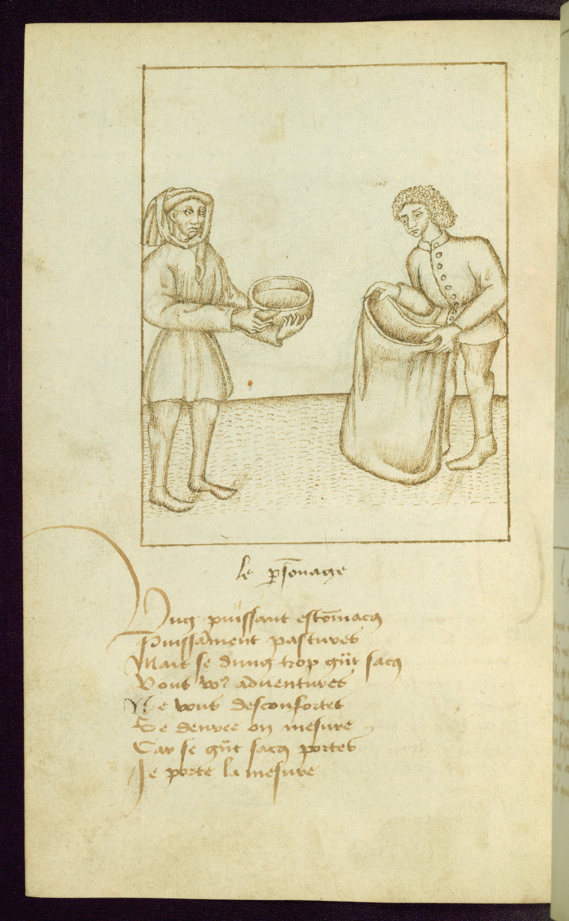 This late fifteenth-century manuscript is one of the earliest surviving examples from a small group of illustrated compilations of proverbs. Each drawing and accompanying verse refer to a commonly known proverb or turn of phrase. The verse does not typically include the phrase, so the combination of image and text is like a riddle that would bring the saying to mind (the proverbs are used in this catalog record as the titles of the images). The proverbs can be both entertaining and moralizing, and they frequently refer to religious life, farming and trades, and acceptable (or unacceptable) behavior. This manuscript originally contained more entries, but several leaves were detached at some point or not included when the book was rebound. Two leaves separated from this manuscript are now in the Wildenstein Collection at the Musée Marmottan in Paris. A third individual leaf (fol.add.1), which has significant damage on one side, was purchased by the Walters Art Museum in the 1990s.