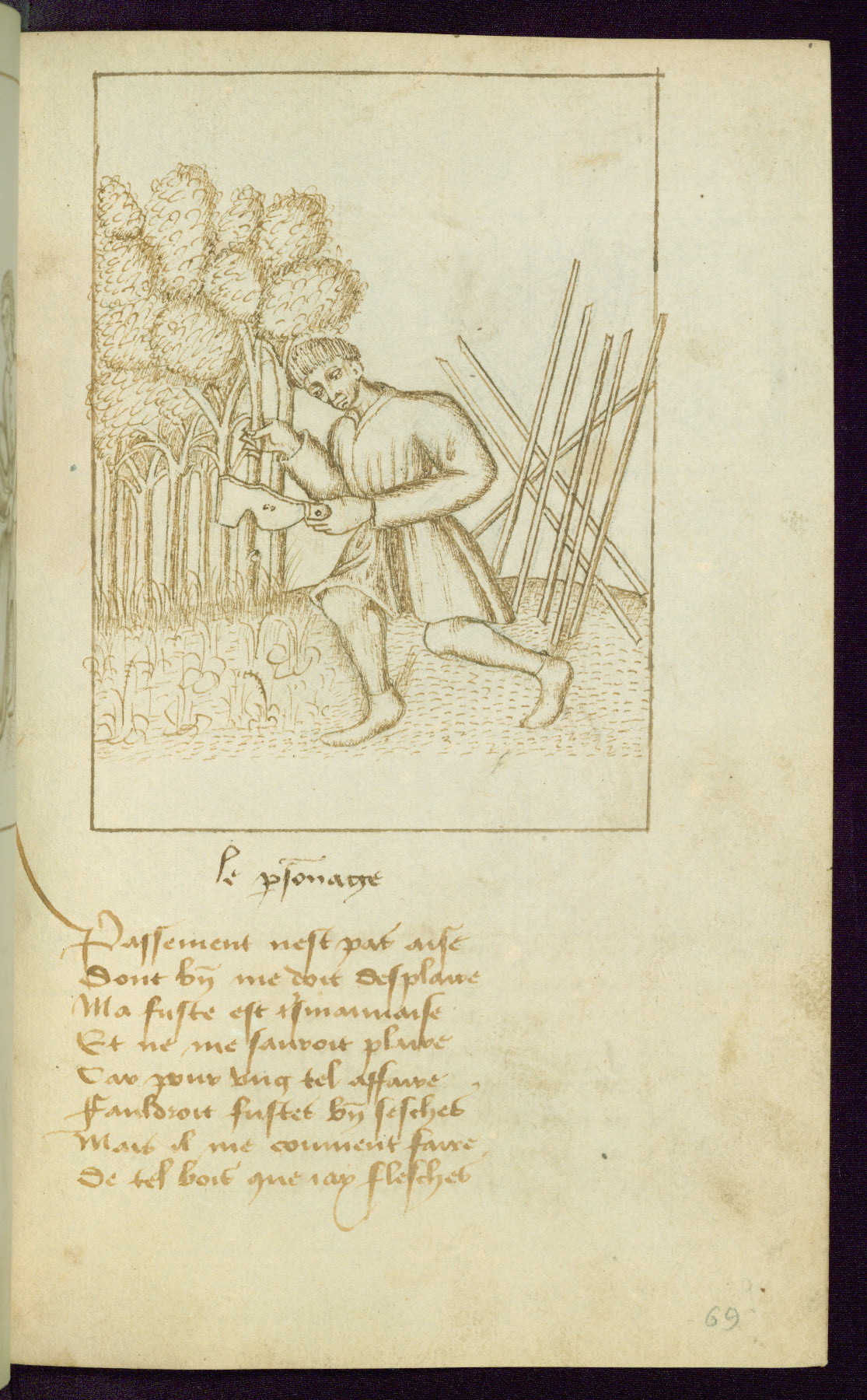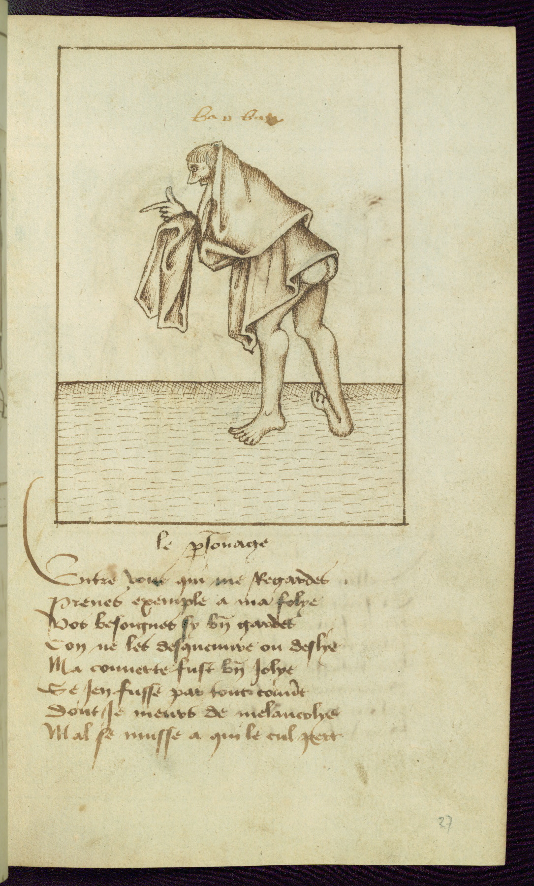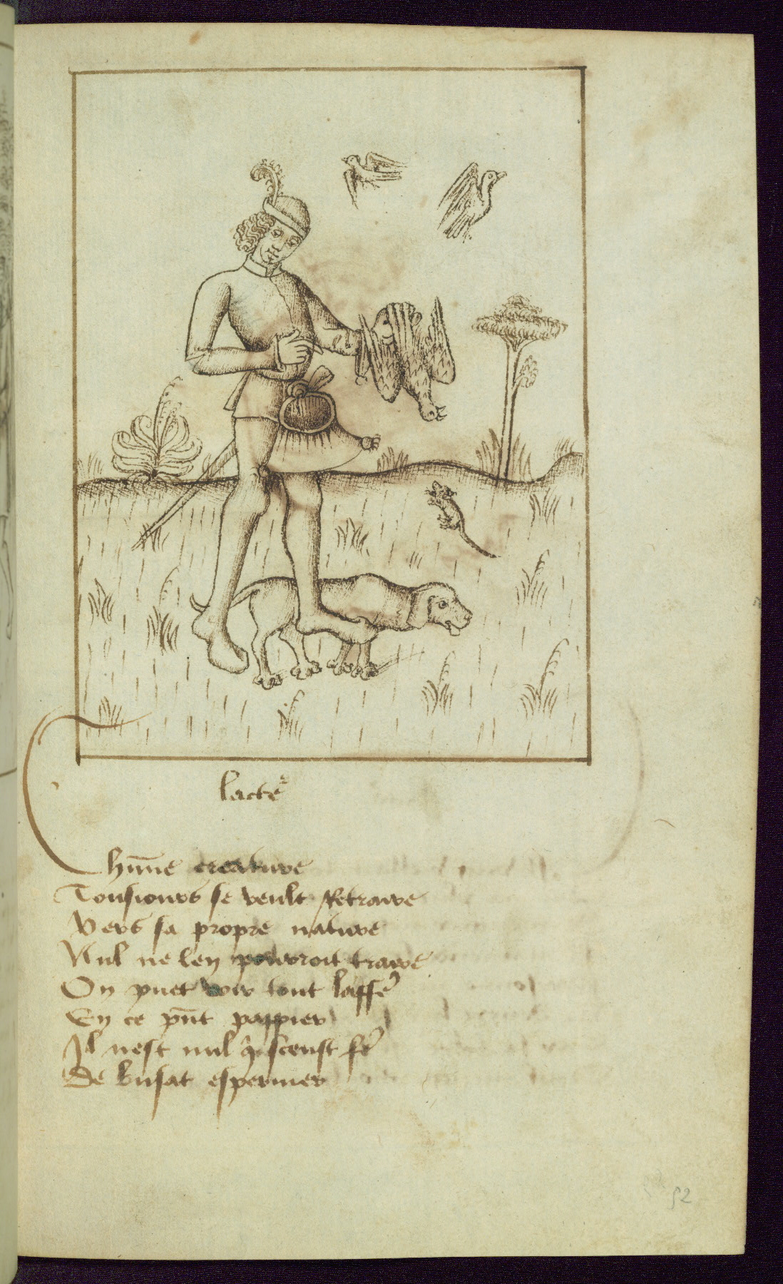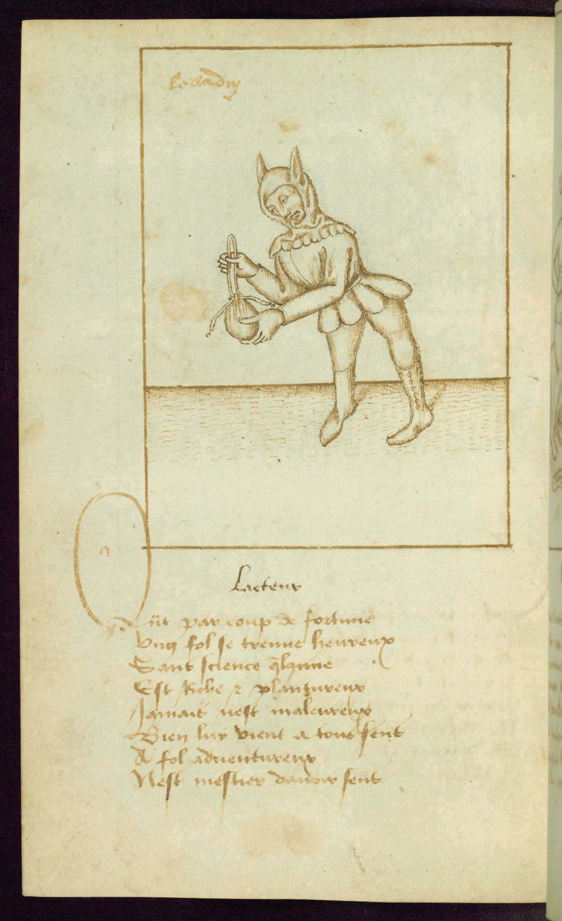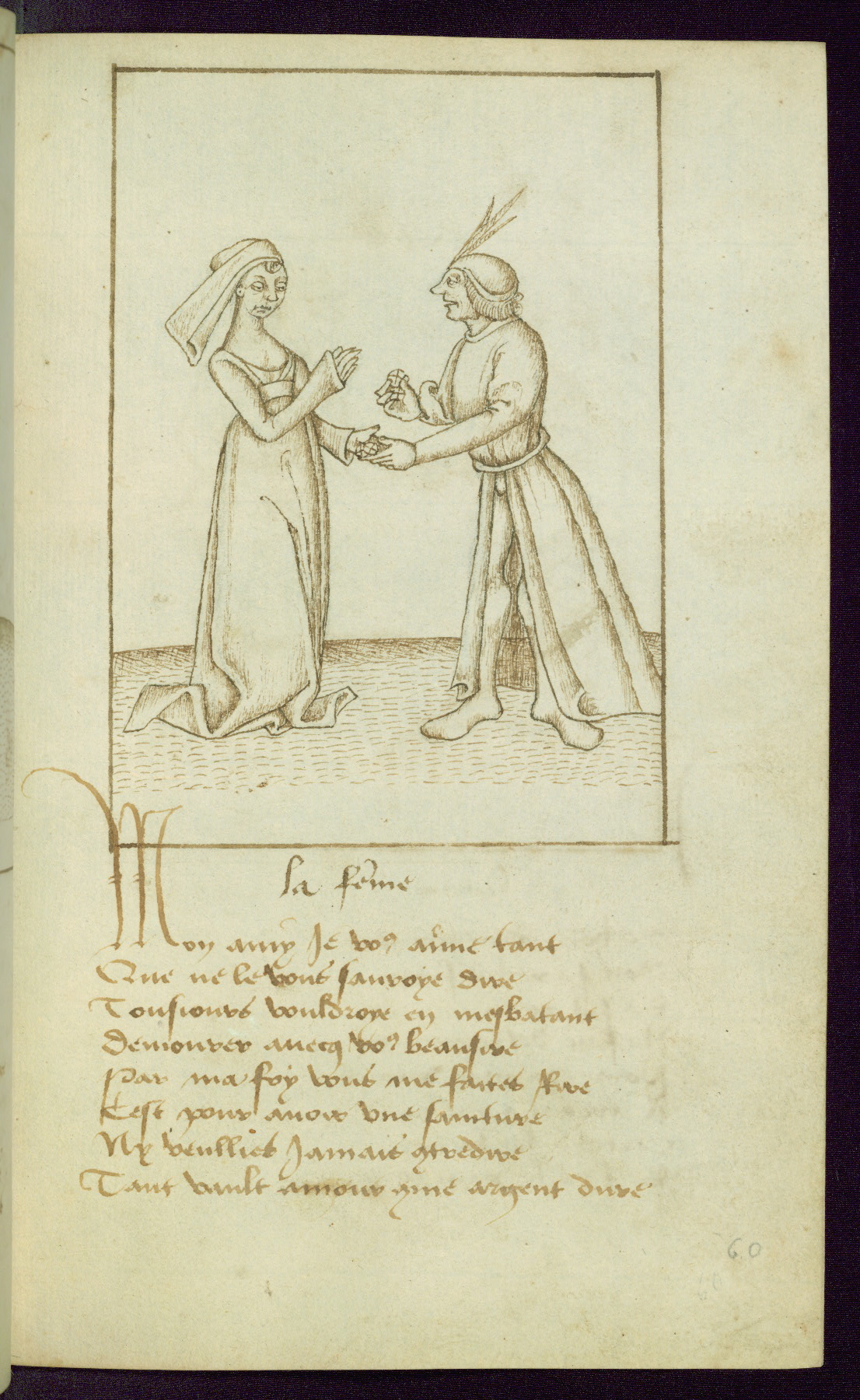 This late fifteenth-century manuscript is one of the earliest surviving examples from a small group of illustrated compilations of proverbs. Each drawing and accompanying verse refer to a commonly known proverb or turn of phrase. The verse does not typically include the phrase, so the combination of image and text is like a riddle that would bring the saying to mind (the proverbs are used in this catalog record as the titles of the images). The proverbs can be both entertaining and moralizing, and they frequently refer to religious life, farming and trades, and acceptable (or unacceptable) behavior. This manuscript originally contained more entries, but several leaves were detached at some point or not included when the book was rebound. Two leaves separated from this manuscript are now in the Wildenstein Collection at the Musée Marmottan in Paris. A third individual leaf (fol.add.1), which has significant damage on one side, was purchased by the Walters Art Museum in the 1990s.