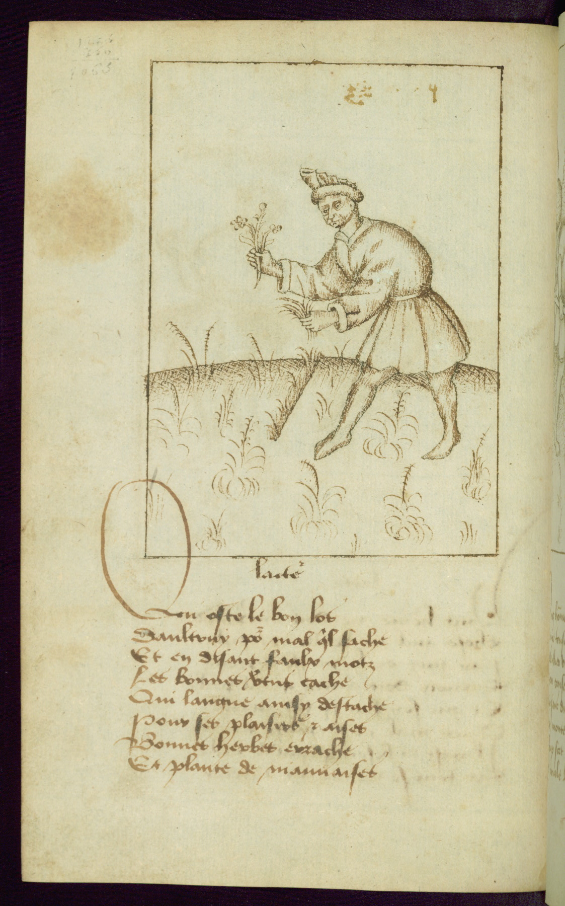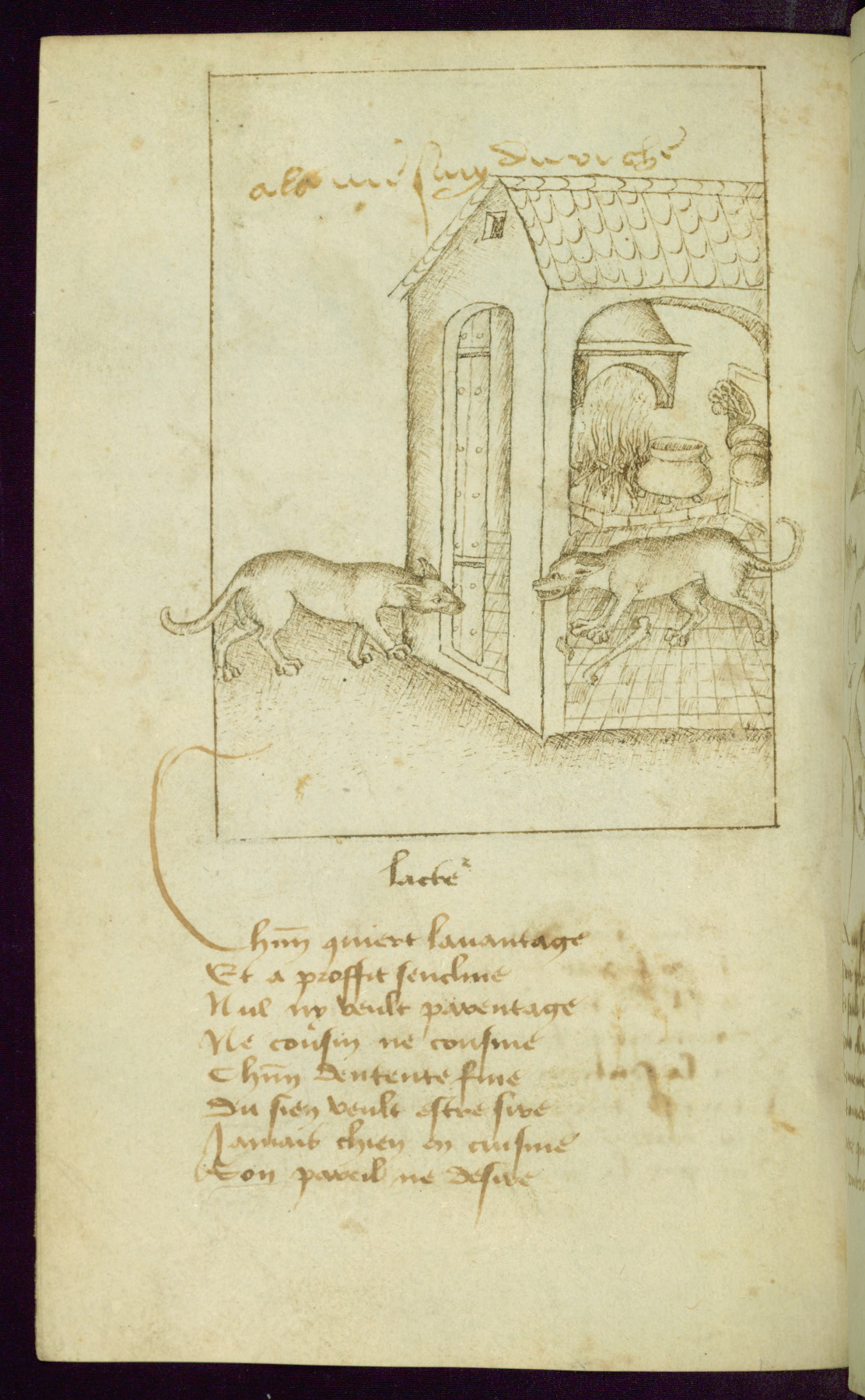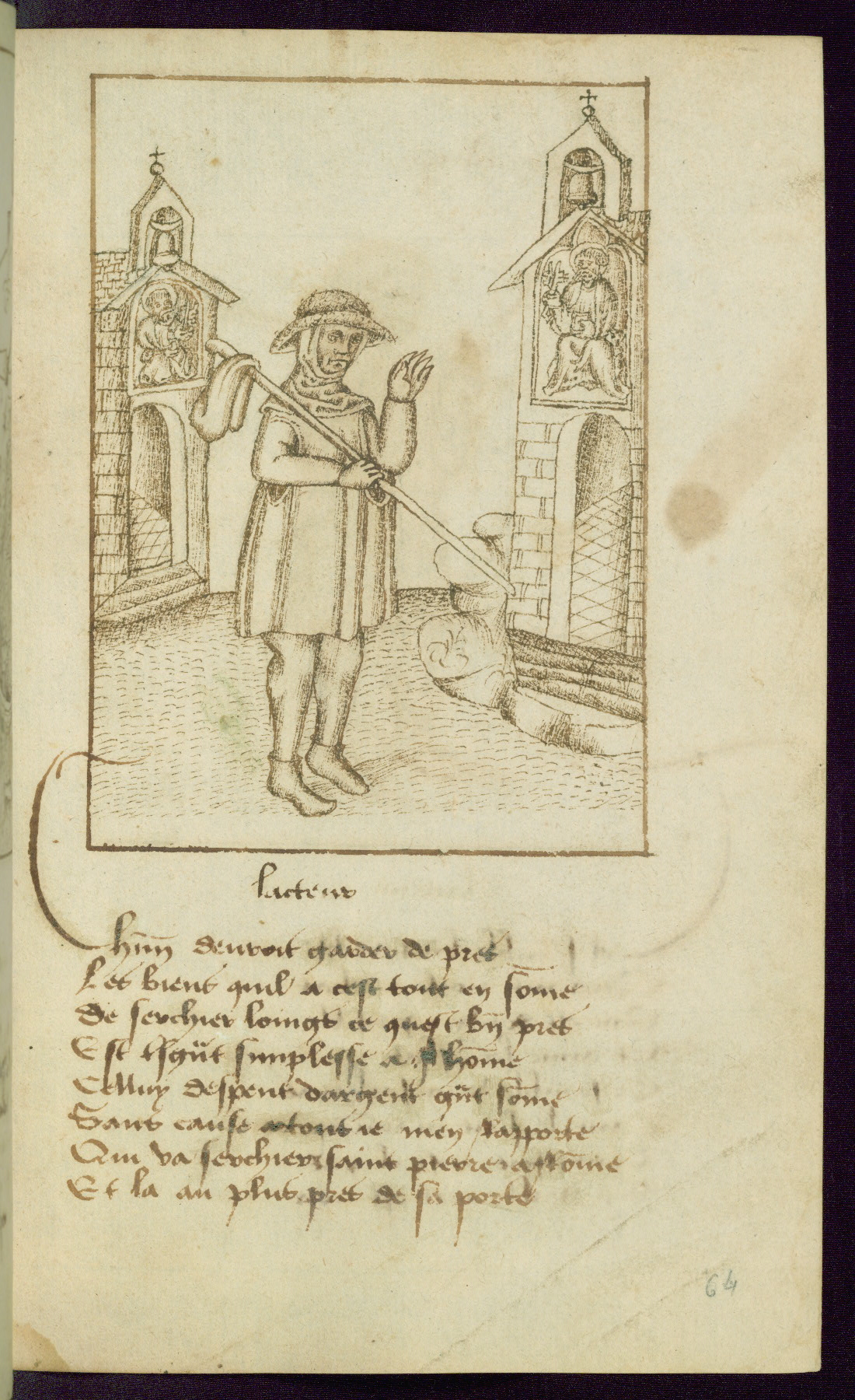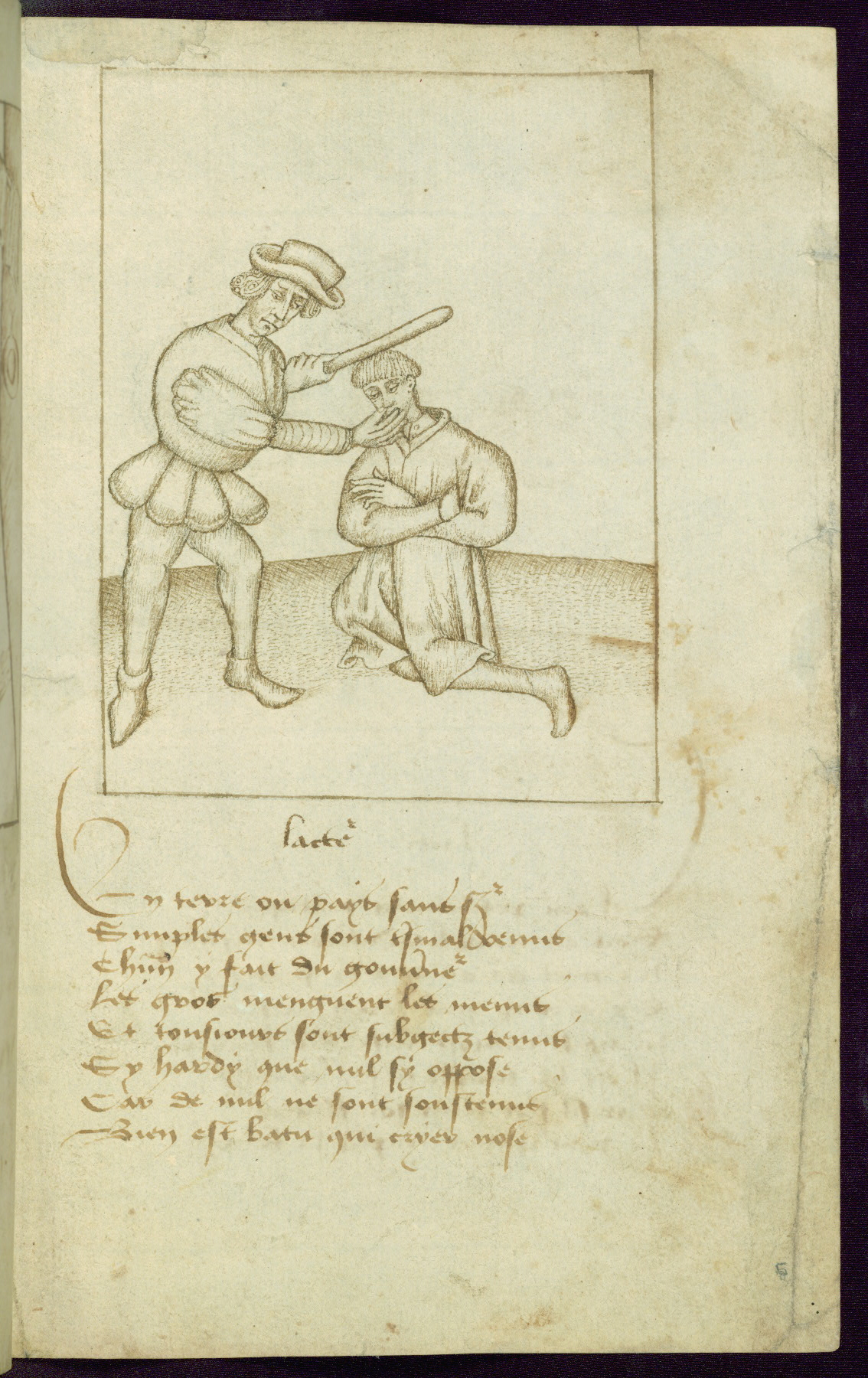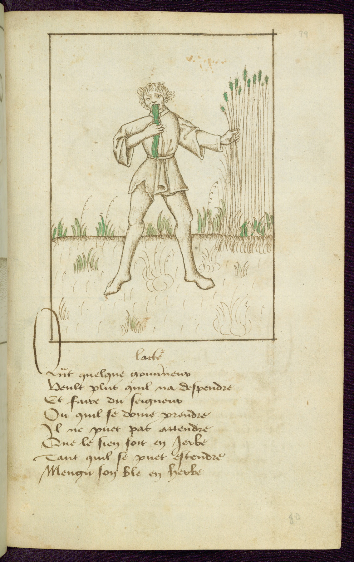This late fifteenth-century manuscript is one of the earliest surviving examples from a small group of illustrated compilations of proverbs. Each drawing and accompanying verse refer to a commonly known proverb or turn of phrase. The verse does not typically include the phrase, so the combination of image and text is like a riddle that would bring the saying to mind (the proverbs are used in this catalog record as the titles of the images). The proverbs can be both entertaining and moralizing, and they frequently refer to religious life, farming and trades, and acceptable (or unacceptable) behavior. This manuscript originally contained more entries, but several leaves were detached at some point or not included when the book was rebound. Two leaves separated from this manuscript are now in the Wildenstein Collection at the Musée Marmottan in Paris. A third individual leaf (fol.add.1), which has significant damage on one side, was purchased by the Walters Art Museum in the 1990s.