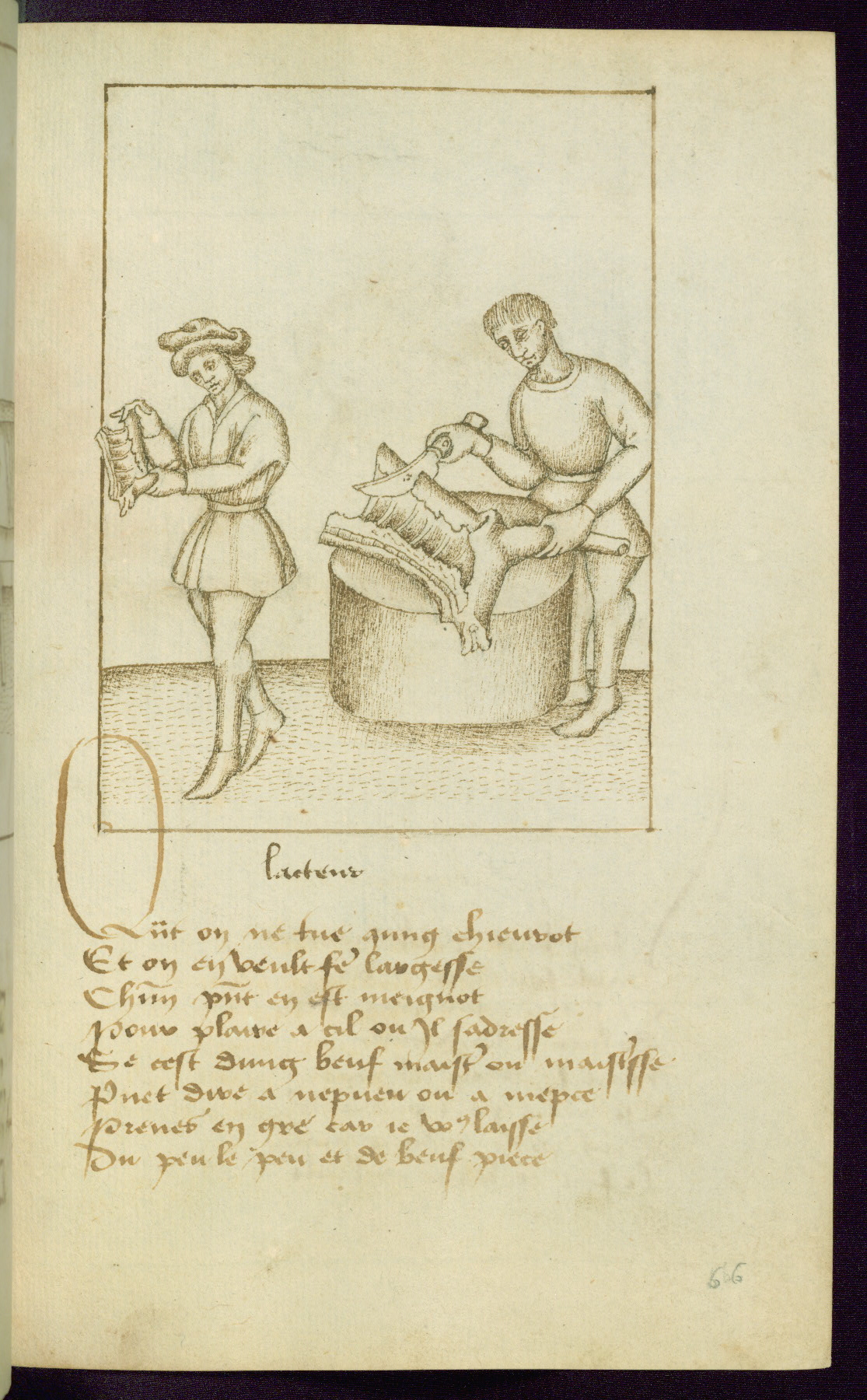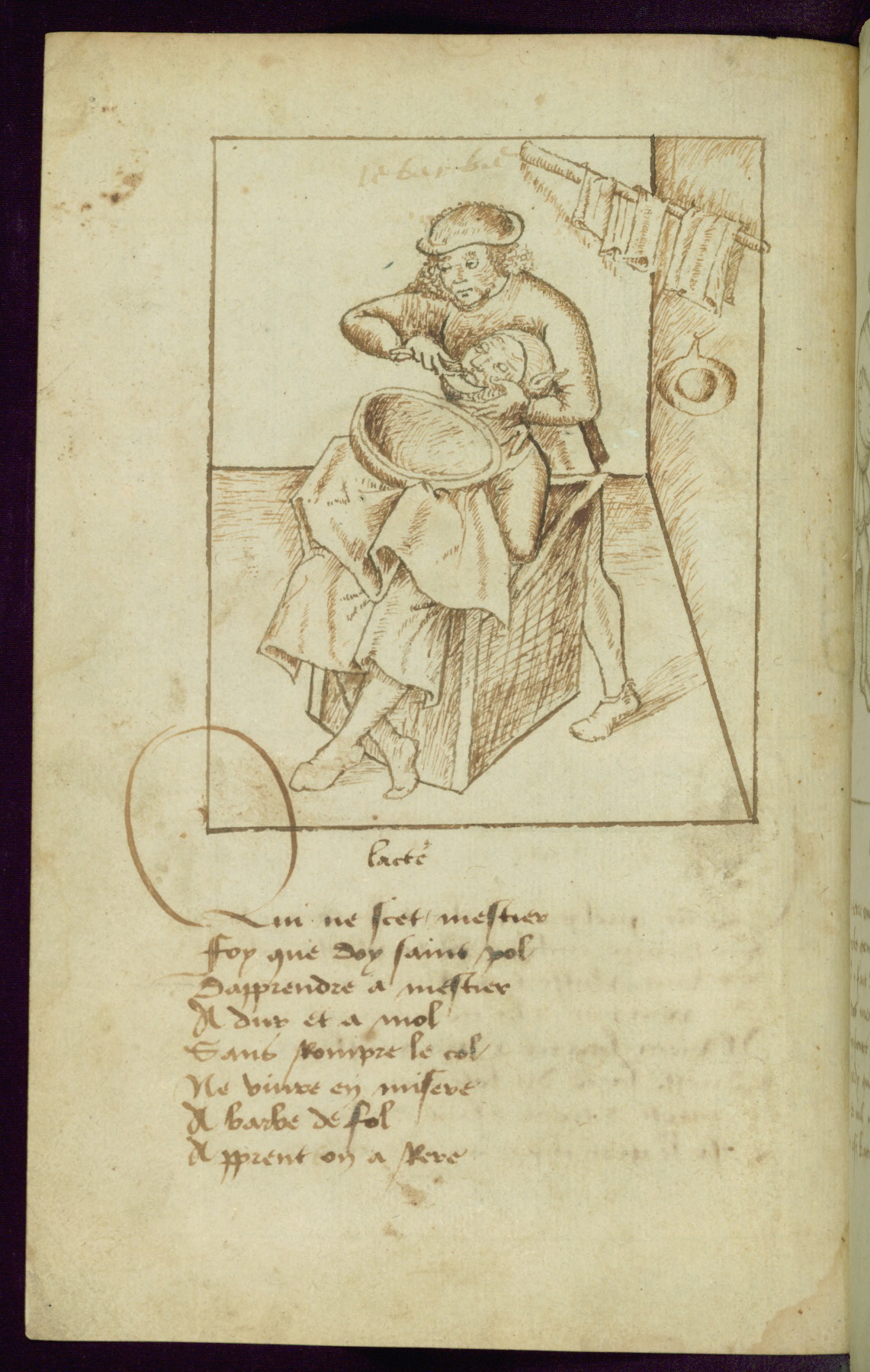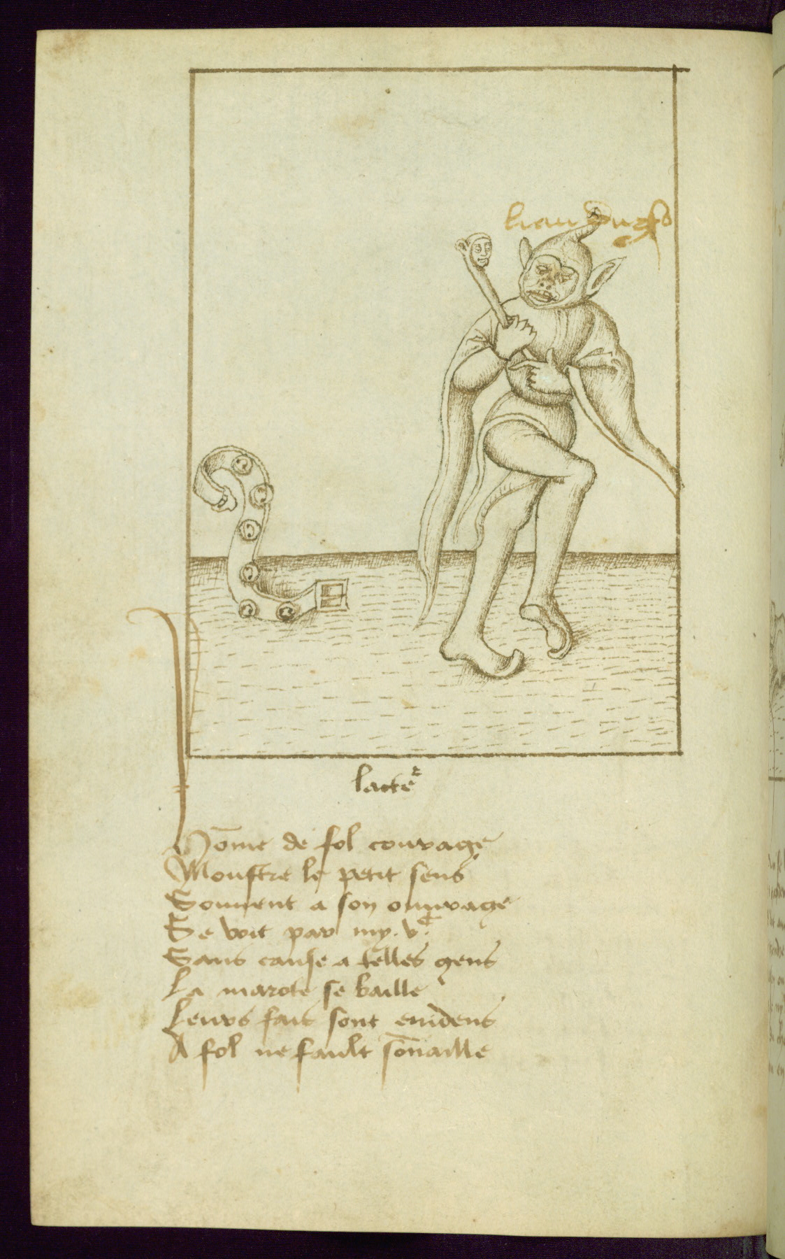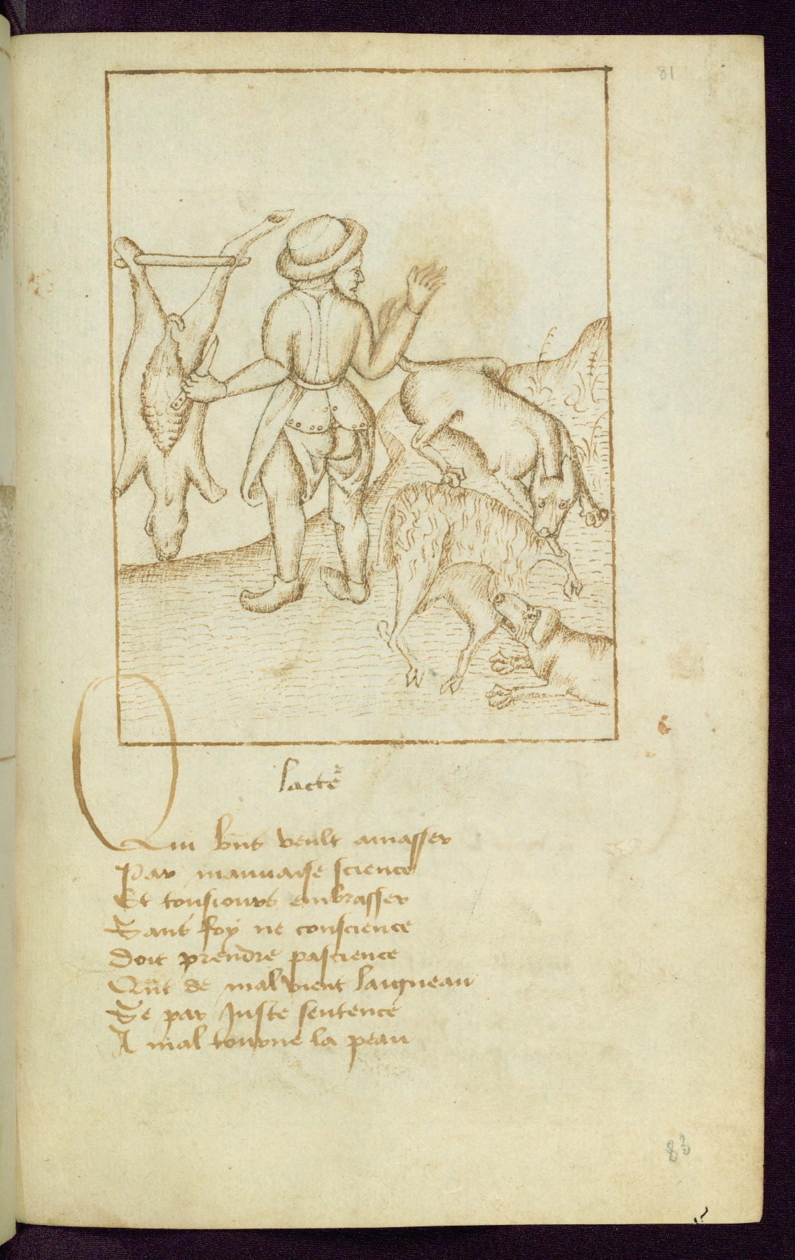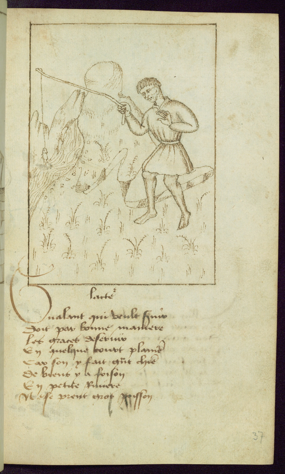 This late fifteenth-century manuscript is one of the earliest surviving examples from a small group of illustrated compilations of proverbs. Each drawing and accompanying verse refer to a commonly known proverb or turn of phrase. The verse does not typically include the phrase, so the combination of image and text is like a riddle that would bring the saying to mind (the proverbs are used in this catalog record as the titles of the images). The proverbs can be both entertaining and moralizing, and they frequently refer to religious life, farming and trades, and acceptable (or unacceptable) behavior. This manuscript originally contained more entries, but several leaves were detached at some point or not included when the book was rebound. Two leaves separated from this manuscript are now in the Wildenstein Collection at the Musée Marmottan in Paris. A third individual leaf (fol.add.1), which has significant damage on one side, was purchased by the Walters Art Museum in the 1990s.