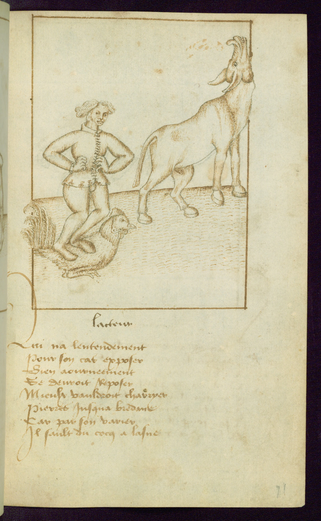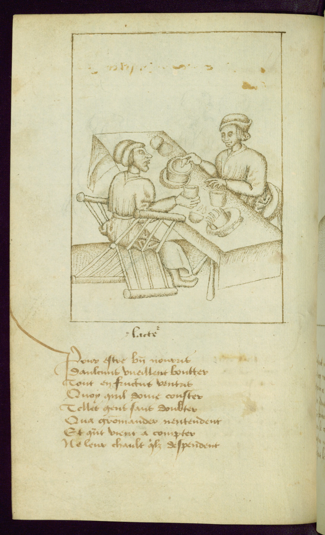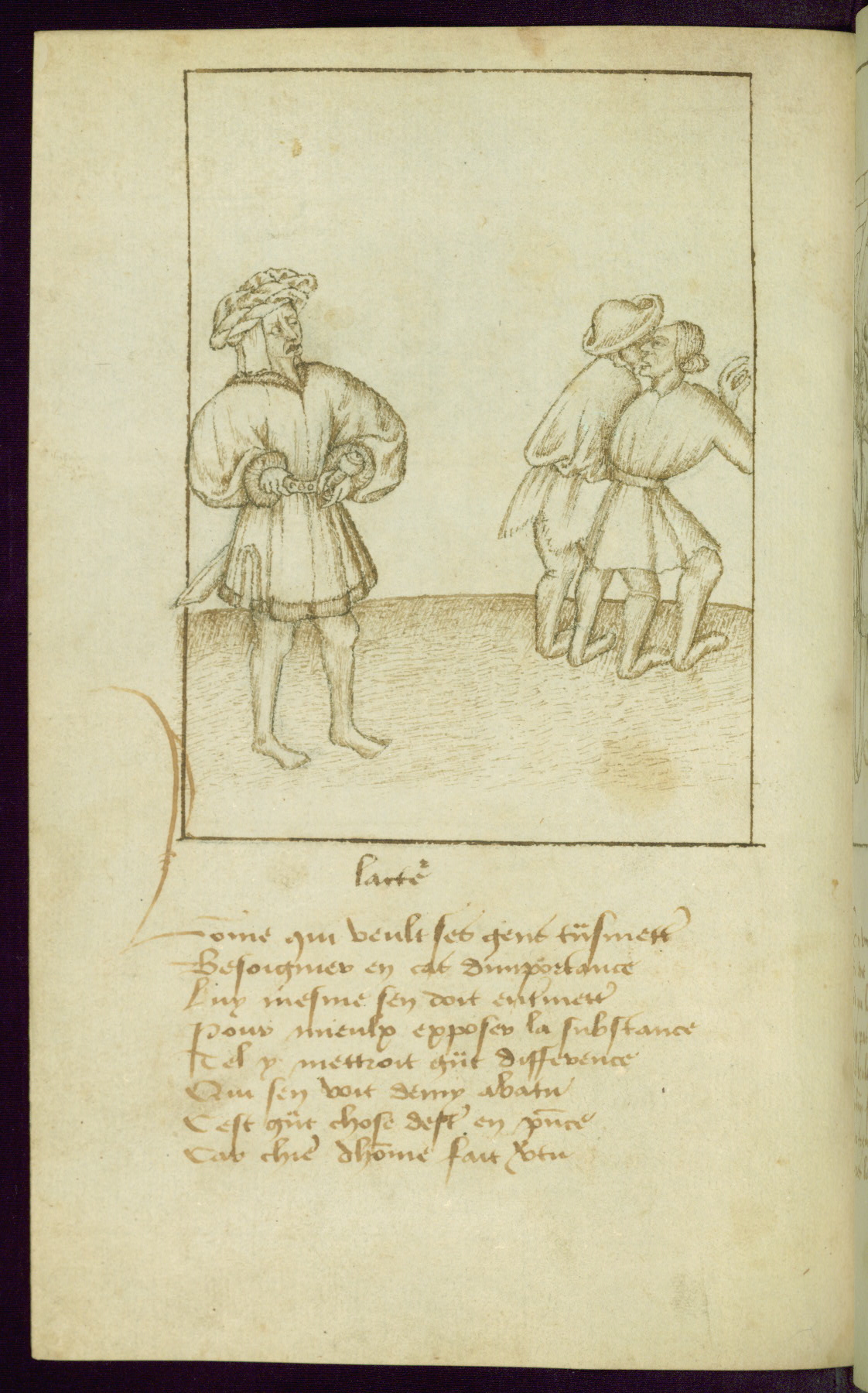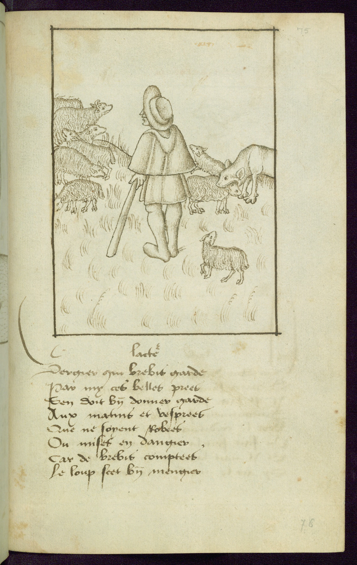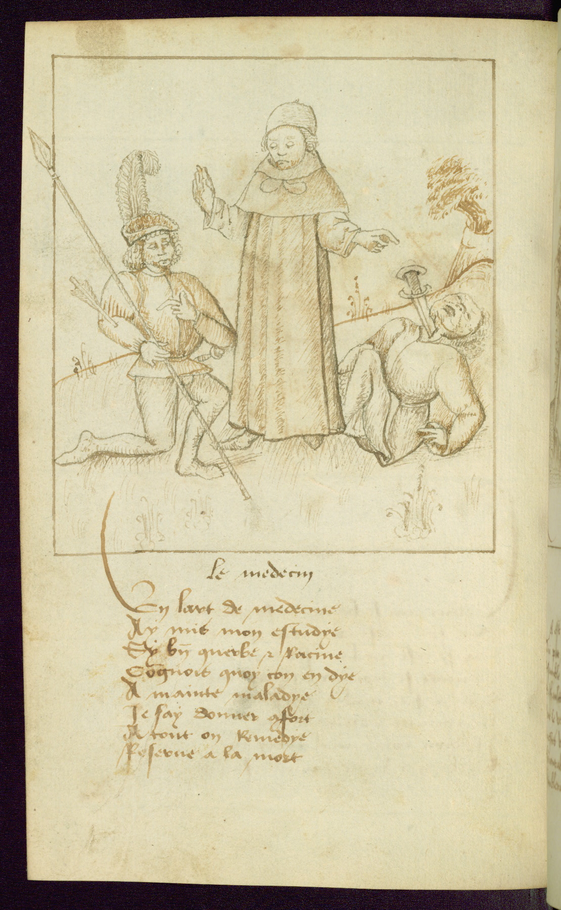 This late fifteenth-century manuscript is one of the earliest surviving examples from a small group of illustrated compilations of proverbs. Each drawing and accompanying verse refer to a commonly known proverb or turn of phrase. The verse does not typically include the phrase, so the combination of image and text is like a riddle that would bring the saying to mind (the proverbs are used in this catalog record as the titles of the images). The proverbs can be both entertaining and moralizing, and they frequently refer to religious life, farming and trades, and acceptable (or unacceptable) behavior. This manuscript originally contained more entries, but several leaves were detached at some point or not included when the book was rebound. Two leaves separated from this manuscript are now in the Wildenstein Collection at the Musée Marmottan in Paris. A third individual leaf (fol.add.1), which has significant damage on one side, was purchased by the Walters Art Museum in the 1990s.