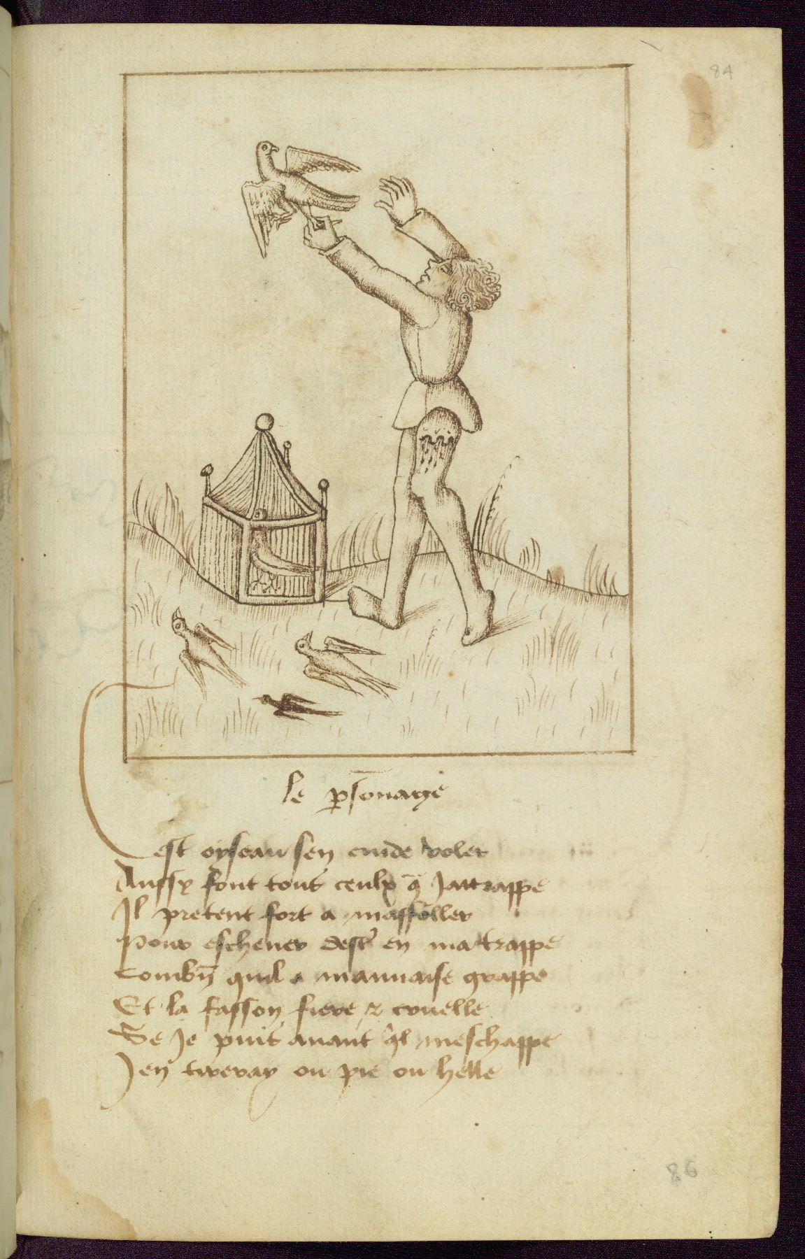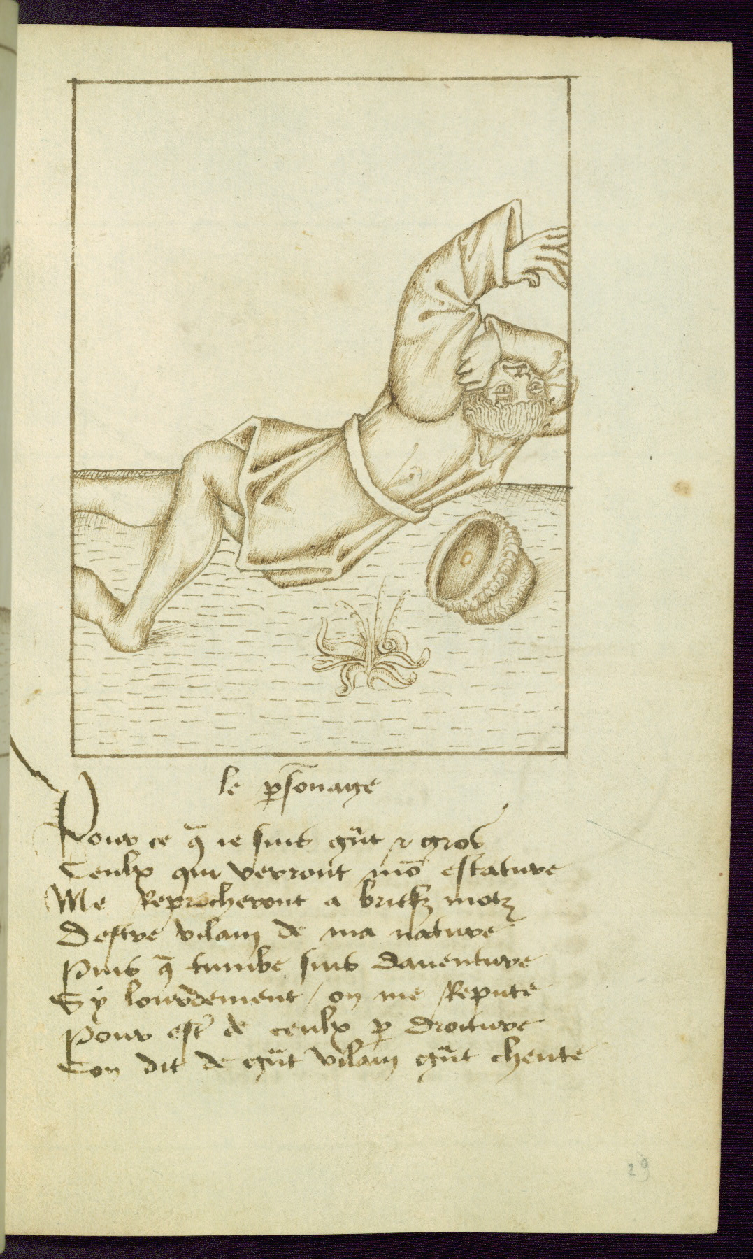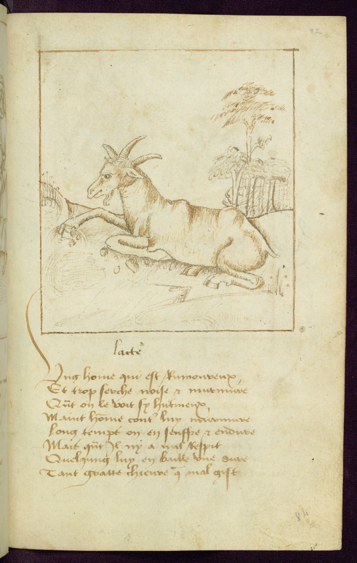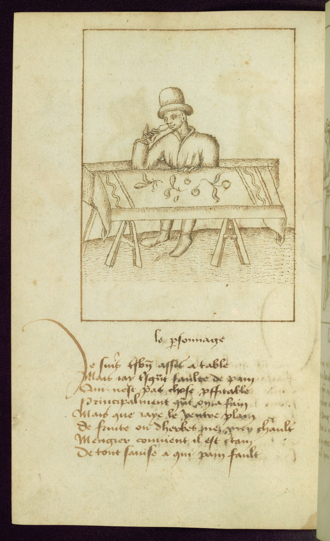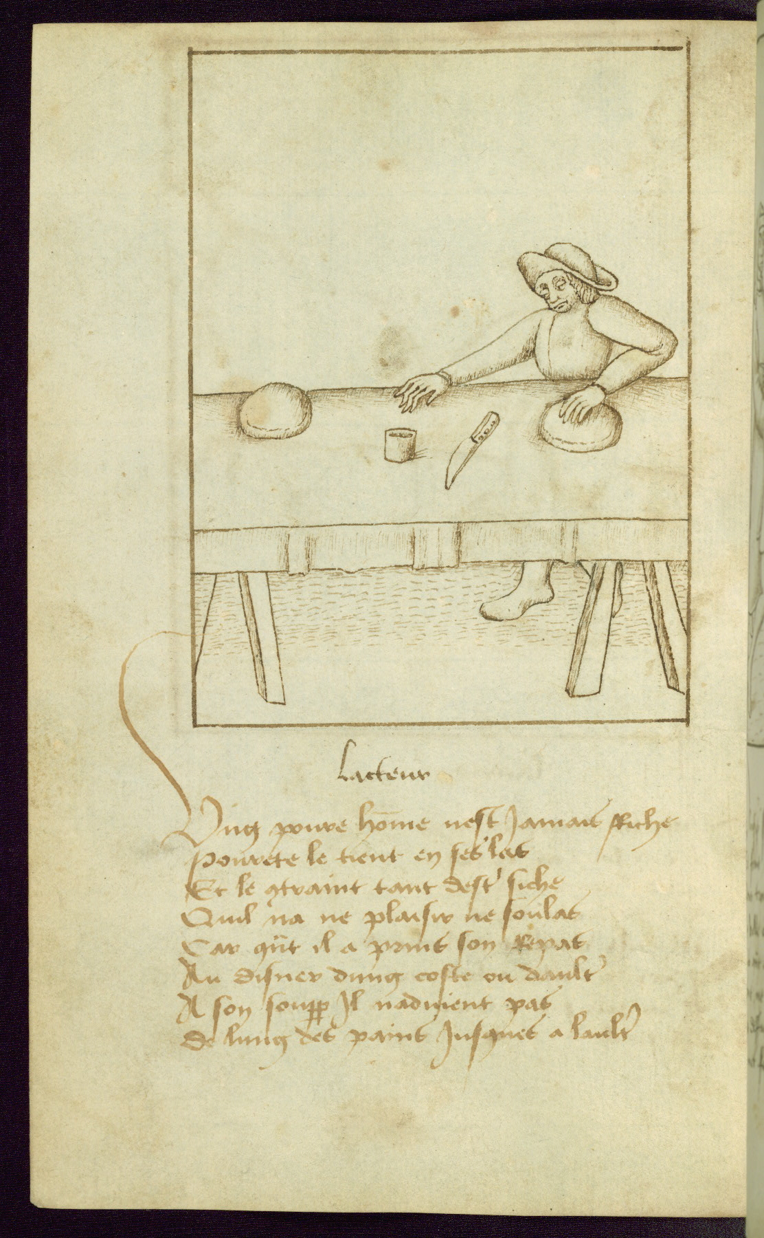 This late fifteenth-century manuscript is one of the earliest surviving examples from a small group of illustrated compilations of proverbs. Each drawing and accompanying verse refer to a commonly known proverb or turn of phrase. The verse does not typically include the phrase, so the combination of image and text is like a riddle that would bring the saying to mind (the proverbs are used in this catalog record as the titles of the images). The proverbs can be both entertaining and moralizing, and they frequently refer to religious life, farming and trades, and acceptable (or unacceptable) behavior. This manuscript originally contained more entries, but several leaves were detached at some point or not included when the book was rebound. Two leaves separated from this manuscript are now in the Wildenstein Collection at the Musée Marmottan in Paris. A third individual leaf (fol.add.1), which has significant damage on one side, was purchased by the Walters Art Museum in the 1990s.