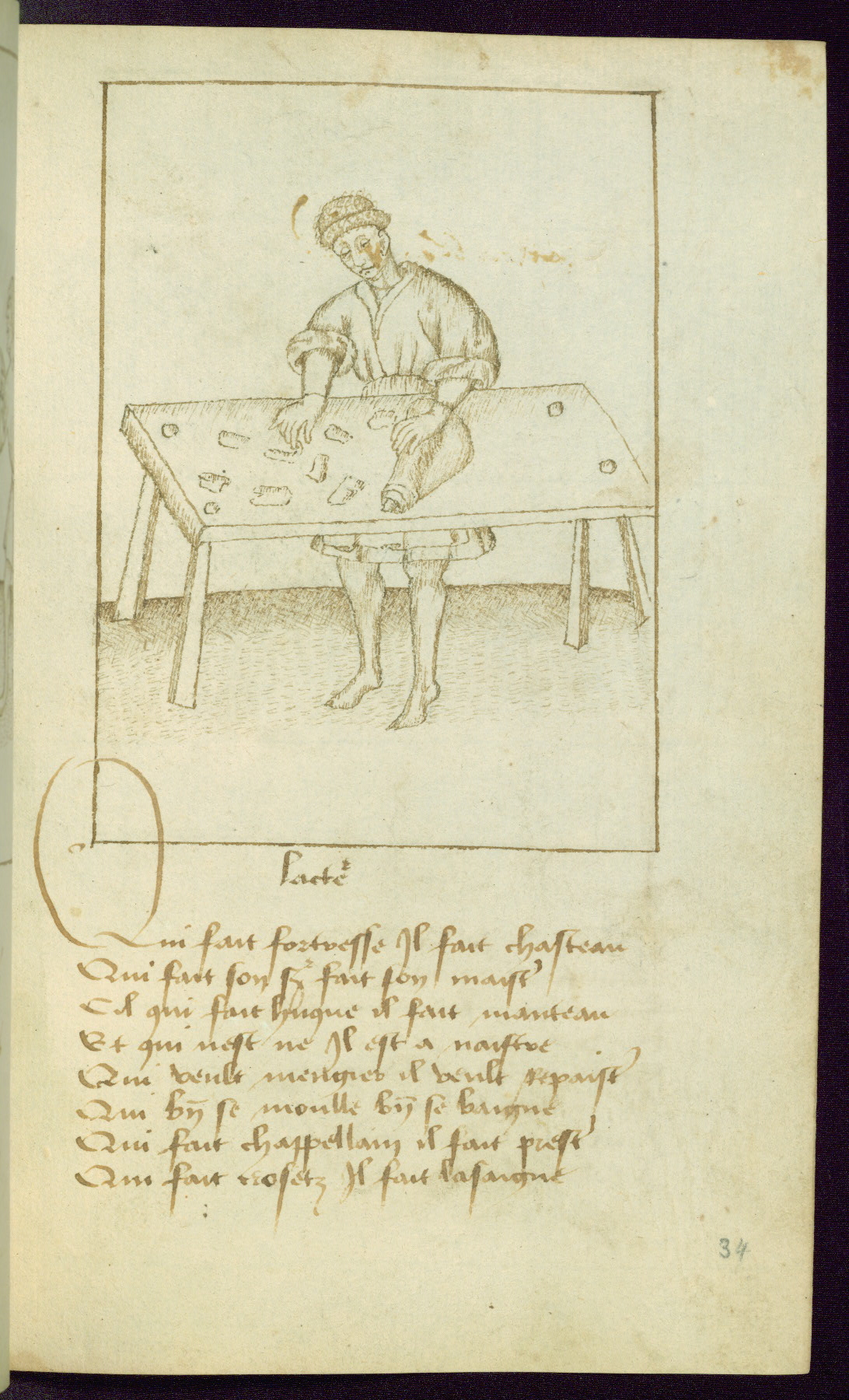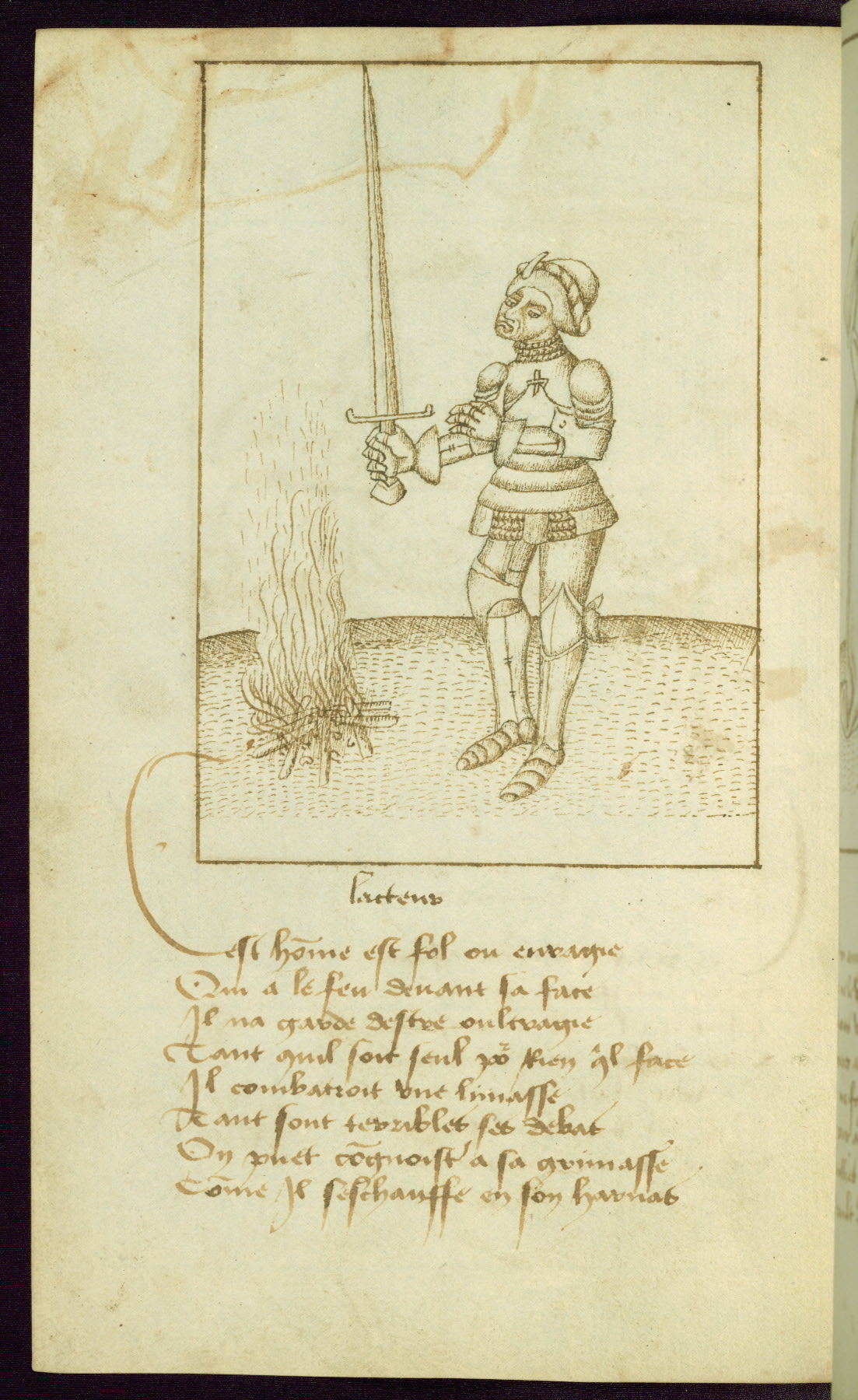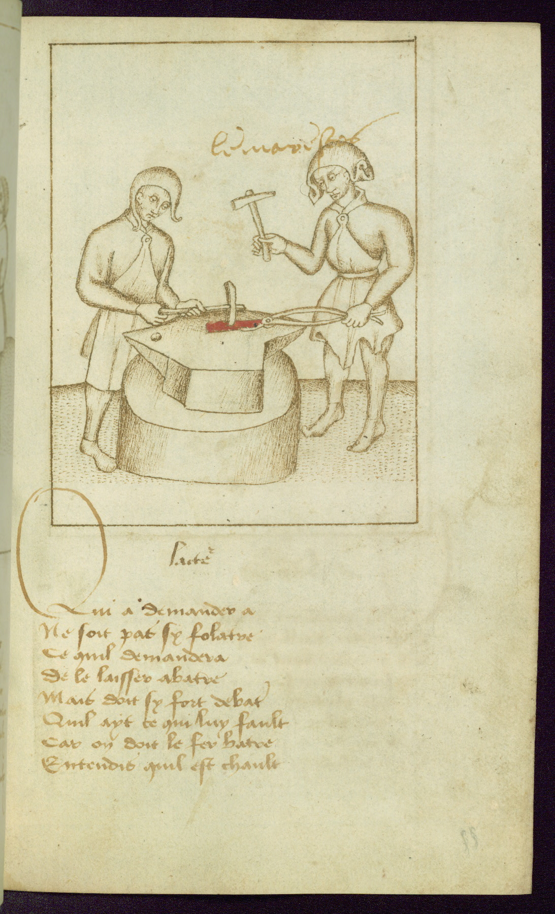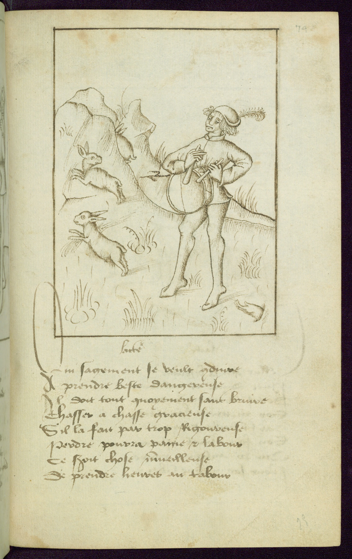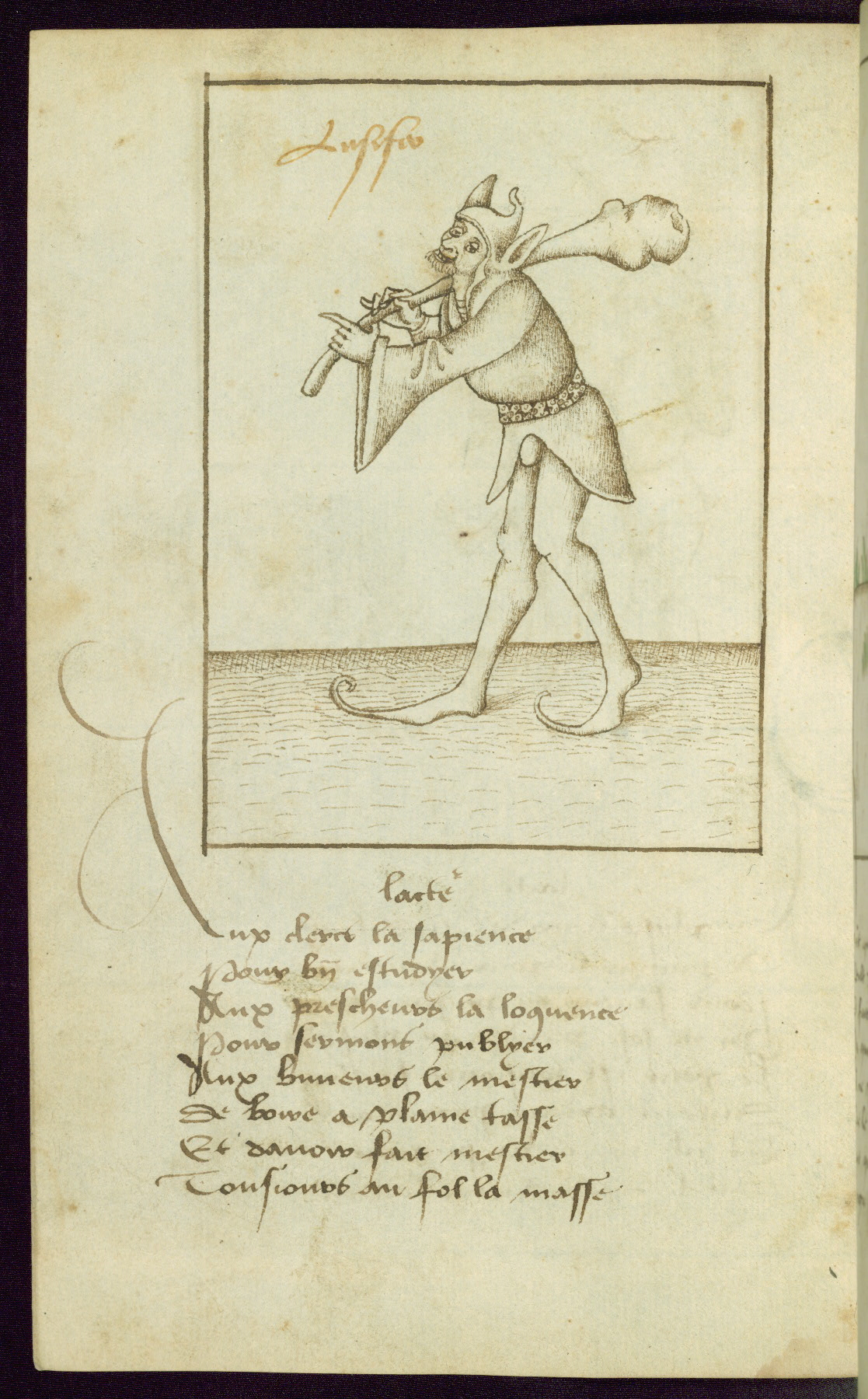 This late fifteenth-century manuscript is one of the earliest surviving examples from a small group of illustrated compilations of proverbs. Each drawing and accompanying verse refer to a commonly known proverb or turn of phrase. The verse does not typically include the phrase, so the combination of image and text is like a riddle that would bring the saying to mind (the proverbs are used in this catalog record as the titles of the images). The proverbs can be both entertaining and moralizing, and they frequently refer to religious life, farming and trades, and acceptable (or unacceptable) behavior. This manuscript originally contained more entries, but several leaves were detached at some point or not included when the book was rebound. Two leaves separated from this manuscript are now in the Wildenstein Collection at the Musée Marmottan in Paris. A third individual leaf (fol.add.1), which has significant damage on one side, was purchased by the Walters Art Museum in the 1990s.