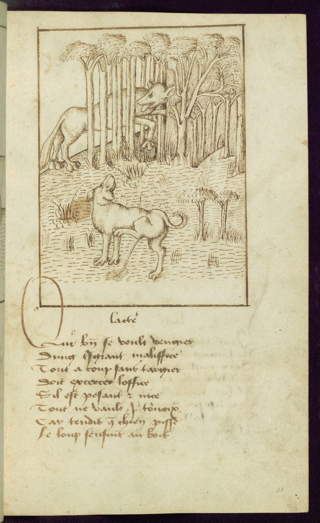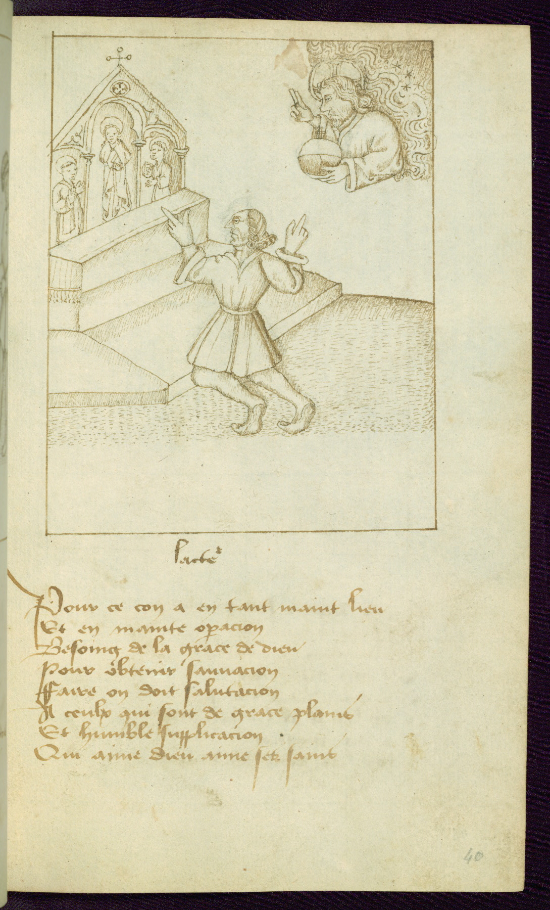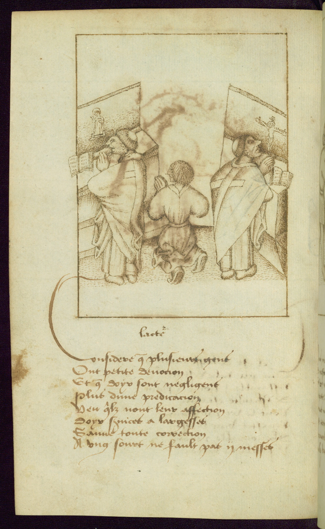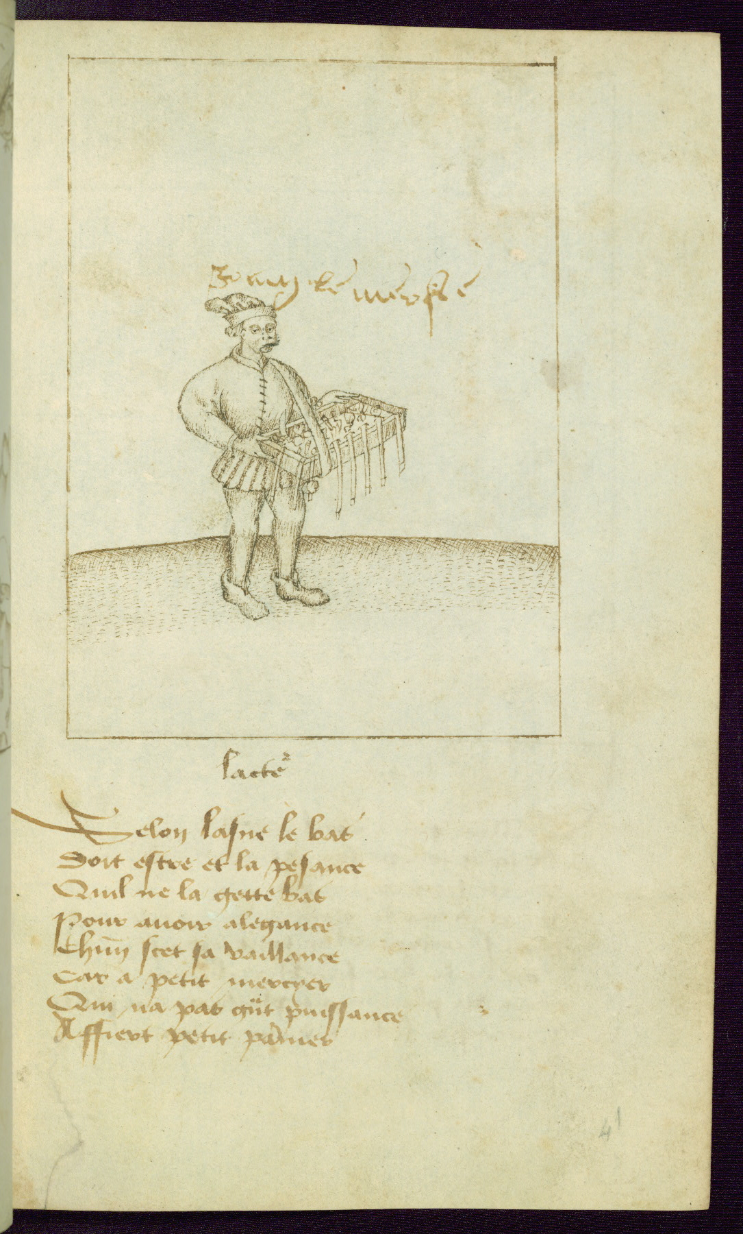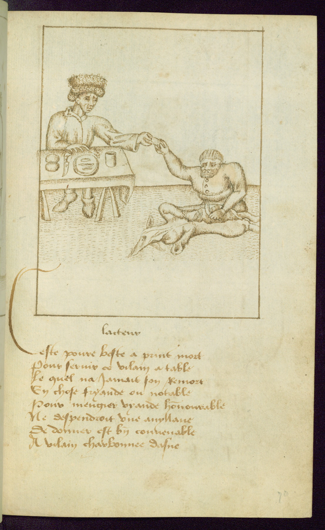 This late fifteenth-century manuscript is one of the earliest surviving examples from a small group of illustrated compilations of proverbs. Each drawing and accompanying verse refer to a commonly known proverb or turn of phrase. The verse does not typically include the phrase, so the combination of image and text is like a riddle that would bring the saying to mind (the proverbs are used in this catalog record as the titles of the images). The proverbs can be both entertaining and moralizing, and they frequently refer to religious life, farming and trades, and acceptable (or unacceptable) behavior. This manuscript originally contained more entries, but several leaves were detached at some point or not included when the book was rebound. Two leaves separated from this manuscript are now in the Wildenstein Collection at the Musée Marmottan in Paris. A third individual leaf (fol.add.1), which has significant damage on one side, was purchased by the Walters Art Museum in the 1990s.