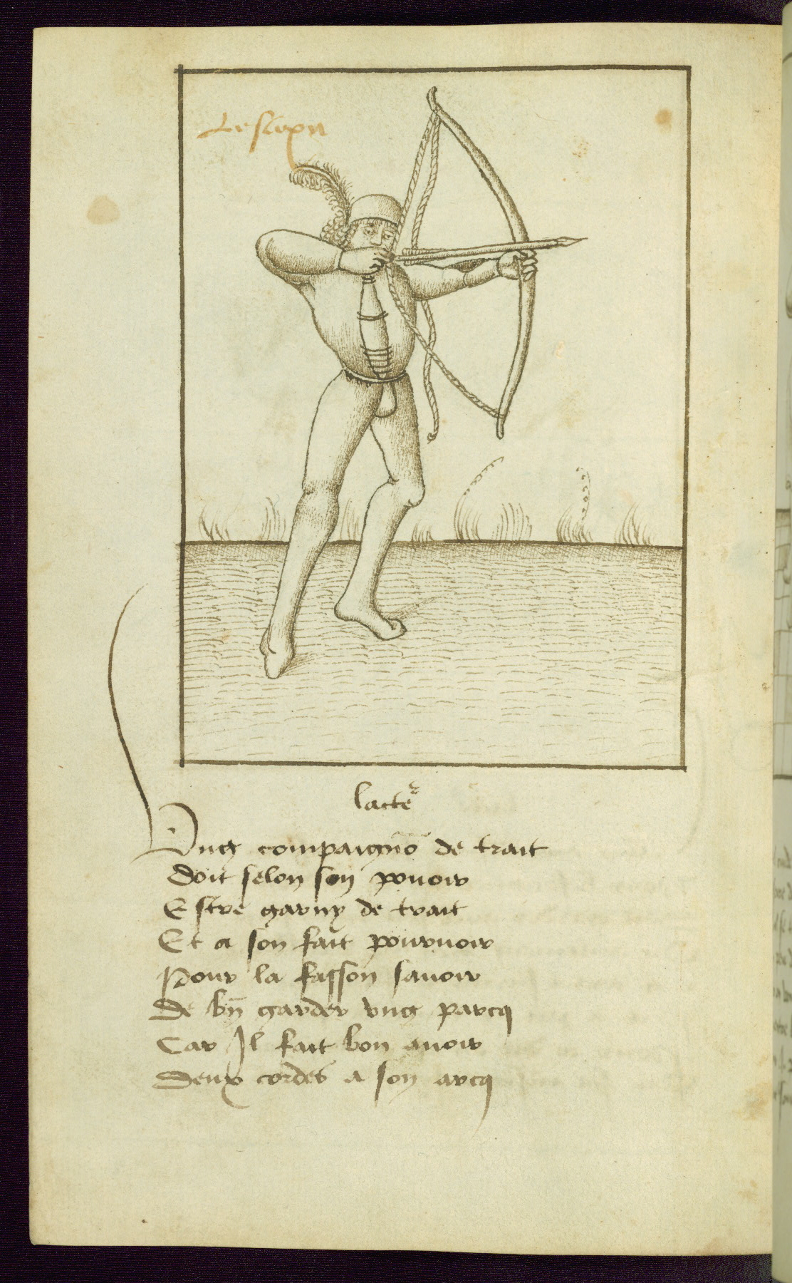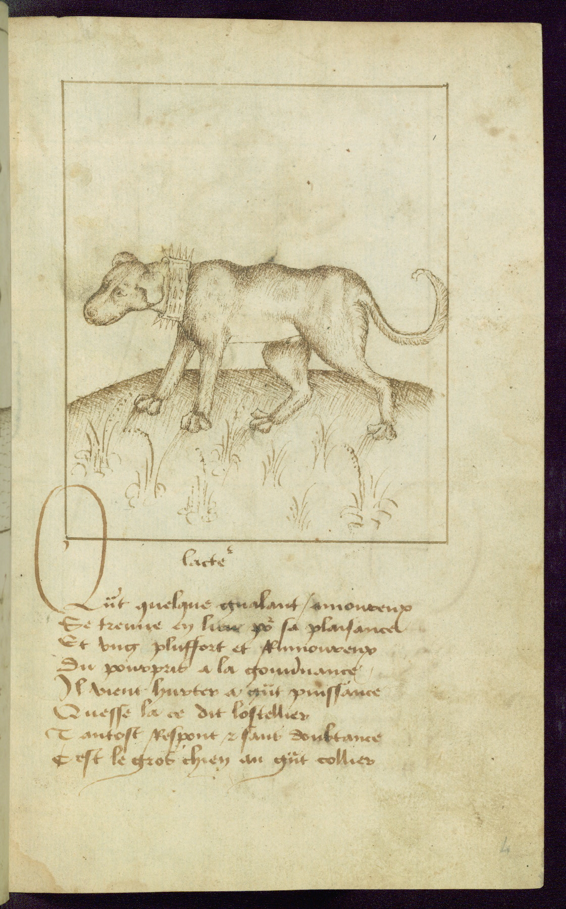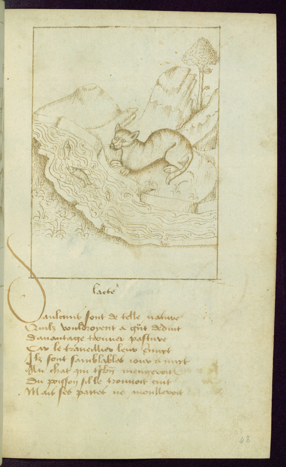 - Hand note: Littera batarda cursiva by several scribes, capitals with large sweeping curves and extenders, lacking punctuation; some illustrations labeled with early cursive script by several different hands (e.g. "lange" on fol. 6v, "le fo[u]" on fol. 32r)