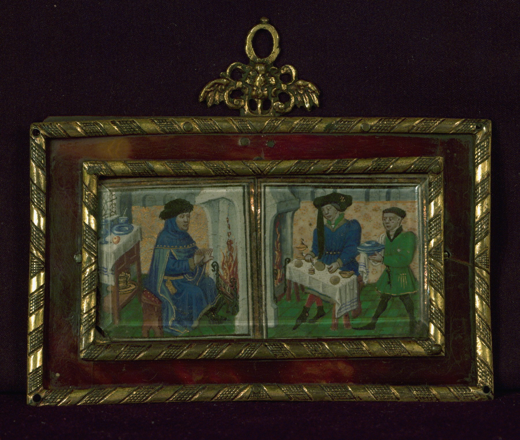 These two illuminations were cut out of a deluxe Book of Hours that was originally created ca. 1450-60. It is likely that they are by an artist based in Bruges, as they are stylistically related to works from that region in that period (see, for example, W.240). They have been compared to the miniatures in the Hours of Juana EnrĂquez (Madrid, Biblioteca de Palacio, unnumbered), as well as to the work of the Master of Girart de Roussillon, active in Brussels ca. 1450-70. The images came from the January and February calendars, although they were framed in the reverse order, with February on the left, and January on the right. A frame of tortoise shell and gilded copper was created for their display, likely in the seventeenth century, and the date of the frame may suggest when the images were removed from their original manuscript context.