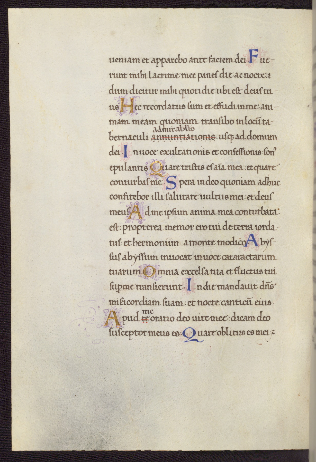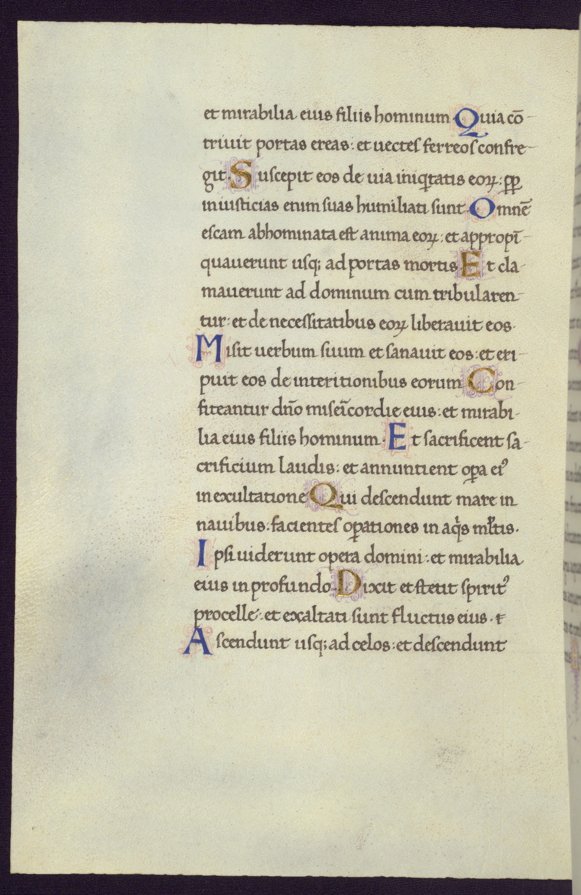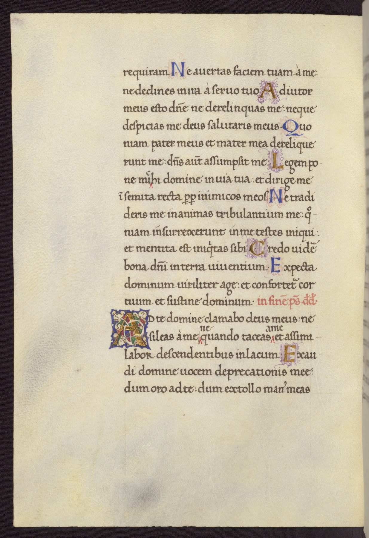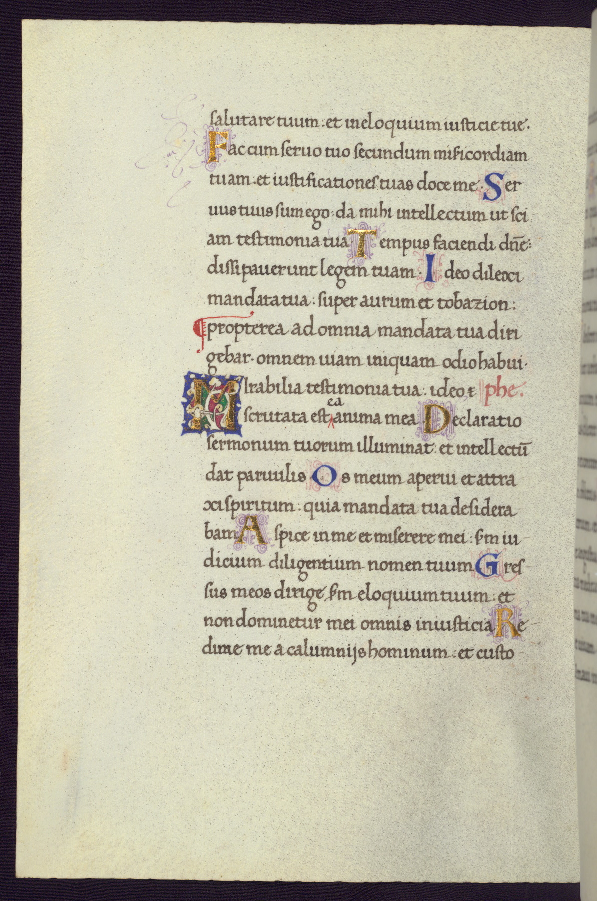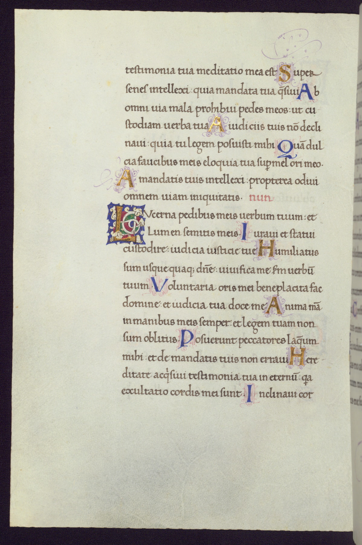 This Psalter was created in Southern Italy, likely Naples, in the last quarter of the fifteenth century. The litany (fols. 158v - 161r) suggests it was for Cistercian use. It contains six high-quality miniatures attributed to the Neopolitan illuminator Cristoforo Magorana (though the historiated initial of David playing a psaltry on fol. 15r may have been done by another hand), who from 1480-1492 worked at the court of Ferdinand I of Aragon. To date, almost forty manuscripts have been attributed to the artist. The Walters manuscript contains two full-page miniatures, one showing the Tree of Jesse and the other the Man of Sorrows. The Tree of Jesse (described in Isaiah 1:11) shows the ancestry of Christ rising from Jesse of Bethlehem, the father of King David who is depicted on the facing folio (171r). In this depiction Jesse is shown on the trunk of the tree, but it actually rises from Abraham. Surrounding Abraham is a crowd of Prophets each with scrolls with verses believed to prophecy the coming of Christ. The miniature with the Man of Sorrows shows Christ standing in his tomb and surrounded by the objects associated with the Passion (arma Christi). The miniature follows a specific Man of Sorrows iconography that originated in an early-fourteenth century mosaic icon from Constantinople that most likely arrived in Italy ca. 1380. The mosaic panel was believed to be an authentic representation of St. Gregory's vision of Christ as the Man of Sorrows, and this type of image encouraged the viewer to meditate on the suffering of Christ while reading the Passion narratives that follow. The humanist script and white-vine initials place the Walters Psalter firmly within the Humanist tradition of the late fifteenth century. Remnants of black velvet suggest this book once had a chemise binding, comparable to W.294 and W.480. Peter Kidd has suggested that the manuscript may have been written by Pietro Ursuleo of Capua (d. 1483).