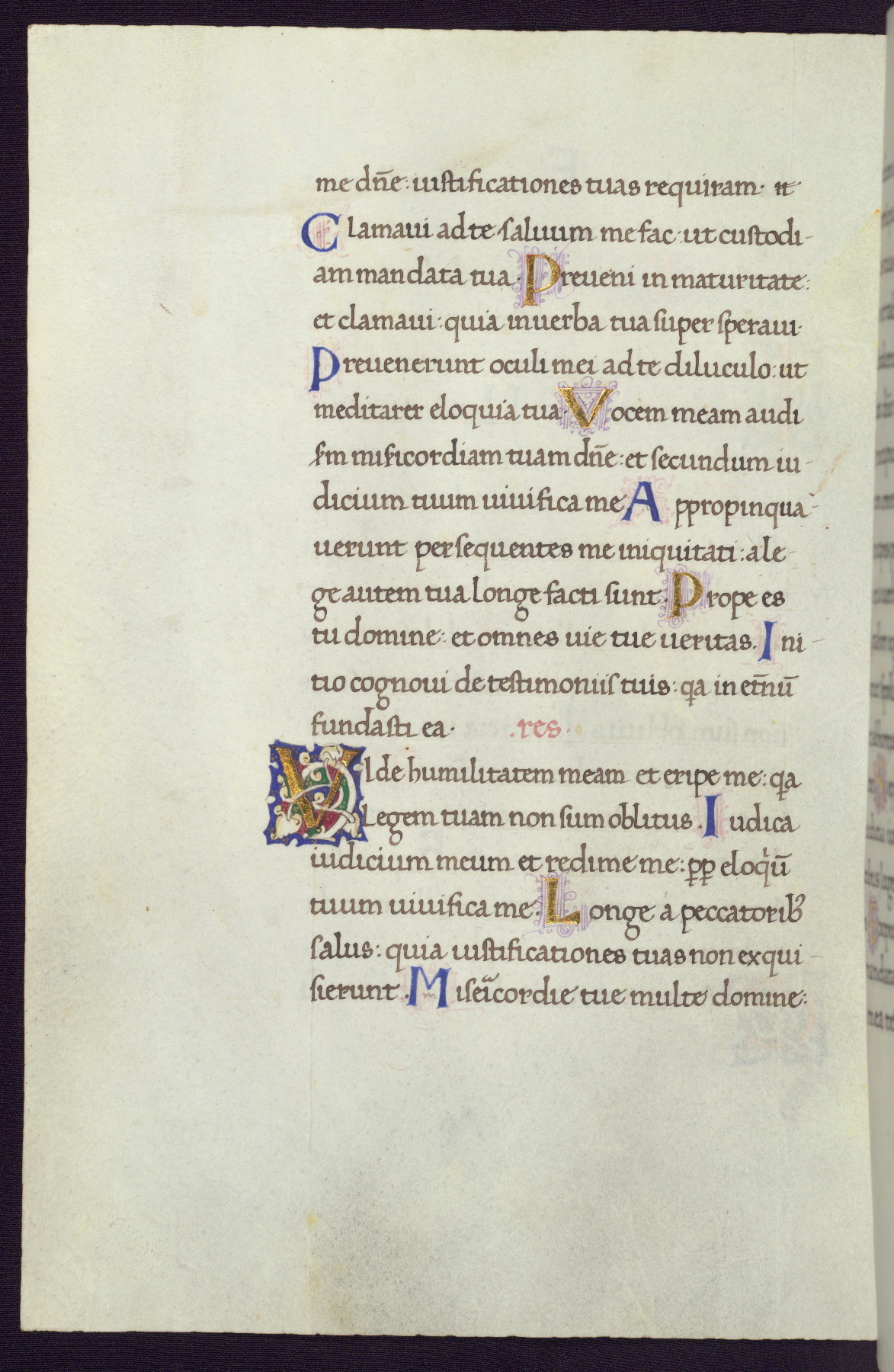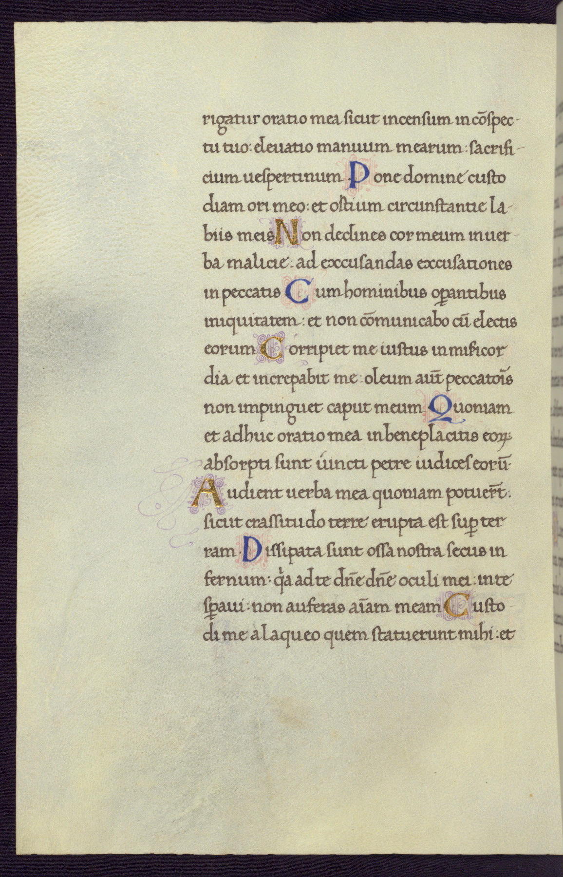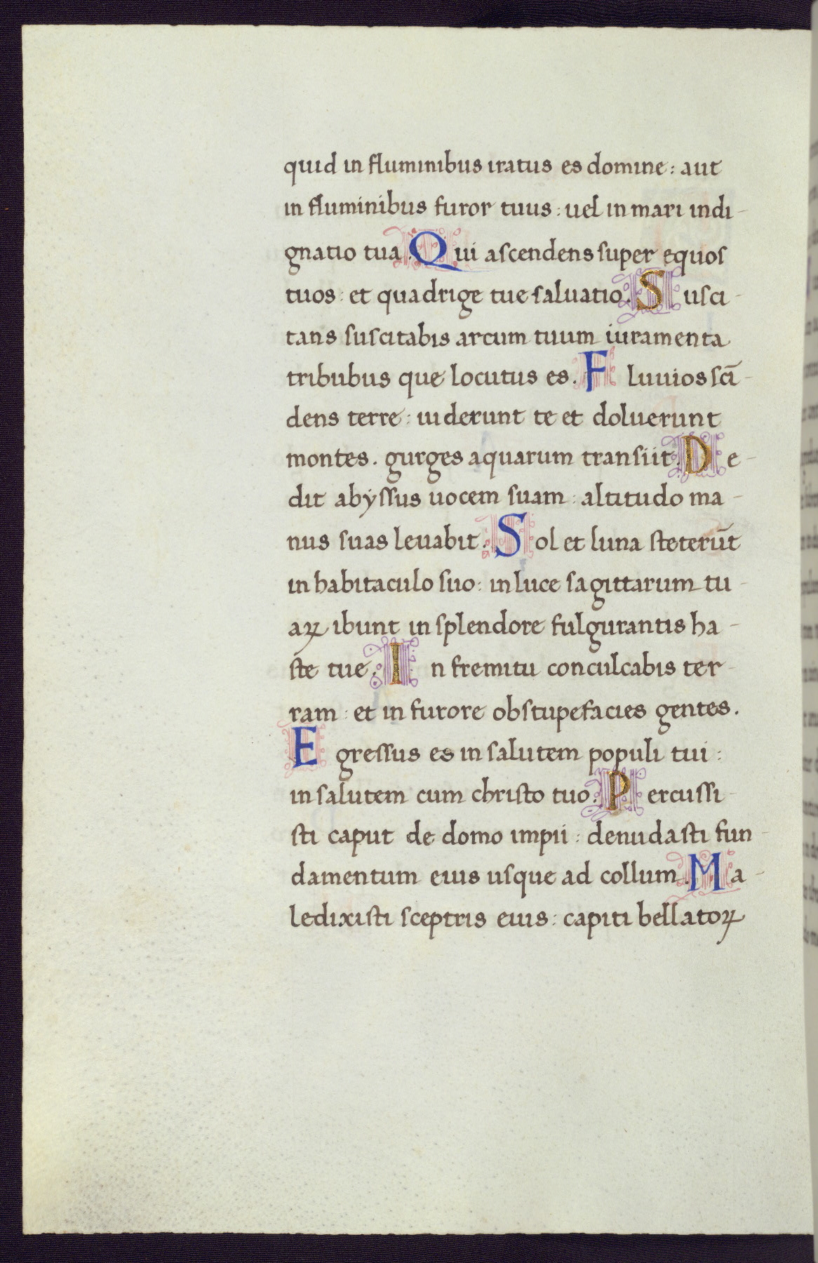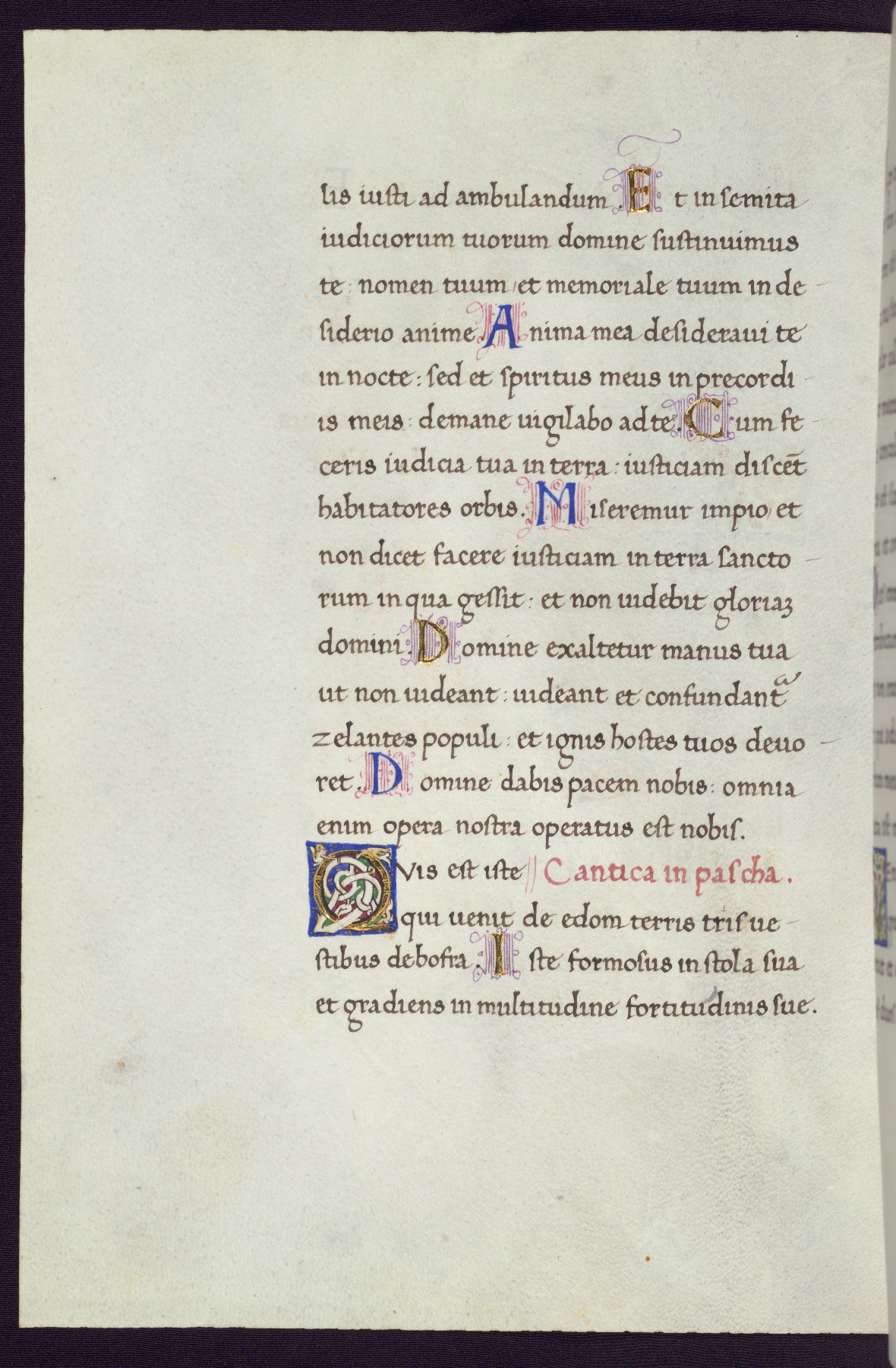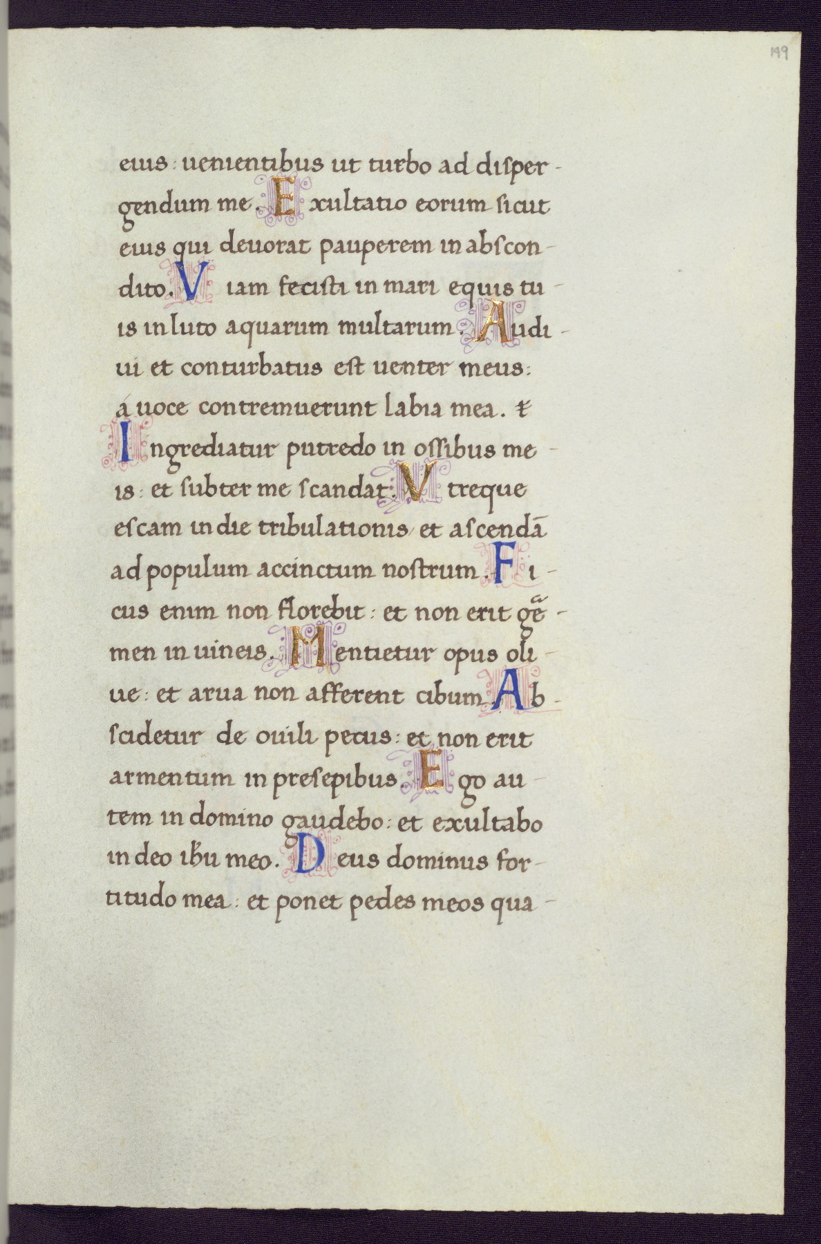 This Psalter was created in Southern Italy, likely Naples, in the last quarter of the fifteenth century. The litany (fols. 158v - 161r) suggests it was for Cistercian use. It contains six high-quality miniatures attributed to the Neopolitan illuminator Cristoforo Magorana (though the historiated initial of David playing a psaltry on fol. 15r may have been done by another hand), who from 1480-1492 worked at the court of Ferdinand I of Aragon. To date, almost forty manuscripts have been attributed to the artist. The Walters manuscript contains two full-page miniatures, one showing the Tree of Jesse and the other the Man of Sorrows. The Tree of Jesse (described in Isaiah 1:11) shows the ancestry of Christ rising from Jesse of Bethlehem, the father of King David who is depicted on the facing folio (171r). In this depiction Jesse is shown on the trunk of the tree, but it actually rises from Abraham. Surrounding Abraham is a crowd of Prophets each with scrolls with verses believed to prophecy the coming of Christ. The miniature with the Man of Sorrows shows Christ standing in his tomb and surrounded by the objects associated with the Passion (arma Christi). The miniature follows a specific Man of Sorrows iconography that originated in an early-fourteenth century mosaic icon from Constantinople that most likely arrived in Italy ca. 1380. The mosaic panel was believed to be an authentic representation of St. Gregory's vision of Christ as the Man of Sorrows, and this type of image encouraged the viewer to meditate on the suffering of Christ while reading the Passion narratives that follow. The humanist script and white-vine initials place the Walters Psalter firmly within the Humanist tradition of the late fifteenth century. Remnants of black velvet suggest this book once had a chemise binding, comparable to W.294 and W.480. Peter Kidd has suggested that the manuscript may have been written by Pietro Ursuleo of Capua (d. 1483).