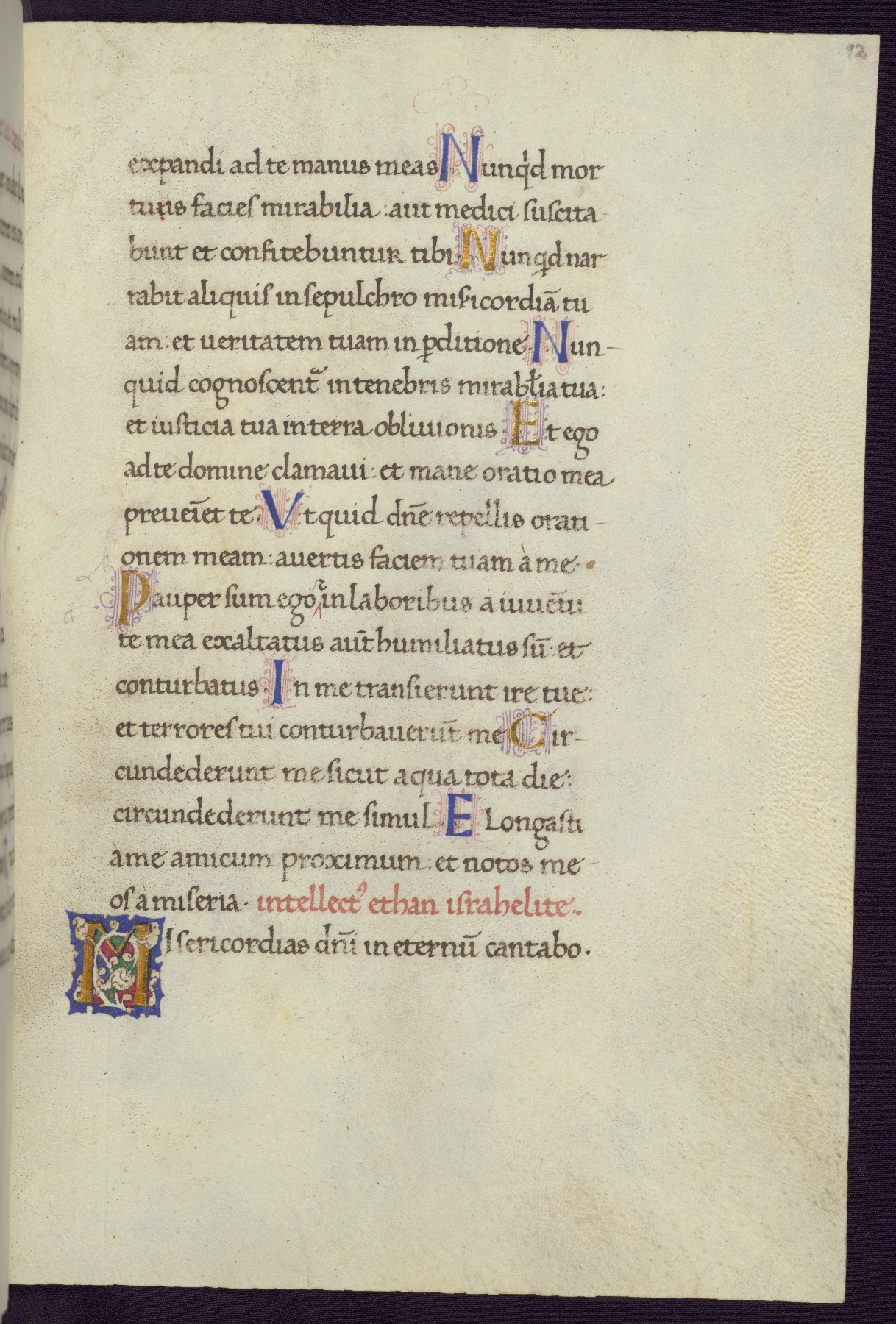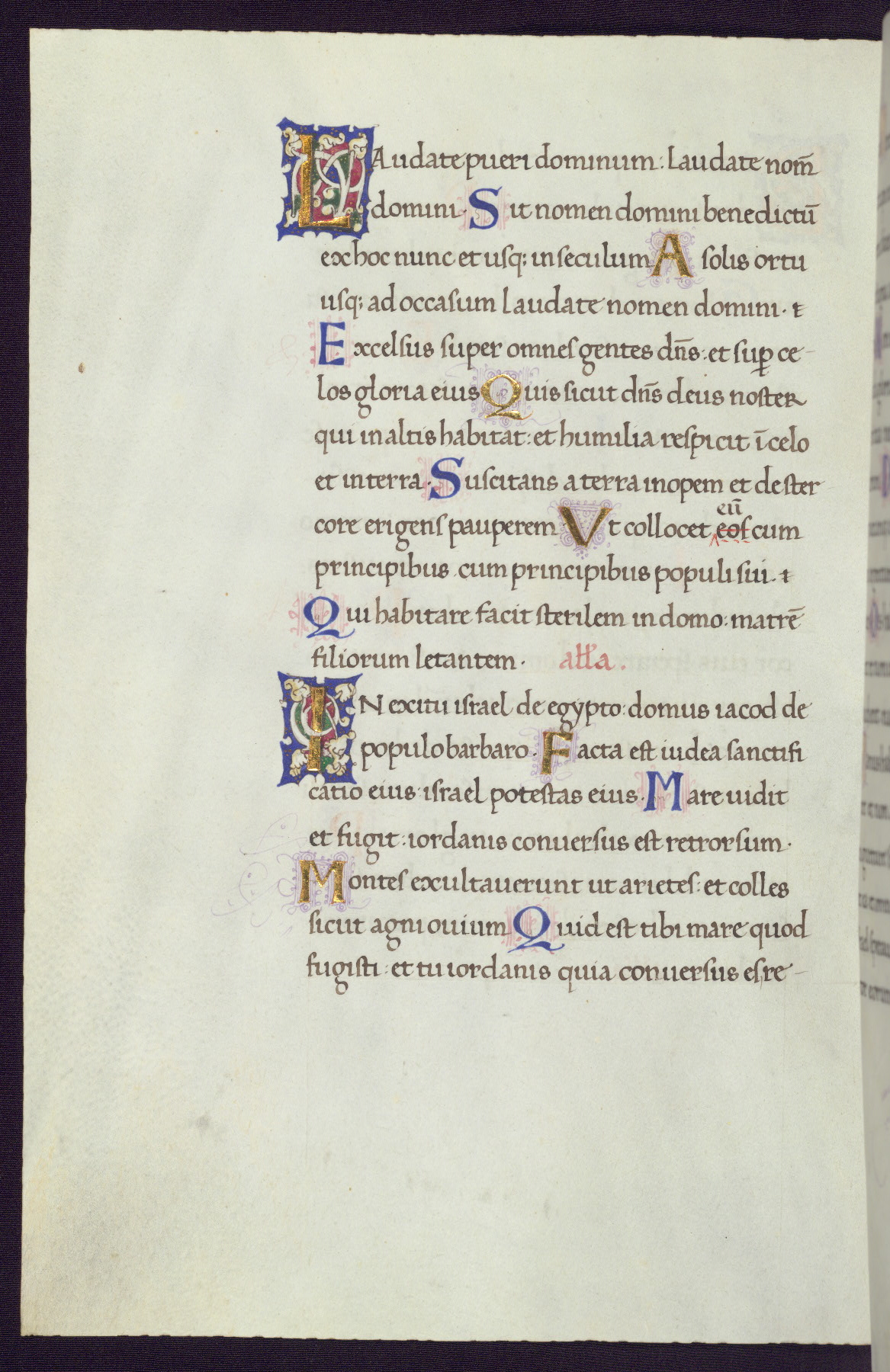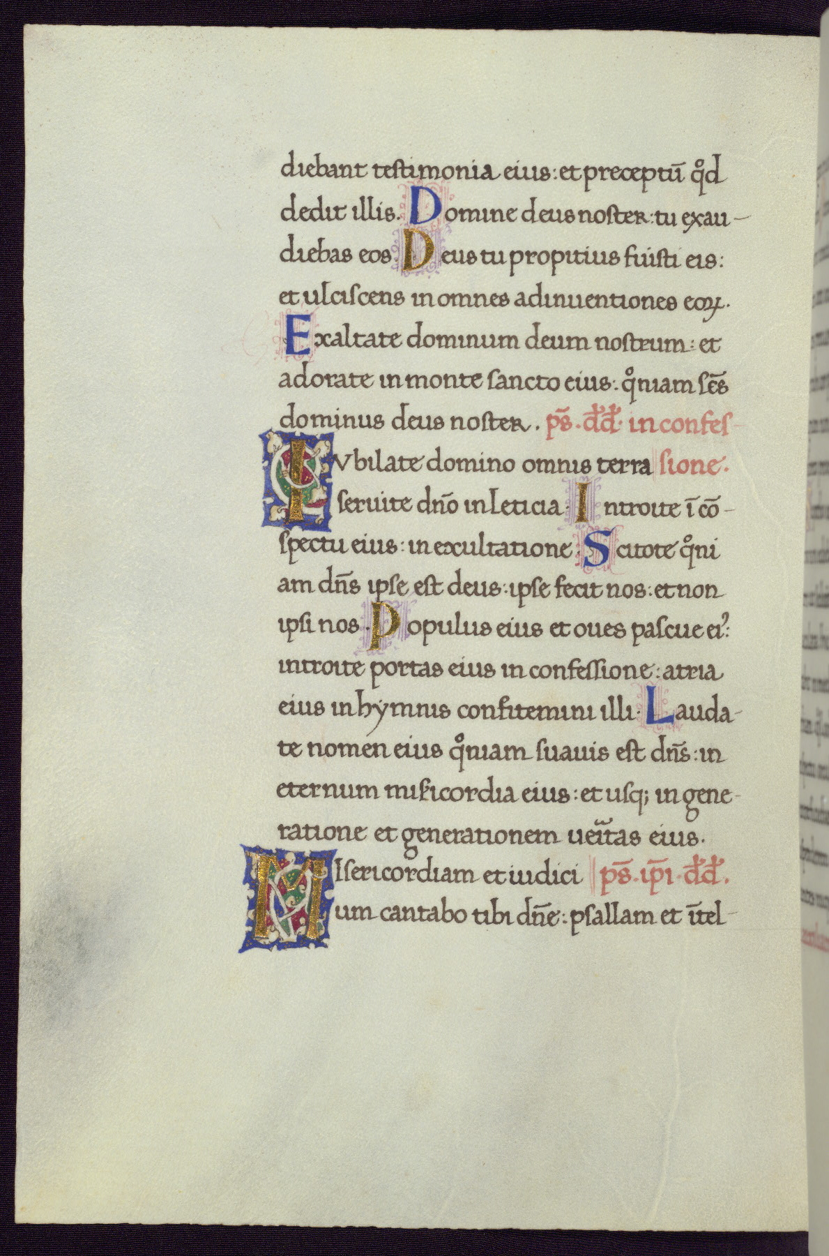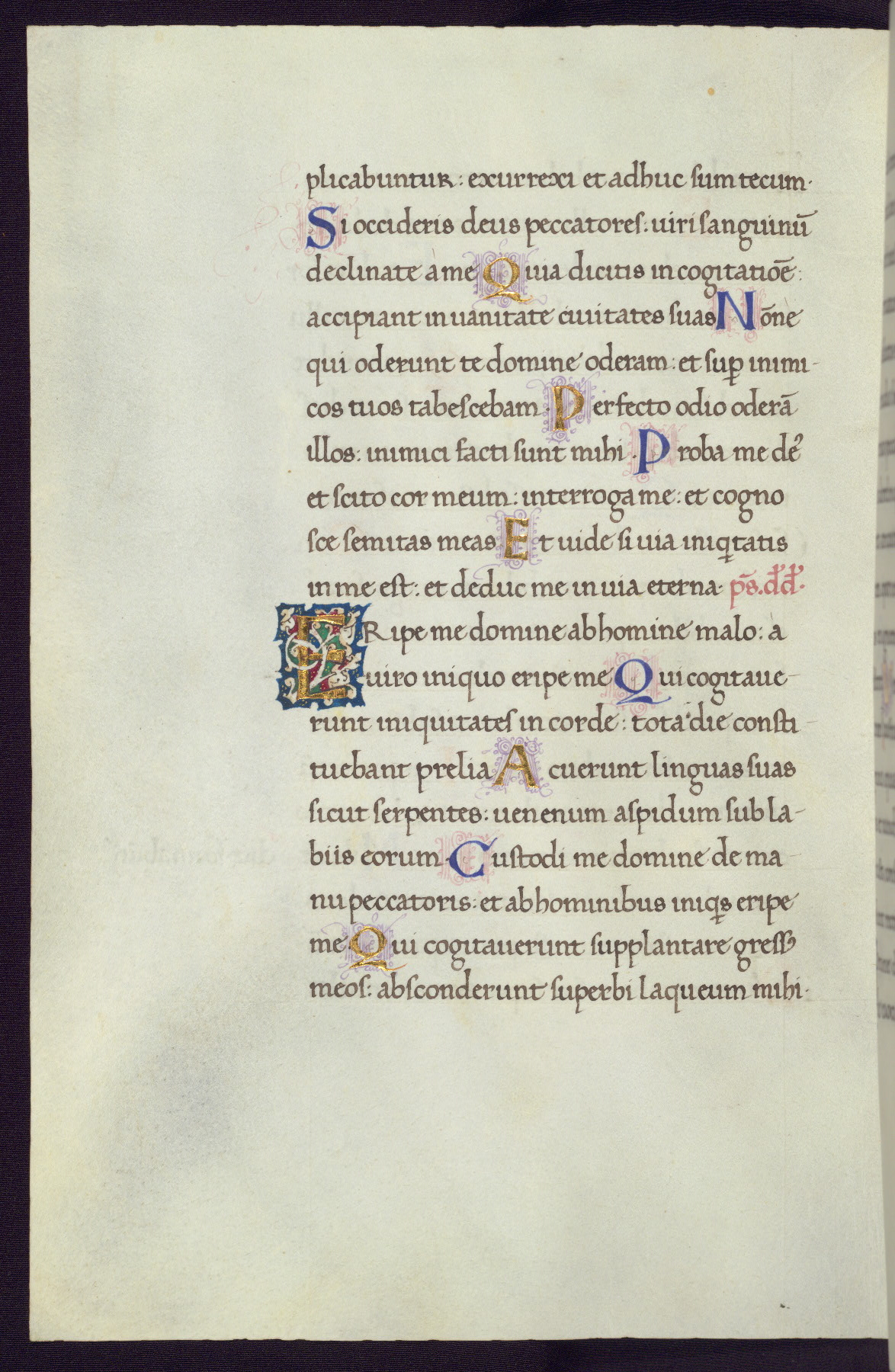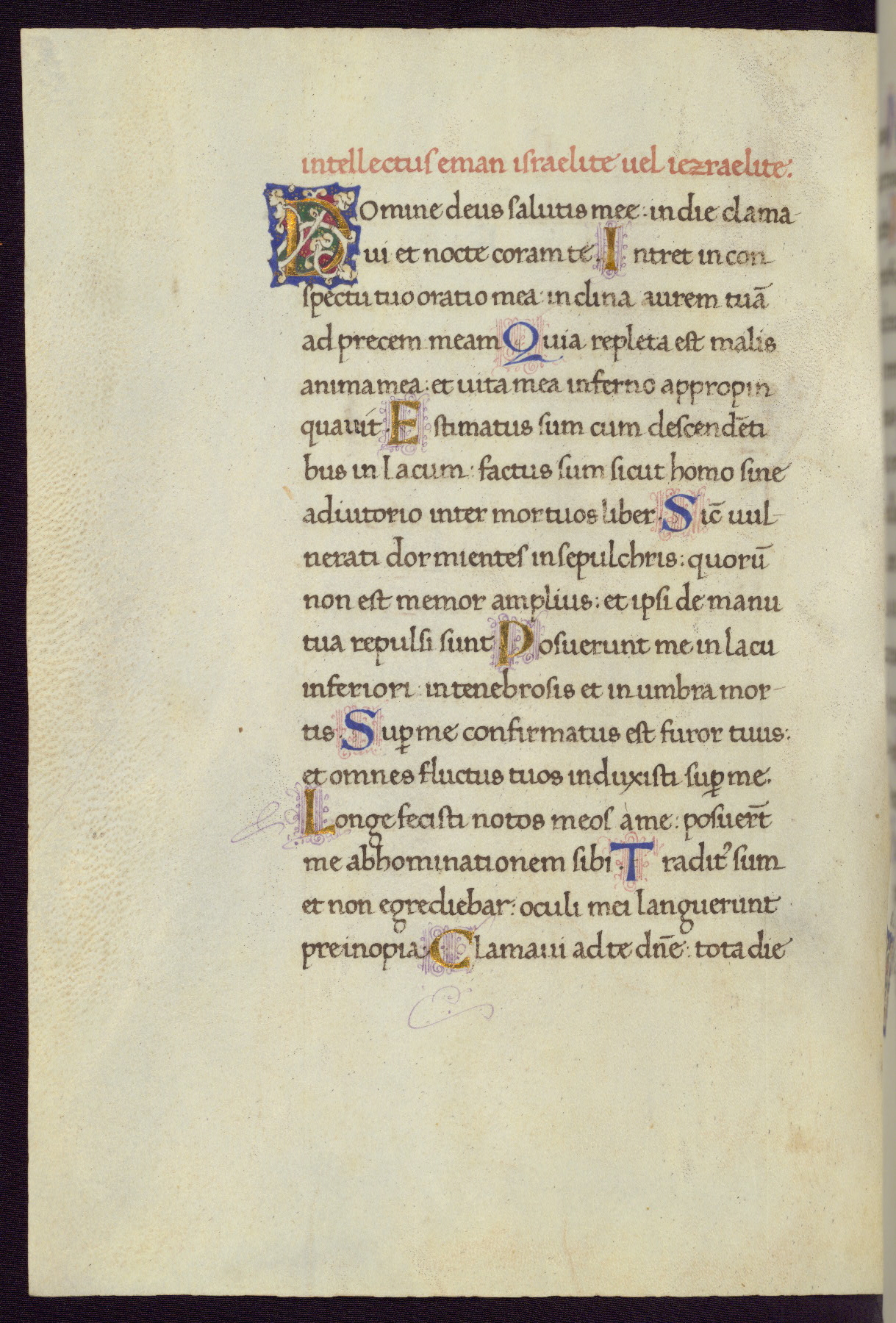 This Psalter was created in Southern Italy, likely Naples, in the last quarter of the fifteenth century. The litany (fols. 158v - 161r) suggests it was for Cistercian use. It contains six high-quality miniatures attributed to the Neopolitan illuminator Cristoforo Magorana (though the historiated initial of David playing a psaltry on fol. 15r may have been done by another hand), who from 1480-1492 worked at the court of Ferdinand I of Aragon. To date, almost forty manuscripts have been attributed to the artist. The Walters manuscript contains two full-page miniatures, one showing the Tree of Jesse and the other the Man of Sorrows. The Tree of Jesse (described in Isaiah 1:11) shows the ancestry of Christ rising from Jesse of Bethlehem, the father of King David who is depicted on the facing folio (171r). In this depiction Jesse is shown on the trunk of the tree, but it actually rises from Abraham. Surrounding Abraham is a crowd of Prophets each with scrolls with verses believed to prophecy the coming of Christ. The miniature with the Man of Sorrows shows Christ standing in his tomb and surrounded by the objects associated with the Passion (arma Christi). The miniature follows a specific Man of Sorrows iconography that originated in an early-fourteenth century mosaic icon from Constantinople that most likely arrived in Italy ca. 1380. The mosaic panel was believed to be an authentic representation of St. Gregory's vision of Christ as the Man of Sorrows, and this type of image encouraged the viewer to meditate on the suffering of Christ while reading the Passion narratives that follow. The humanist script and white-vine initials place the Walters Psalter firmly within the Humanist tradition of the late fifteenth century. Remnants of black velvet suggest this book once had a chemise binding, comparable to W.294 and W.480. Peter Kidd has suggested that the manuscript may have been written by Pietro Ursuleo of Capua (d. 1483).