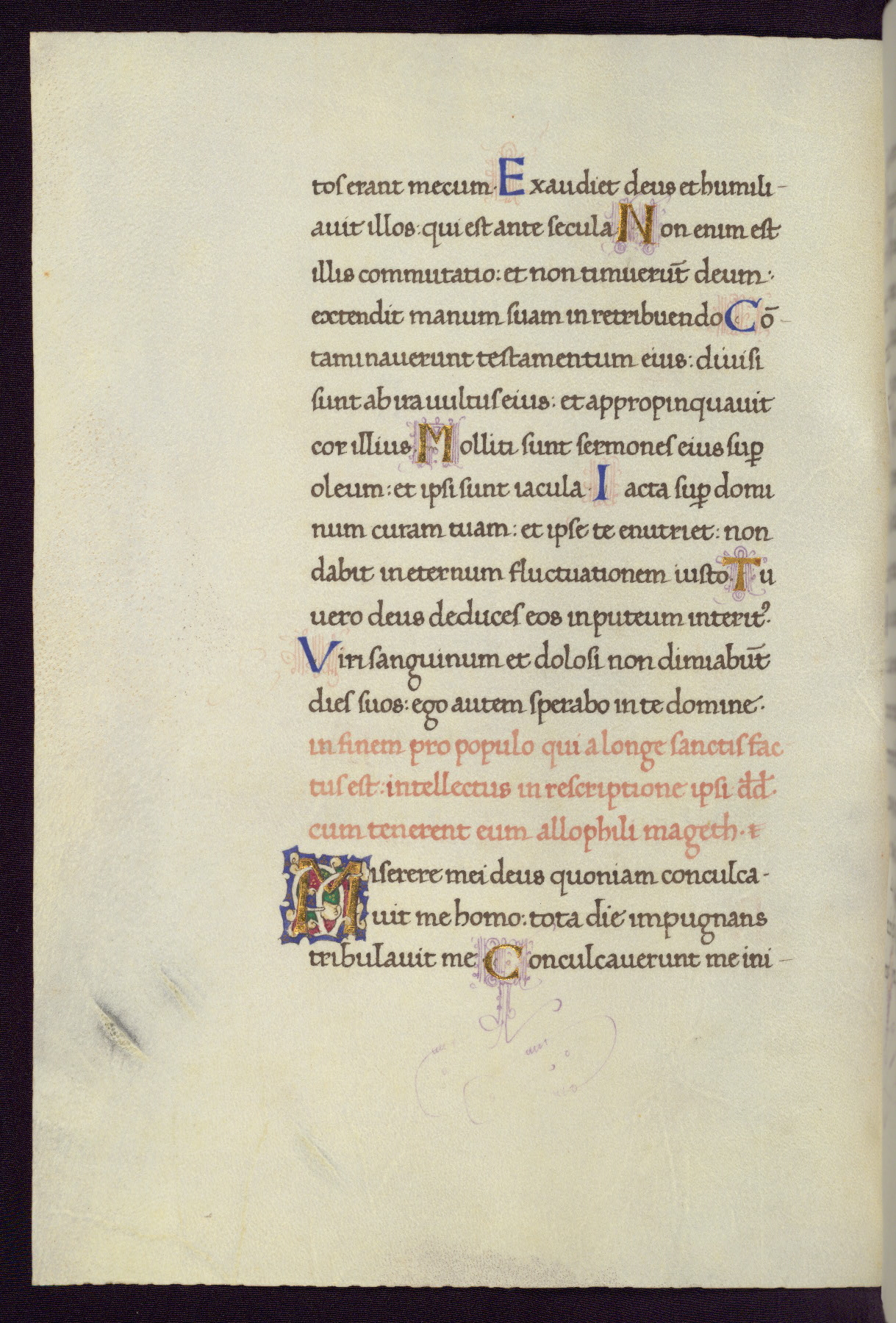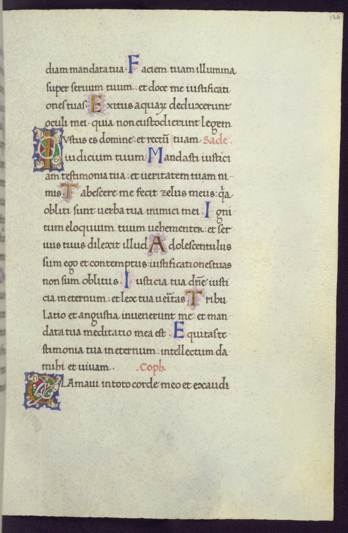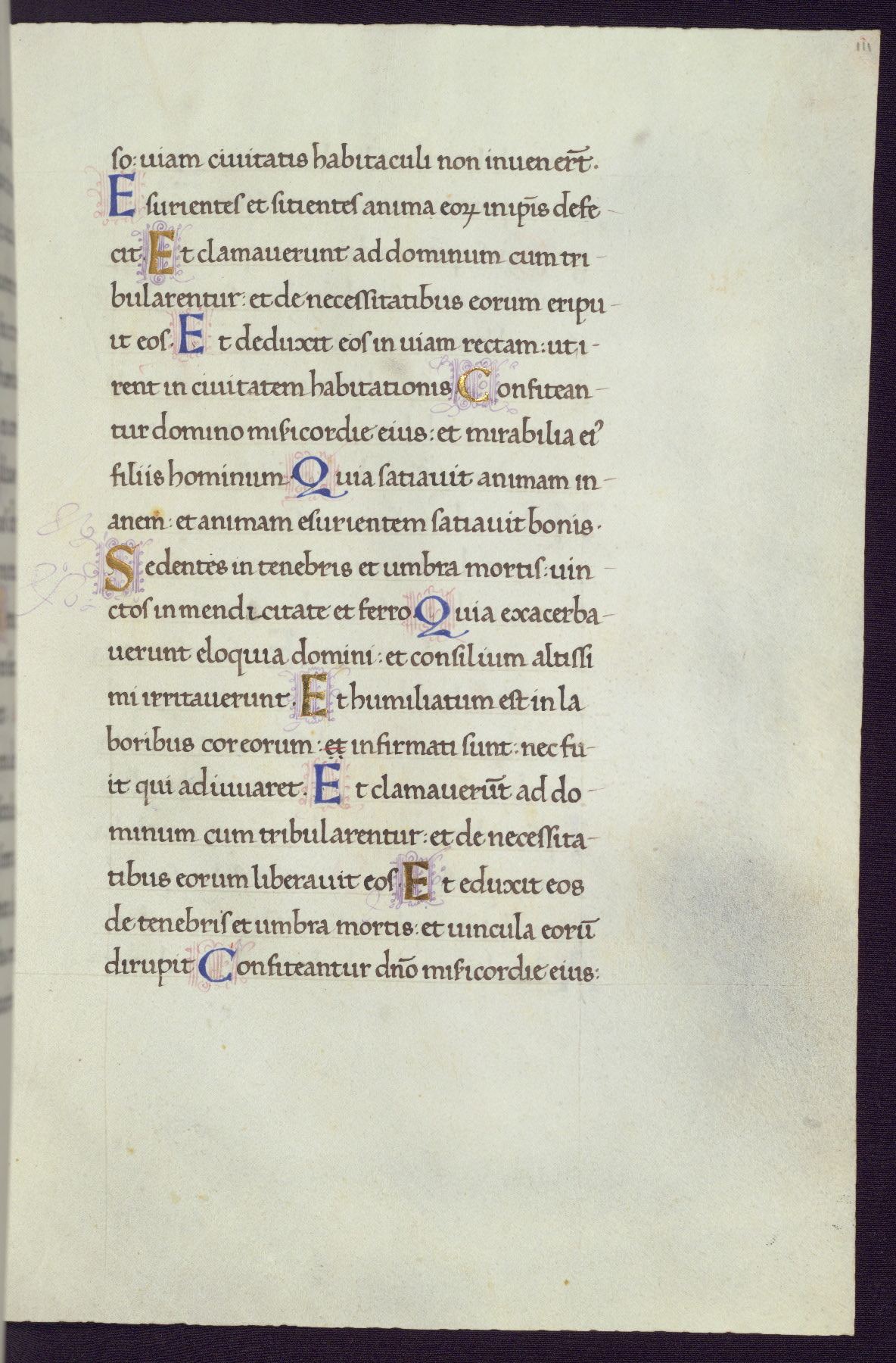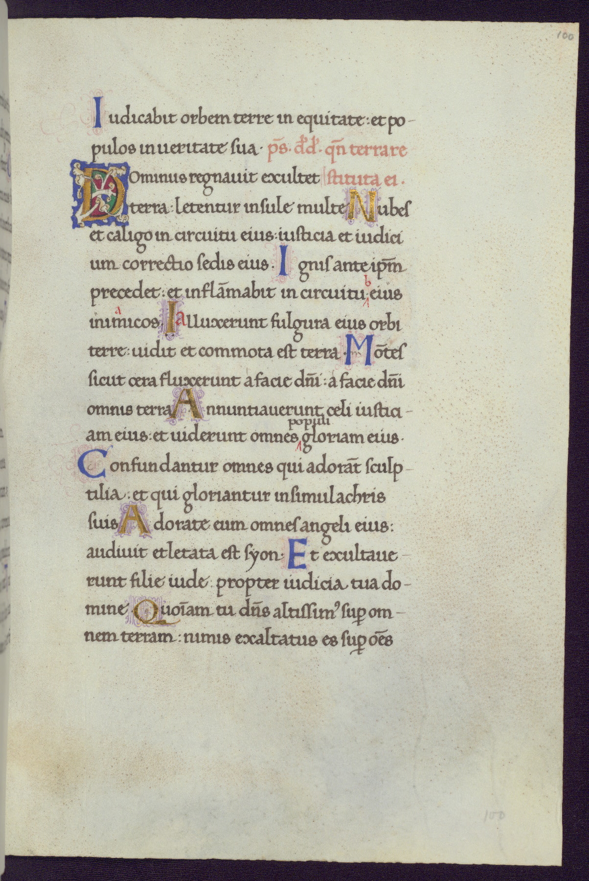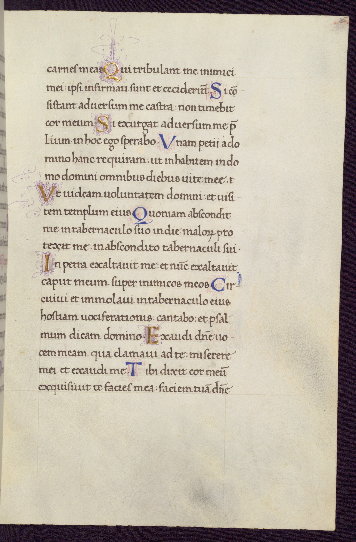 This Psalter was created in Southern Italy, likely Naples, in the last quarter of the fifteenth century. The litany (fols. 158v - 161r) suggests it was for Cistercian use. It contains six high-quality miniatures attributed to the Neopolitan illuminator Cristoforo Magorana (though the historiated initial of David playing a psaltry on fol. 15r may have been done by another hand), who from 1480-1492 worked at the court of Ferdinand I of Aragon. To date, almost forty manuscripts have been attributed to the artist. The Walters manuscript contains two full-page miniatures, one showing the Tree of Jesse and the other the Man of Sorrows. The Tree of Jesse (described in Isaiah 1:11) shows the ancestry of Christ rising from Jesse of Bethlehem, the father of King David who is depicted on the facing folio (171r). In this depiction Jesse is shown on the trunk of the tree, but it actually rises from Abraham. Surrounding Abraham is a crowd of Prophets each with scrolls with verses believed to prophecy the coming of Christ. The miniature with the Man of Sorrows shows Christ standing in his tomb and surrounded by the objects associated with the Passion (arma Christi). The miniature follows a specific Man of Sorrows iconography that originated in an early-fourteenth century mosaic icon from Constantinople that most likely arrived in Italy ca. 1380. The mosaic panel was believed to be an authentic representation of St. Gregory's vision of Christ as the Man of Sorrows, and this type of image encouraged the viewer to meditate on the suffering of Christ while reading the Passion narratives that follow. The humanist script and white-vine initials place the Walters Psalter firmly within the Humanist tradition of the late fifteenth century. Remnants of black velvet suggest this book once had a chemise binding, comparable to W.294 and W.480. Peter Kidd has suggested that the manuscript may have been written by Pietro Ursuleo of Capua (d. 1483).