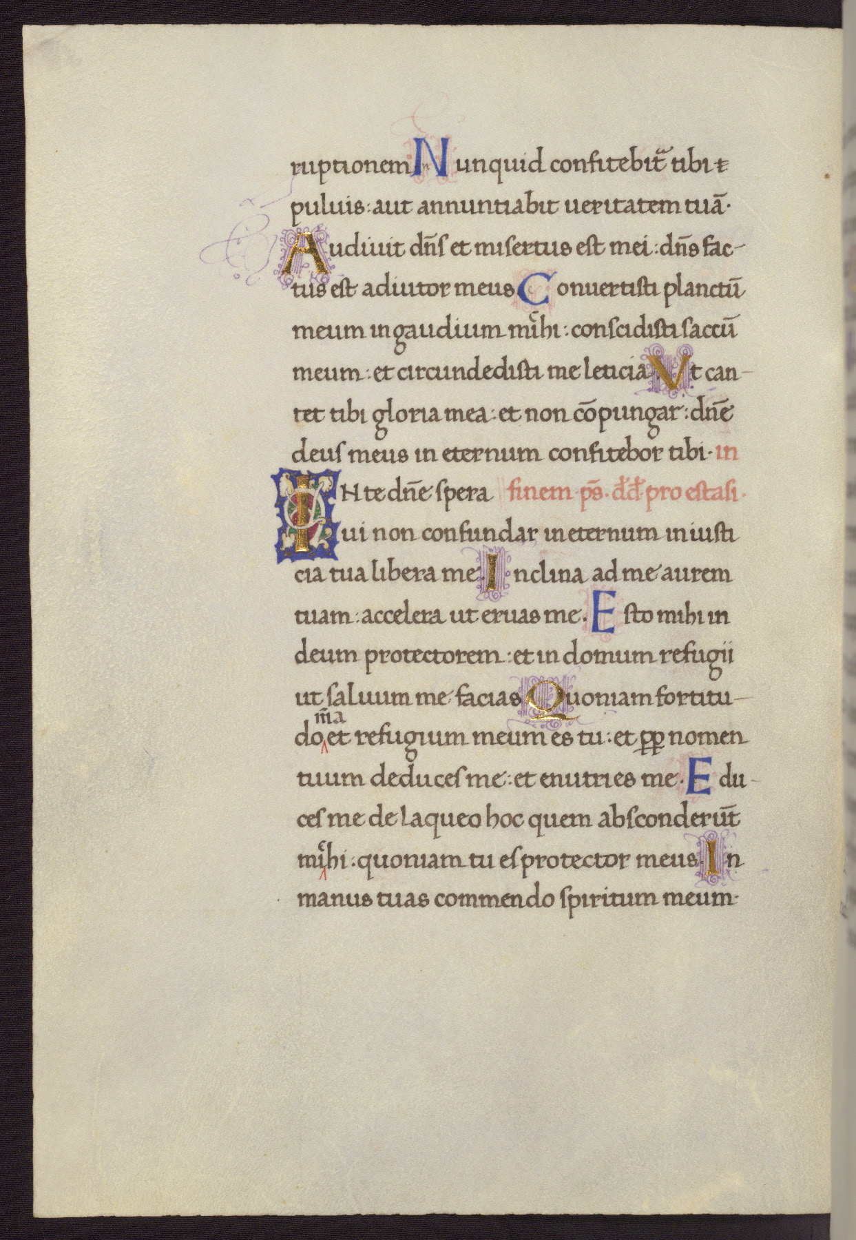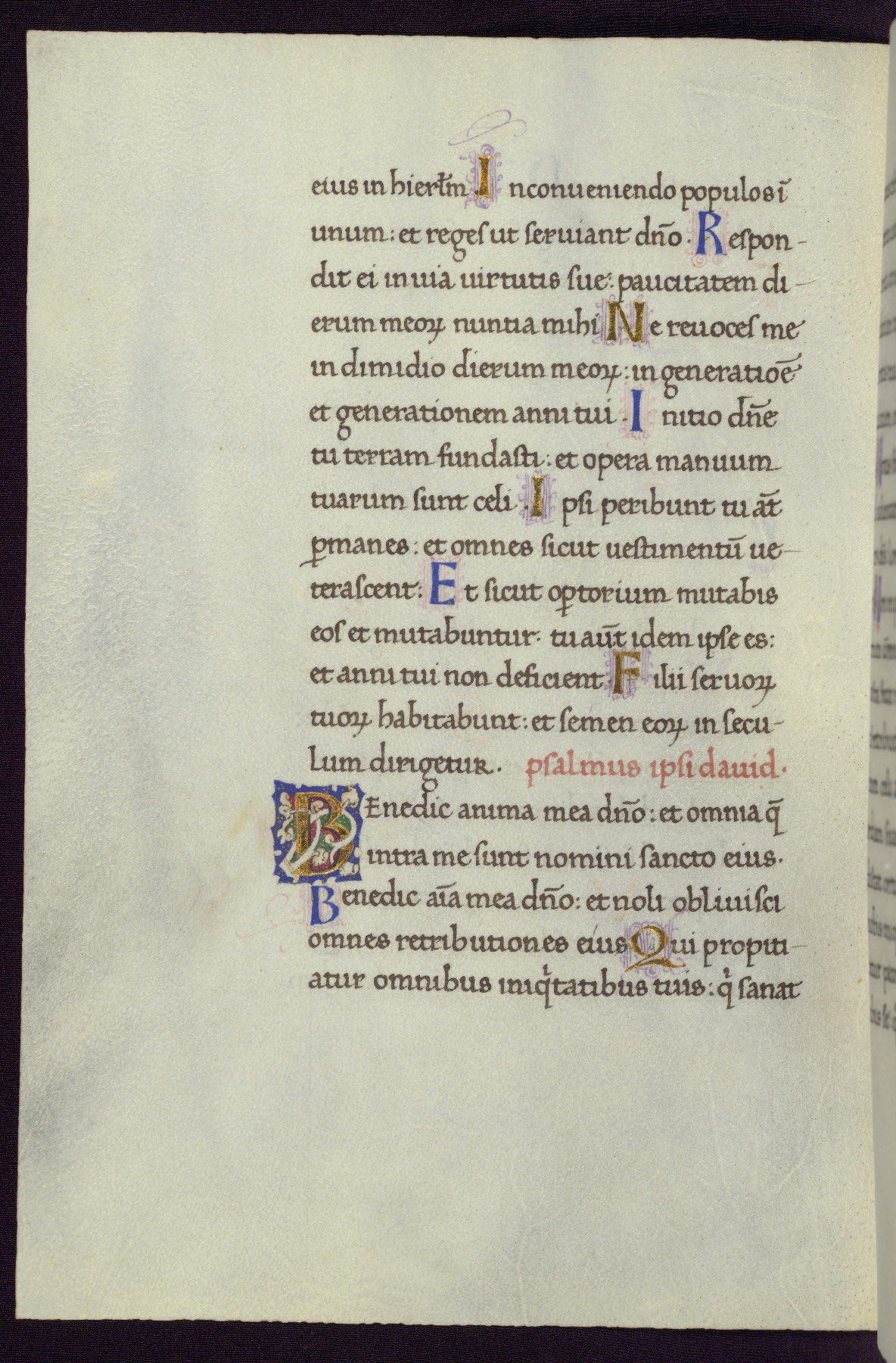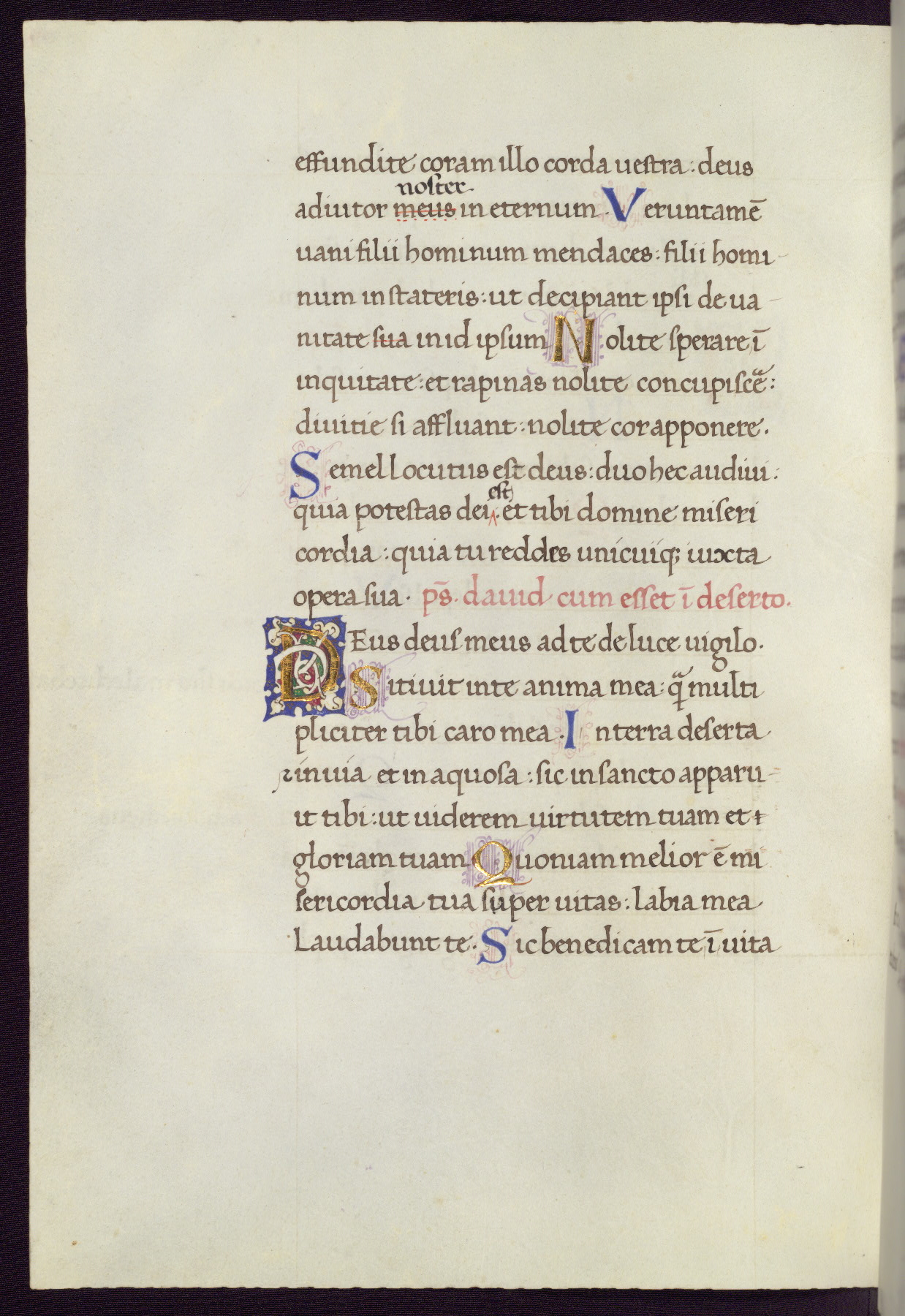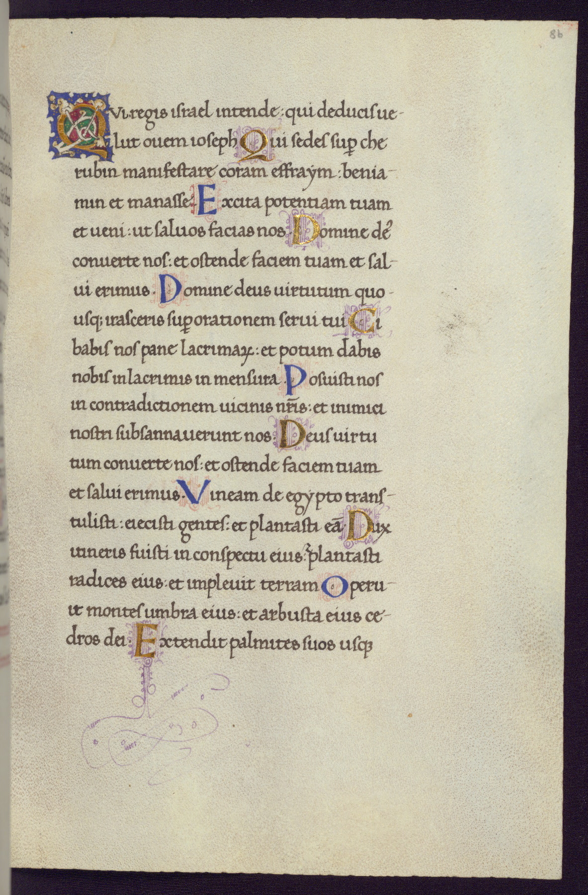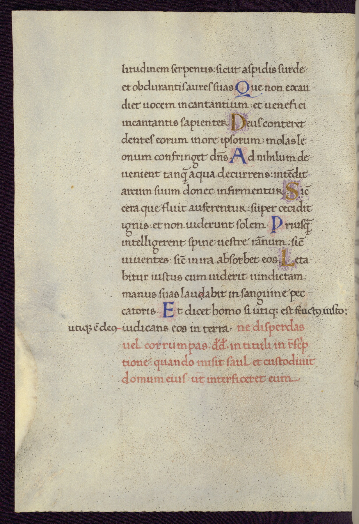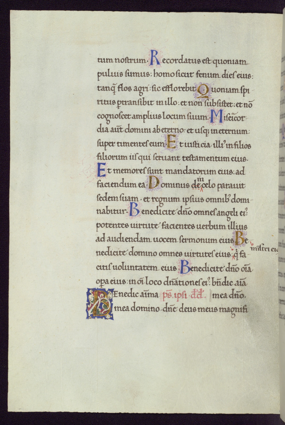 This Psalter was created in Southern Italy, likely Naples, in the last quarter of the fifteenth century. The litany (fols. 158v - 161r) suggests it was for Cistercian use. It contains six high-quality miniatures attributed to the Neopolitan illuminator Cristoforo Magorana (though the historiated initial of David playing a psaltry on fol. 15r may have been done by another hand), who from 1480-1492 worked at the court of Ferdinand I of Aragon. To date, almost forty manuscripts have been attributed to the artist. The Walters manuscript contains two full-page miniatures, one showing the Tree of Jesse and the other the Man of Sorrows. The Tree of Jesse (described in Isaiah 1:11) shows the ancestry of Christ rising from Jesse of Bethlehem, the father of King David who is depicted on the facing folio (171r). In this depiction Jesse is shown on the trunk of the tree, but it actually rises from Abraham. Surrounding Abraham is a crowd of Prophets each with scrolls with verses believed to prophecy the coming of Christ. The miniature with the Man of Sorrows shows Christ standing in his tomb and surrounded by the objects associated with the Passion (arma Christi). The miniature follows a specific Man of Sorrows iconography that originated in an early-fourteenth century mosaic icon from Constantinople that most likely arrived in Italy ca. 1380. The mosaic panel was believed to be an authentic representation of St. Gregory's vision of Christ as the Man of Sorrows, and this type of image encouraged the viewer to meditate on the suffering of Christ while reading the Passion narratives that follow. The humanist script and white-vine initials place the Walters Psalter firmly within the Humanist tradition of the late fifteenth century. Remnants of black velvet suggest this book once had a chemise binding, comparable to W.294 and W.480. Peter Kidd has suggested that the manuscript may have been written by Pietro Ursuleo of Capua (d. 1483).