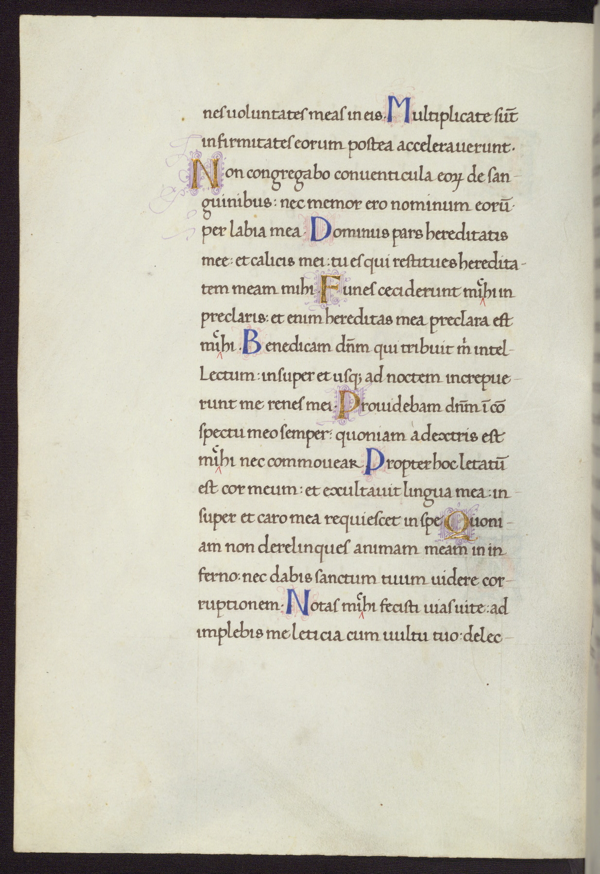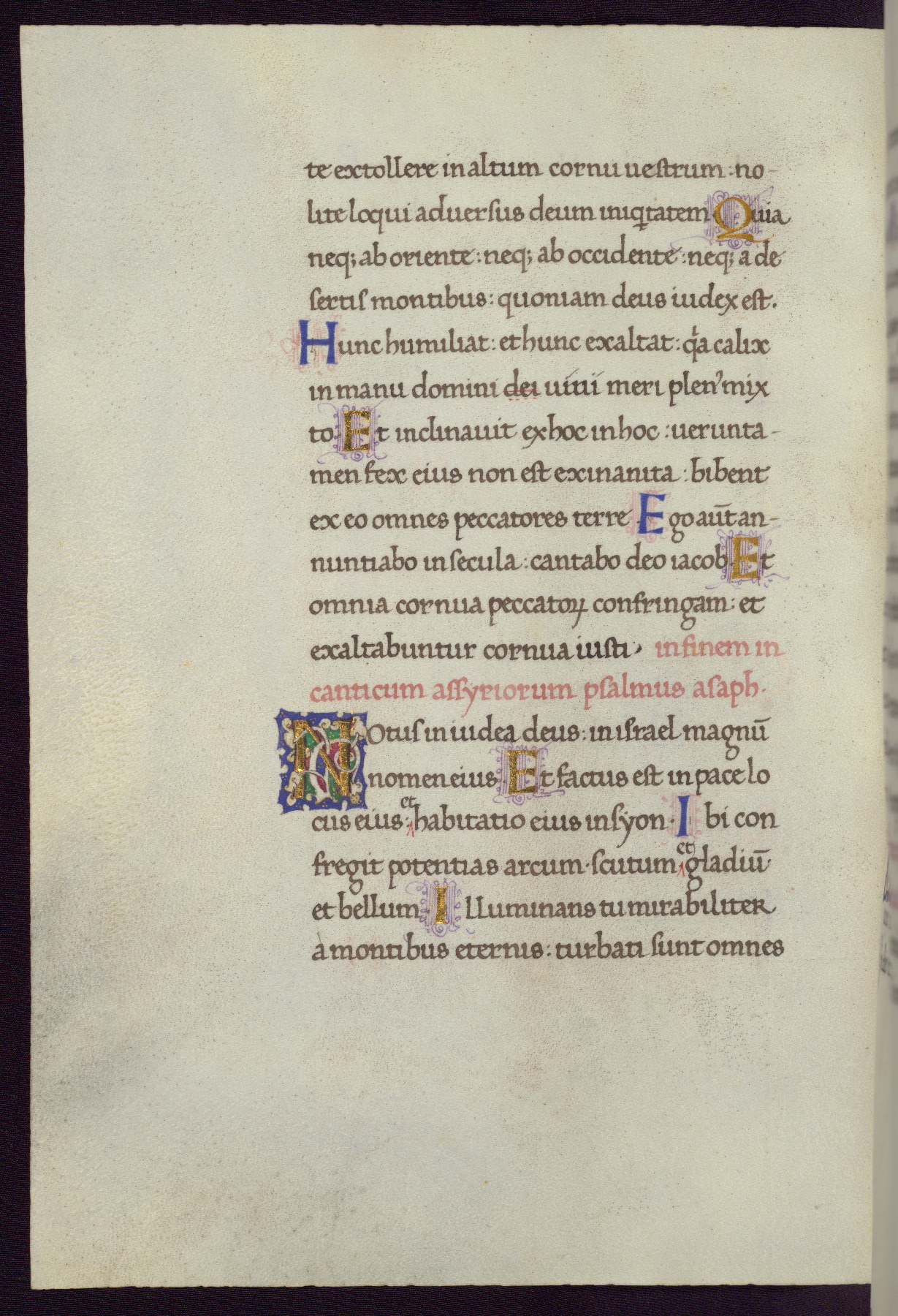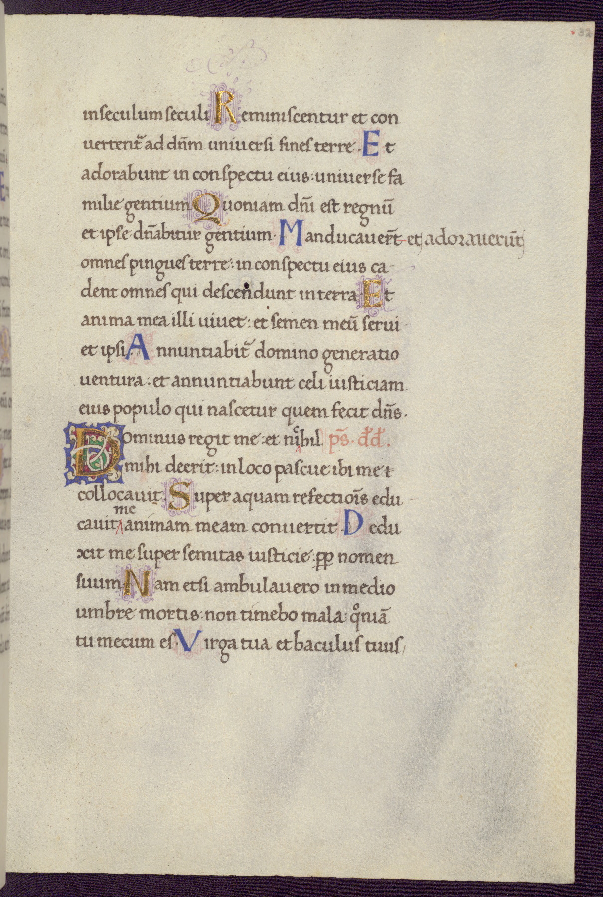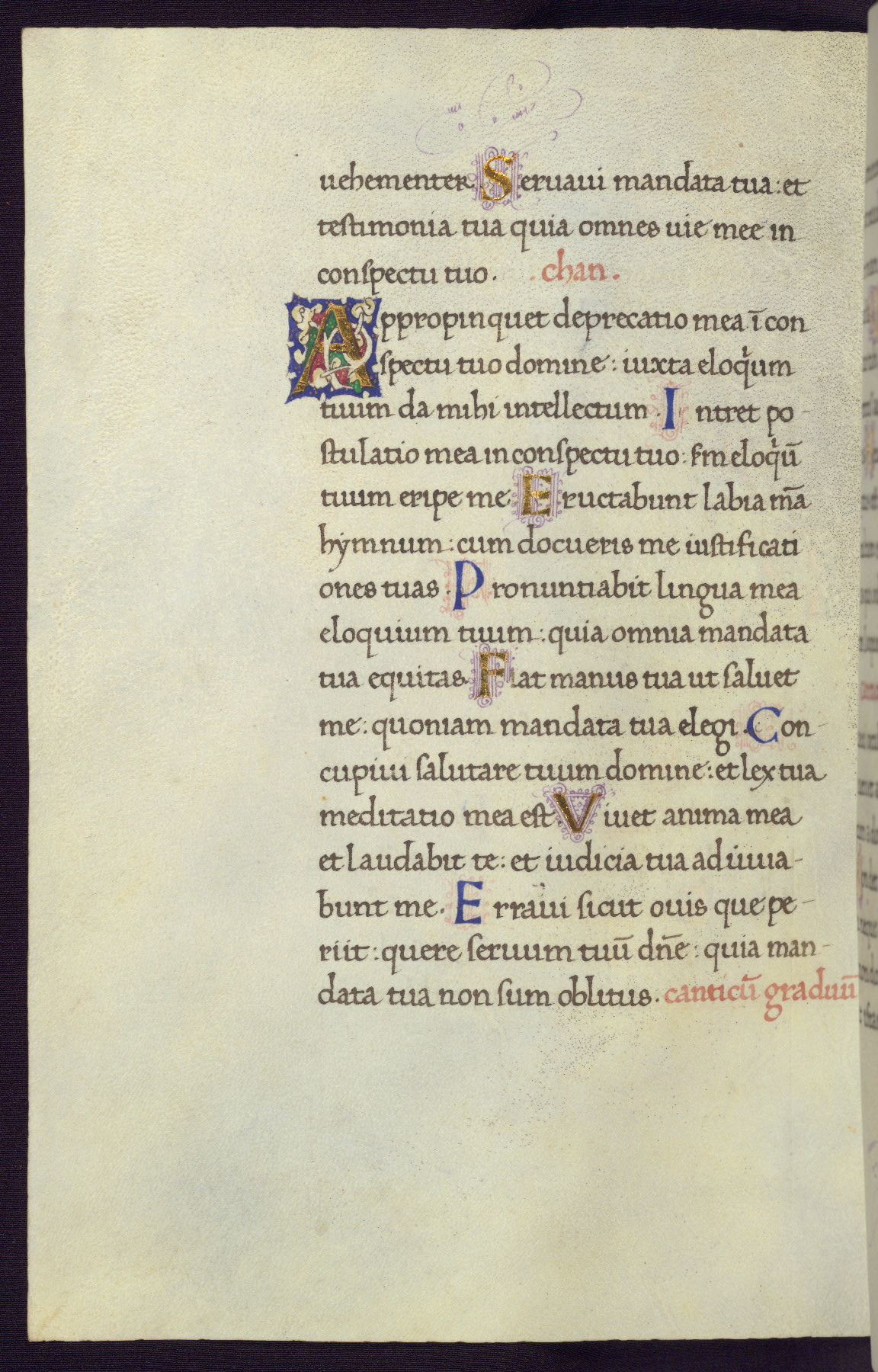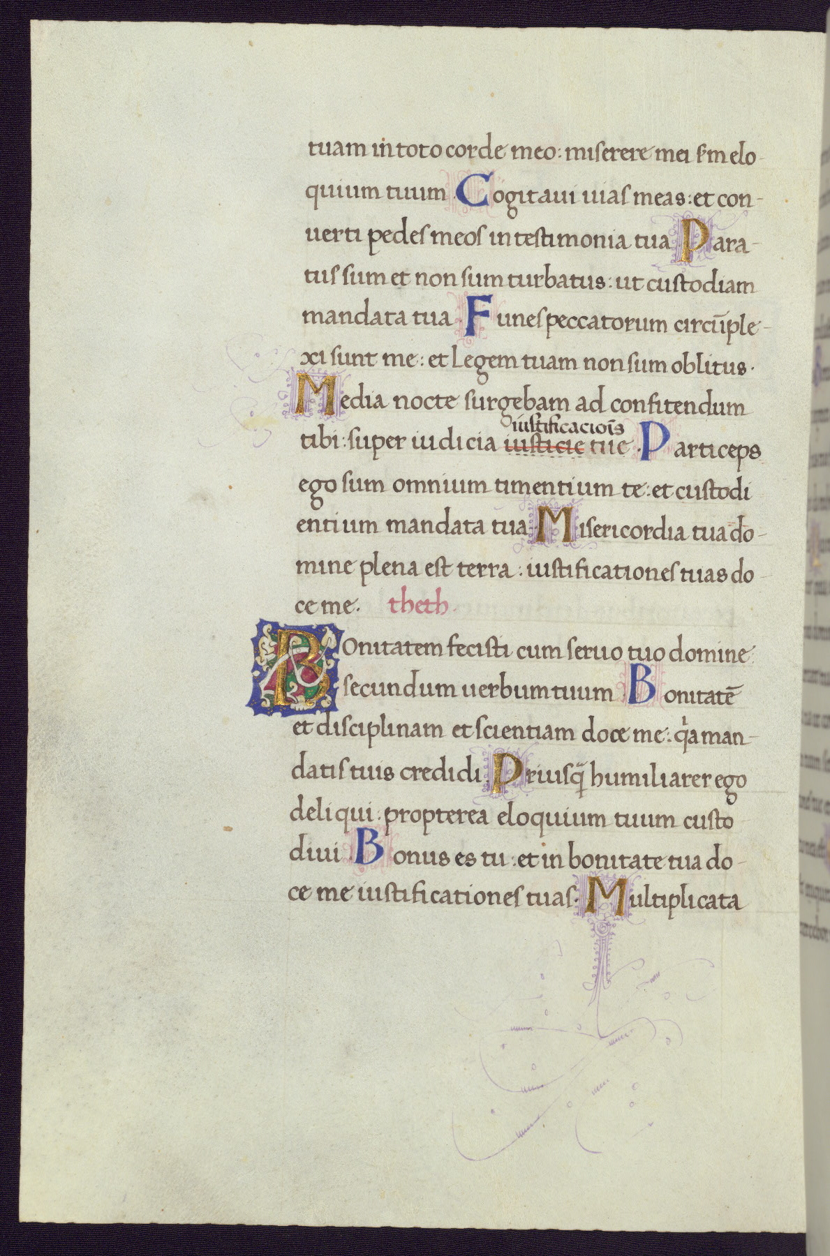 This Psalter was created in Southern Italy, likely Naples, in the last quarter of the fifteenth century. The litany (fols. 158v - 161r) suggests it was for Cistercian use. It contains six high-quality miniatures attributed to the Neopolitan illuminator Cristoforo Magorana (though the historiated initial of David playing a psaltry on fol. 15r may have been done by another hand), who from 1480-1492 worked at the court of Ferdinand I of Aragon. To date, almost forty manuscripts have been attributed to the artist. The Walters manuscript contains two full-page miniatures, one showing the Tree of Jesse and the other the Man of Sorrows. The Tree of Jesse (described in Isaiah 1:11) shows the ancestry of Christ rising from Jesse of Bethlehem, the father of King David who is depicted on the facing folio (171r). In this depiction Jesse is shown on the trunk of the tree, but it actually rises from Abraham. Surrounding Abraham is a crowd of Prophets each with scrolls with verses believed to prophecy the coming of Christ. The miniature with the Man of Sorrows shows Christ standing in his tomb and surrounded by the objects associated with the Passion (arma Christi). The miniature follows a specific Man of Sorrows iconography that originated in an early-fourteenth century mosaic icon from Constantinople that most likely arrived in Italy ca. 1380. The mosaic panel was believed to be an authentic representation of St. Gregory's vision of Christ as the Man of Sorrows, and this type of image encouraged the viewer to meditate on the suffering of Christ while reading the Passion narratives that follow. The humanist script and white-vine initials place the Walters Psalter firmly within the Humanist tradition of the late fifteenth century. Remnants of black velvet suggest this book once had a chemise binding, comparable to W.294 and W.480. Peter Kidd has suggested that the manuscript may have been written by Pietro Ursuleo of Capua (d. 1483).