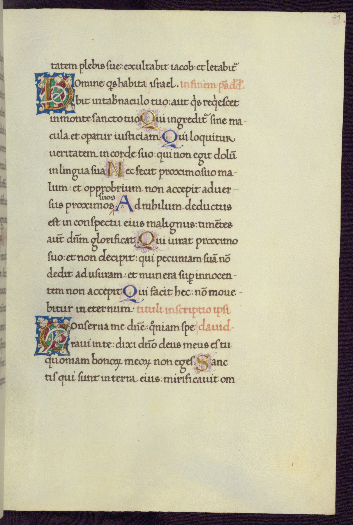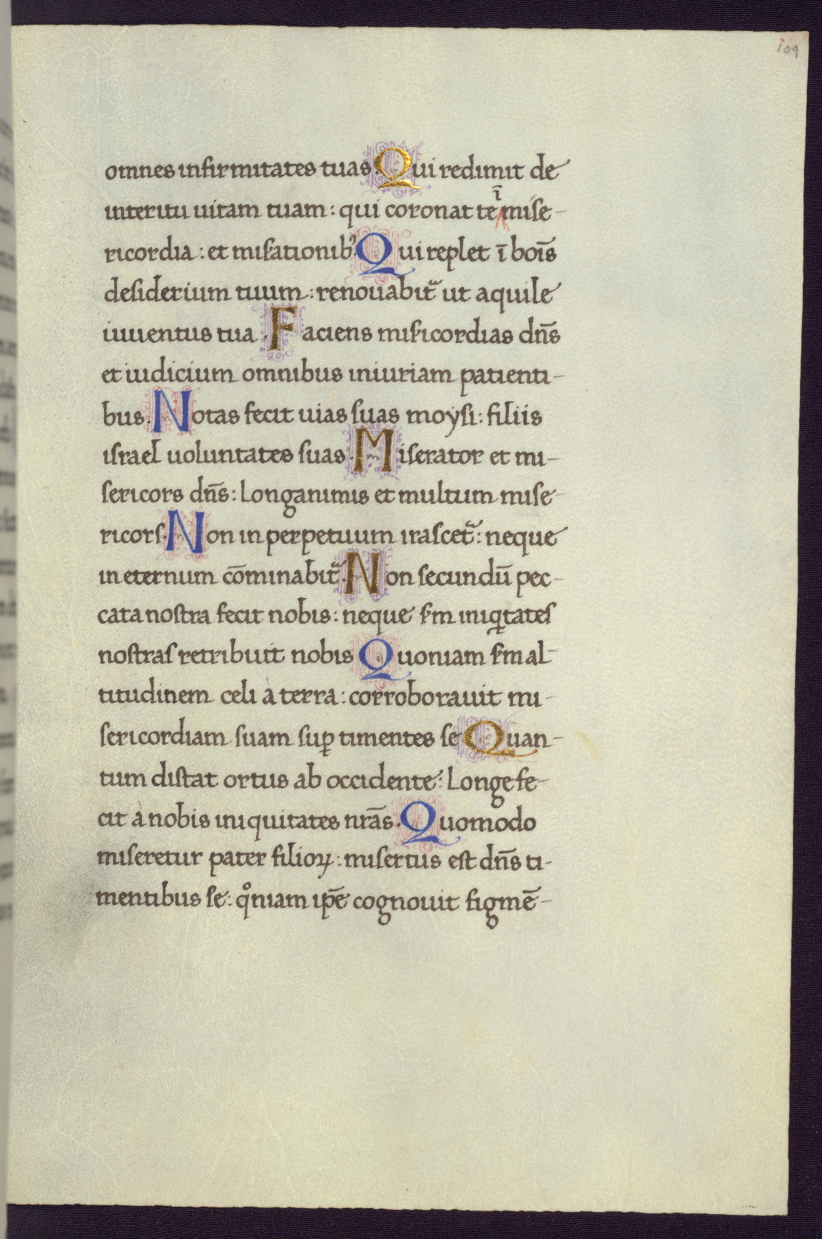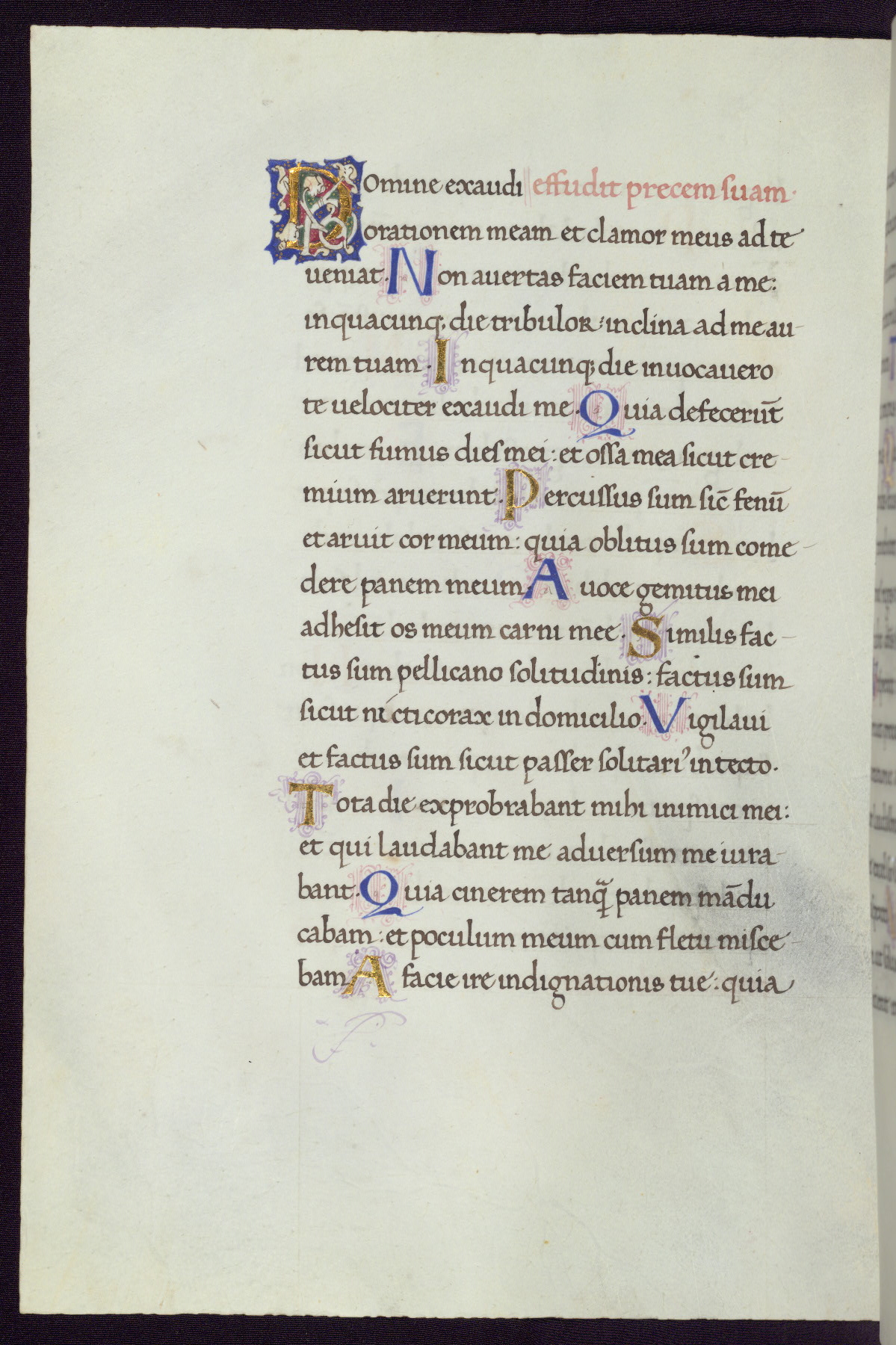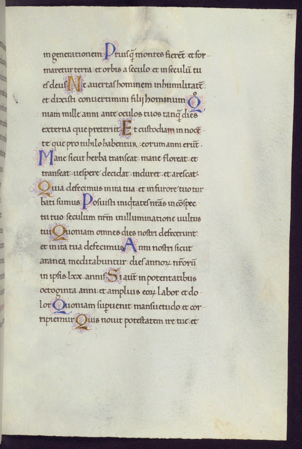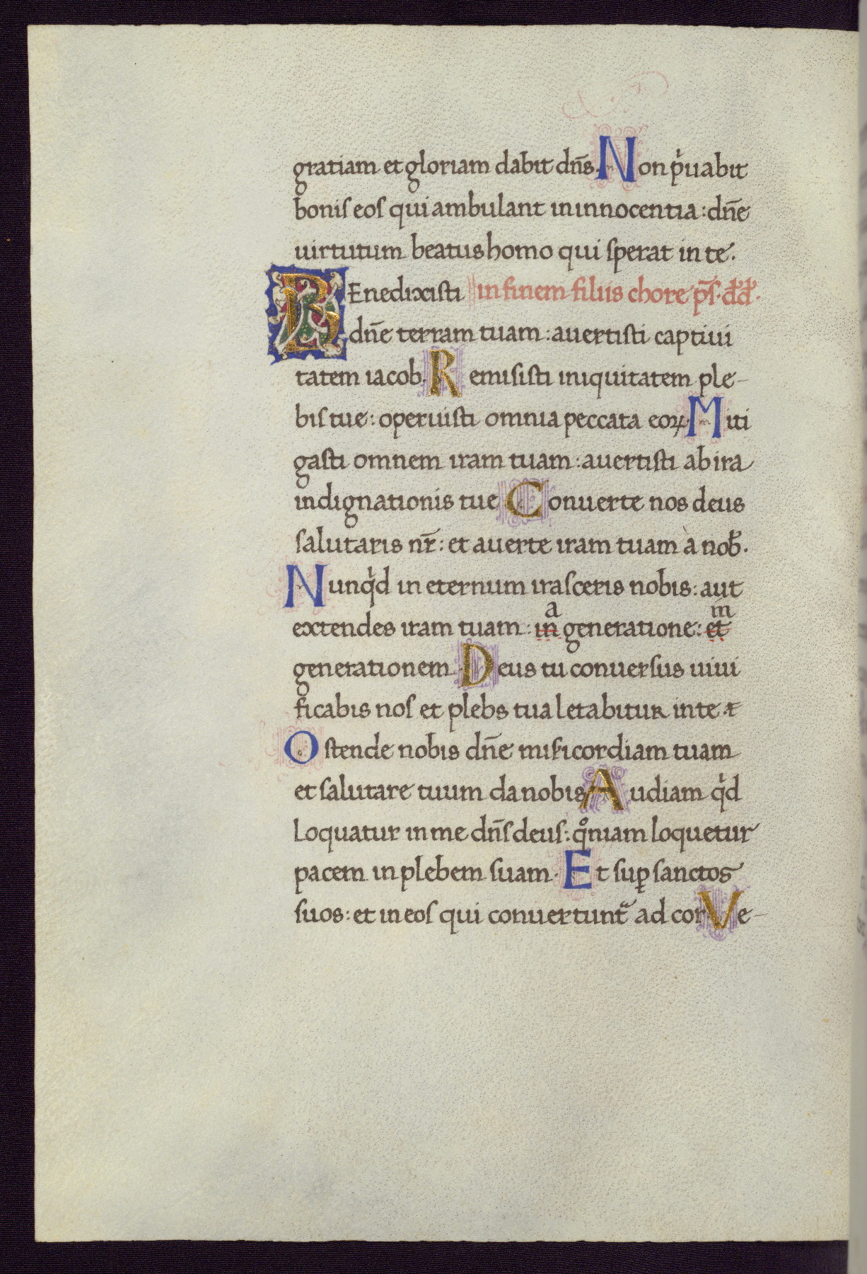 This Psalter was created in Southern Italy, likely Naples, in the last quarter of the fifteenth century. The litany (fols. 158v - 161r) suggests it was for Cistercian use. It contains six high-quality miniatures attributed to the Neopolitan illuminator Cristoforo Magorana (though the historiated initial of David playing a psaltry on fol. 15r may have been done by another hand), who from 1480-1492 worked at the court of Ferdinand I of Aragon. To date, almost forty manuscripts have been attributed to the artist. The Walters manuscript contains two full-page miniatures, one showing the Tree of Jesse and the other the Man of Sorrows. The Tree of Jesse (described in Isaiah 1:11) shows the ancestry of Christ rising from Jesse of Bethlehem, the father of King David who is depicted on the facing folio (171r). In this depiction Jesse is shown on the trunk of the tree, but it actually rises from Abraham. Surrounding Abraham is a crowd of Prophets each with scrolls with verses believed to prophecy the coming of Christ. The miniature with the Man of Sorrows shows Christ standing in his tomb and surrounded by the objects associated with the Passion (arma Christi). The miniature follows a specific Man of Sorrows iconography that originated in an early-fourteenth century mosaic icon from Constantinople that most likely arrived in Italy ca. 1380. The mosaic panel was believed to be an authentic representation of St. Gregory's vision of Christ as the Man of Sorrows, and this type of image encouraged the viewer to meditate on the suffering of Christ while reading the Passion narratives that follow. The humanist script and white-vine initials place the Walters Psalter firmly within the Humanist tradition of the late fifteenth century. Remnants of black velvet suggest this book once had a chemise binding, comparable to W.294 and W.480. Peter Kidd has suggested that the manuscript may have been written by Pietro Ursuleo of Capua (d. 1483).