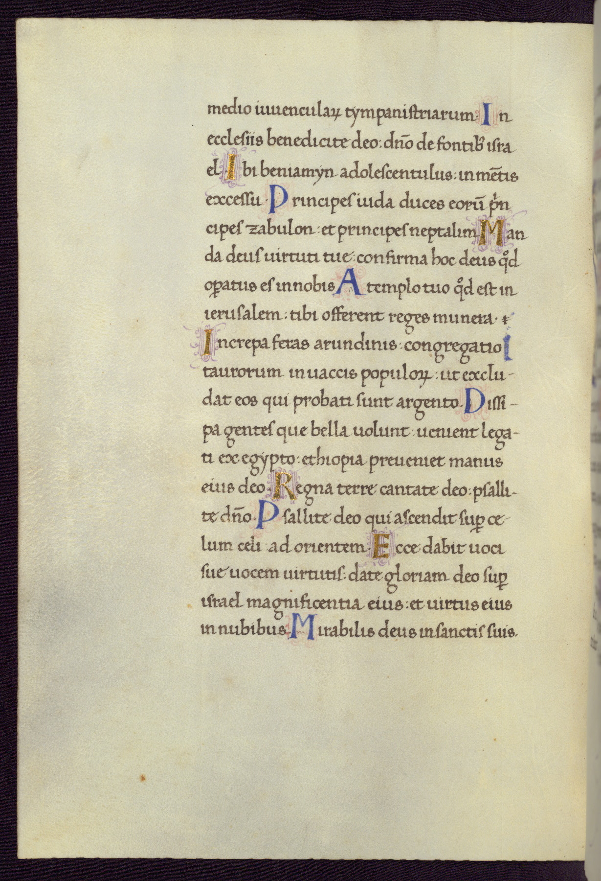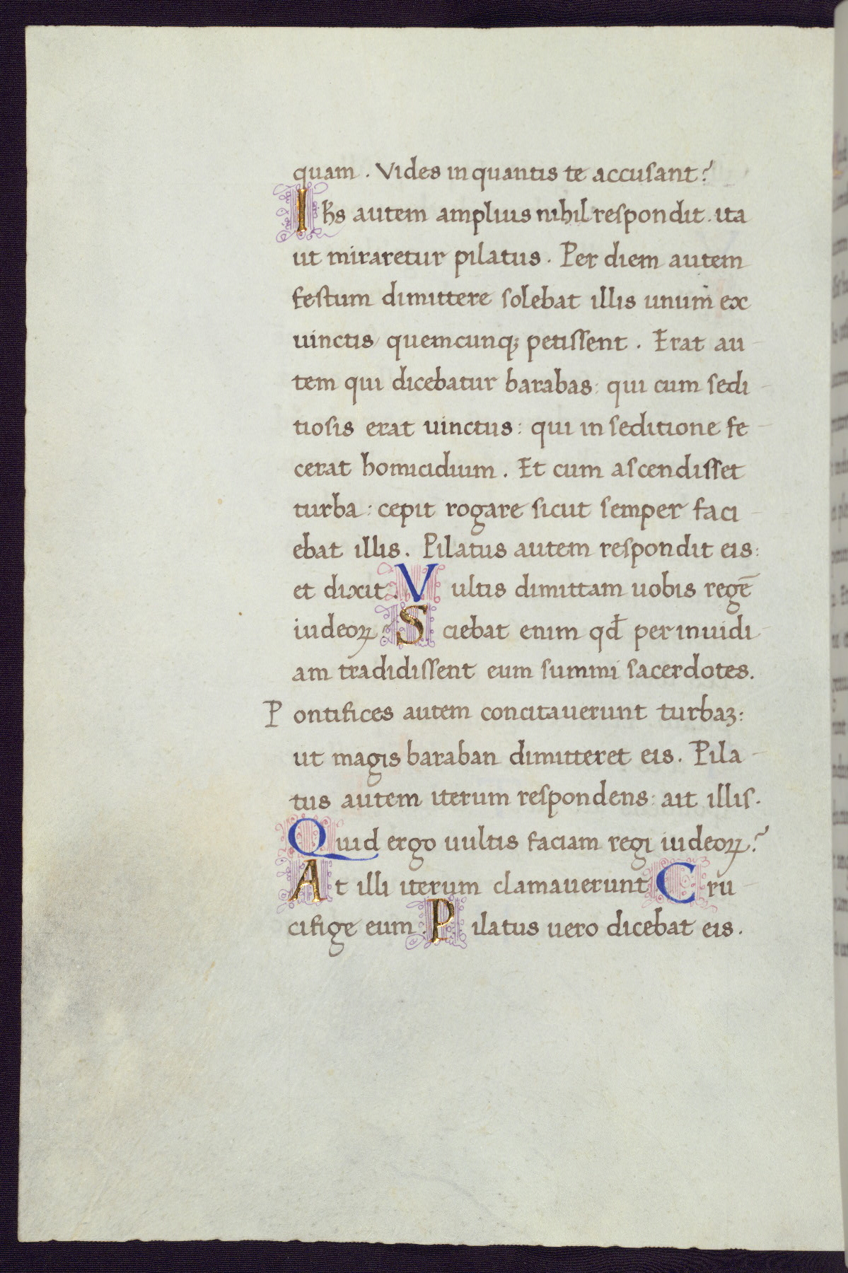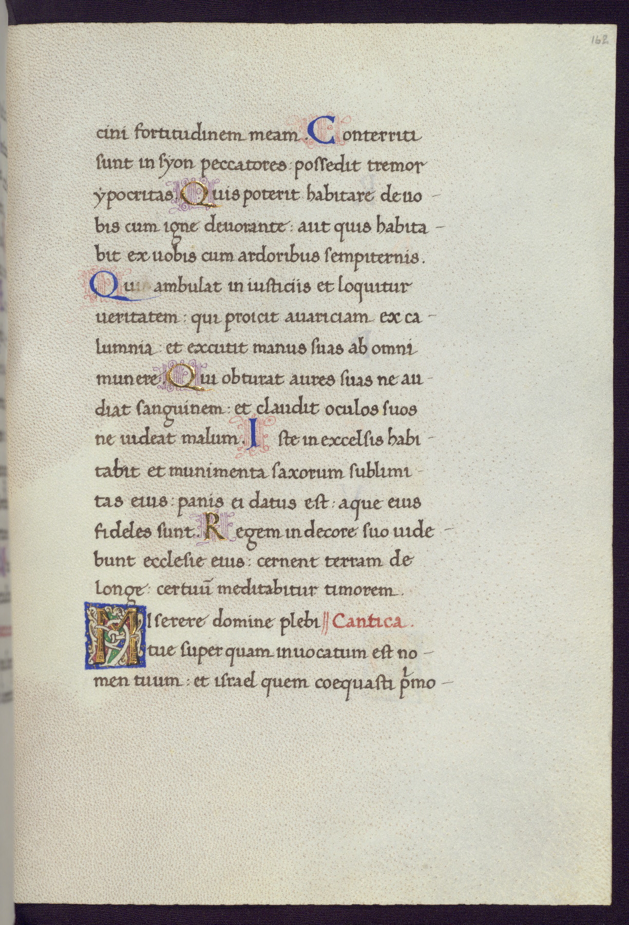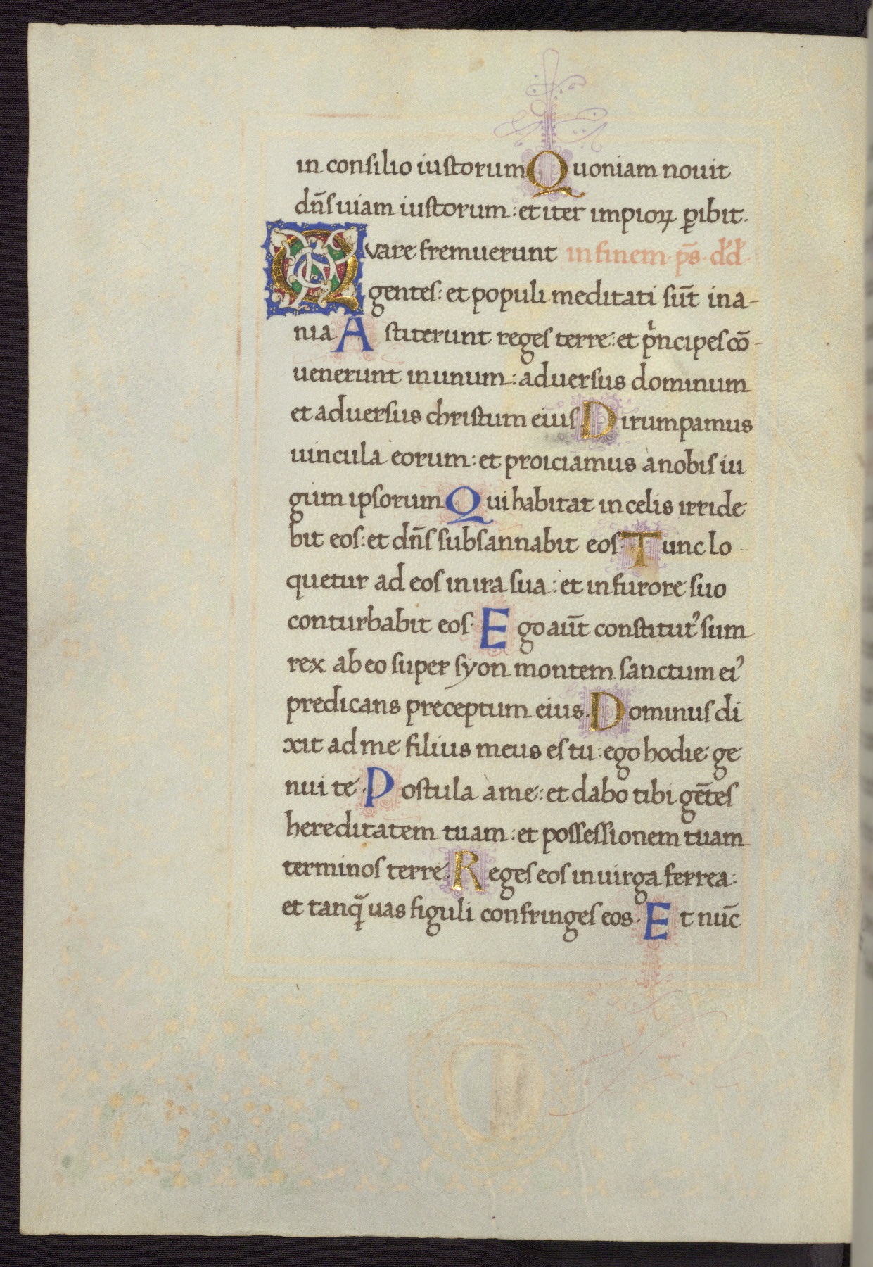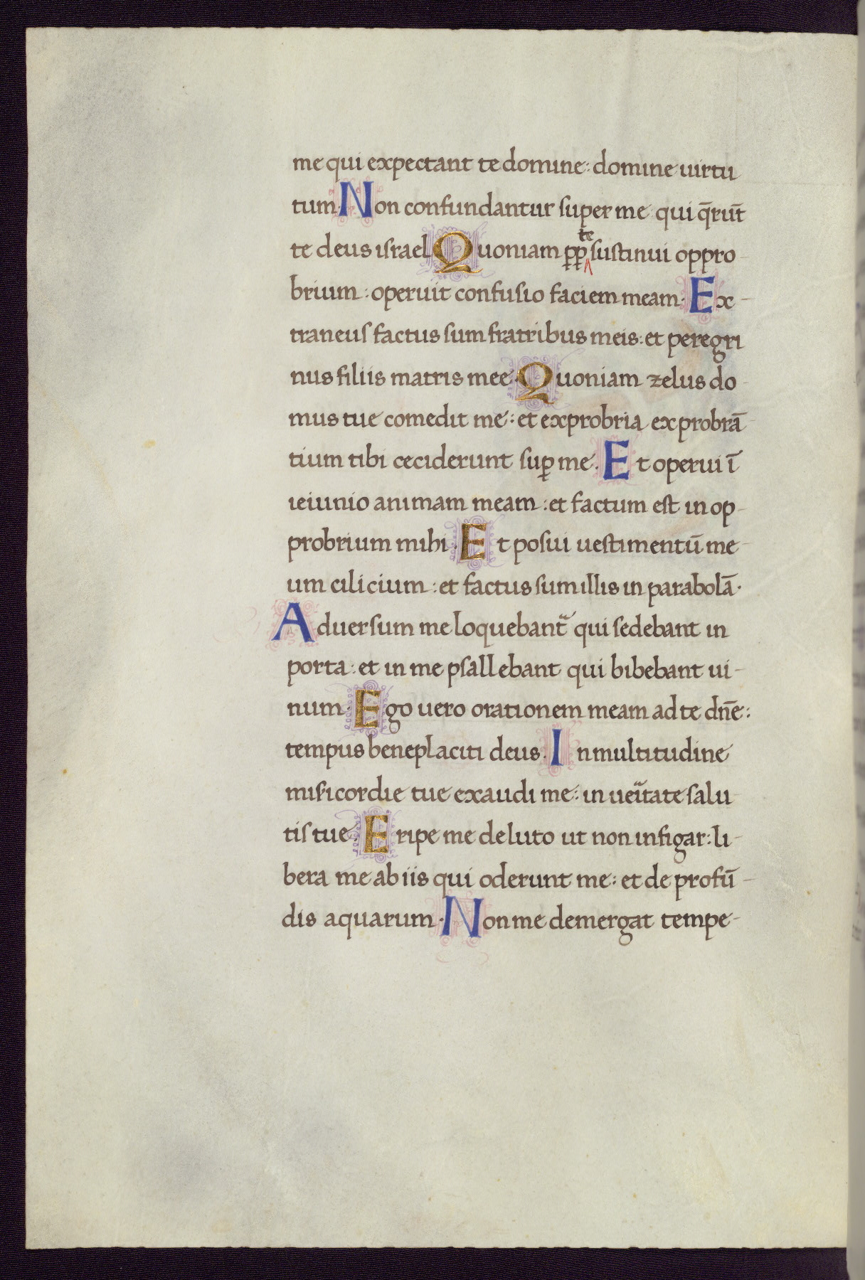 This Psalter was created in Southern Italy, likely Naples, in the last quarter of the fifteenth century. The litany (fols. 158v - 161r) suggests it was for Cistercian use. It contains six high-quality miniatures attributed to the Neopolitan illuminator Cristoforo Magorana (though the historiated initial of David playing a psaltry on fol. 15r may have been done by another hand), who from 1480-1492 worked at the court of Ferdinand I of Aragon. To date, almost forty manuscripts have been attributed to the artist. The Walters manuscript contains two full-page miniatures, one showing the Tree of Jesse and the other the Man of Sorrows. The Tree of Jesse (described in Isaiah 1:11) shows the ancestry of Christ rising from Jesse of Bethlehem, the father of King David who is depicted on the facing folio (171r). In this depiction Jesse is shown on the trunk of the tree, but it actually rises from Abraham. Surrounding Abraham is a crowd of Prophets each with scrolls with verses believed to prophecy the coming of Christ. The miniature with the Man of Sorrows shows Christ standing in his tomb and surrounded by the objects associated with the Passion (arma Christi). The miniature follows a specific Man of Sorrows iconography that originated in an early-fourteenth century mosaic icon from Constantinople that most likely arrived in Italy ca. 1380. The mosaic panel was believed to be an authentic representation of St. Gregory's vision of Christ as the Man of Sorrows, and this type of image encouraged the viewer to meditate on the suffering of Christ while reading the Passion narratives that follow. The humanist script and white-vine initials place the Walters Psalter firmly within the Humanist tradition of the late fifteenth century. Remnants of black velvet suggest this book once had a chemise binding, comparable to W.294 and W.480. Peter Kidd has suggested that the manuscript may have been written by Pietro Ursuleo of Capua (d. 1483).