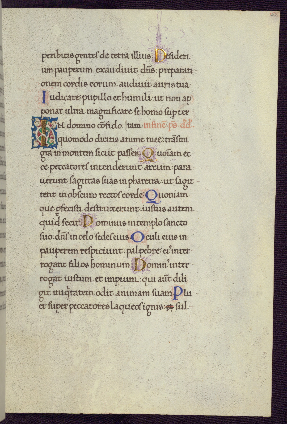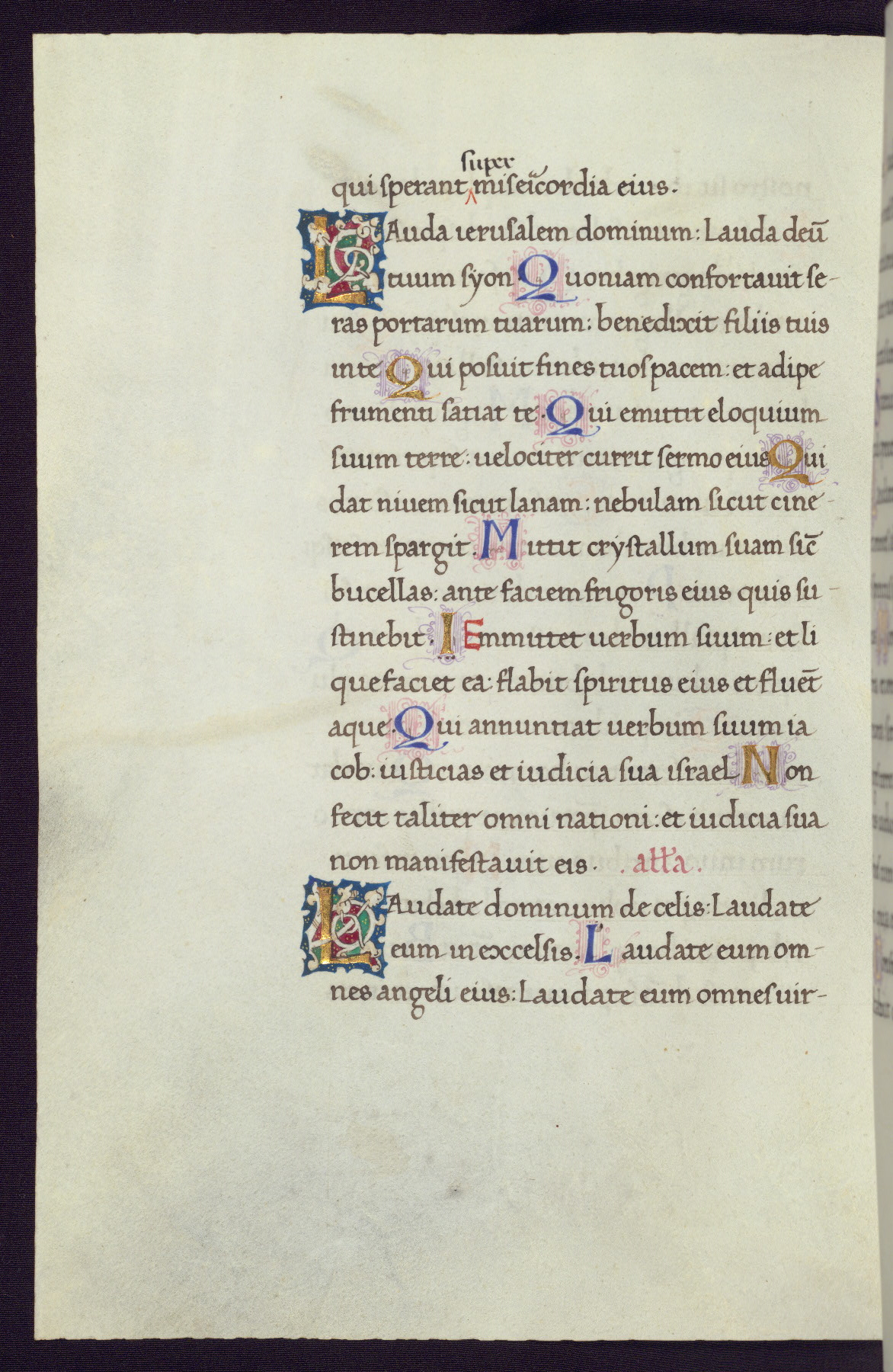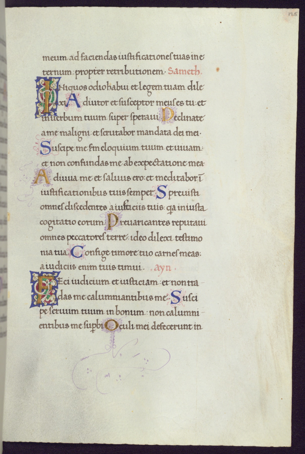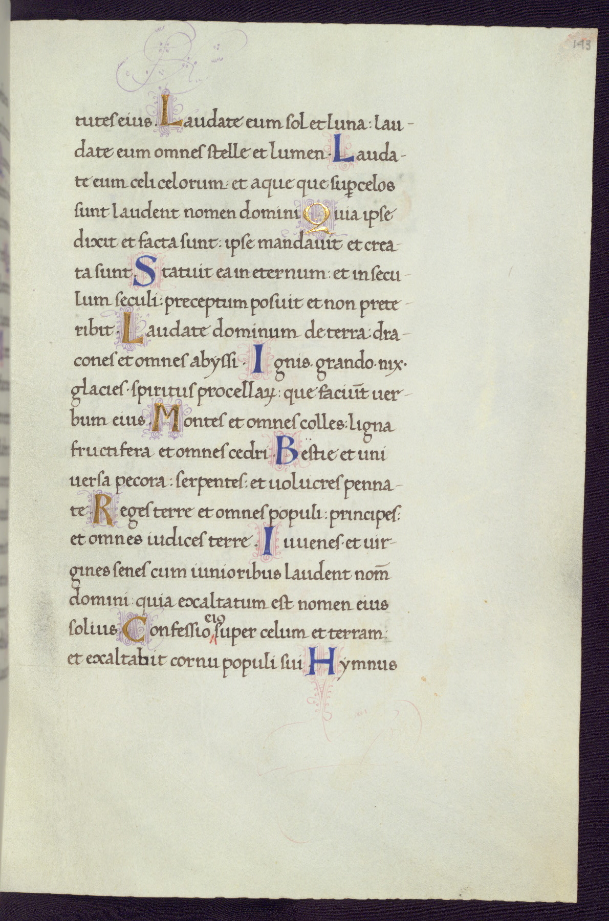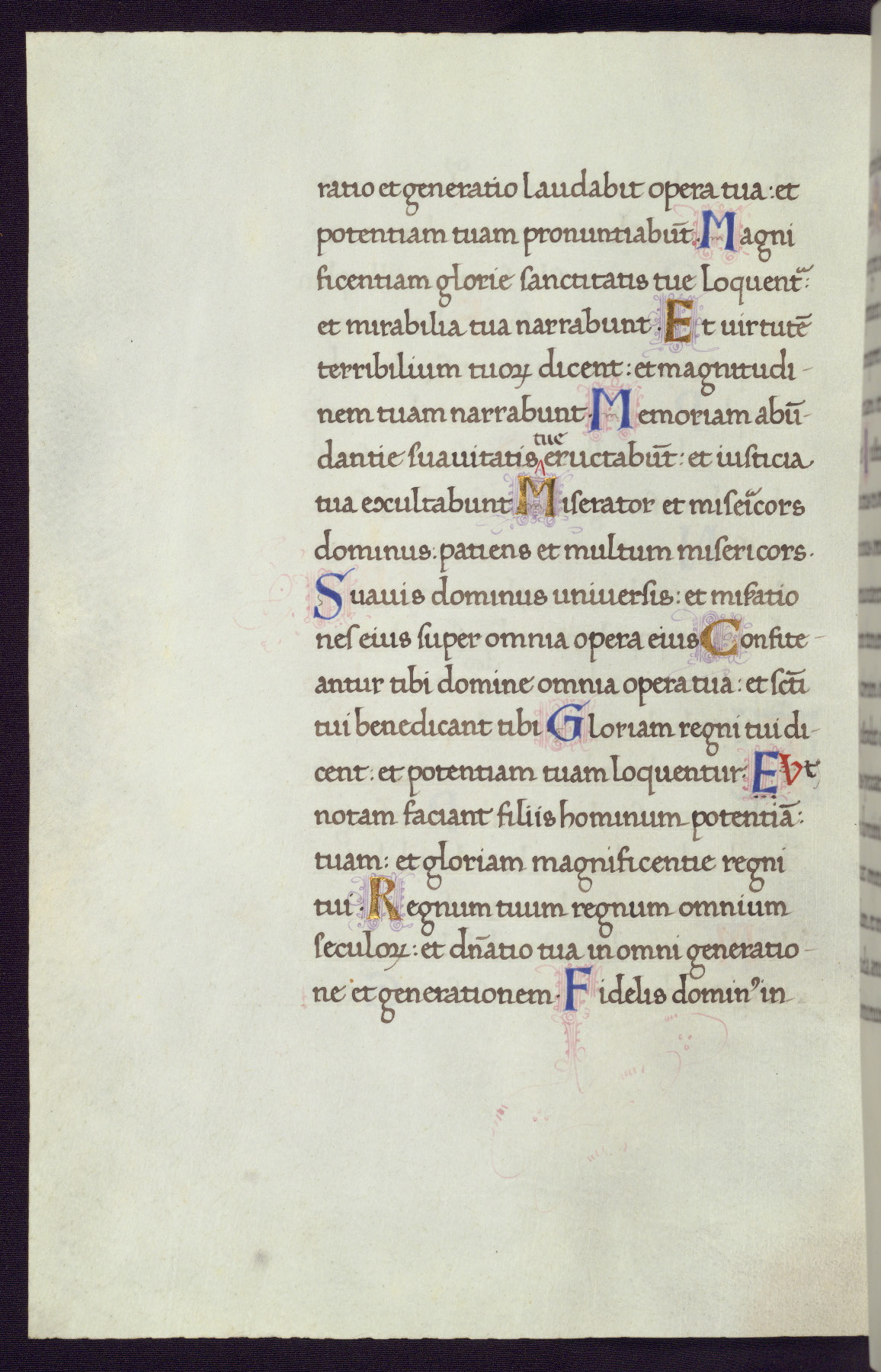 This Psalter was created in Southern Italy, likely Naples, in the last quarter of the fifteenth century. The litany (fols. 158v - 161r) suggests it was for Cistercian use. It contains six high-quality miniatures attributed to the Neopolitan illuminator Cristoforo Magorana (though the historiated initial of David playing a psaltry on fol. 15r may have been done by another hand), who from 1480-1492 worked at the court of Ferdinand I of Aragon. To date, almost forty manuscripts have been attributed to the artist. The Walters manuscript contains two full-page miniatures, one showing the Tree of Jesse and the other the Man of Sorrows. The Tree of Jesse (described in Isaiah 1:11) shows the ancestry of Christ rising from Jesse of Bethlehem, the father of King David who is depicted on the facing folio (171r). In this depiction Jesse is shown on the trunk of the tree, but it actually rises from Abraham. Surrounding Abraham is a crowd of Prophets each with scrolls with verses believed to prophecy the coming of Christ. The miniature with the Man of Sorrows shows Christ standing in his tomb and surrounded by the objects associated with the Passion (arma Christi). The miniature follows a specific Man of Sorrows iconography that originated in an early-fourteenth century mosaic icon from Constantinople that most likely arrived in Italy ca. 1380. The mosaic panel was believed to be an authentic representation of St. Gregory's vision of Christ as the Man of Sorrows, and this type of image encouraged the viewer to meditate on the suffering of Christ while reading the Passion narratives that follow. The humanist script and white-vine initials place the Walters Psalter firmly within the Humanist tradition of the late fifteenth century. Remnants of black velvet suggest this book once had a chemise binding, comparable to W.294 and W.480. Peter Kidd has suggested that the manuscript may have been written by Pietro Ursuleo of Capua (d. 1483).