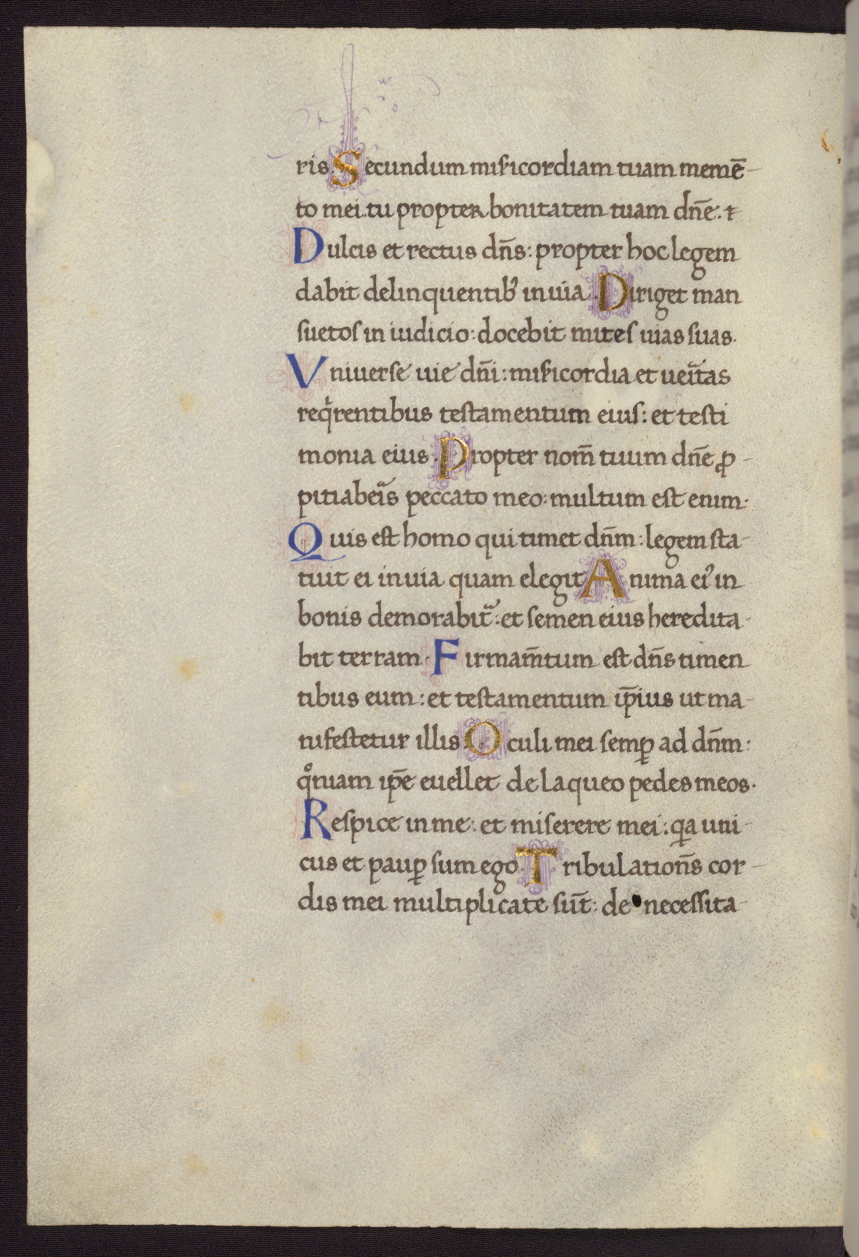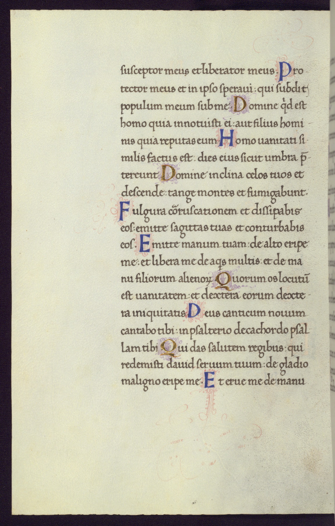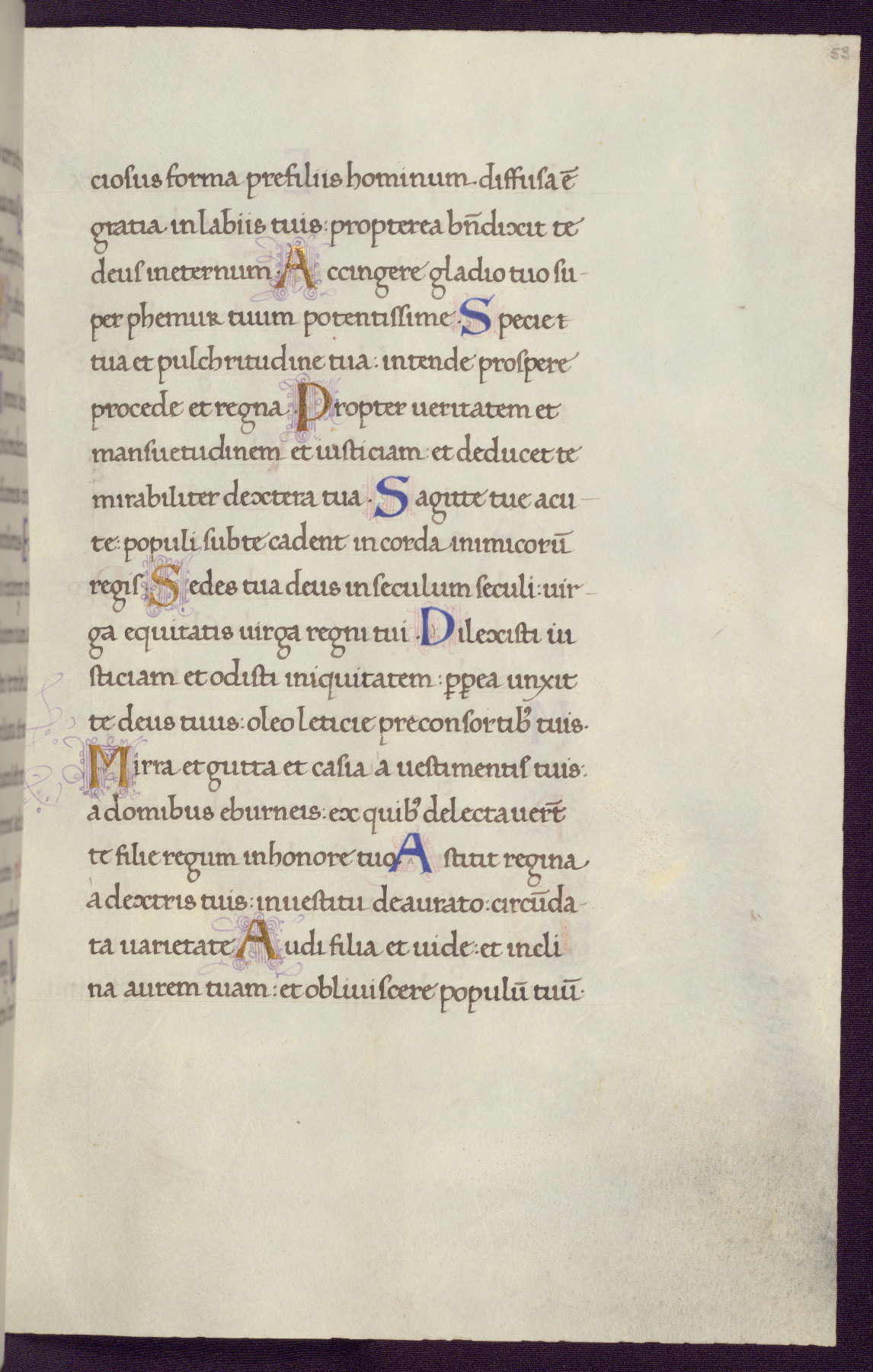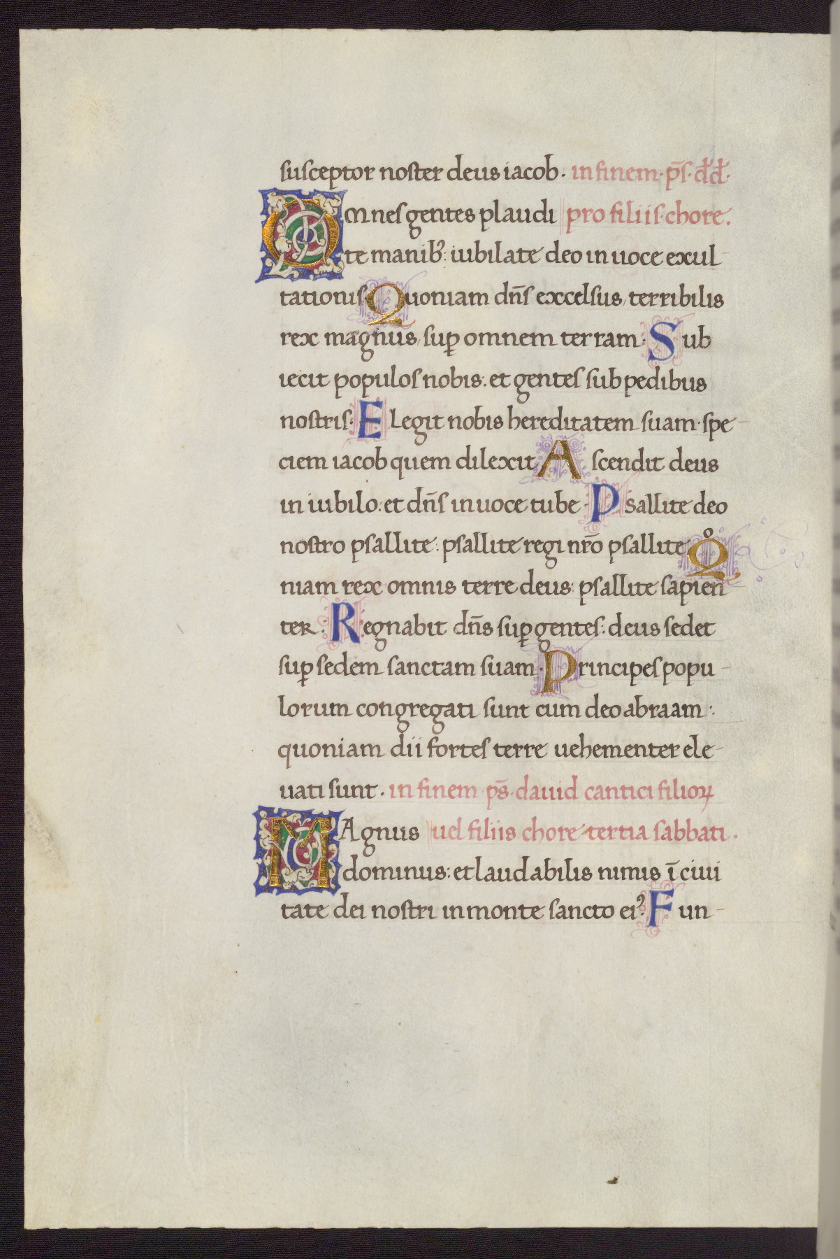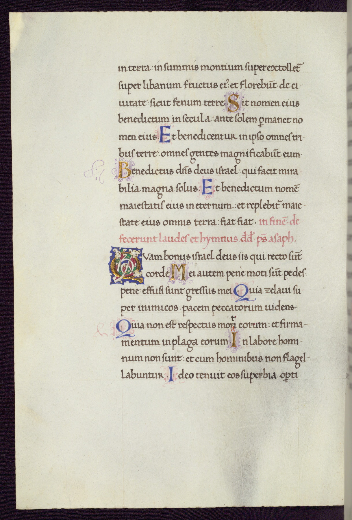 This Psalter was created in Southern Italy, likely Naples, in the last quarter of the fifteenth century. The litany (fols. 158v - 161r) suggests it was for Cistercian use. It contains six high-quality miniatures attributed to the Neopolitan illuminator Cristoforo Magorana (though the historiated initial of David playing a psaltry on fol. 15r may have been done by another hand), who from 1480-1492 worked at the court of Ferdinand I of Aragon. To date, almost forty manuscripts have been attributed to the artist. The Walters manuscript contains two full-page miniatures, one showing the Tree of Jesse and the other the Man of Sorrows. The Tree of Jesse (described in Isaiah 1:11) shows the ancestry of Christ rising from Jesse of Bethlehem, the father of King David who is depicted on the facing folio (171r). In this depiction Jesse is shown on the trunk of the tree, but it actually rises from Abraham. Surrounding Abraham is a crowd of Prophets each with scrolls with verses believed to prophecy the coming of Christ. The miniature with the Man of Sorrows shows Christ standing in his tomb and surrounded by the objects associated with the Passion (arma Christi). The miniature follows a specific Man of Sorrows iconography that originated in an early-fourteenth century mosaic icon from Constantinople that most likely arrived in Italy ca. 1380. The mosaic panel was believed to be an authentic representation of St. Gregory's vision of Christ as the Man of Sorrows, and this type of image encouraged the viewer to meditate on the suffering of Christ while reading the Passion narratives that follow. The humanist script and white-vine initials place the Walters Psalter firmly within the Humanist tradition of the late fifteenth century. Remnants of black velvet suggest this book once had a chemise binding, comparable to W.294 and W.480. Peter Kidd has suggested that the manuscript may have been written by Pietro Ursuleo of Capua (d. 1483).