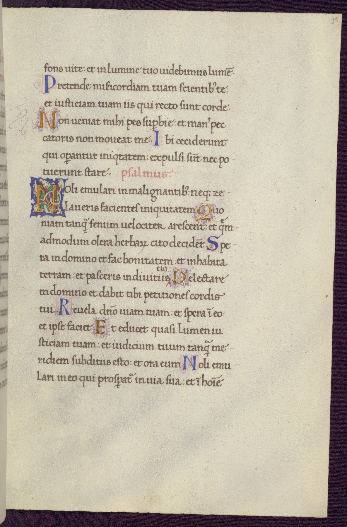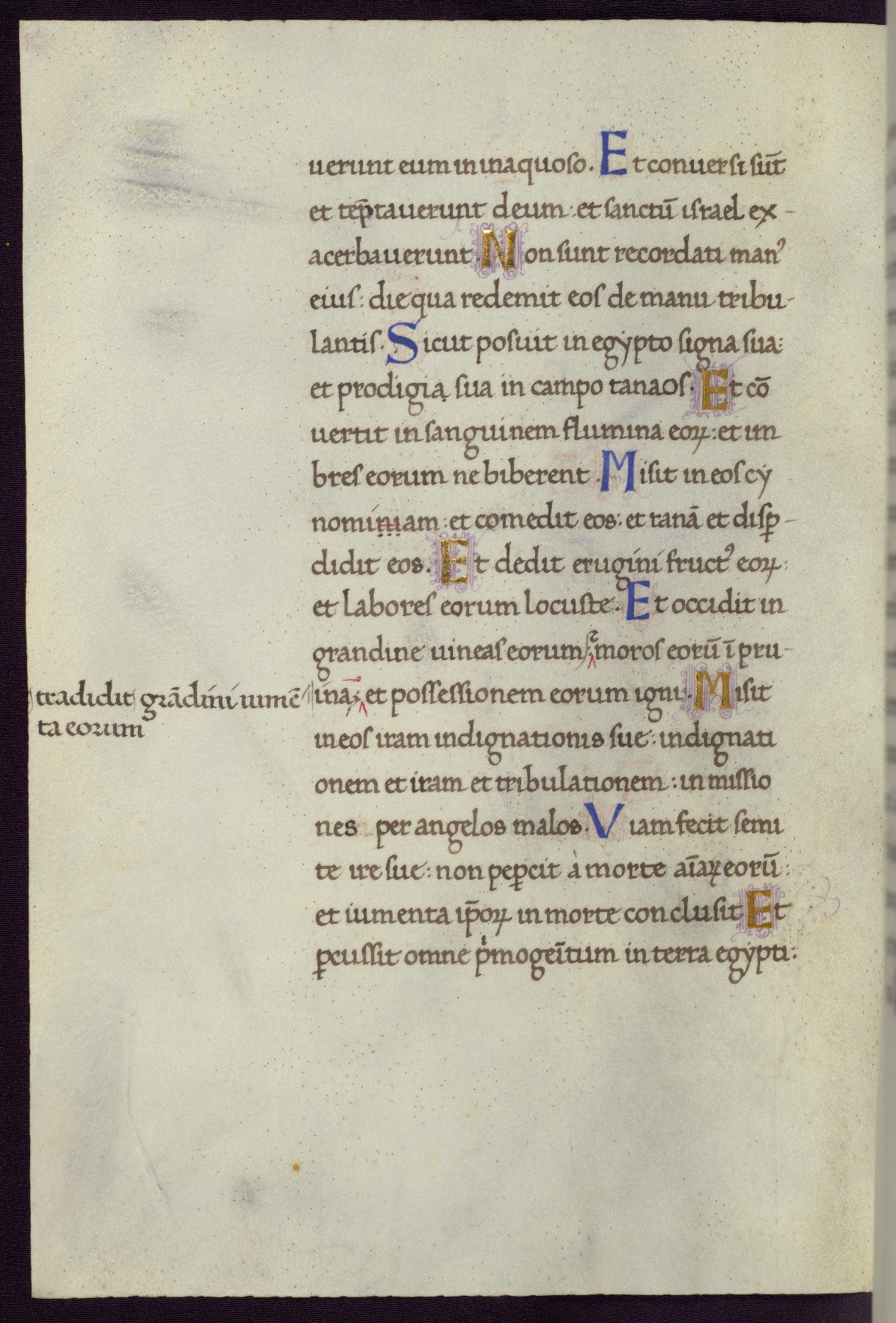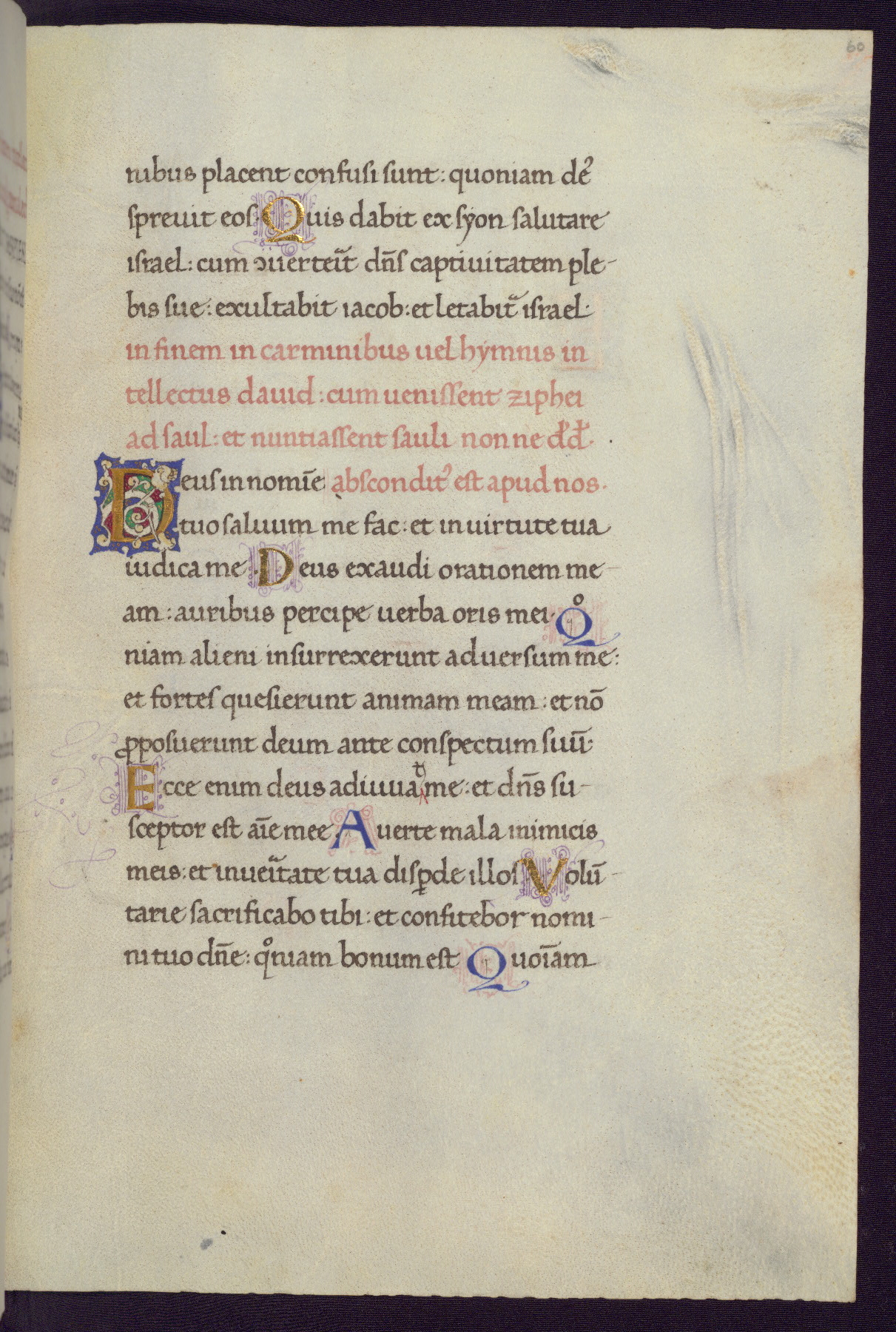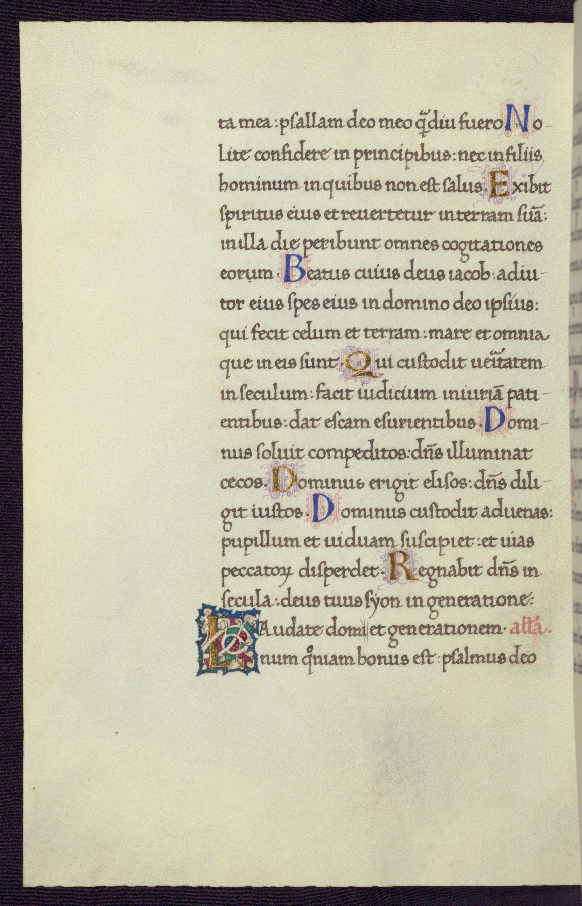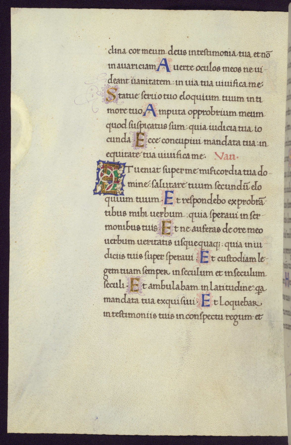 This Psalter was created in Southern Italy, likely Naples, in the last quarter of the fifteenth century. The litany (fols. 158v - 161r) suggests it was for Cistercian use. It contains six high-quality miniatures attributed to the Neopolitan illuminator Cristoforo Magorana (though the historiated initial of David playing a psaltry on fol. 15r may have been done by another hand), who from 1480-1492 worked at the court of Ferdinand I of Aragon. To date, almost forty manuscripts have been attributed to the artist. The Walters manuscript contains two full-page miniatures, one showing the Tree of Jesse and the other the Man of Sorrows. The Tree of Jesse (described in Isaiah 1:11) shows the ancestry of Christ rising from Jesse of Bethlehem, the father of King David who is depicted on the facing folio (171r). In this depiction Jesse is shown on the trunk of the tree, but it actually rises from Abraham. Surrounding Abraham is a crowd of Prophets each with scrolls with verses believed to prophecy the coming of Christ. The miniature with the Man of Sorrows shows Christ standing in his tomb and surrounded by the objects associated with the Passion (arma Christi). The miniature follows a specific Man of Sorrows iconography that originated in an early-fourteenth century mosaic icon from Constantinople that most likely arrived in Italy ca. 1380. The mosaic panel was believed to be an authentic representation of St. Gregory's vision of Christ as the Man of Sorrows, and this type of image encouraged the viewer to meditate on the suffering of Christ while reading the Passion narratives that follow. The humanist script and white-vine initials place the Walters Psalter firmly within the Humanist tradition of the late fifteenth century. Remnants of black velvet suggest this book once had a chemise binding, comparable to W.294 and W.480. Peter Kidd has suggested that the manuscript may have been written by Pietro Ursuleo of Capua (d. 1483).