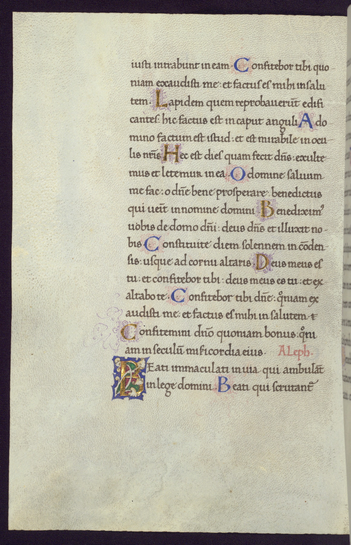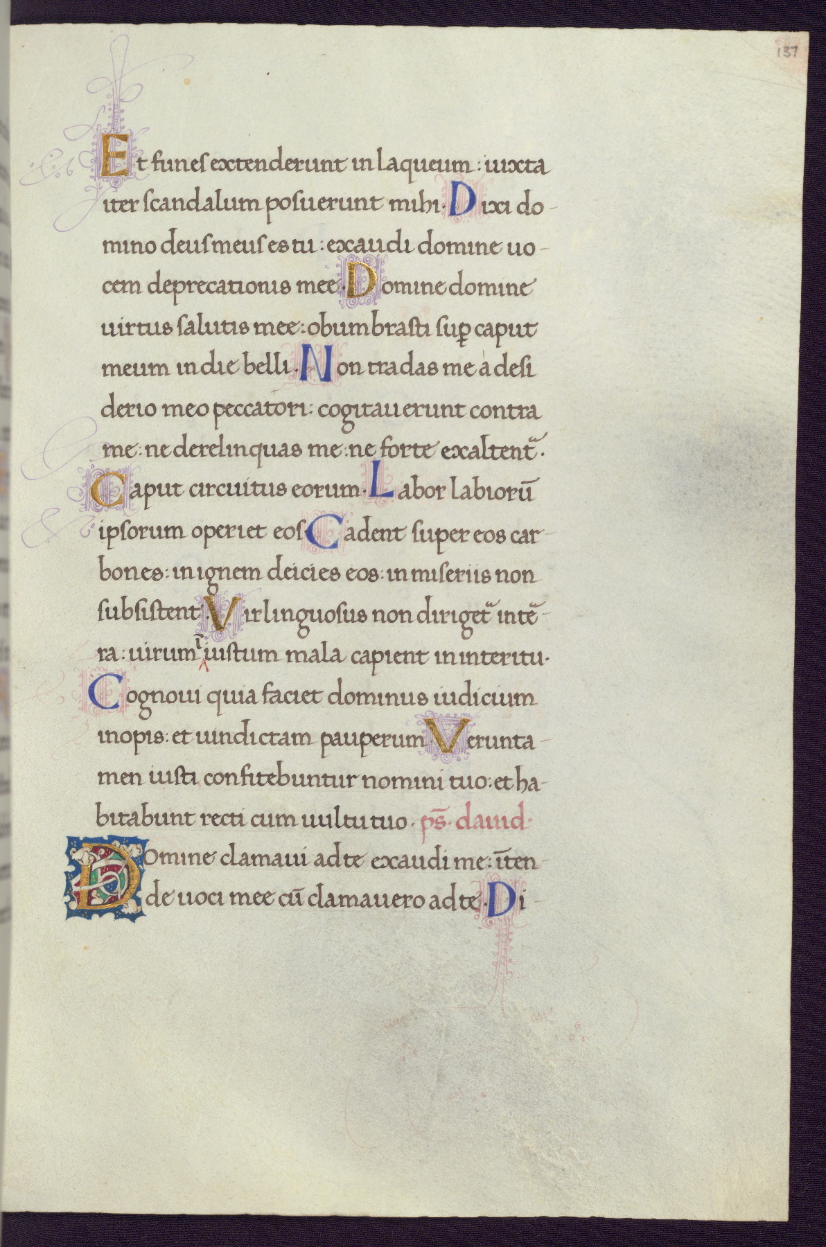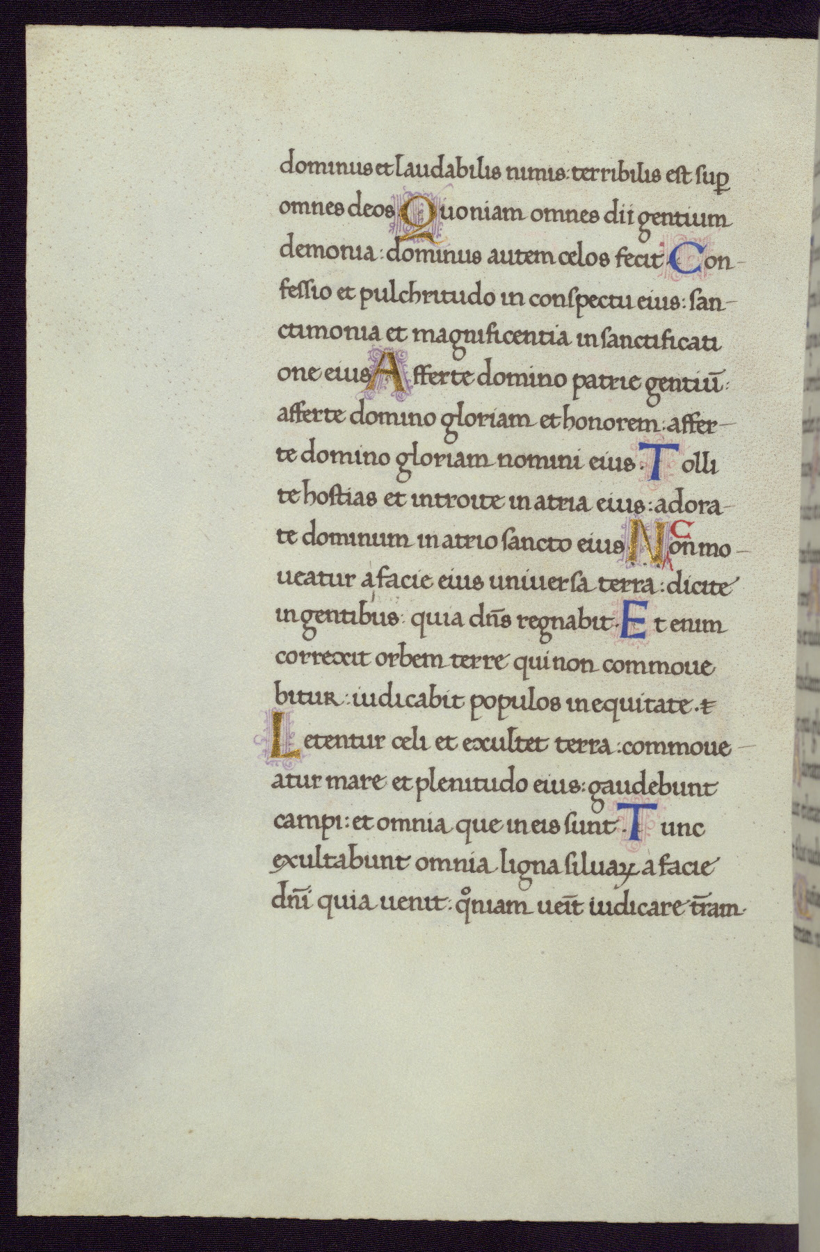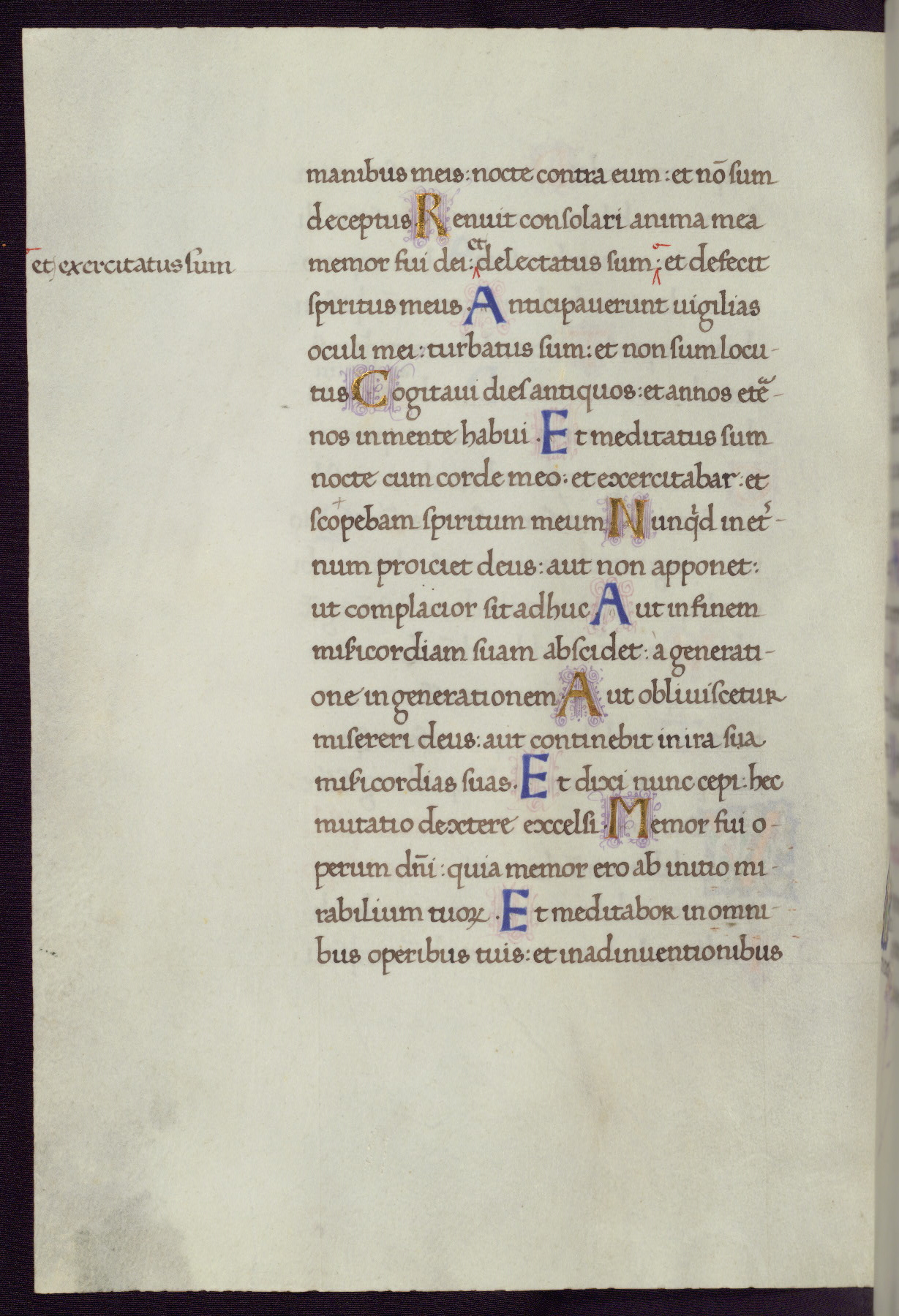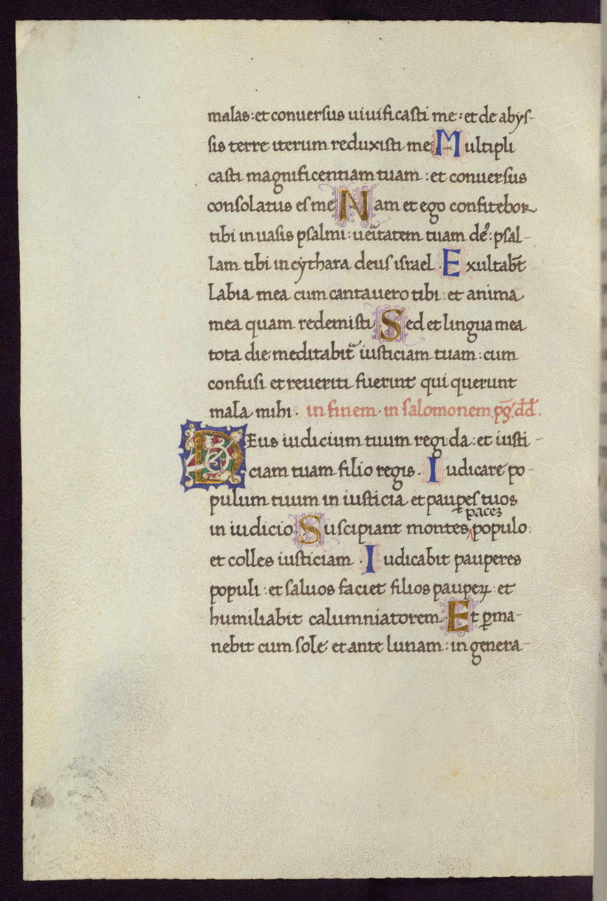 This Psalter was created in Southern Italy, likely Naples, in the last quarter of the fifteenth century. The litany (fols. 158v - 161r) suggests it was for Cistercian use. It contains six high-quality miniatures attributed to the Neopolitan illuminator Cristoforo Magorana (though the historiated initial of David playing a psaltry on fol. 15r may have been done by another hand), who from 1480-1492 worked at the court of Ferdinand I of Aragon. To date, almost forty manuscripts have been attributed to the artist. The Walters manuscript contains two full-page miniatures, one showing the Tree of Jesse and the other the Man of Sorrows. The Tree of Jesse (described in Isaiah 1:11) shows the ancestry of Christ rising from Jesse of Bethlehem, the father of King David who is depicted on the facing folio (171r). In this depiction Jesse is shown on the trunk of the tree, but it actually rises from Abraham. Surrounding Abraham is a crowd of Prophets each with scrolls with verses believed to prophecy the coming of Christ. The miniature with the Man of Sorrows shows Christ standing in his tomb and surrounded by the objects associated with the Passion (arma Christi). The miniature follows a specific Man of Sorrows iconography that originated in an early-fourteenth century mosaic icon from Constantinople that most likely arrived in Italy ca. 1380. The mosaic panel was believed to be an authentic representation of St. Gregory's vision of Christ as the Man of Sorrows, and this type of image encouraged the viewer to meditate on the suffering of Christ while reading the Passion narratives that follow. The humanist script and white-vine initials place the Walters Psalter firmly within the Humanist tradition of the late fifteenth century. Remnants of black velvet suggest this book once had a chemise binding, comparable to W.294 and W.480. Peter Kidd has suggested that the manuscript may have been written by Pietro Ursuleo of Capua (d. 1483).